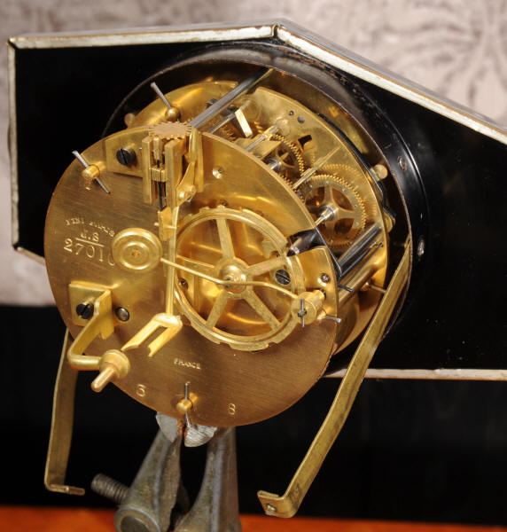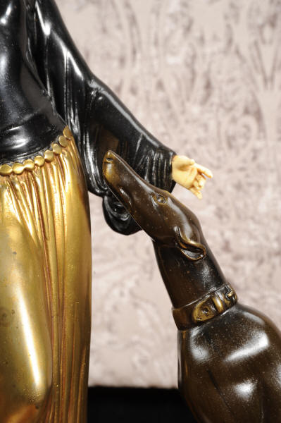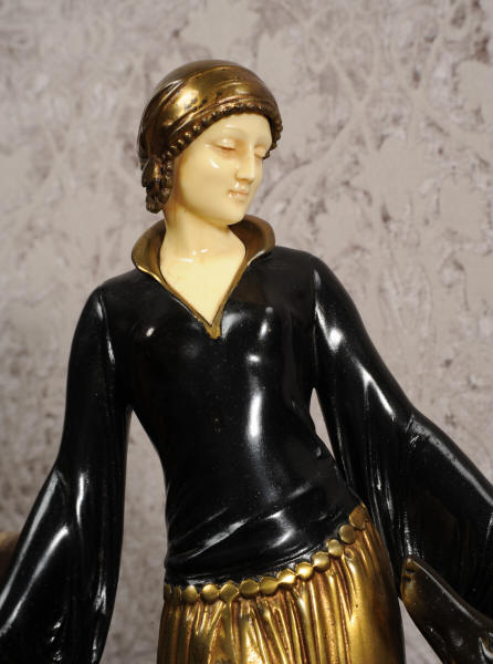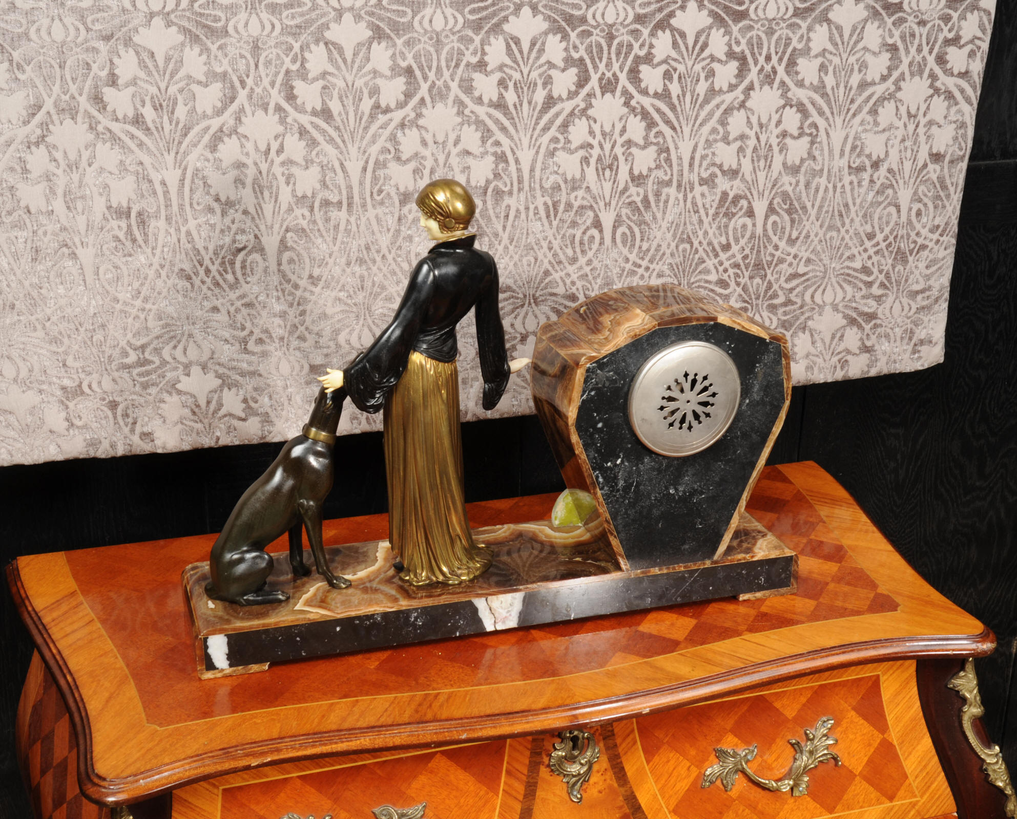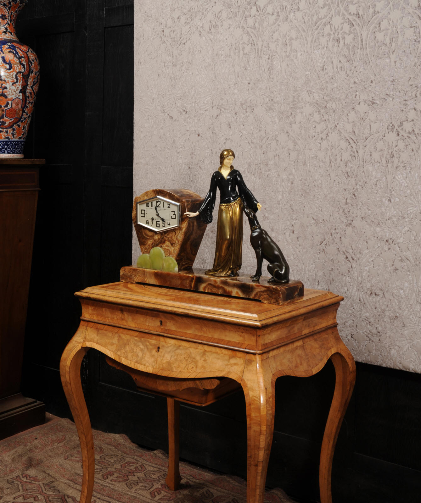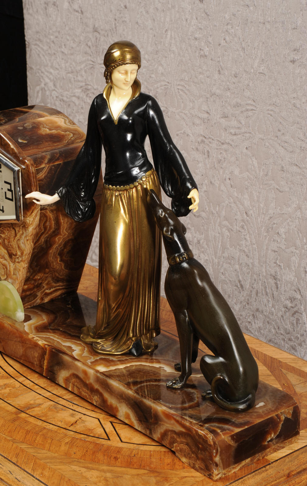 The lozenge shaped dial is matted silvered brass, screen printed with numerals and with square formed blued steel hands. It is signed for the retailer E. Bourgedi, Doudeville. The bezel is chrome plated and has it's original convex glass. The French movement is of excellent quality. It is a traditional 'Pendule de Paris' movement with a pendulum. It is in excellent clean and running condition having been fully overhauled and tested by our clockmaker. Pendulum is a replacement. It runs for 8 days and strikes the hours and halves on a bell. Click the video below to see the clock running and striking. Condition of the case is excellent, The figures have a good original patination with only minor wear. Her early plastic hands and head are in excellent condition and have mellowed in colour, one hand more than the other. The Onyx is in excellent condition with a superb polish. There are some minor nibbles to the edges and a slight chip to the front left hand foot. The dial is also in excellent condition with some slight wear and marks. Menneville was the pseudonym for the sculptor Ugo Cipriani (1897 – 1960). He was a Prolific Italian sculptor born in Florencia, Italy on 13th August 1897, died in Paris in June 1960. He studied at the famous Accademia di Belle Arti di Firenze. He followed in his Father's footsteps as he too was a sculptor. One of Ugo Cipriani’s most famous works is a statue of the patriot Oberdan in the Oberdan’s square in Florencia dated 1919. He left Italy for France around 1935-1937 to escape from Mussolini’s fascist government and became a political refugee in Paris where he kept on working until his death. He Produced many fine art deco statuary items in various mediums including spelter and ivorine, bronze and terracotta.