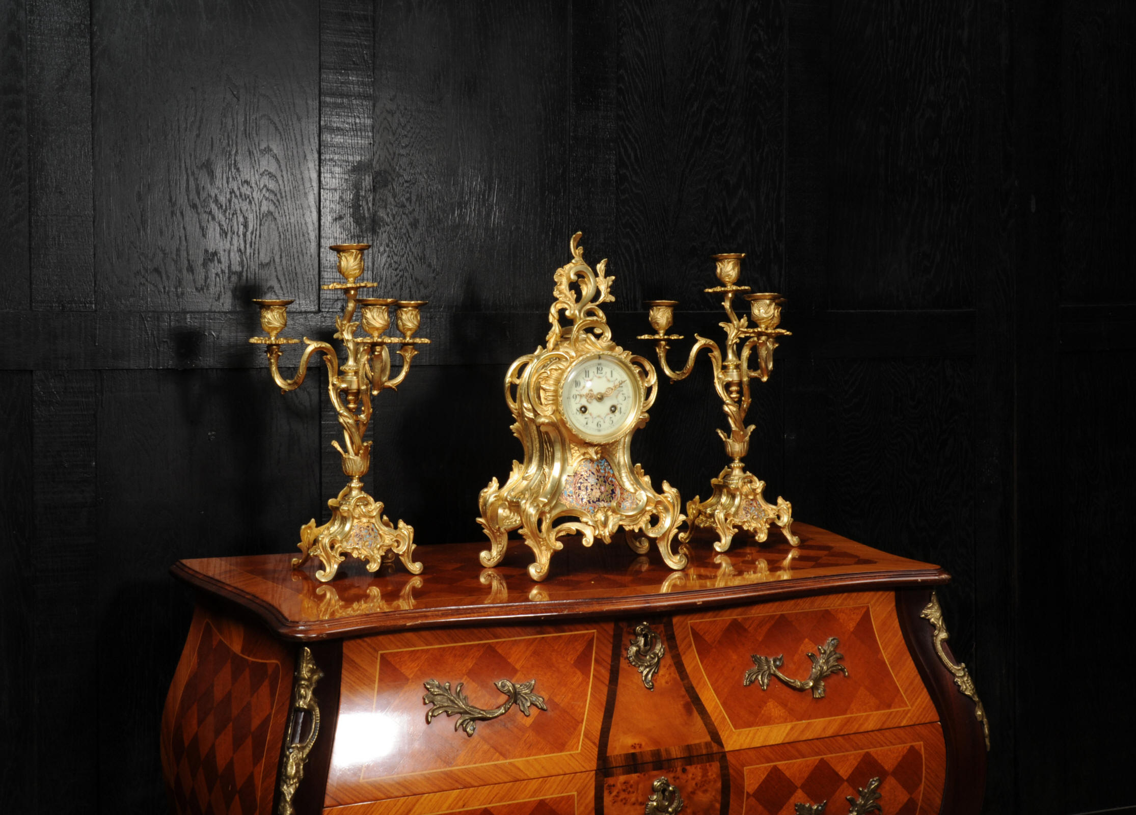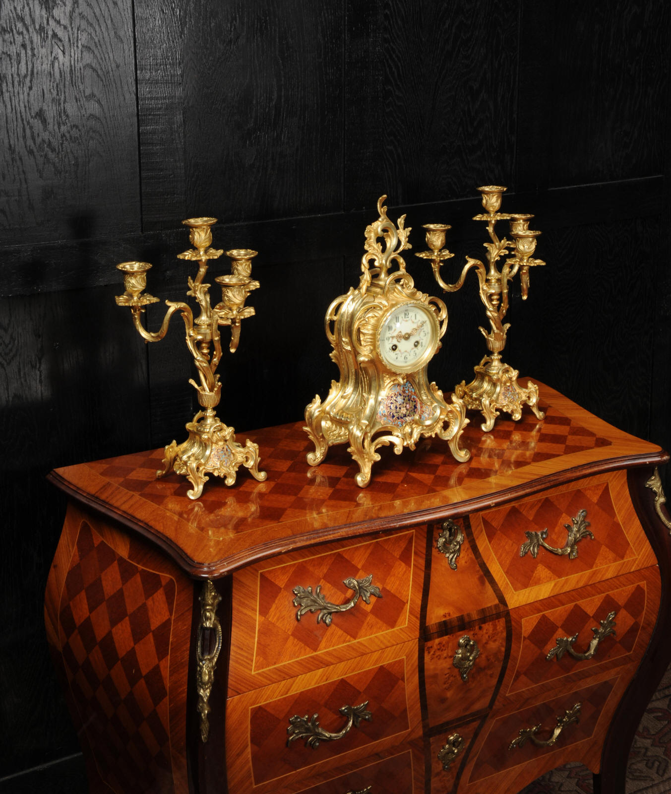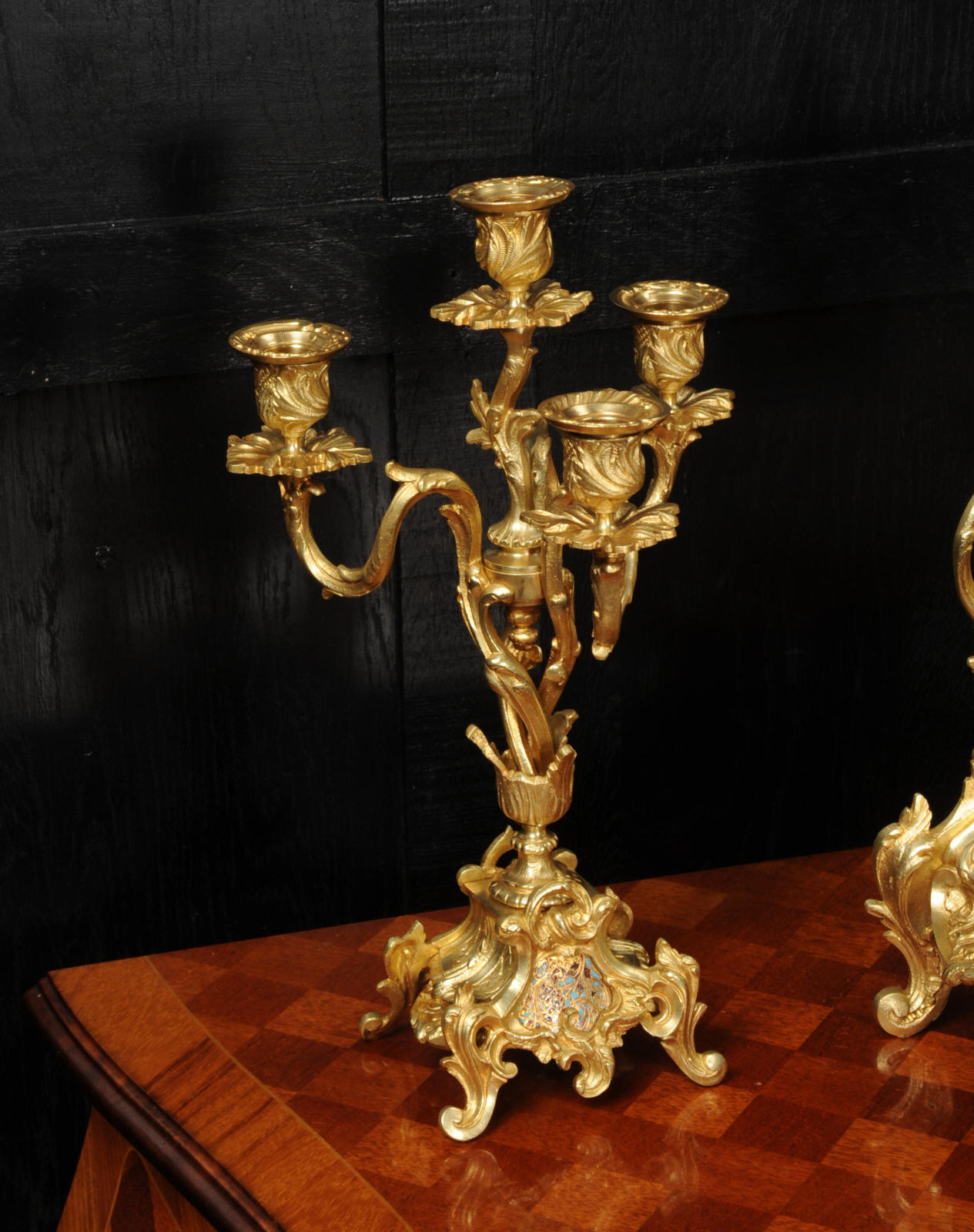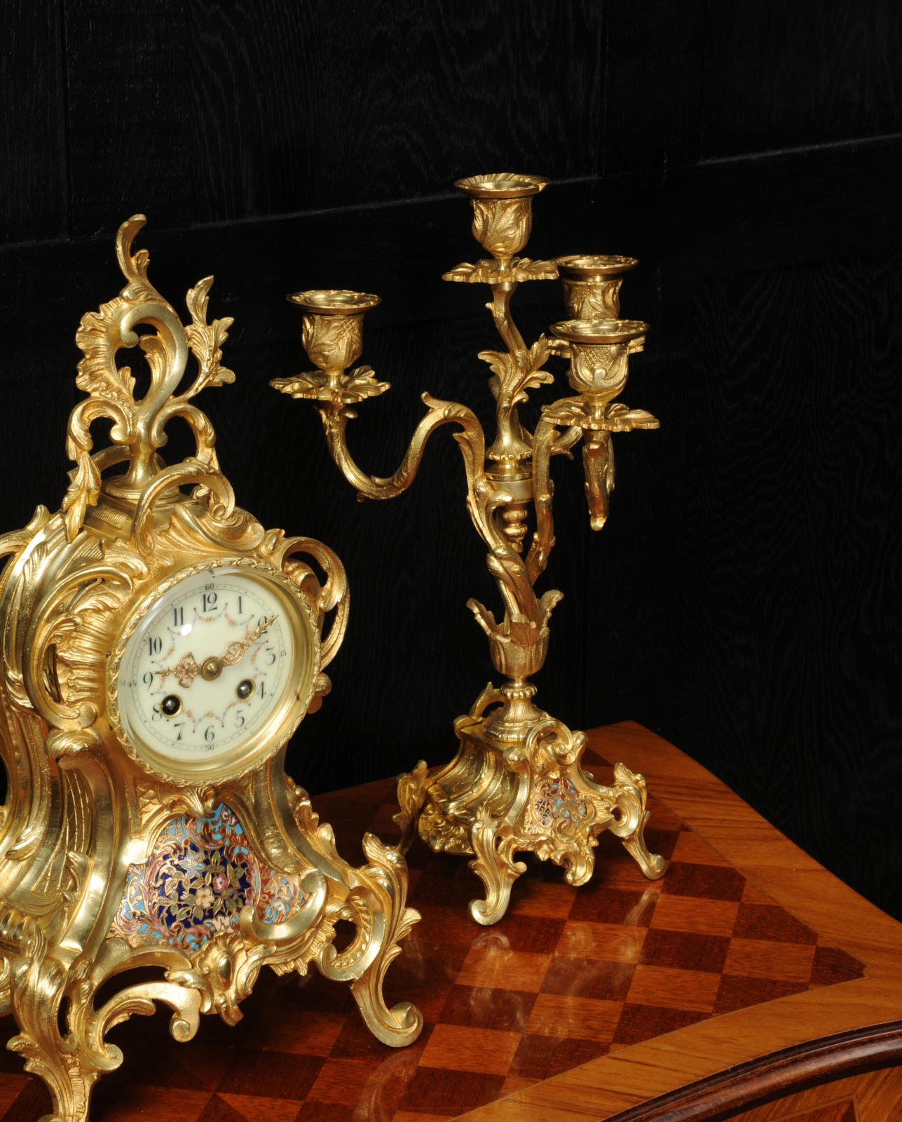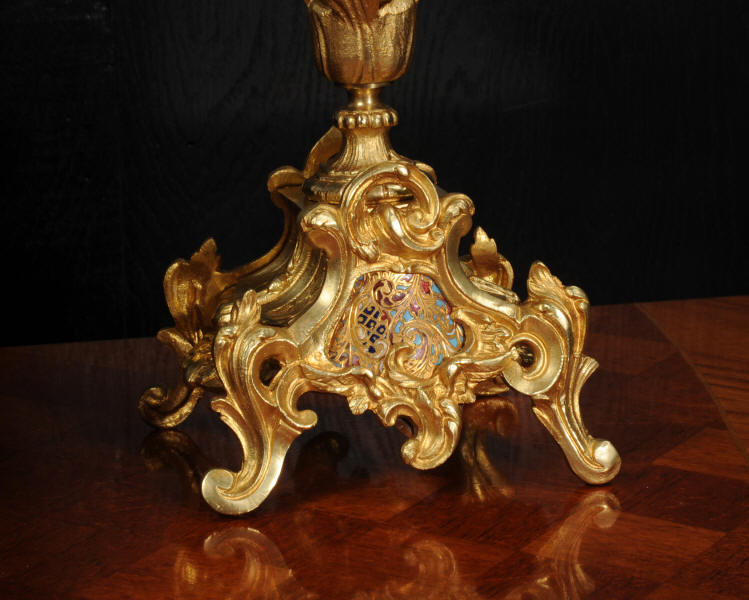 Candelabra are conforming in style with bases mounted with enamel and surmounted by four lights supported by twirling entwined acanthus. The dial is porcelain enamel on copper with delicate floral swags between the numbers. It is complete with it's original finely fretted gilt hands and convex glass. The rear door is glazed with frosted glass. The French movement is by Samuel Marti and is of high quality. It is in excellent clean and running condition having been fully overhauled by our clockmaker. Pendulum is original. It runs for 8 days and strikes the hours and halves on a bell. Click the video clip below to hear the bell and watch the clock running. Condition of the case is excellent, the original gilding is beautifully clean and bright with occasional wear, marks and discolouration. The enamel work is also excellent with no damage or losses. The dial is in excellent condition with no damage. Candelabra are slightly distorted.