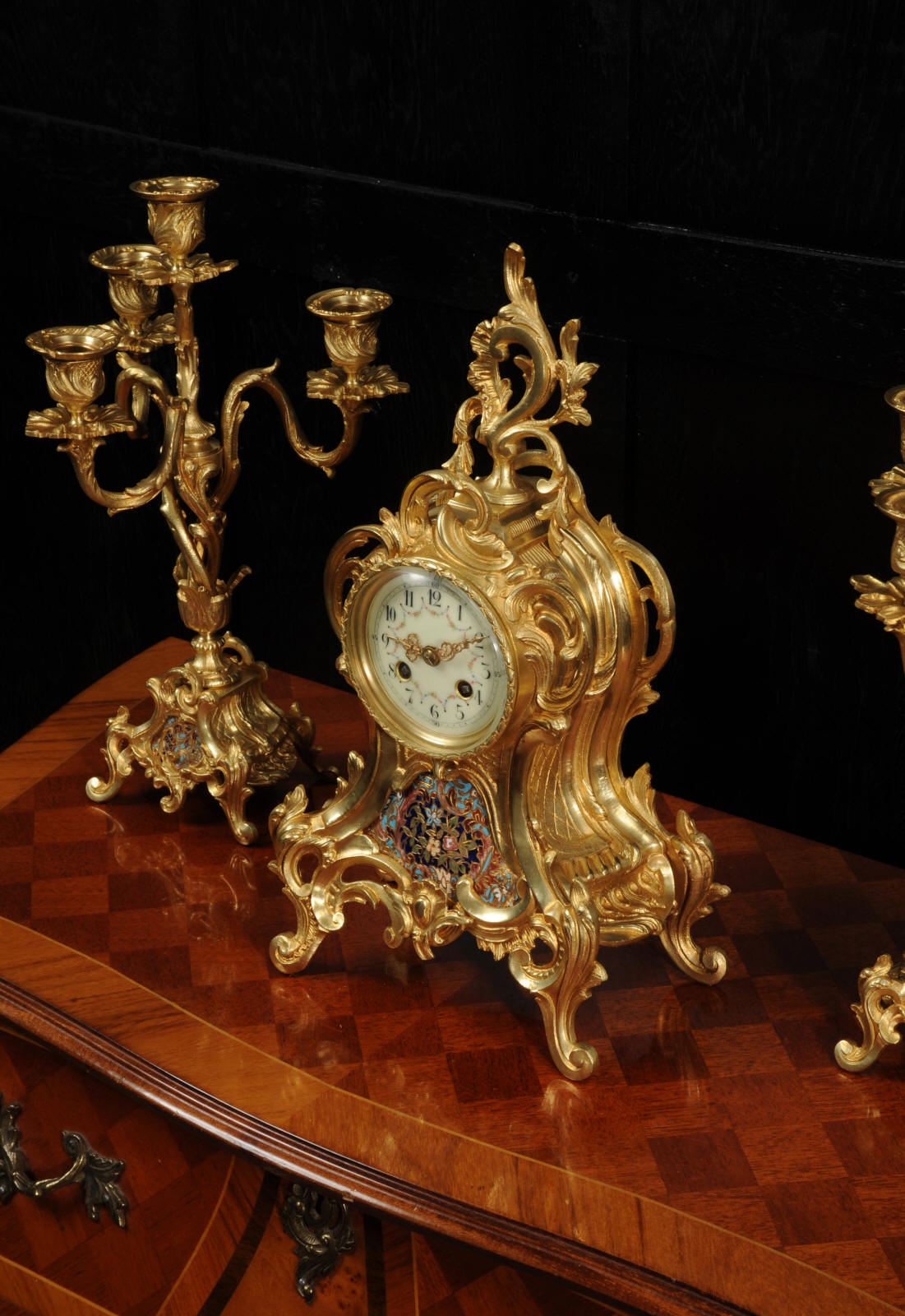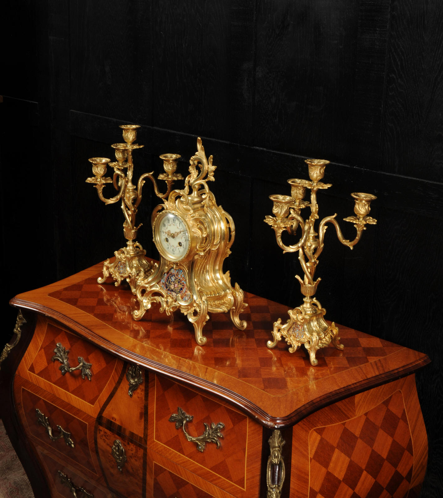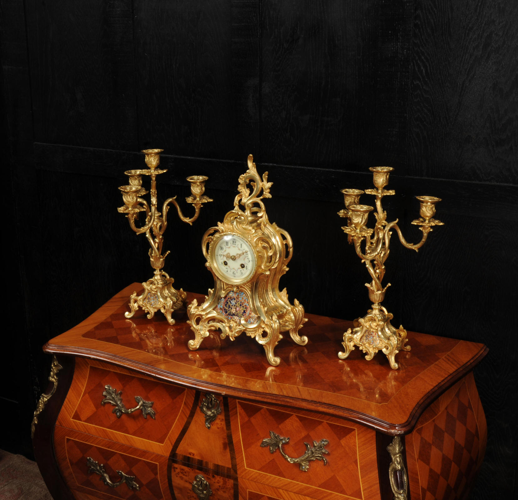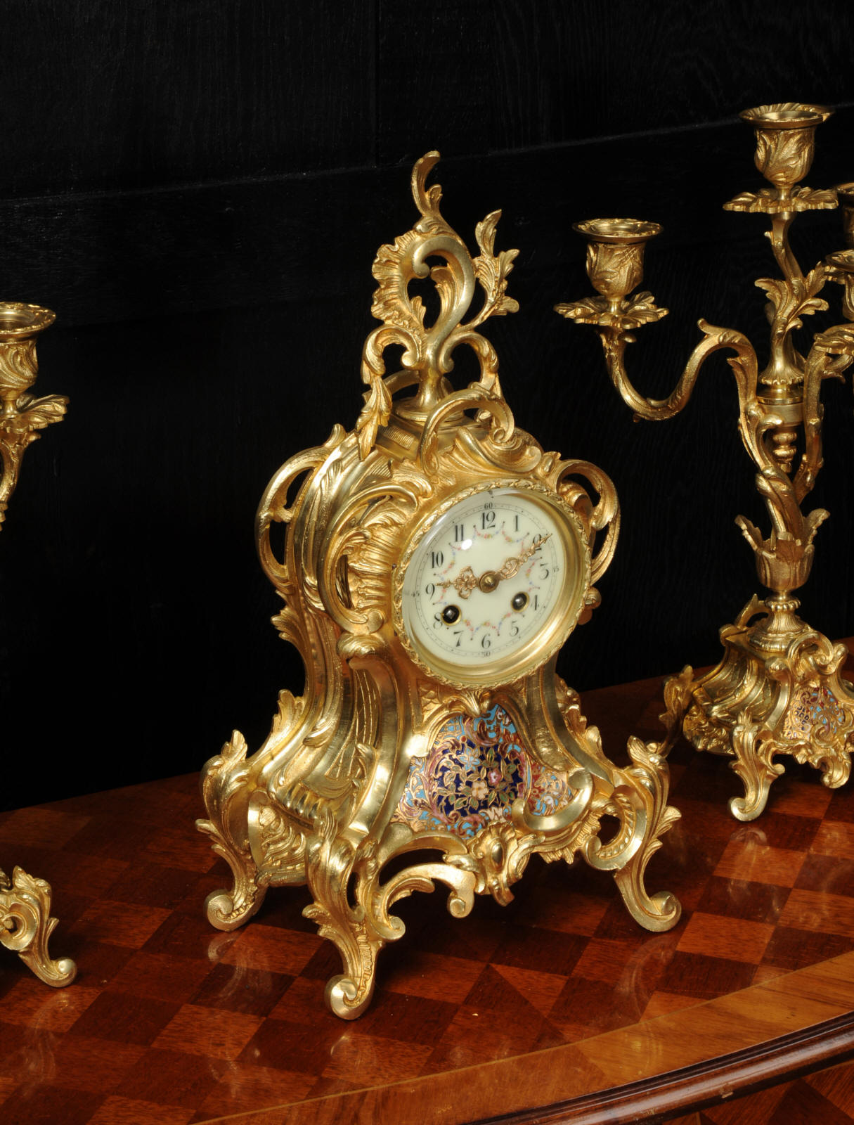 Candelabra are conforming in style with bases mounted with enamel and surmounted by four lights supported by twirling entwined acanthus. The dial is porcelain enamel on copper with delicate floral swags between the numbers. It is complete with it's original finely fretted gilt hands and convex glass. The rear door is glazed with frosted glass. The French movement is by Samuel Marti and is of high quality. It is in excellent clean and running condition having been fully overhauled by our clockmaker. Pendulum is original. It runs for 8 days and strikes the hours and halves on a bell. Click the video clip below to hear the bell and watch the clock running. Condition of the case is excellent, the original gilding is beautifully clean and bright with occasional wear, marks and discolouration. The enamel work is also excellent with no damage or losses. The dial is in excellent condition with no damage. Candelabra are slightly distorted.
