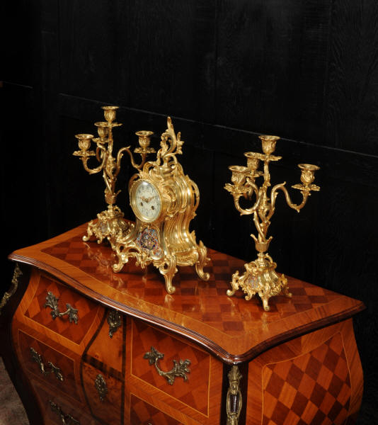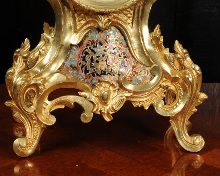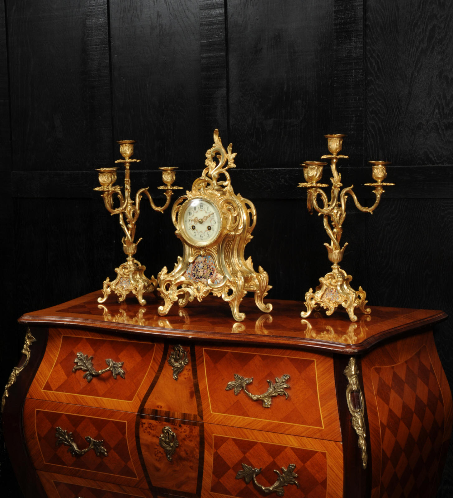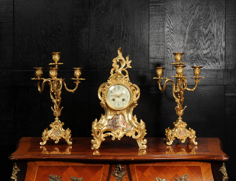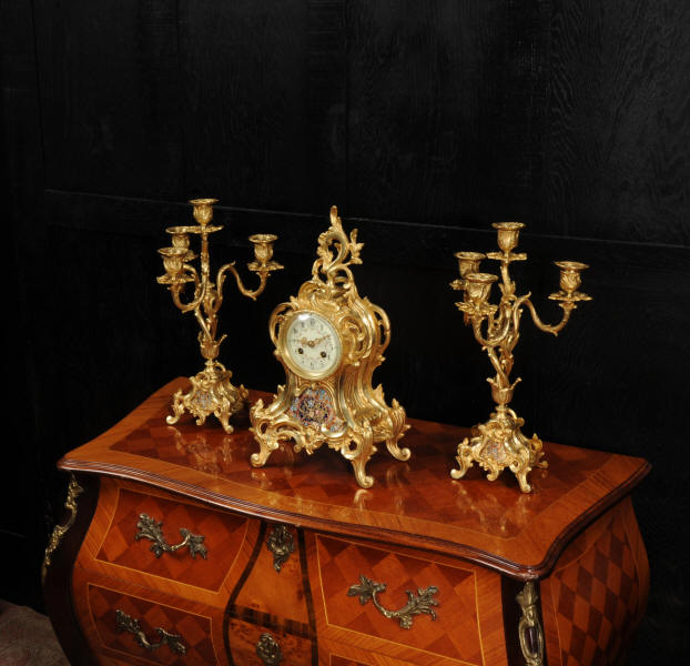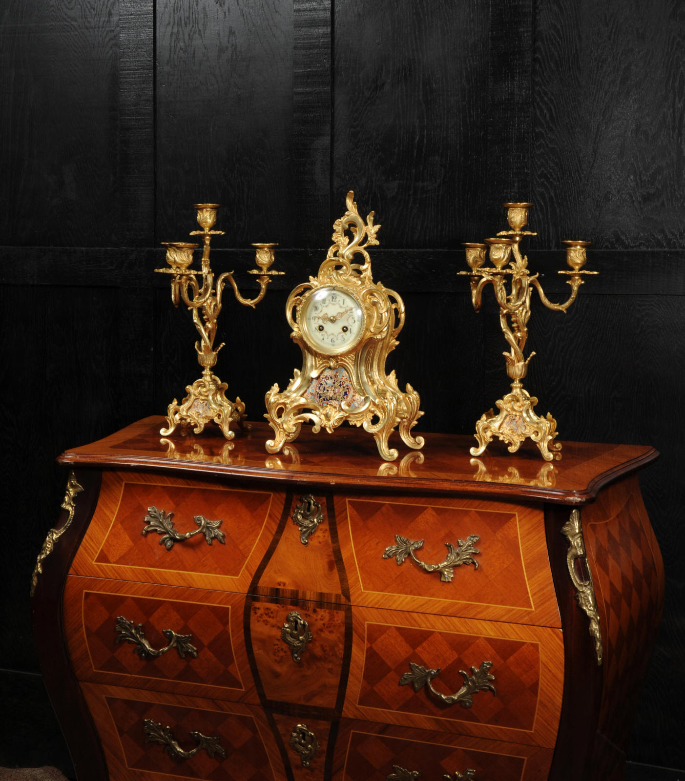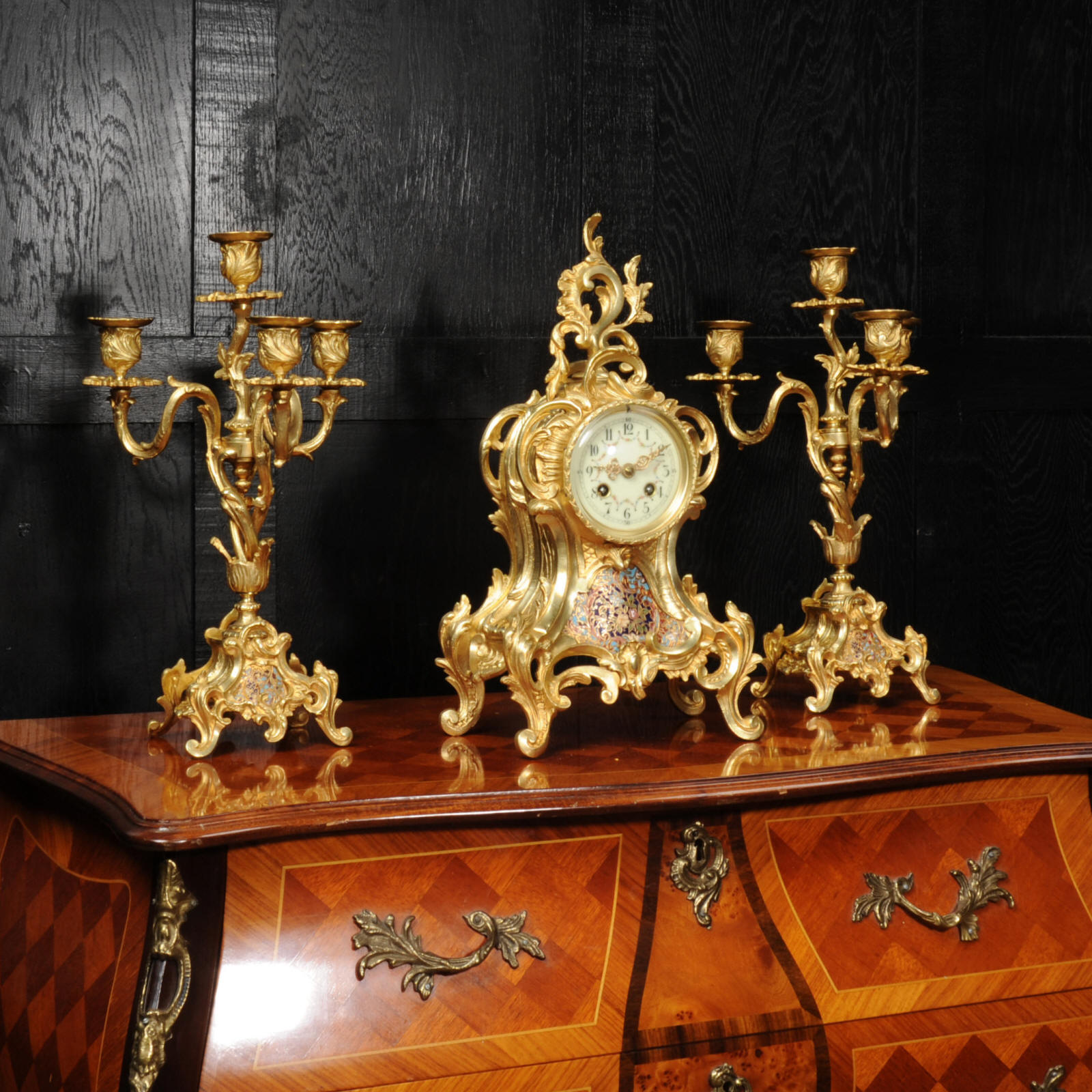 Candelabra are conforming in style with bases mounted with enamel and surmounted by four lights supported by twirling entwined acanthus. The dial is porcelain enamel on copper with delicate floral swags between the numbers. It is complete with it's original finely fretted gilt hands and convex glass. The rear door is glazed with frosted glass. The French movement is by Samuel Marti and is of high quality. It is in excellent clean and running condition having been fully overhauled by our clockmaker. Pendulum is original. It runs for 8 days and strikes the hours and halves on a bell. Click the video clip below to hear the bell and watch the clock running. Condition of the case is excellent, the original gilding is beautifully clean and bright with occasional wear, marks and discolouration. The enamel work is also excellent with no damage or losses. The dial is in excellent condition with no damage. Candelabra are slightly distorted.