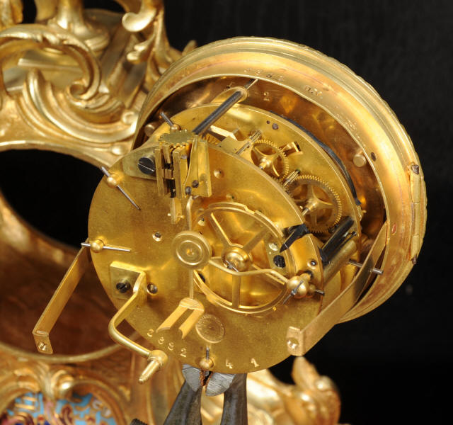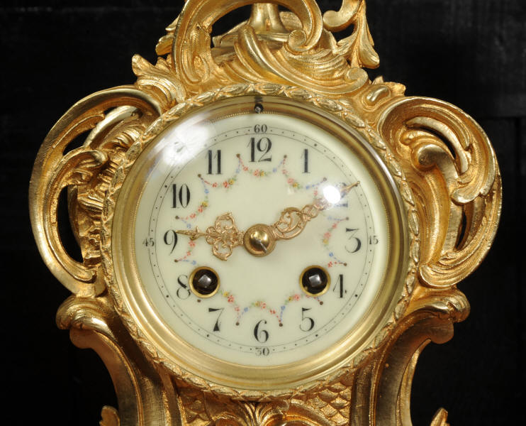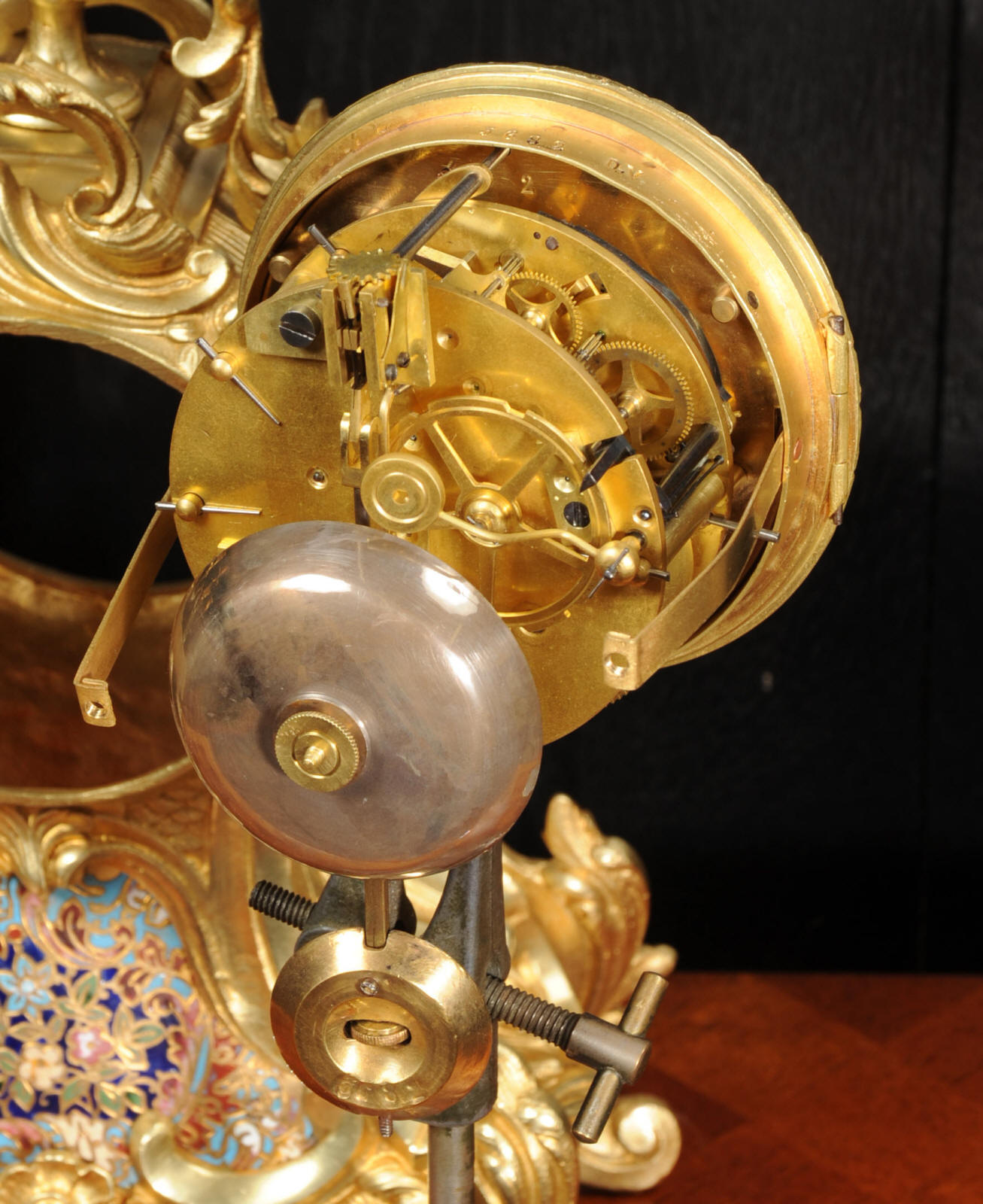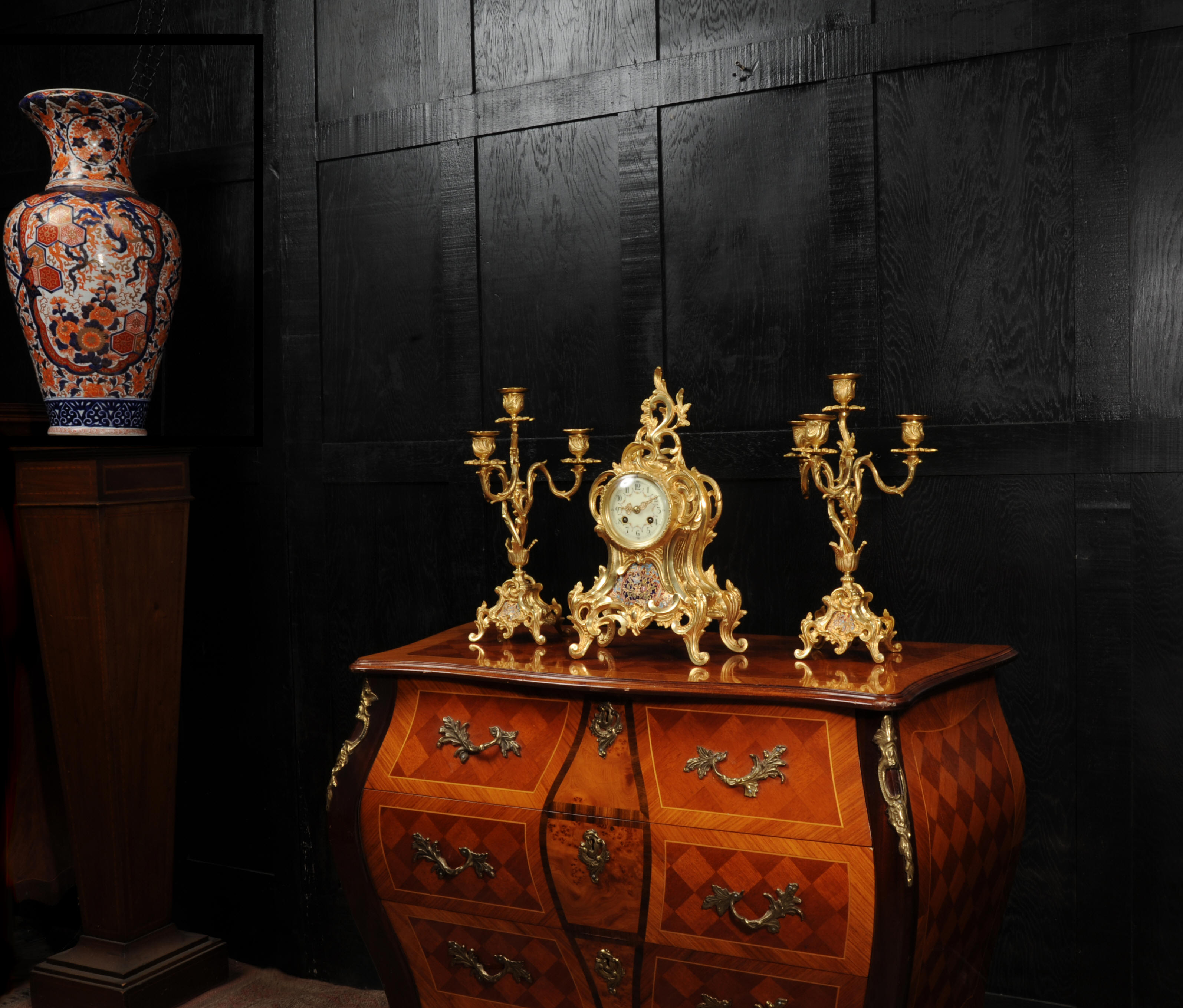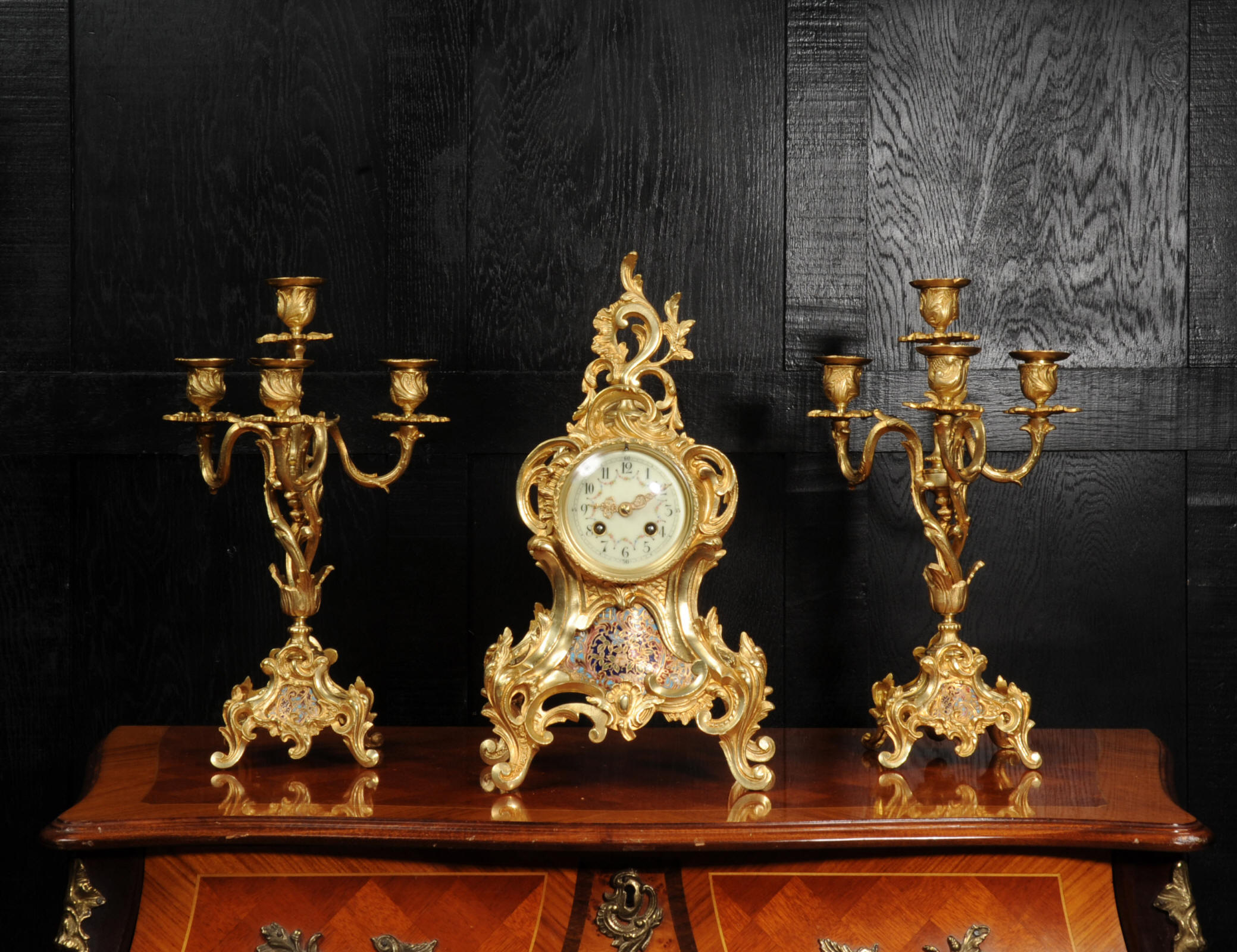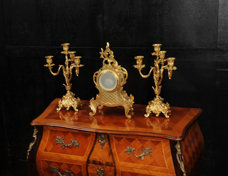 Candelabra are conforming in style with bases mounted with enamel and surmounted by four lights supported by twirling entwined acanthus. The dial is porcelain enamel on copper with delicate floral swags between the numbers. It is complete with it's original finely fretted gilt hands and convex glass. The rear door is glazed with frosted glass. The French movement is by Samuel Marti and is of high quality. It is in excellent clean and running condition having been fully overhauled by our clockmaker. Pendulum is original. It runs for 8 days and strikes the hours and halves on a bell. Click the video clip below to hear the bell and watch the clock running. Condition of the case is excellent, the original gilding is beautifully clean and bright with occasional wear, marks and discolouration. The enamel work is also excellent with no damage or losses. The dial is in excellent condition with no damage. Candelabra are slightly distorted.