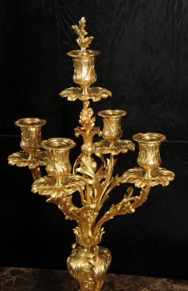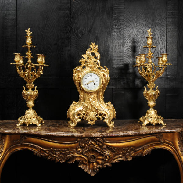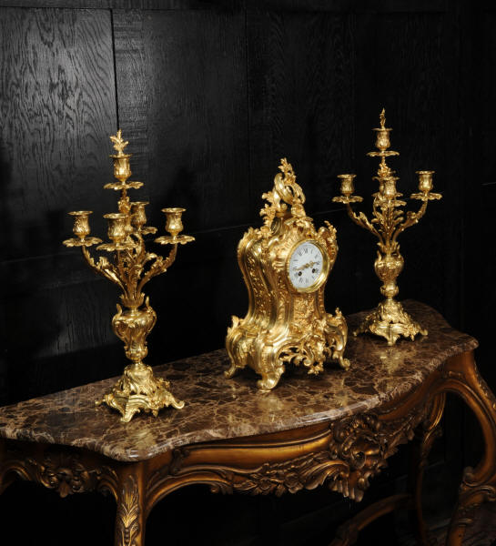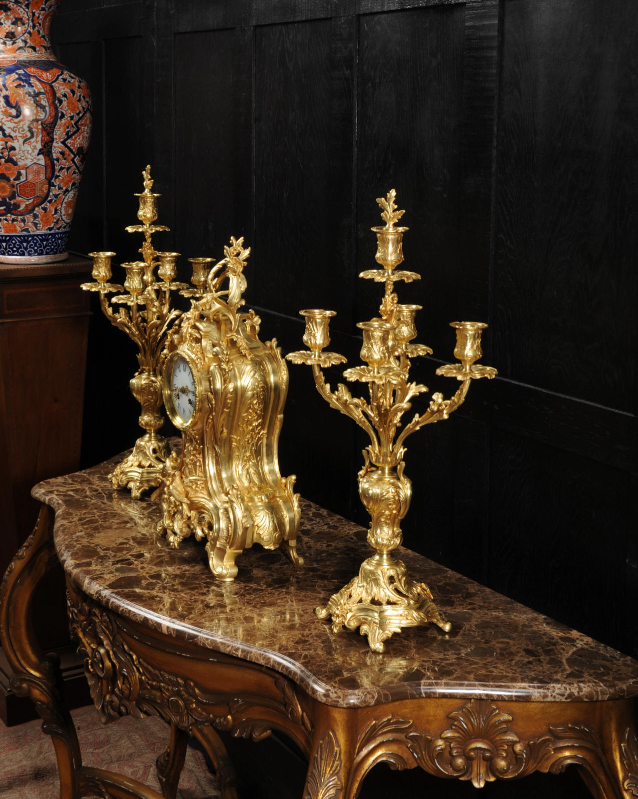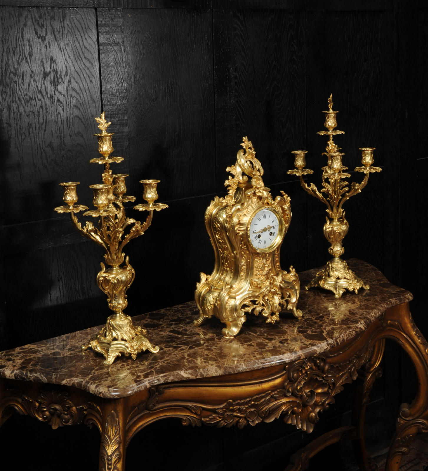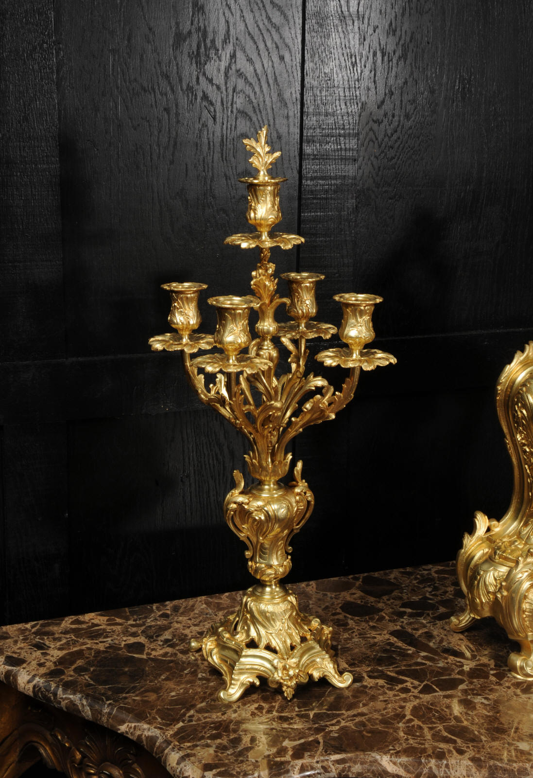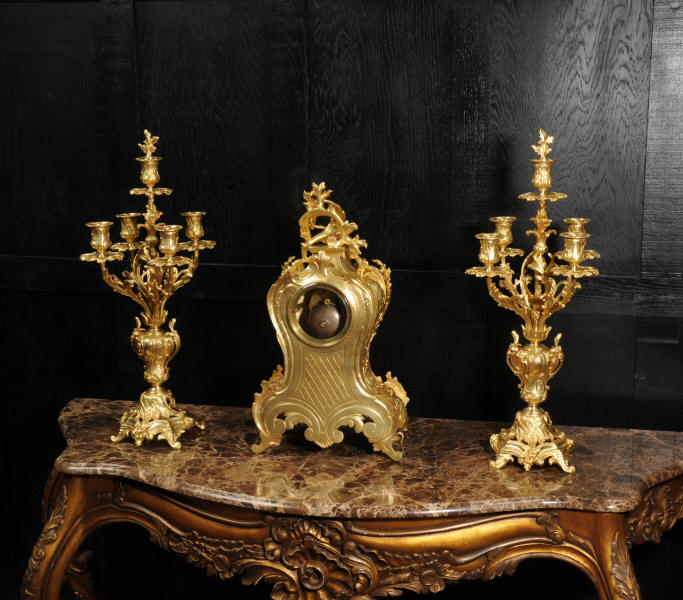 Candelabra are conforming in style with four branches formed of acanthus with a twirling central stem. They are complete with original snuffers that sit in the central nozzle as finials when not in use. The dial is porcelain enamel on copper with pretty floral swags between the numerals and original finely fretted gilt hands. The rear door is also glazed to allow the movement to be seen. The French movement is by Japy Frères and is of high quality. It is in excellent clean and running condition having been fully overhauled by our clockmaker. Pendulum is original. It runs for 8 days and strikes the hours and halves on a bell. Click the video below to hear the bell and watch the clock running. Condition of the case is excellent, the original gilding is beautifully clean and bright with hardly any wear or discolouration. The dial is also in good condition, there is an area of hairlines and cracking around the two and three o'clock areas. Candelabra are slightly distorted.