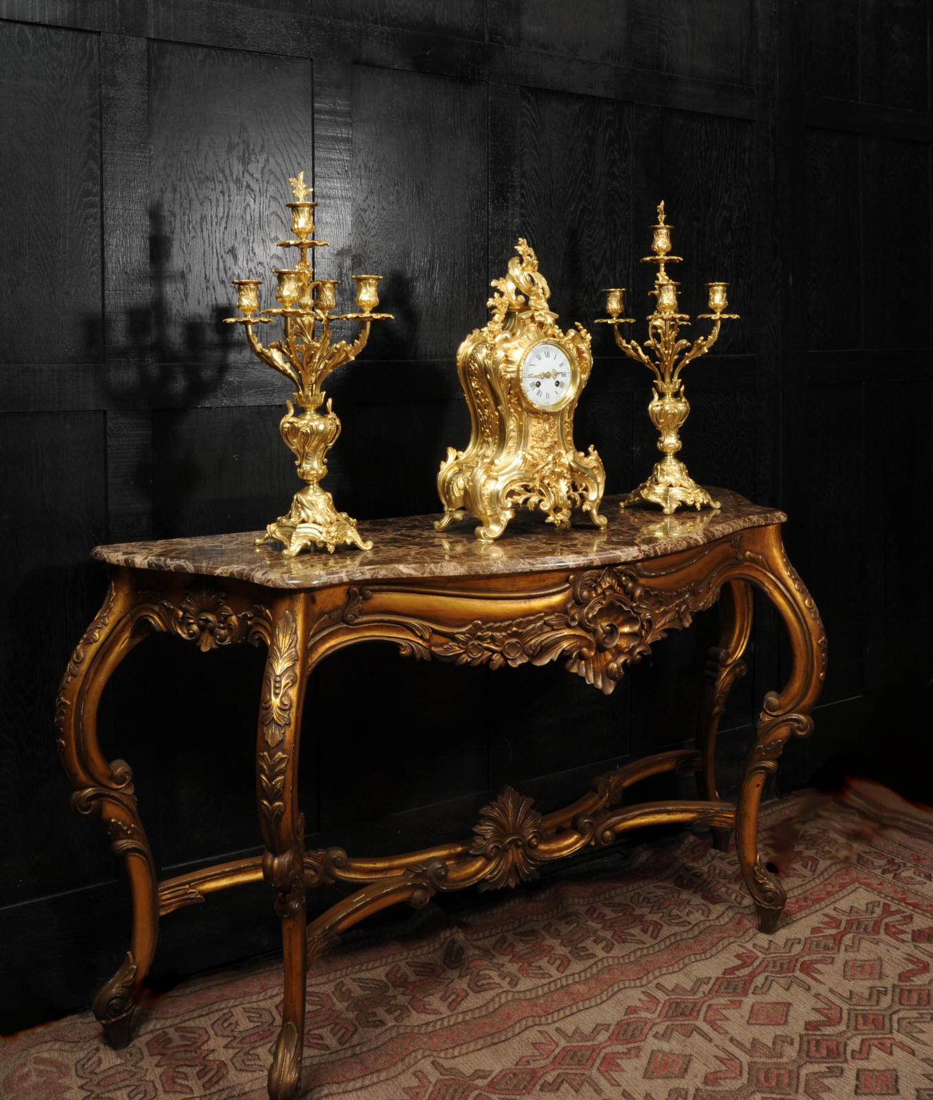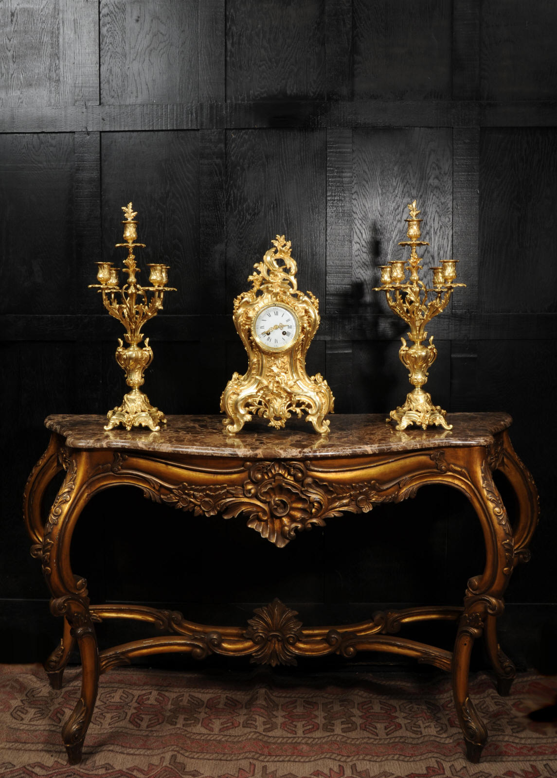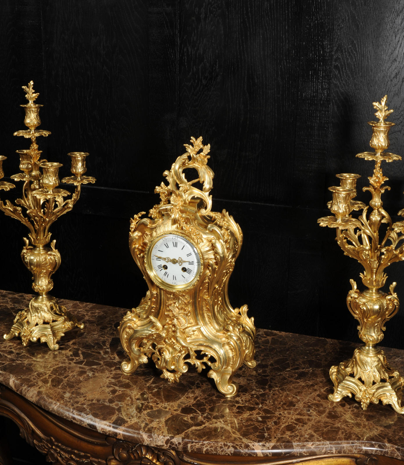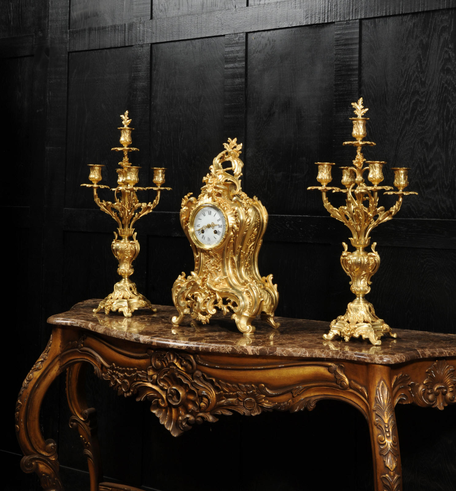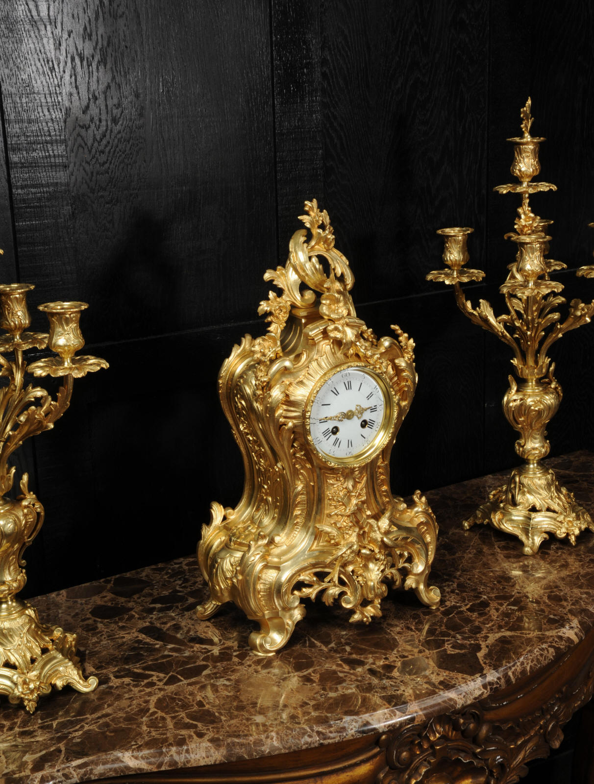 Candelabra are conforming in style with four branches formed of acanthus with a twirling central stem. They are complete with original snuffers that sit in the central nozzle as finials when not in use. The dial is porcelain enamel on copper with pretty floral swags between the numerals and original finely fretted gilt hands. The rear door is also glazed to allow the movement to be seen. The French movement is by Japy Frères and is of high quality. It is in excellent clean and running condition having been fully overhauled by our clockmaker. Pendulum is original. It runs for 8 days and strikes the hours and halves on a bell. Click the video below to hear the bell and watch the clock running. Condition of the case is excellent, the original gilding is beautifully clean and bright with hardly any wear or discolouration. The dial is also in good condition, there is an area of hairlines and cracking around the two and three o'clock areas. Candelabra are slightly distorted.
