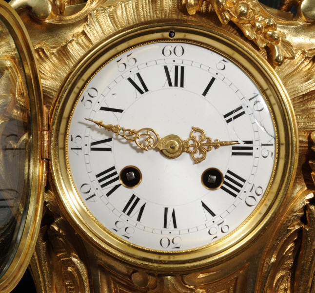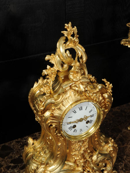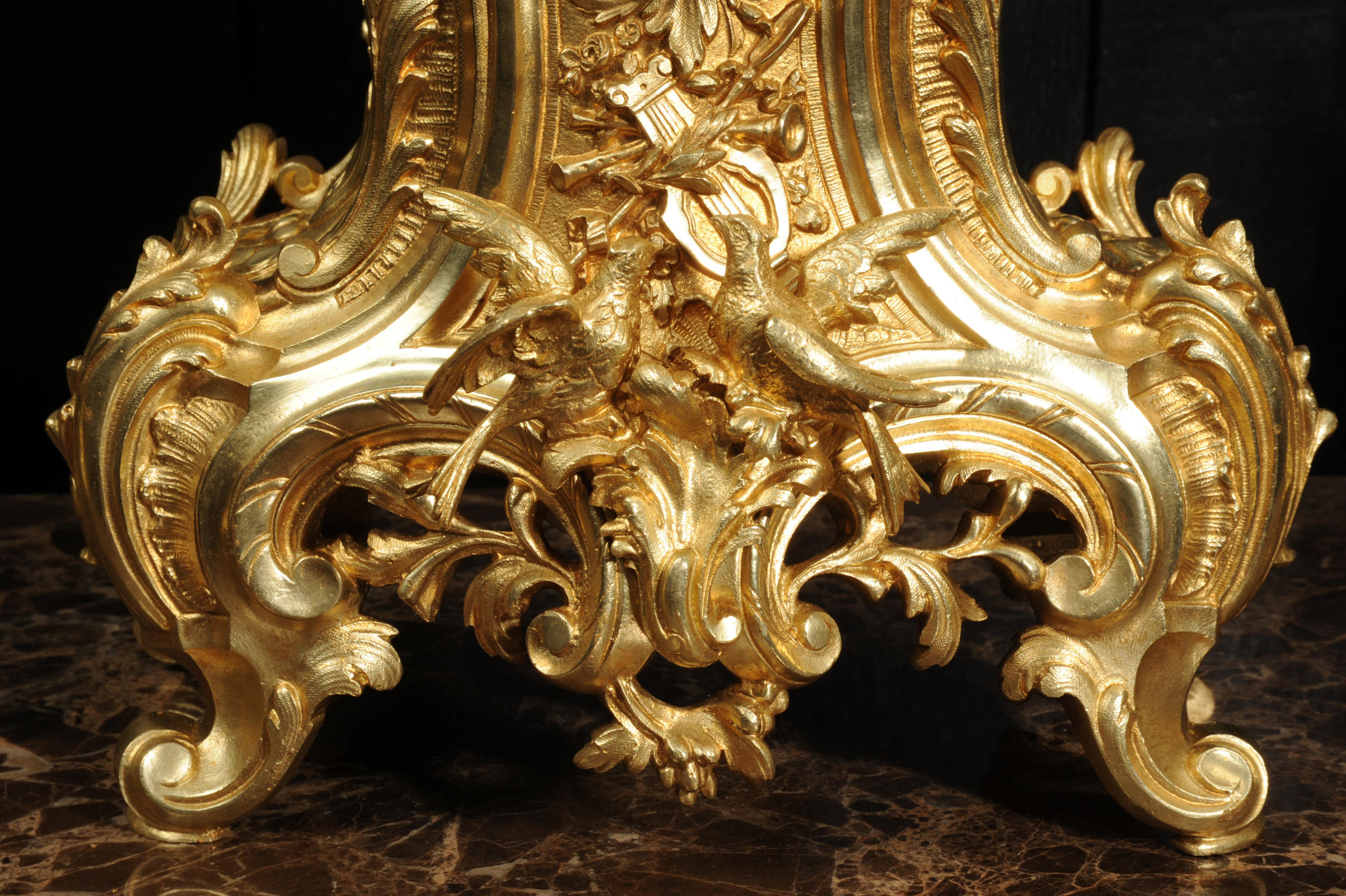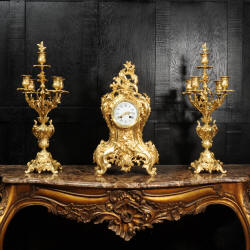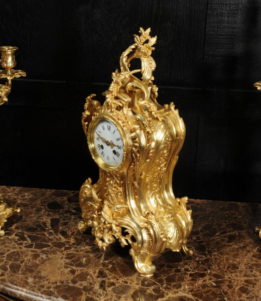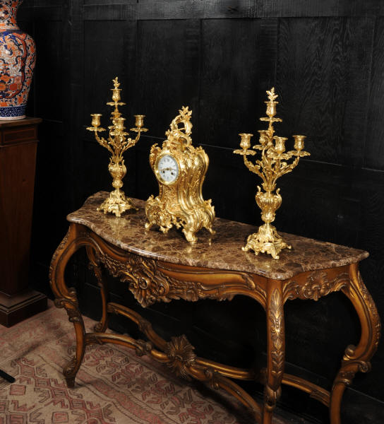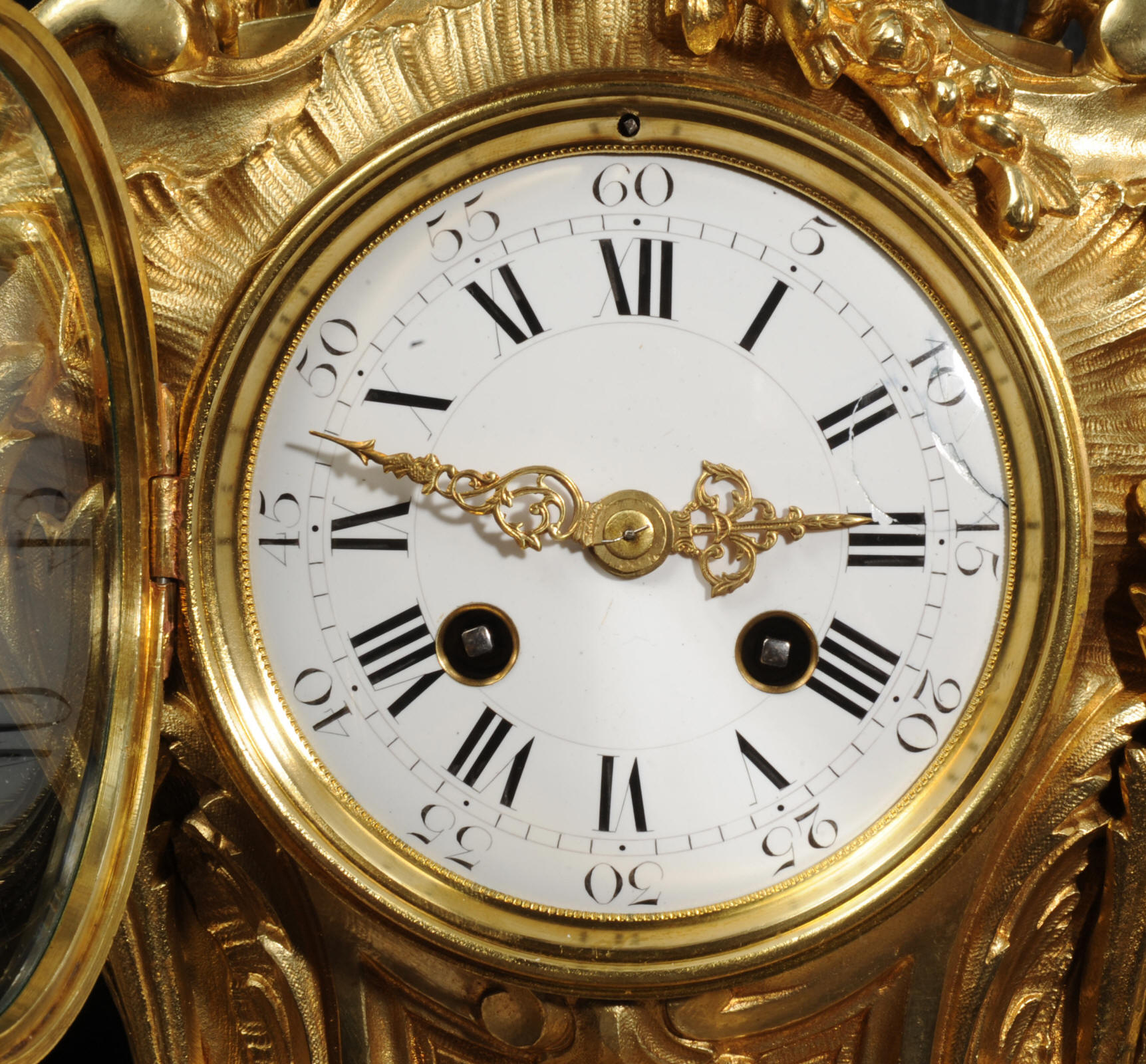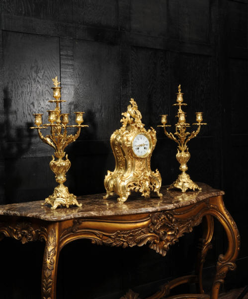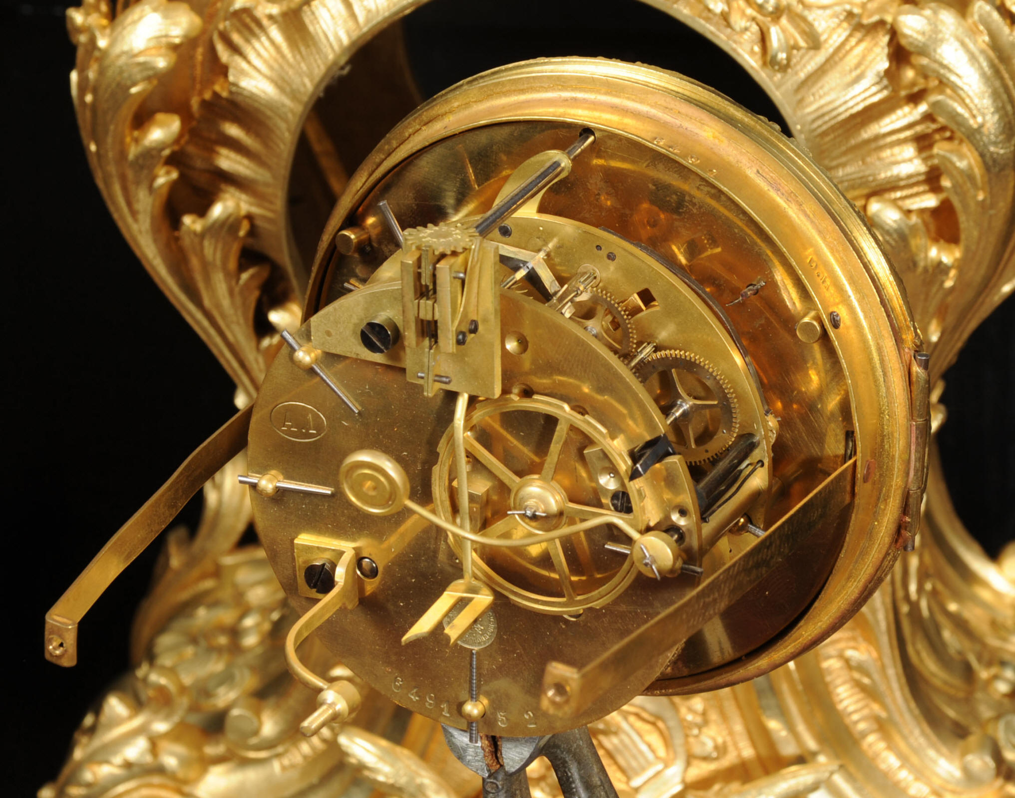 Candelabra are conforming in style with four branches formed of acanthus with a twirling central stem. They are complete with original snuffers that sit in the central nozzle as finials when not in use. The dial is porcelain enamel on copper with pretty floral swags between the numerals and original finely fretted gilt hands. The rear door is also glazed to allow the movement to be seen. The French movement is by Japy Frères and is of high quality. It is in excellent clean and running condition having been fully overhauled by our clockmaker. Pendulum is original. It runs for 8 days and strikes the hours and halves on a bell. Click the video below to hear the bell and watch the clock running. Condition of the case is excellent, the original gilding is beautifully clean and bright with hardly any wear or discolouration. The dial is also in good condition, there is an area of hairlines and cracking around the two and three o'clock areas. Candelabra are slightly distorted.
