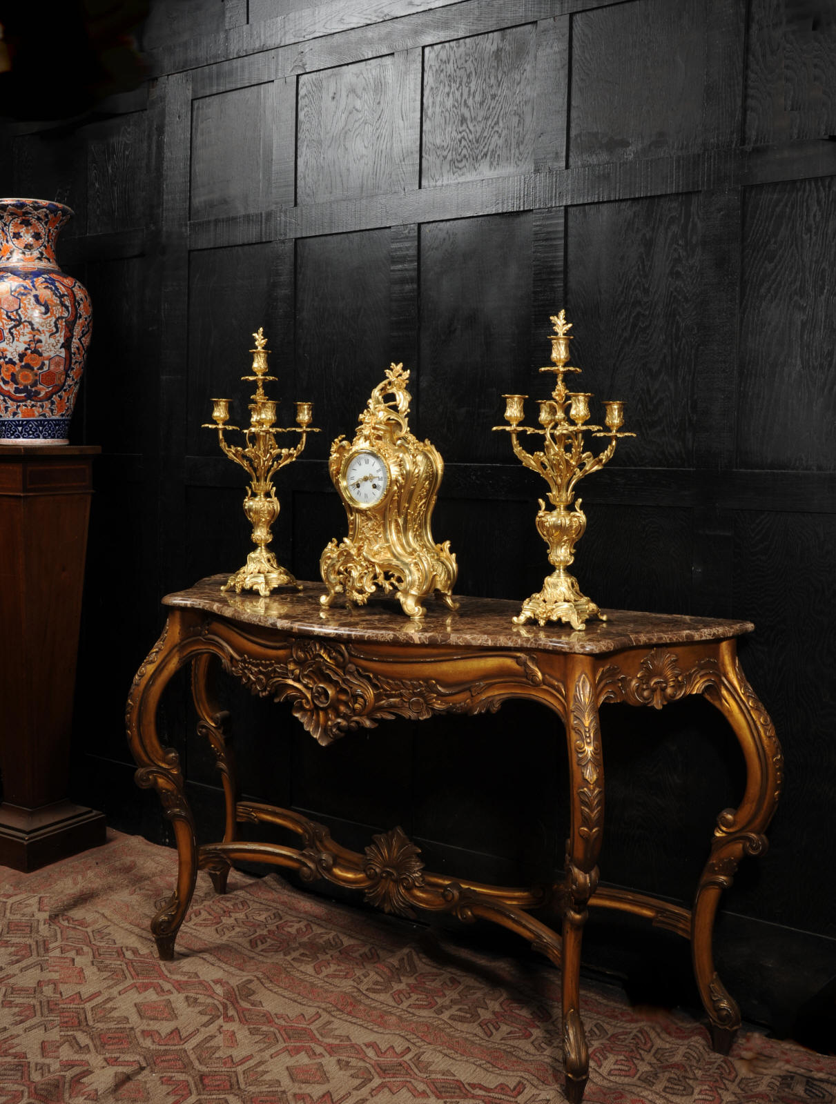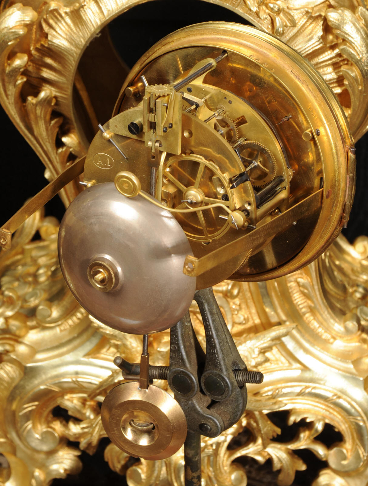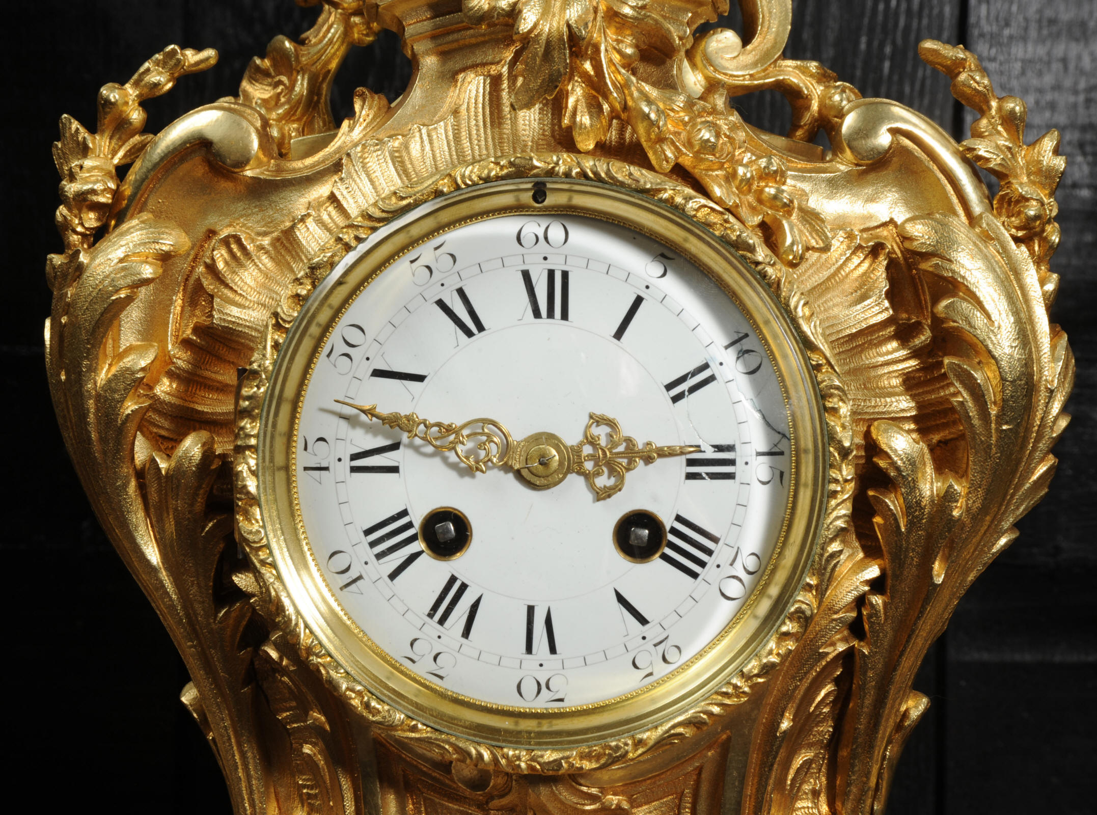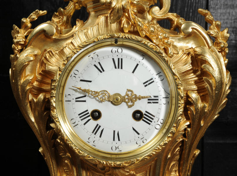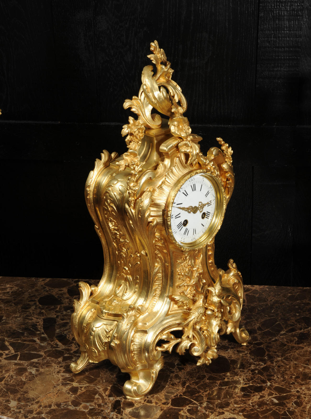 Candelabra are conforming in style with four branches formed of acanthus with a twirling central stem. They are complete with original snuffers that sit in the central nozzle as finials when not in use. The dial is porcelain enamel on copper with pretty floral swags between the numerals and original finely fretted gilt hands. The rear door is also glazed to allow the movement to be seen. The French movement is by Japy Frères and is of high quality. It is in excellent clean and running condition having been fully overhauled by our clockmaker. Pendulum is original. It runs for 8 days and strikes the hours and halves on a bell. Click the video below to hear the bell and watch the clock running. Condition of the case is excellent, the original gilding is beautifully clean and bright with hardly any wear or discolouration. The dial is also in good condition, there is an area of hairlines and cracking around the two and three o'clock areas. Candelabra are slightly distorted.