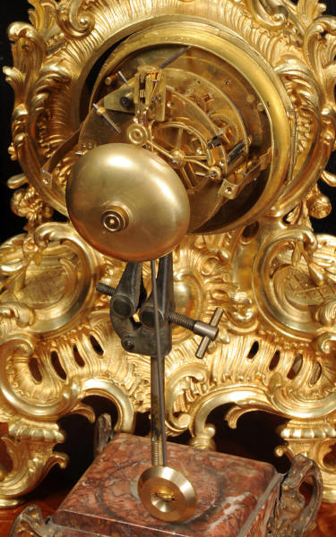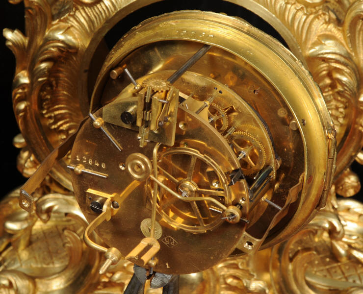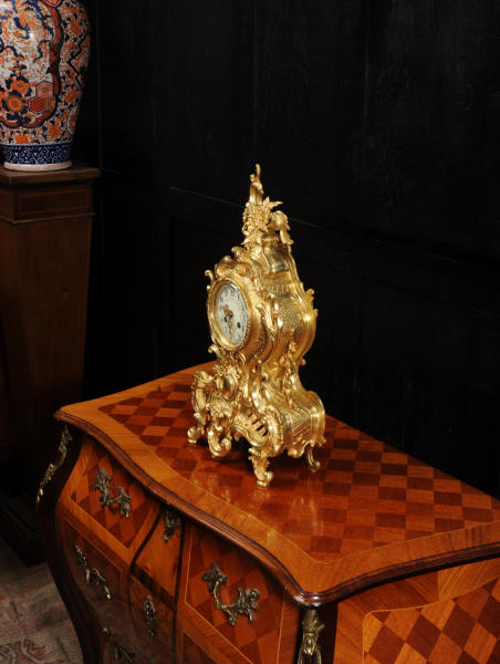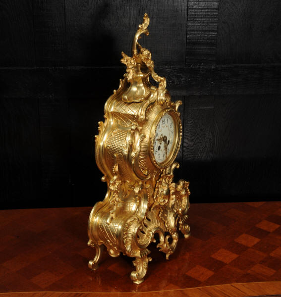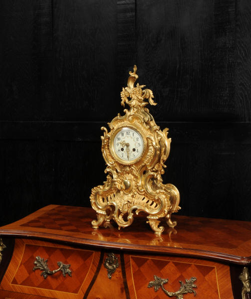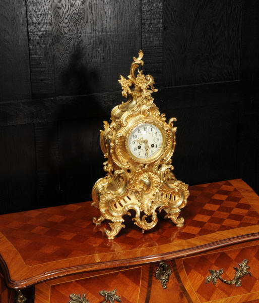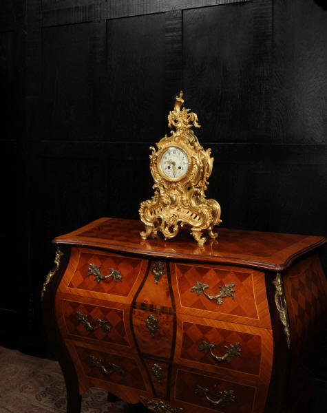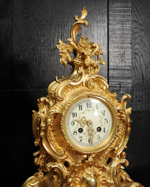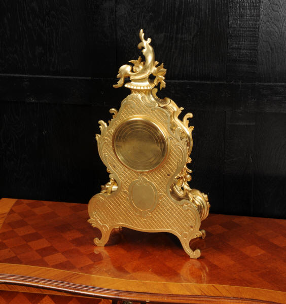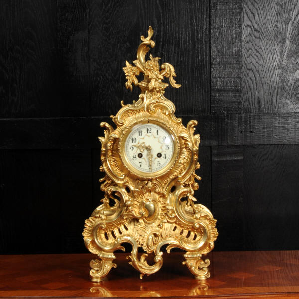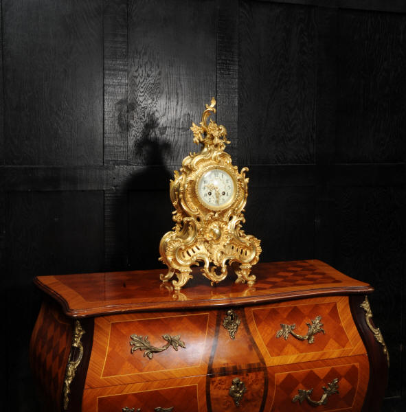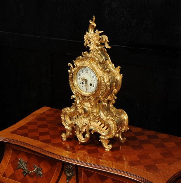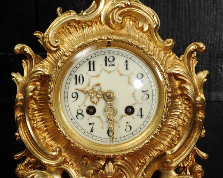 The dial is porcelain enamel on copper with delicately painted swags between the hours and finely fretted gilt brass hands. The Rococo bezel is fitted with convex glass. The French movement is by Japy Frères and is of high quality. It is in excellent clean and running condition having been fully overhauled by our clockmaker. Pendulum is a replacement. It runs for 8 days and strikes the hours and halves on a bell. Click the video below to hear the bell and watch the clock running! Condition of the case is excellent, beautifully clean and bright with hardly any wear or discolouration and there are no losses. The dial is also in excellent condition with no major damage or marks.