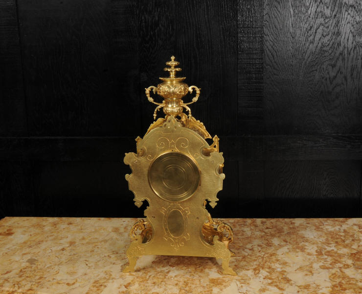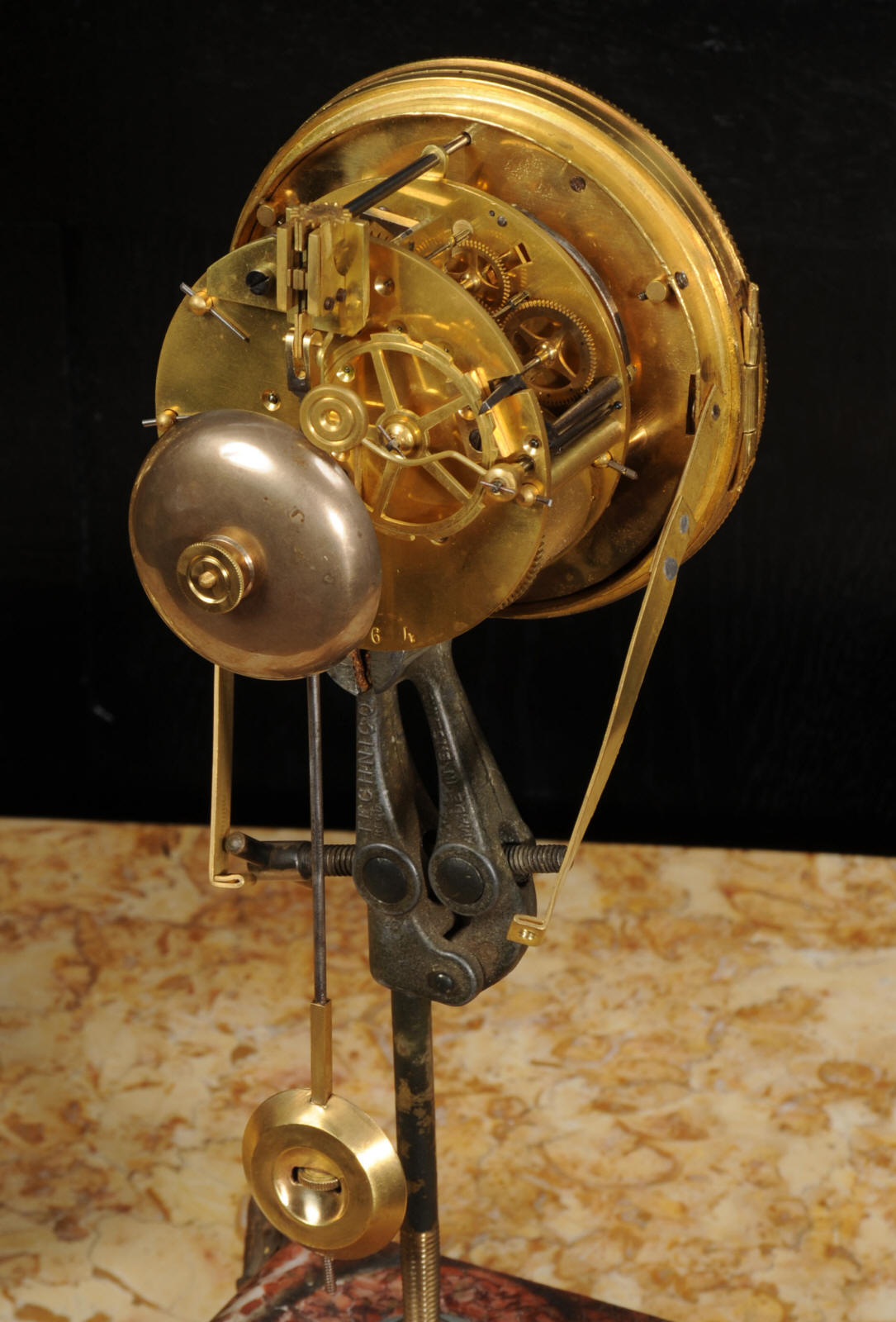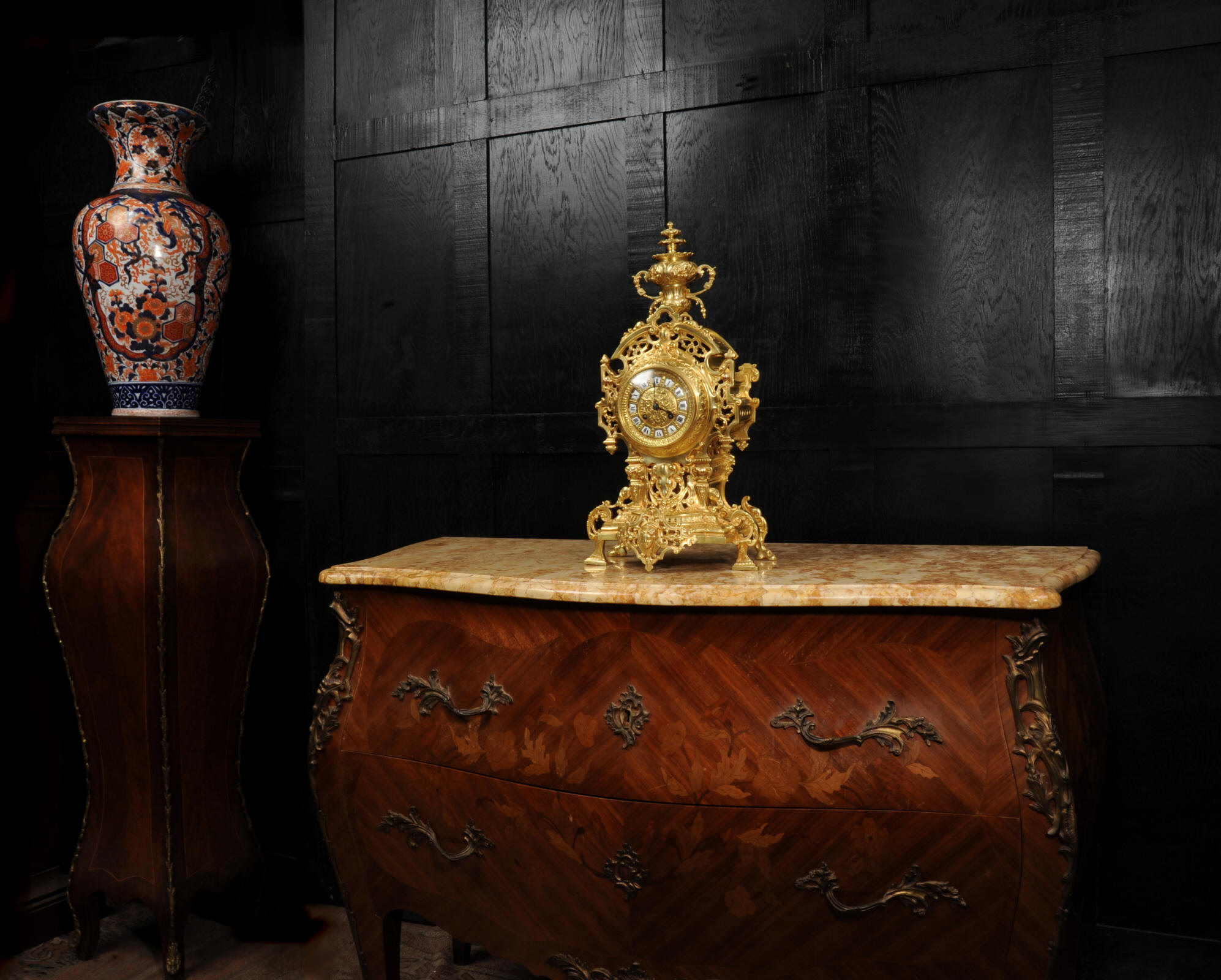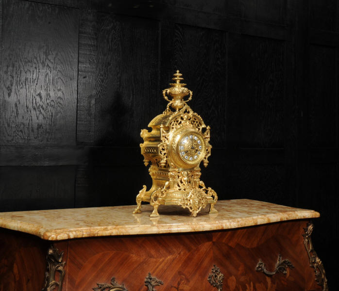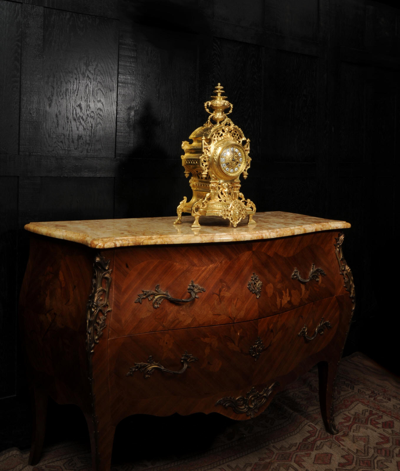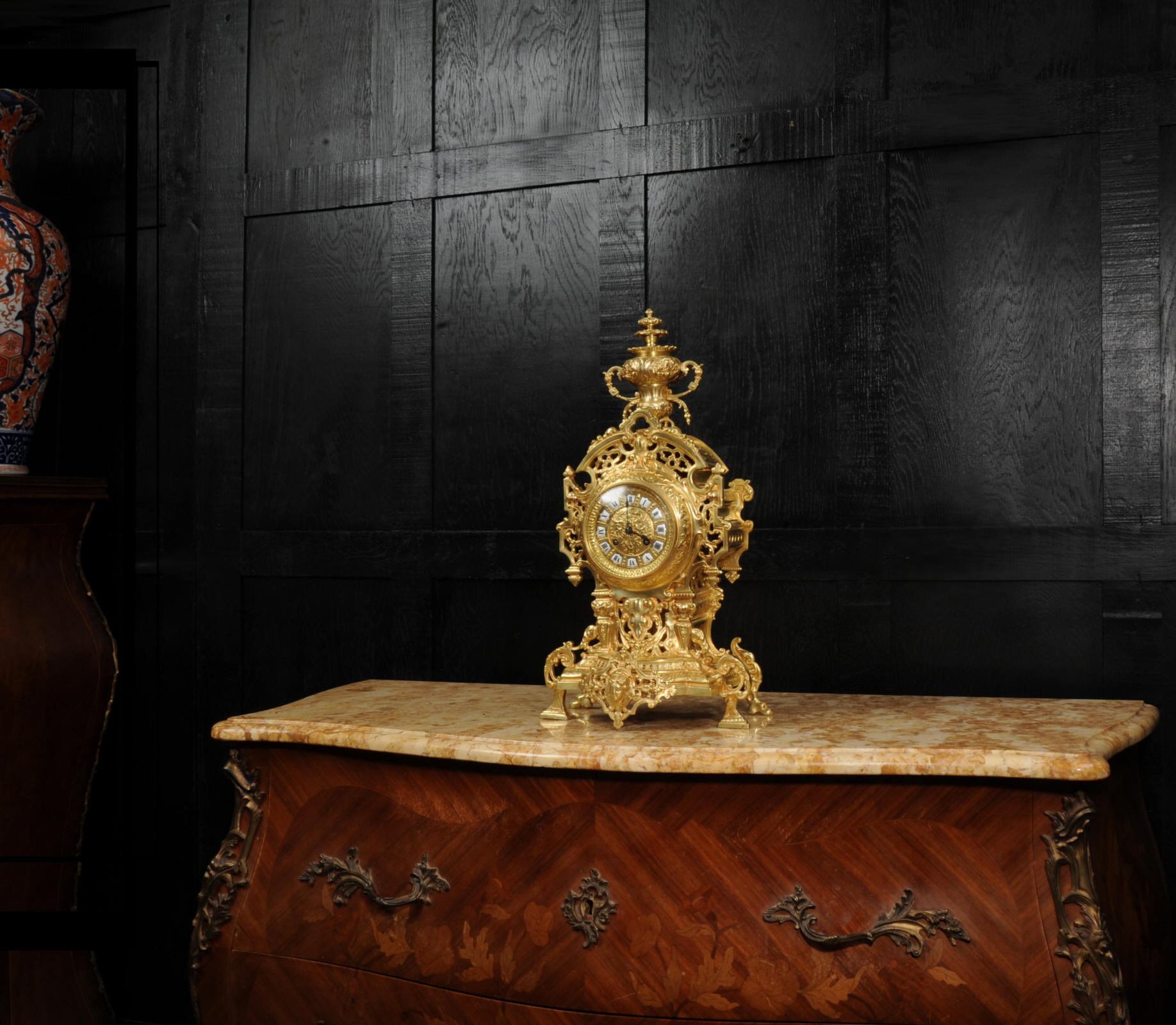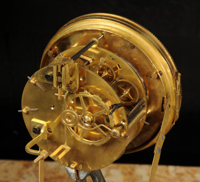 The dial is also gilt bronze with 12 individual enamel cartouches, original blued steel hands and convex glass. The French movement is of high quality and is in excellent clean and running condition having been fully overhauled by our clockmaker. Pendulum is an old replacement. It runs for 8 days and strikes the hours and halves on a bell. Click the video below to hear the bell and watch the clock running.