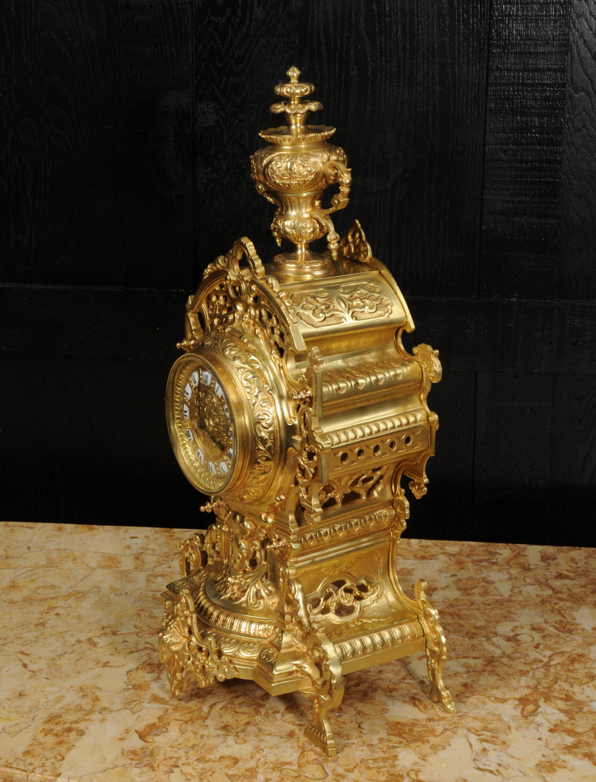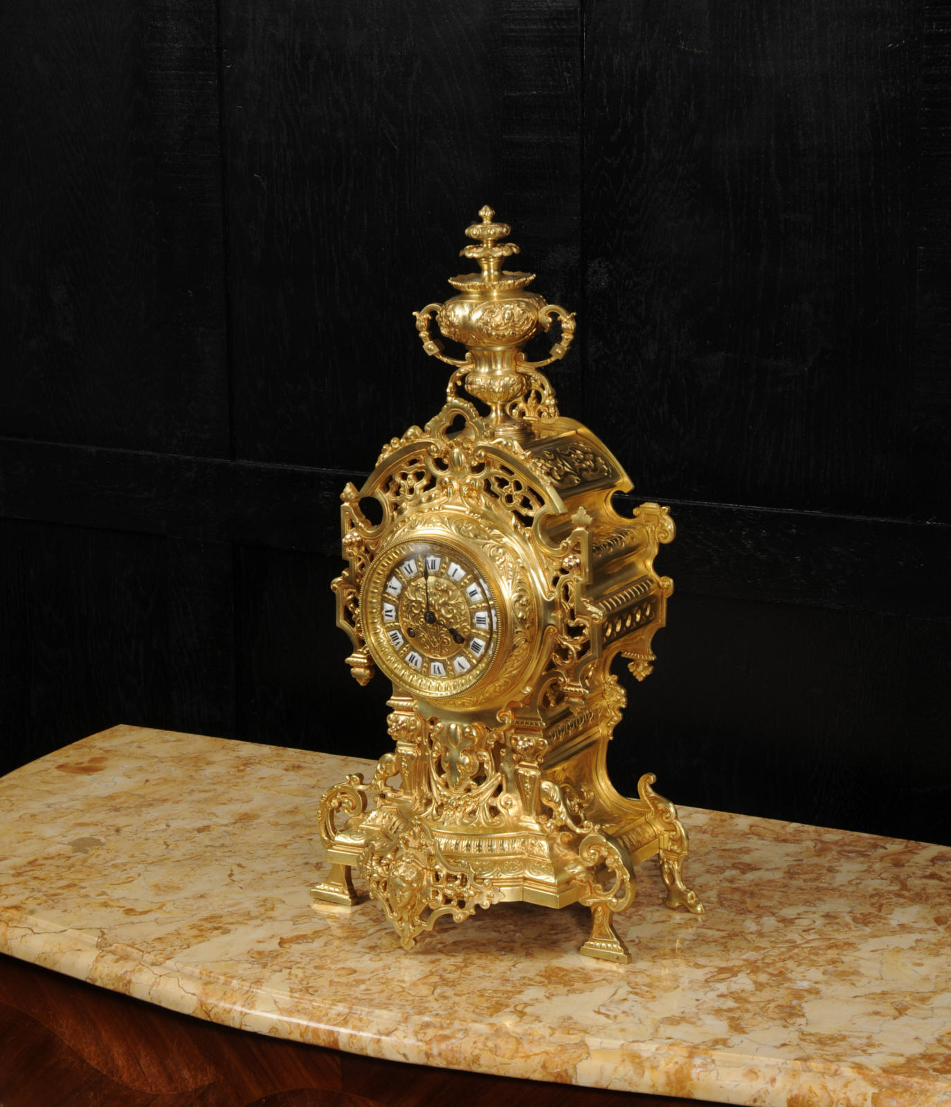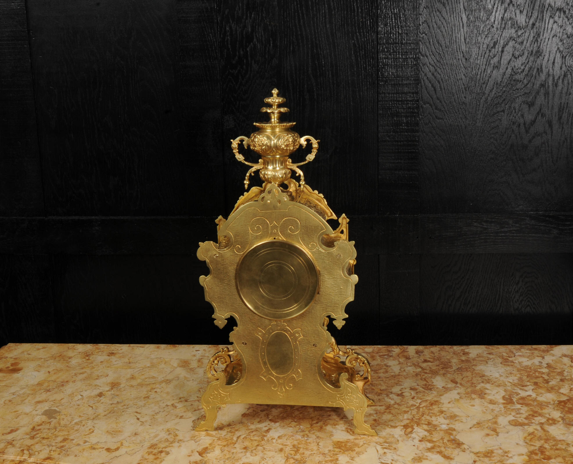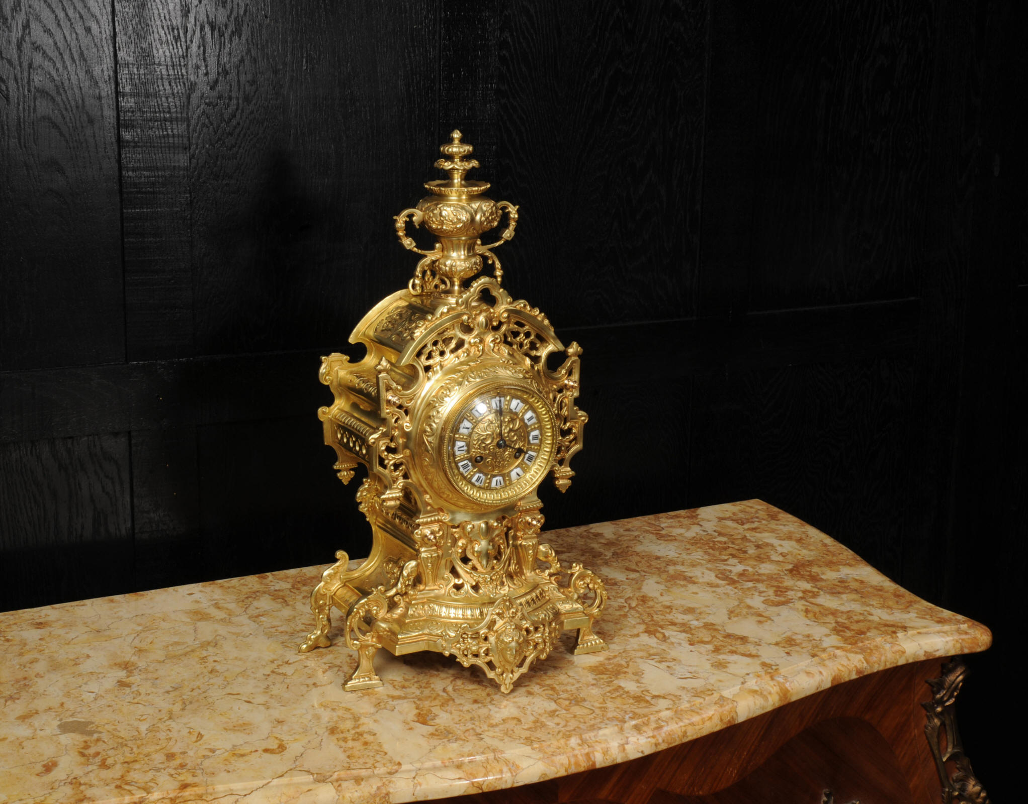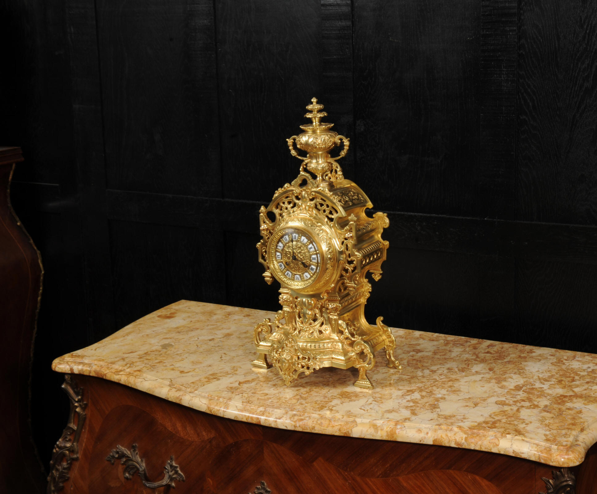 The dial is also gilt bronze with 12 individual enamel cartouches, original blued steel hands and convex glass. The French movement is of high quality and is in excellent clean and running condition having been fully overhauled by our clockmaker. Pendulum is an old replacement. It runs for 8 days and strikes the hours and halves on a bell. Click the video below to hear the bell and watch the clock running.
