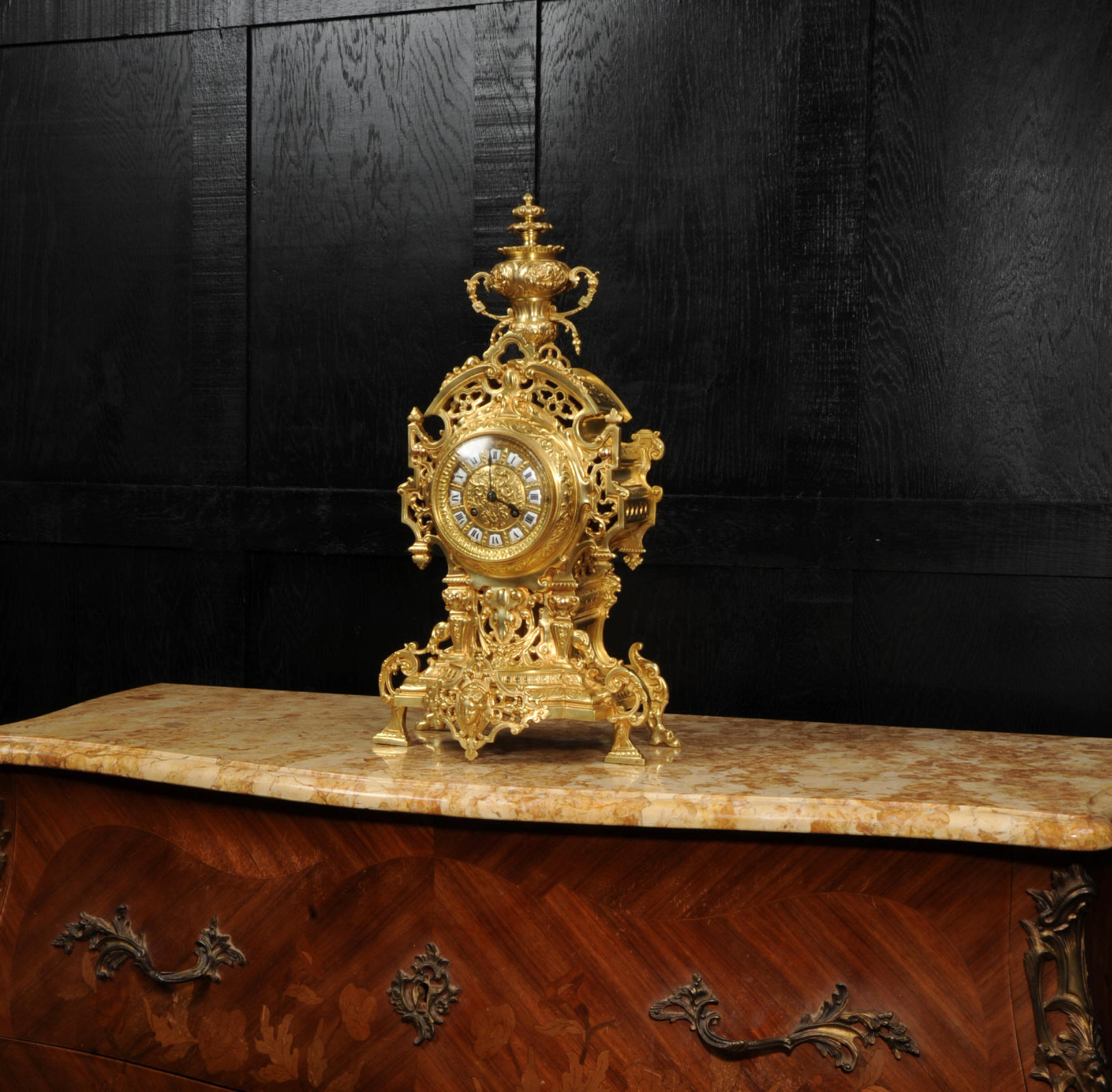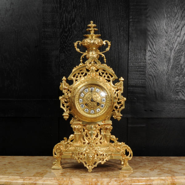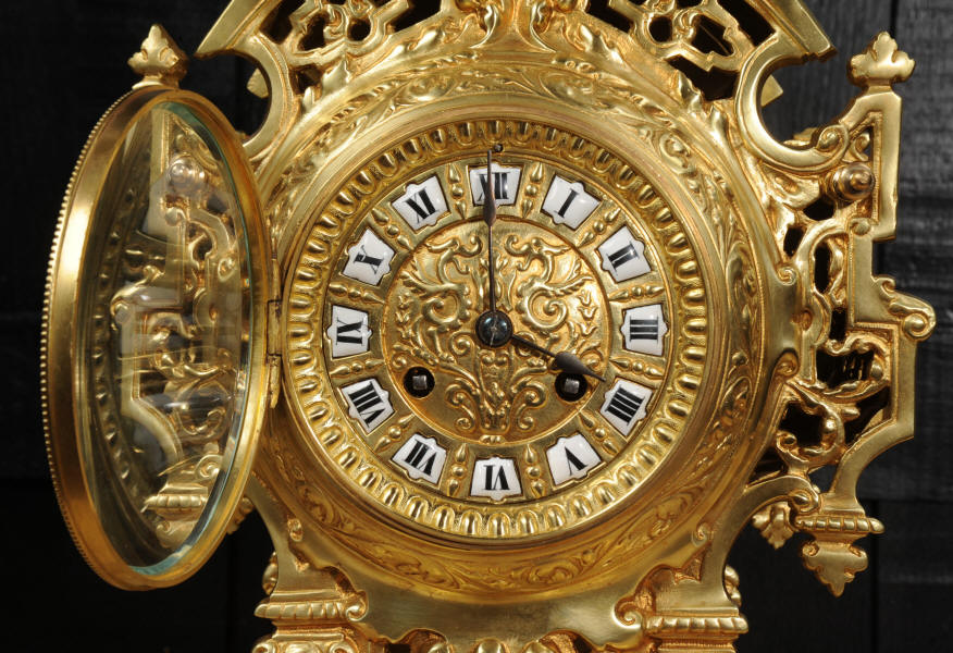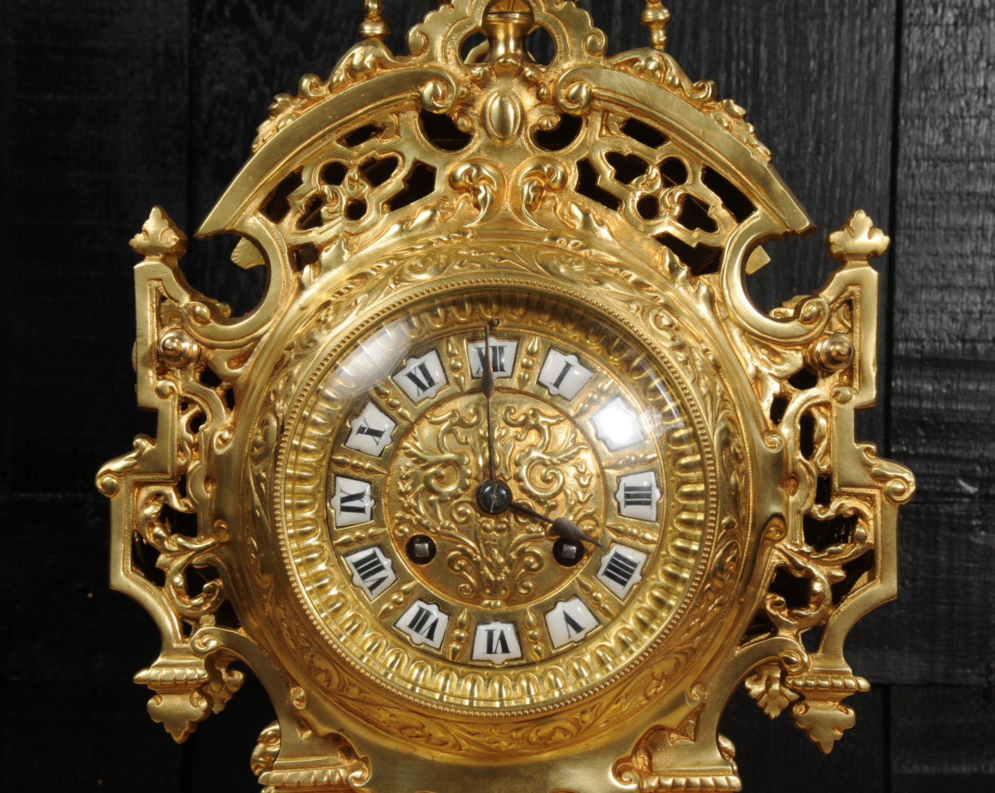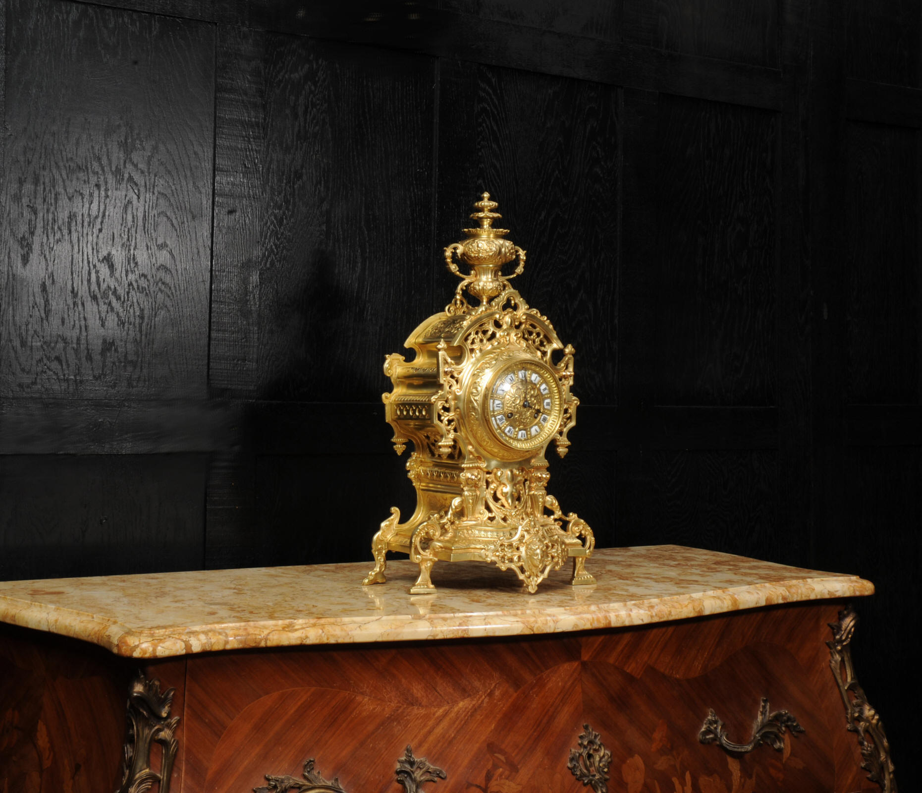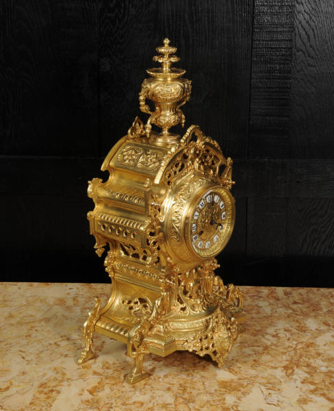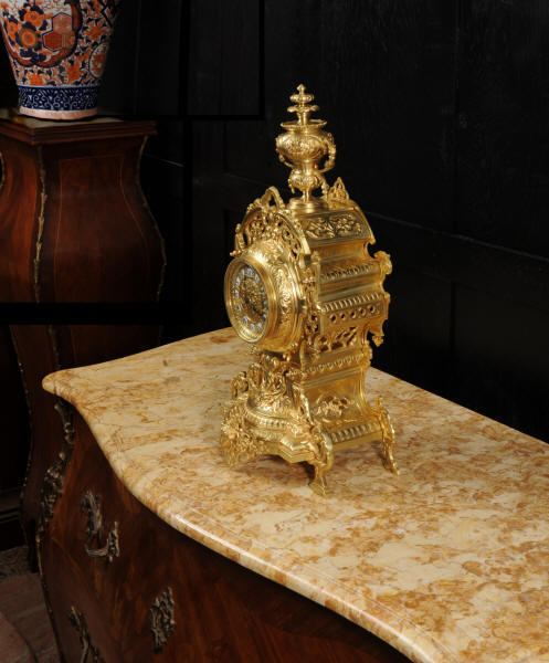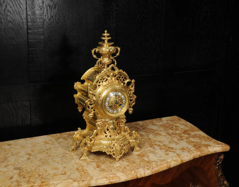 The dial is also gilt bronze with 12 individual enamel cartouches, original blued steel hands and convex glass. The French movement is of high quality and is in excellent clean and running condition having been fully overhauled by our clockmaker. Pendulum is an old replacement. It runs for 8 days and strikes the hours and halves on a bell. Click the video below to hear the bell and watch the clock running.