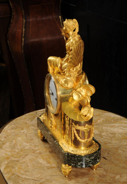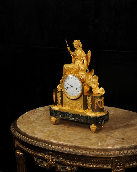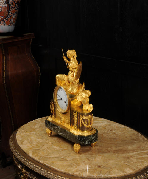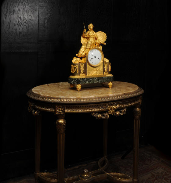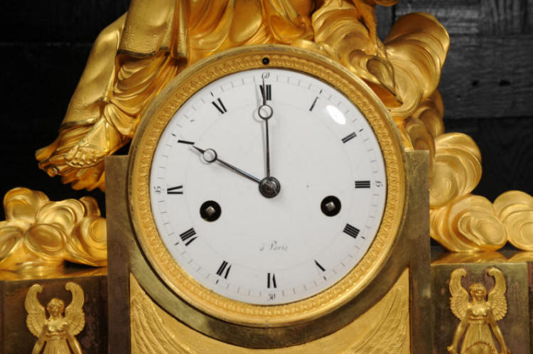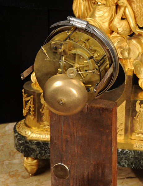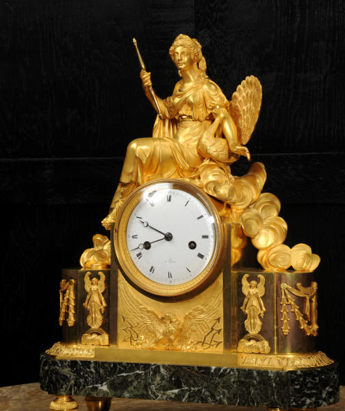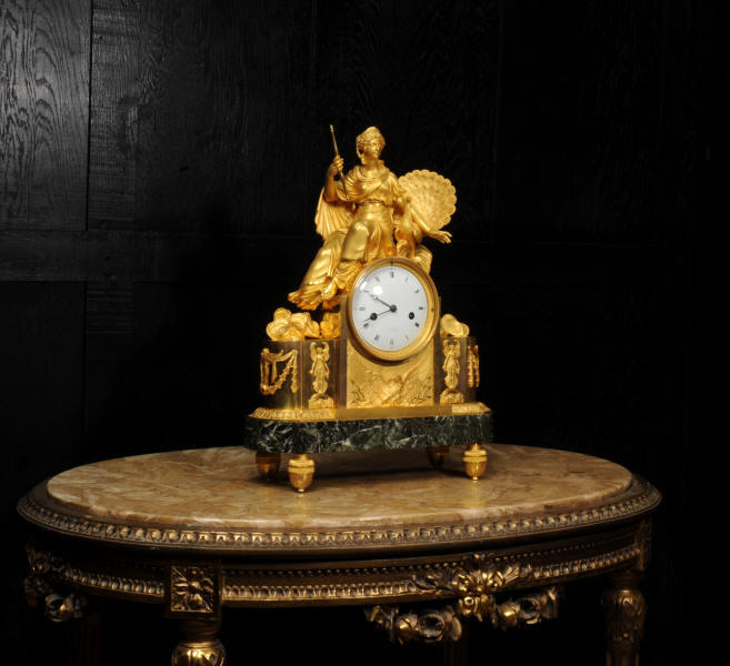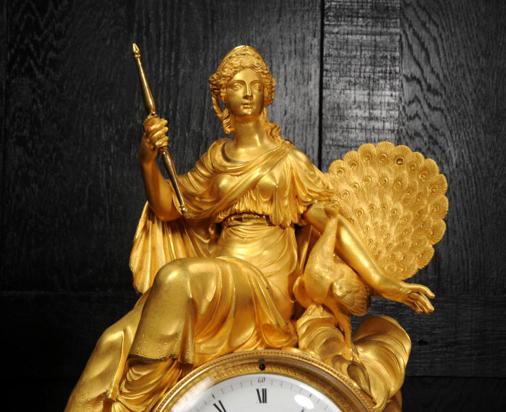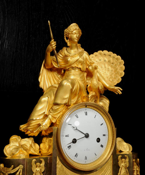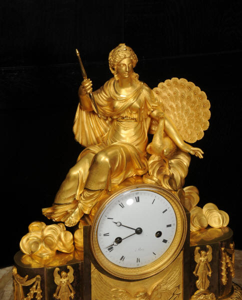 Below the dial is an ormolu panel showing an Eagle, representing Jupiter, with lighting bolts which as Jupiter's wife, Juno was able to hurl. The clock sits upon a green marble base with four feet. The fine porcelain dial is signed 'Paris' and is complete with blued steel Breguet hands and the original bayonet bezel. The rear door is also glazed to allow the pendulum to be seen. The French movement is of high quality and is signed on the backplate by the clockmaker Lesieur. It is in excellent clean and running condition having been fully overhauled by our clockmaker. It has a silk suspension and the pendulum is a replacement. It runs for 8 days and strikes the hours and halves on a bell. Click the video below to hear the bell and watch the clock running. Condition of the case is excellent; the original gilding is in stunning condition, just some wear to mainly the rear and the right hand side of the base, where less gold was originally applied. Possibly there were originally two further feet to the marble base, however the clock sits well on four feet. There is also possibly some repair / alteration to the bottom of Juno's right foot at some time. The rear bezel is a later hinged type rather than the bayonet fit of the front bezel. The dial is also in excellent condition just some tiny nibbles to the winding holes. Lesieur (fl. 1790-1850) was a highly respected but little documented clockmaker who worked in Paris during the last years of the eighteenth century and continued in business up until circa 1850. He was known to have regularly worked with Thomire and the greatest Parisian Bronziers. Tardy (Tardy, Dictionnaire des Horlogers Francais) notes that by 1806 he was established at Vieille rue du Temple; during 1812-20 and 1830-50 he was at rue de la Verrerie and in 1840 at Boulevard St. Martin. Elsewhere in the Paris almanacs he is recorded at Bar-du-Bec in 1839 and in 1840 at rue des Alexiens. Lesieur’s name also appears on a number of complex and important clocks, counting among them a mantle clock showing signs of the zodiac with marble columns of 1807-8, in the Hôtel de l’Intendance de la Généralité de Metz, Moselle (originally the Préfecture de la Moselle et de la Région Lorraine). The latter is probably a pair to another identical clock by Lesieur in the Château de Nymphenburg in Bavaria. Lesieur also made the movements for a variety of other clocks, from a late Louis XVI Sèvres porcelain lyre clock to Empire figural clocks. Among them is one featuring Jason and the Golden Fleece which is housed at the Musée de la Malmaison in the appartements de Joséphine de Beauharnais. During the Restauration he also collaborated with the Parisian firm of bronziers Choiselat-Gallien who worked for the Garde-Meuble and were appointed to Monsieur, Frère du Roi.