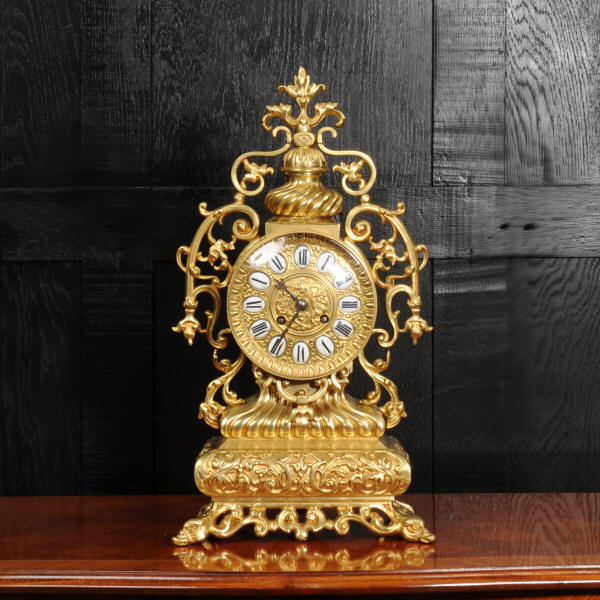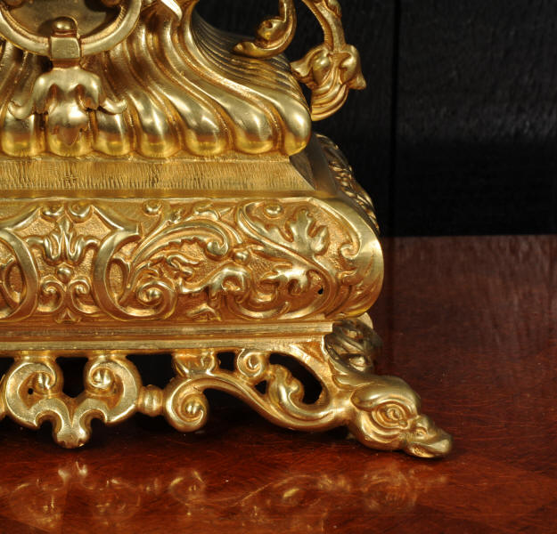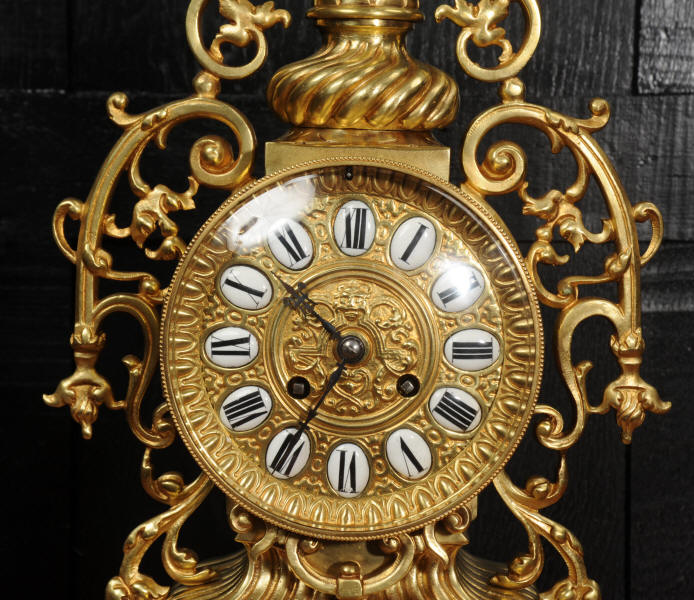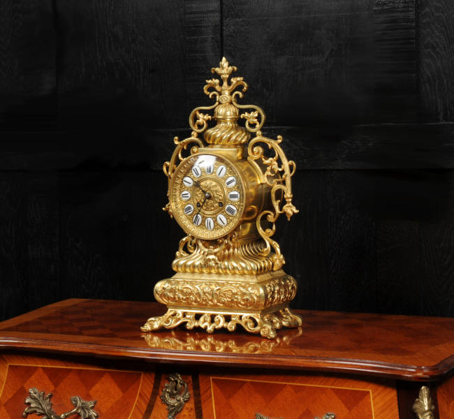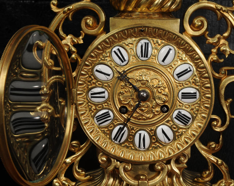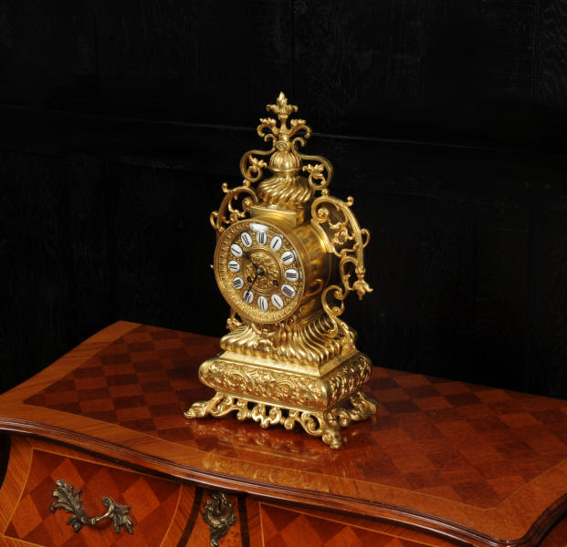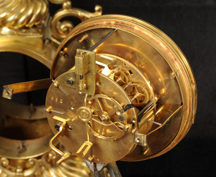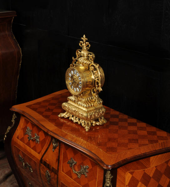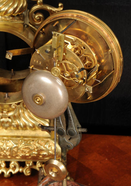 The dial is also gilt bronze with 12 individual enamel cartouches and blued steel hands. The front bezel is glazed with convex glass and the rear door with heavy beveled glass to allow the movement to be seen. The French movement is of high quality and is in excellent clean and running condition having been fully overhauled by our clockmaker. Pendulum is a replacement. It runs for 8 days and strikes the hours and halves on a bell. Click the video below to hear the bell and watch the clock running.