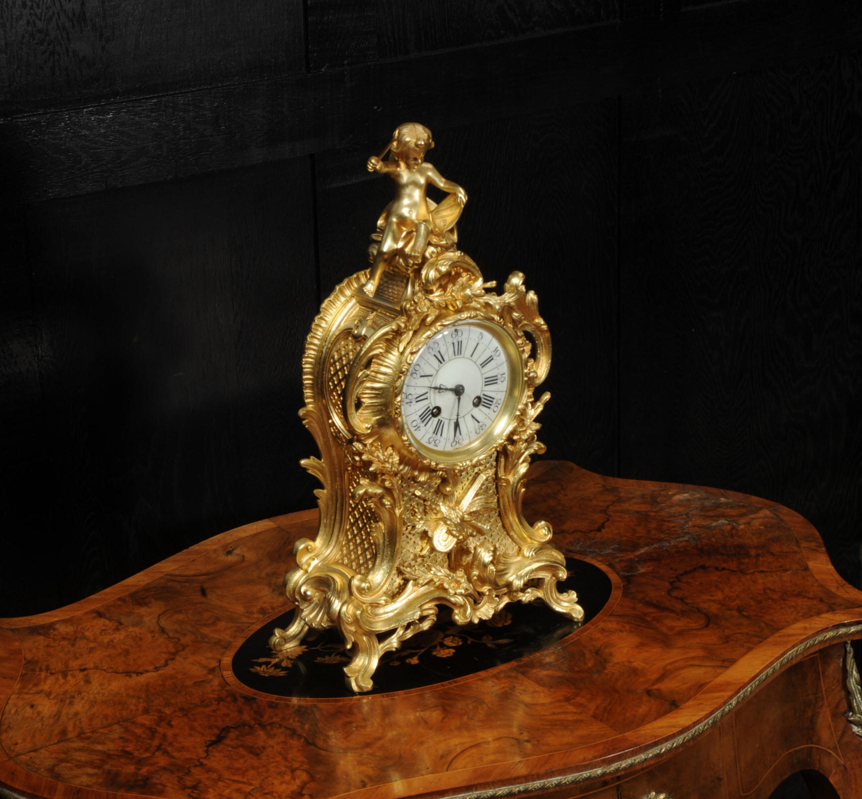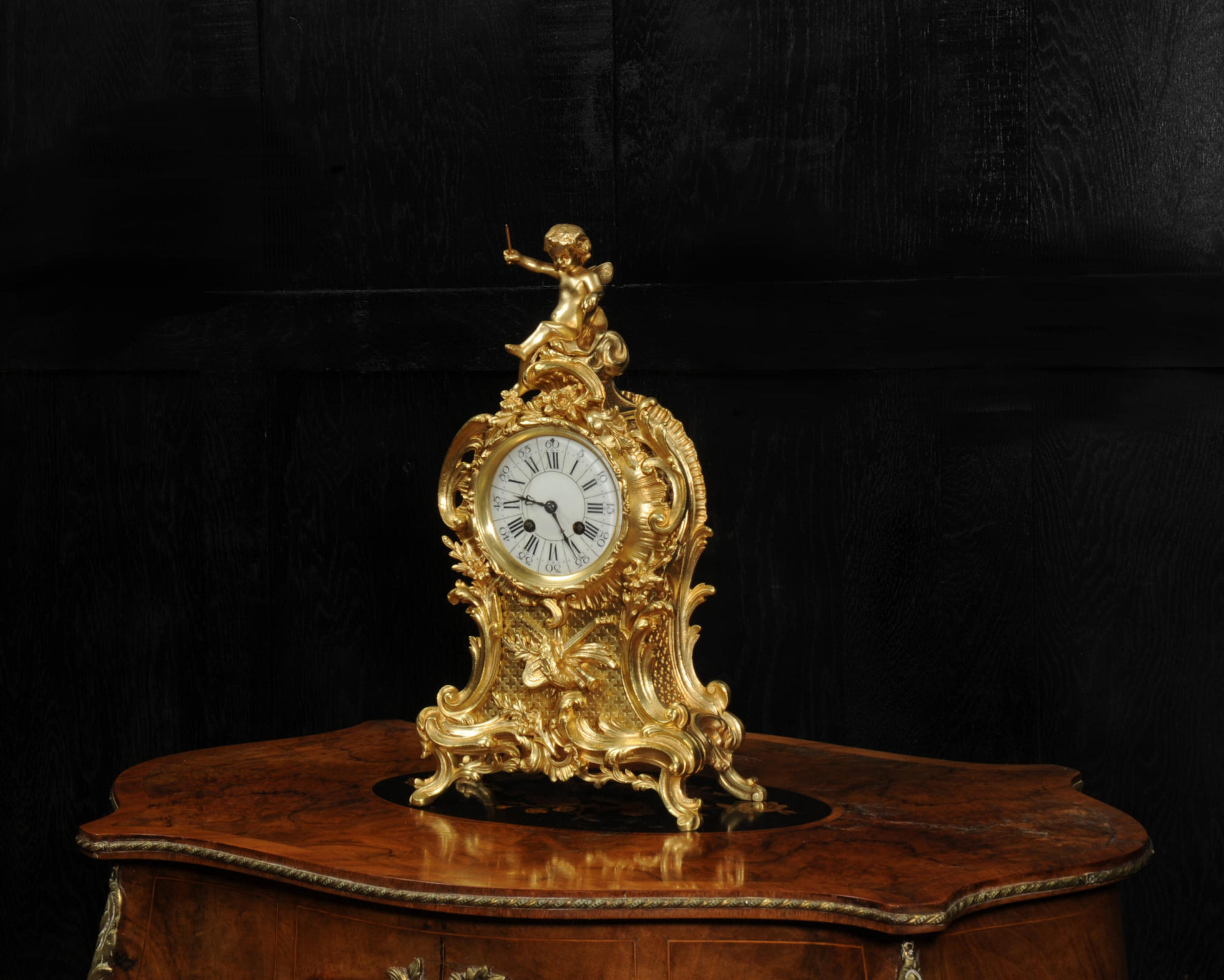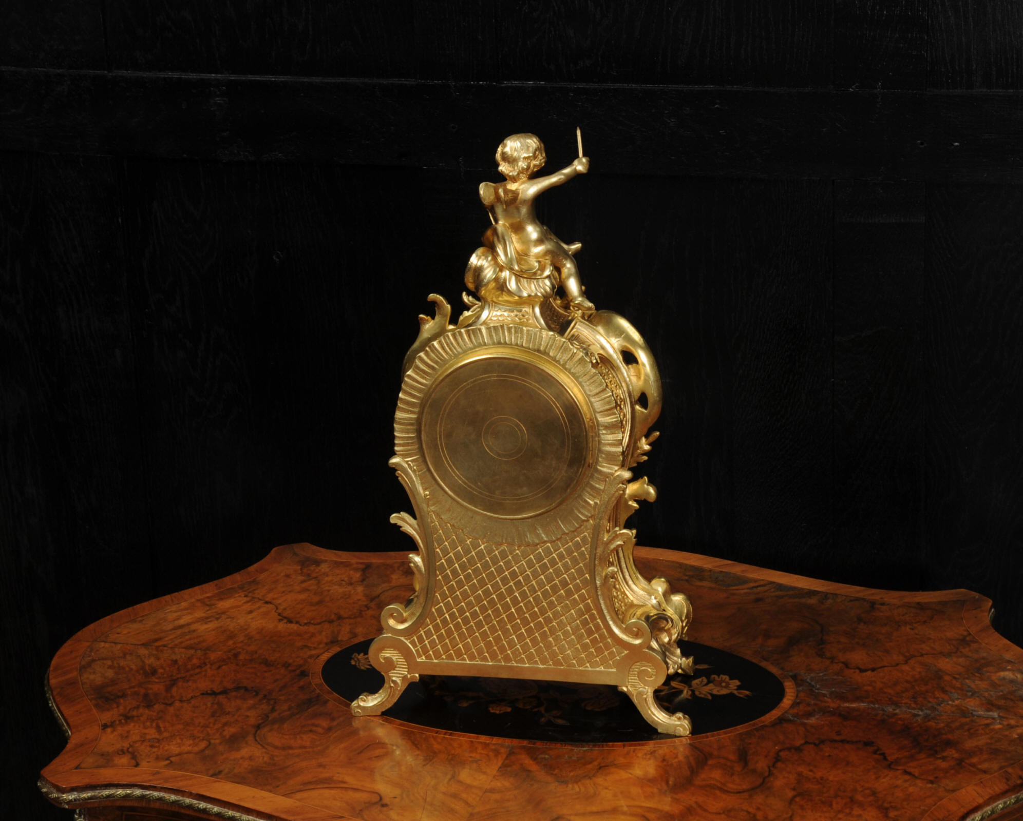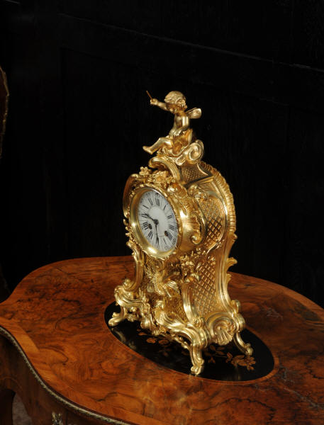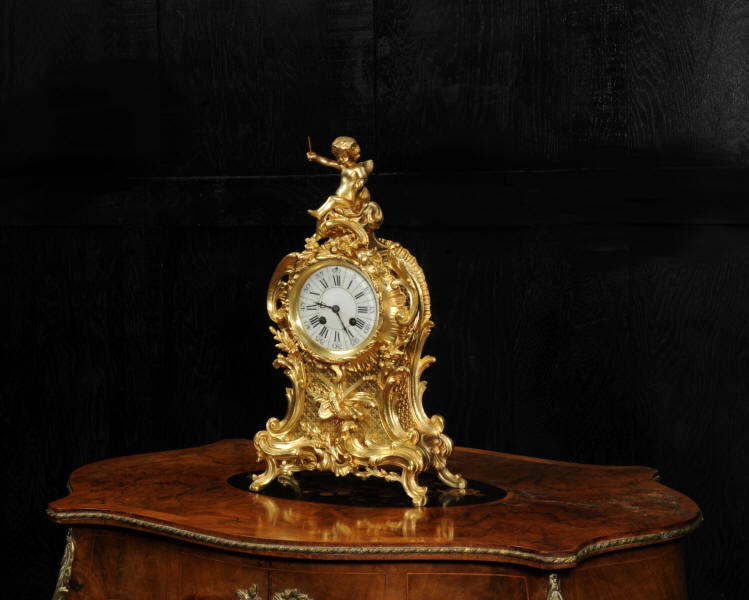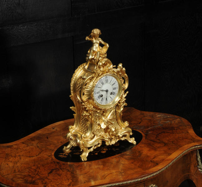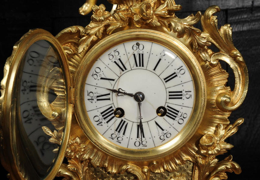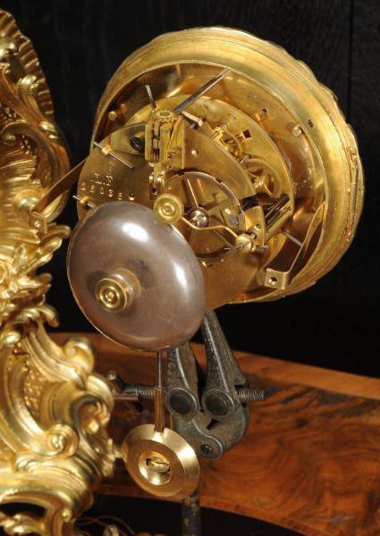 The dial is porcelain enamel on copper with separate minute ring. It is complete with it's original fine blued steel hands and Rococo bezel with convex glass. The French movement is by Vincenti and is of high quality. It is in excellent clean and running condition having been fully overhauled by our clockmaker. Pendulum is original. It runs for 8 days and strikes the hours and halves on a bell. Click the video below to hear the bell and watch the clock running. Condition of the case is excellent, the original gilding is beautifully clean and bright with hardly any wear or discolouration. The dial is also in excellent condition just some hairlines.