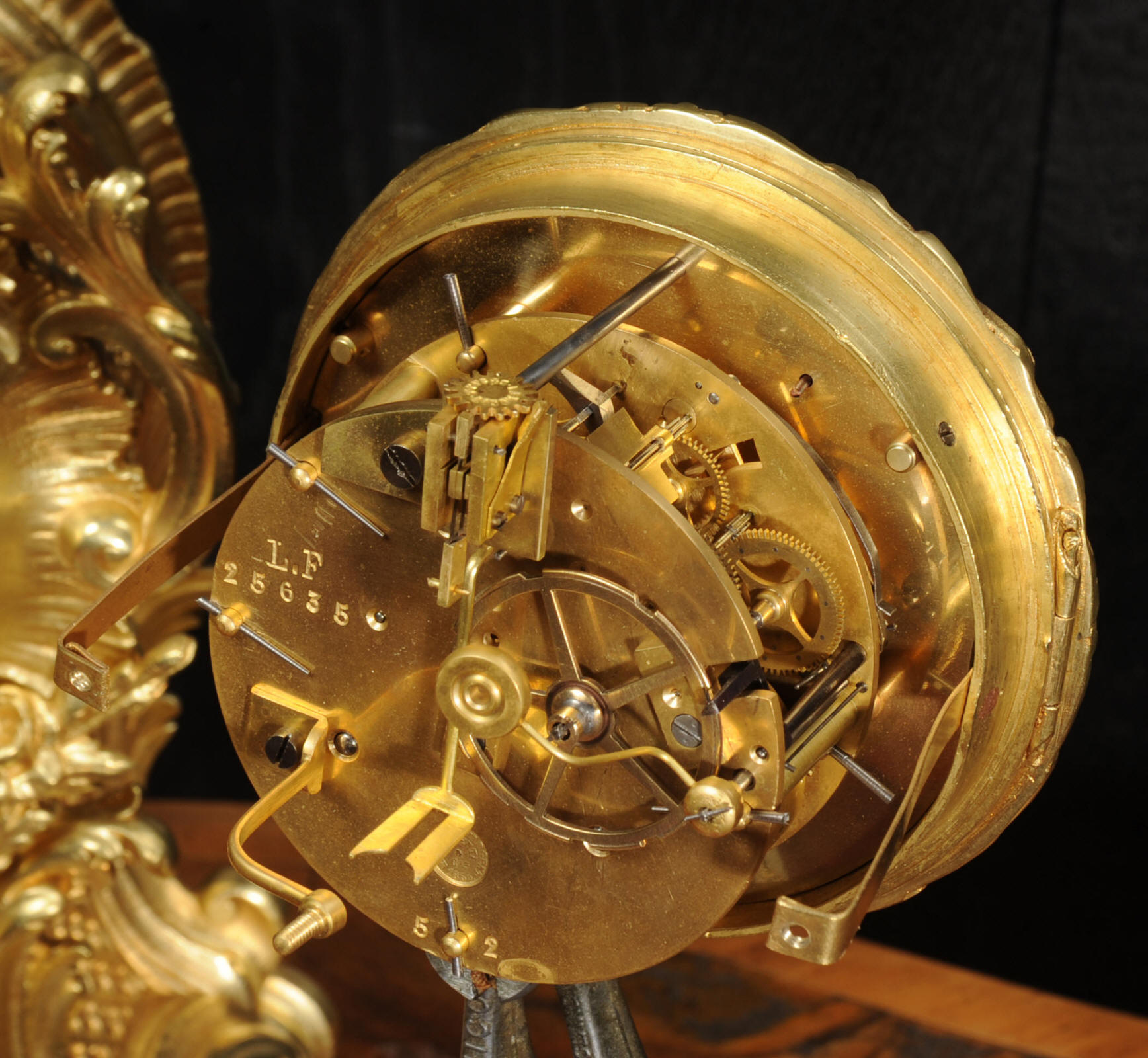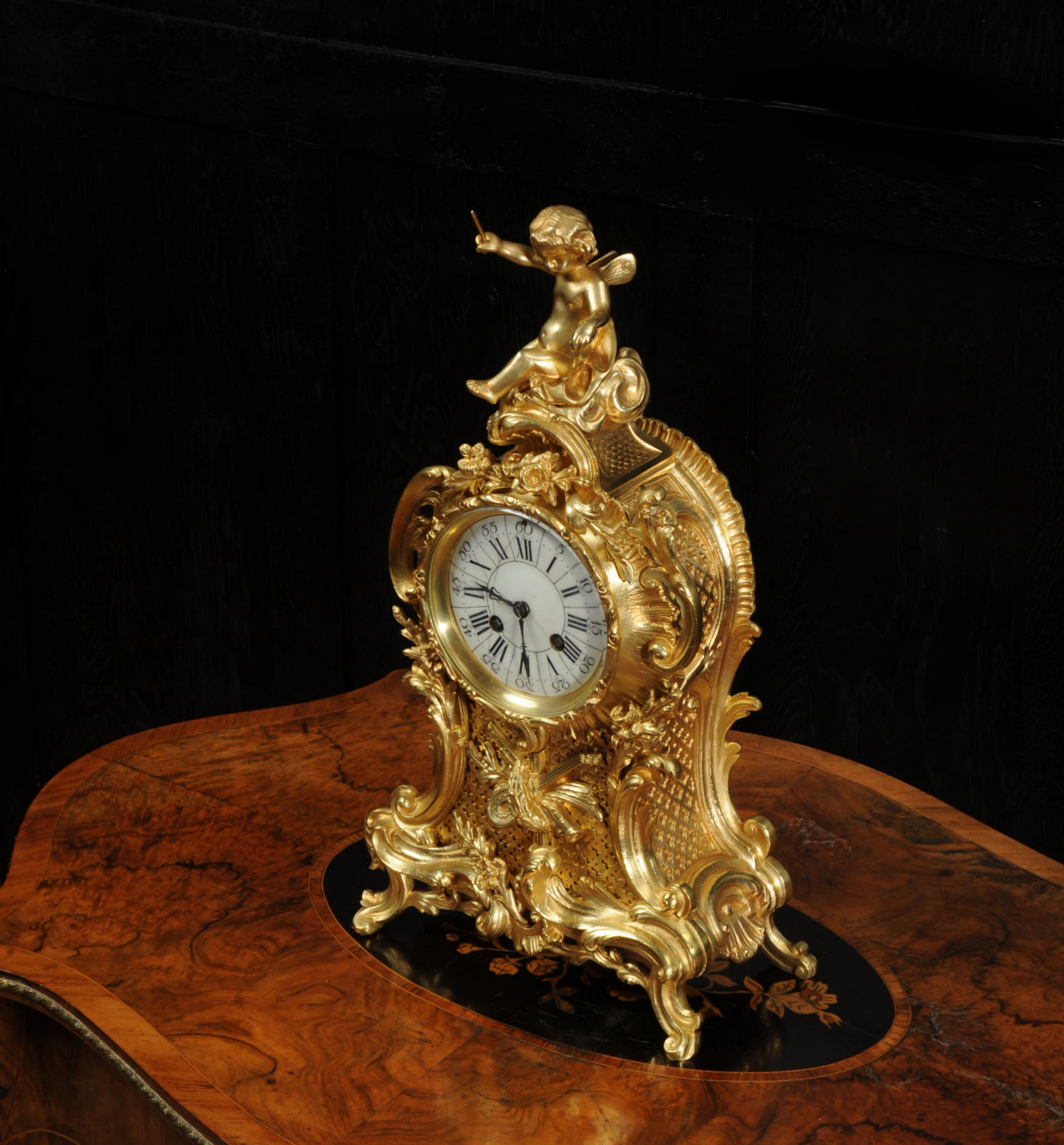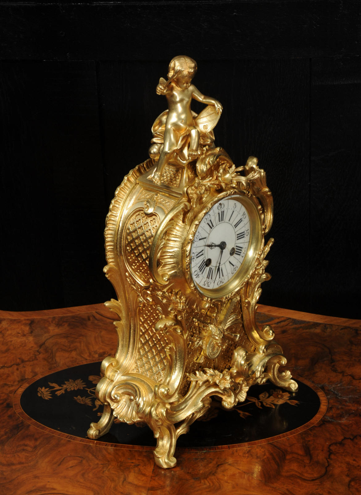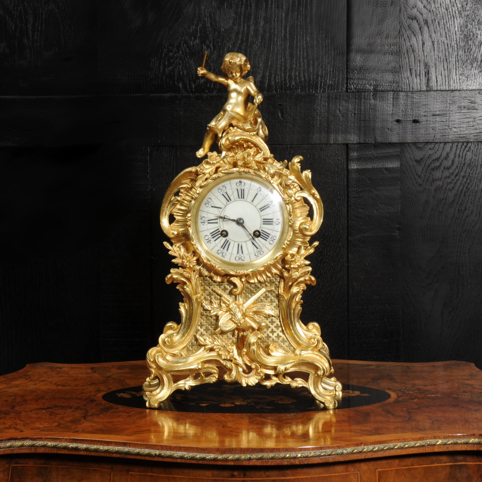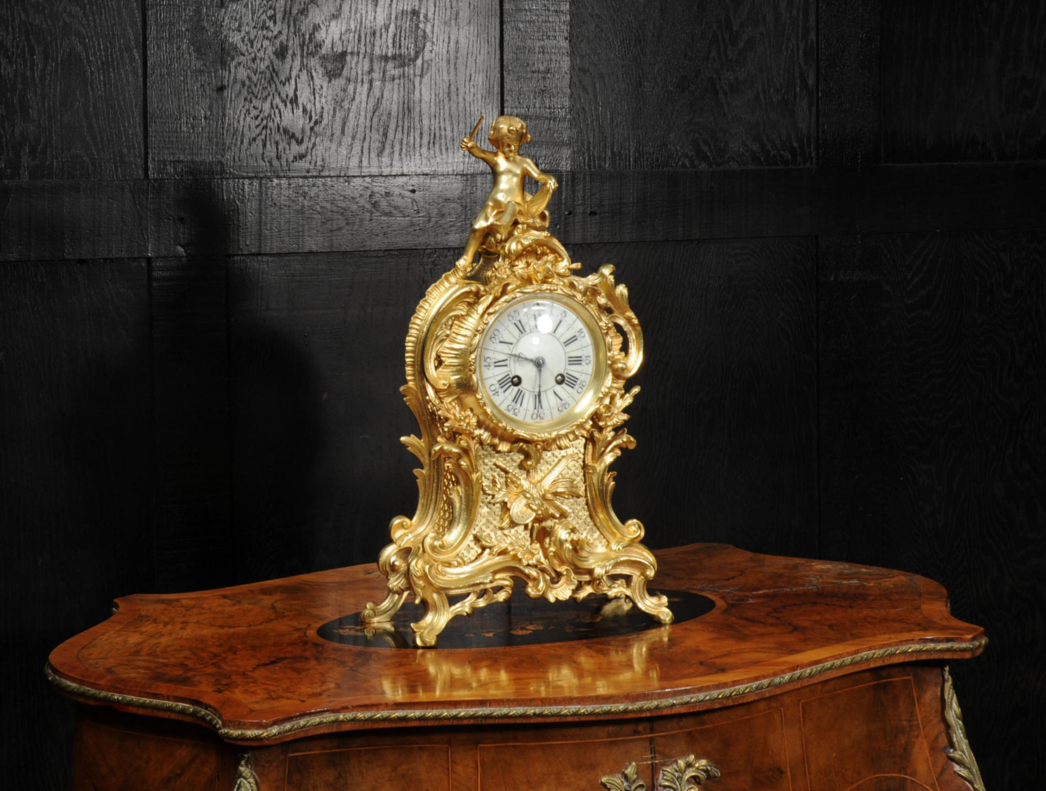 The dial is porcelain enamel on copper with separate minute ring. It is complete with it's original fine blued steel hands and Rococo bezel with convex glass. The French movement is by Vincenti and is of high quality. It is in excellent clean and running condition having been fully overhauled by our clockmaker. Pendulum is original. It runs for 8 days and strikes the hours and halves on a bell. Click the video below to hear the bell and watch the clock running. Condition of the case is excellent, the original gilding is beautifully clean and bright with hardly any wear or discolouration. The dial is also in excellent condition just some hairlines.