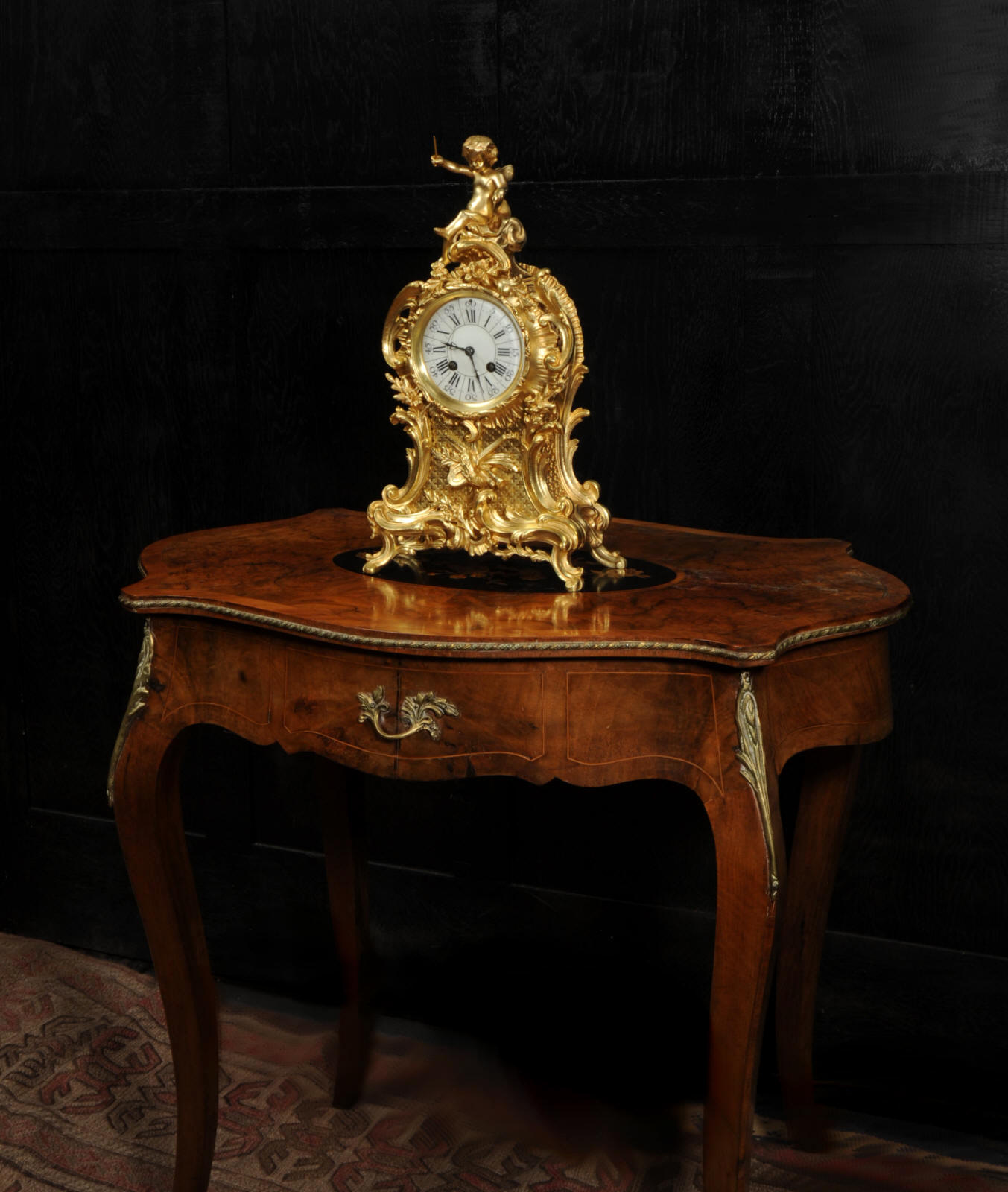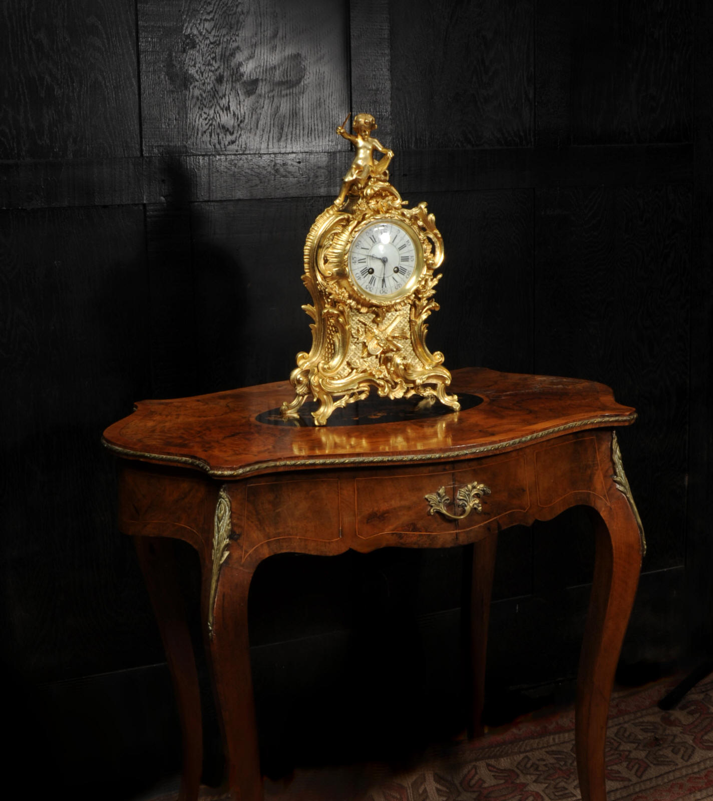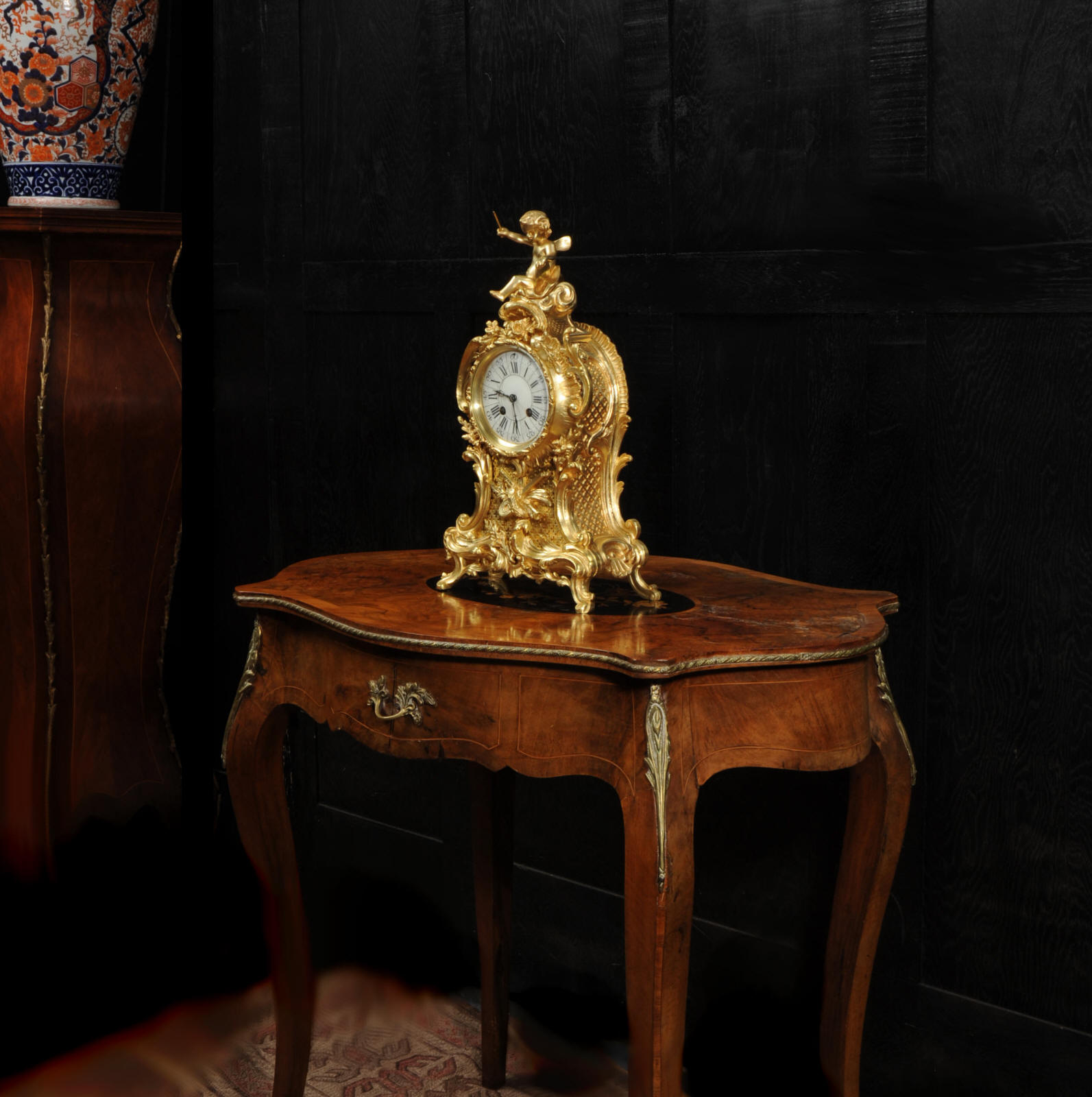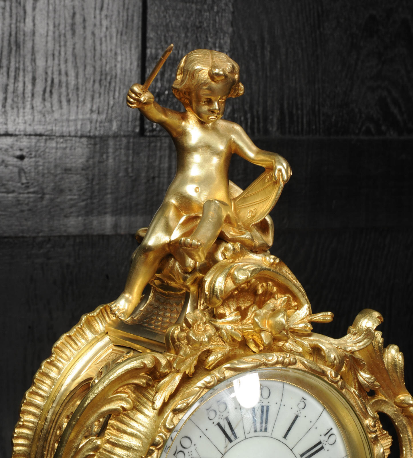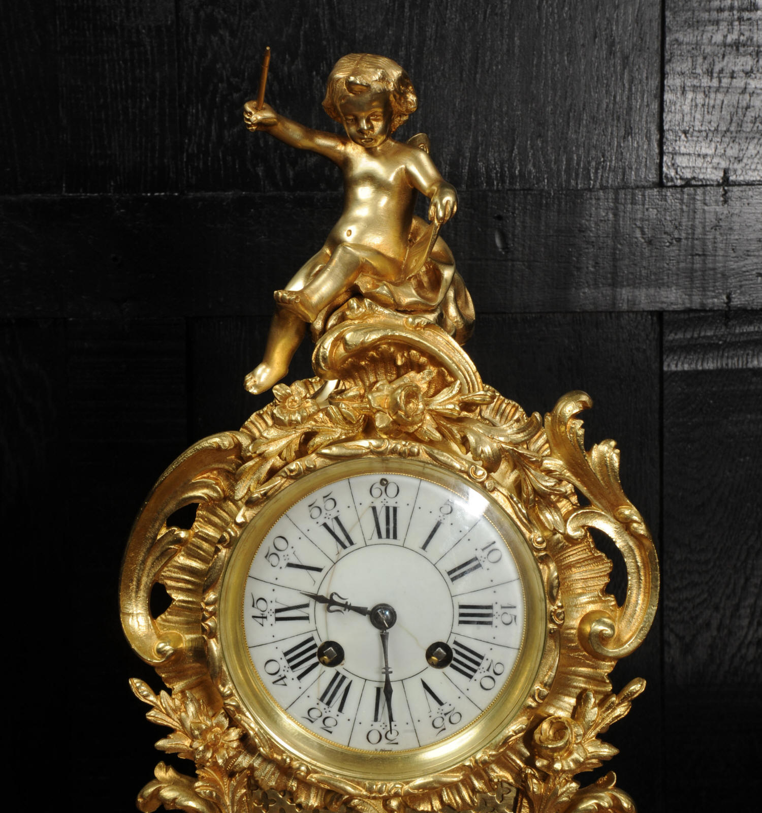 The dial is porcelain enamel on copper with separate minute ring. It is complete with it's original fine blued steel hands and Rococo bezel with convex glass. The French movement is by Vincenti and is of high quality. It is in excellent clean and running condition having been fully overhauled by our clockmaker. Pendulum is original. It runs for 8 days and strikes the hours and halves on a bell. Click the video below to hear the bell and watch the clock running. Condition of the case is excellent, the original gilding is beautifully clean and bright with hardly any wear or discolouration. The dial is also in excellent condition just some hairlines.