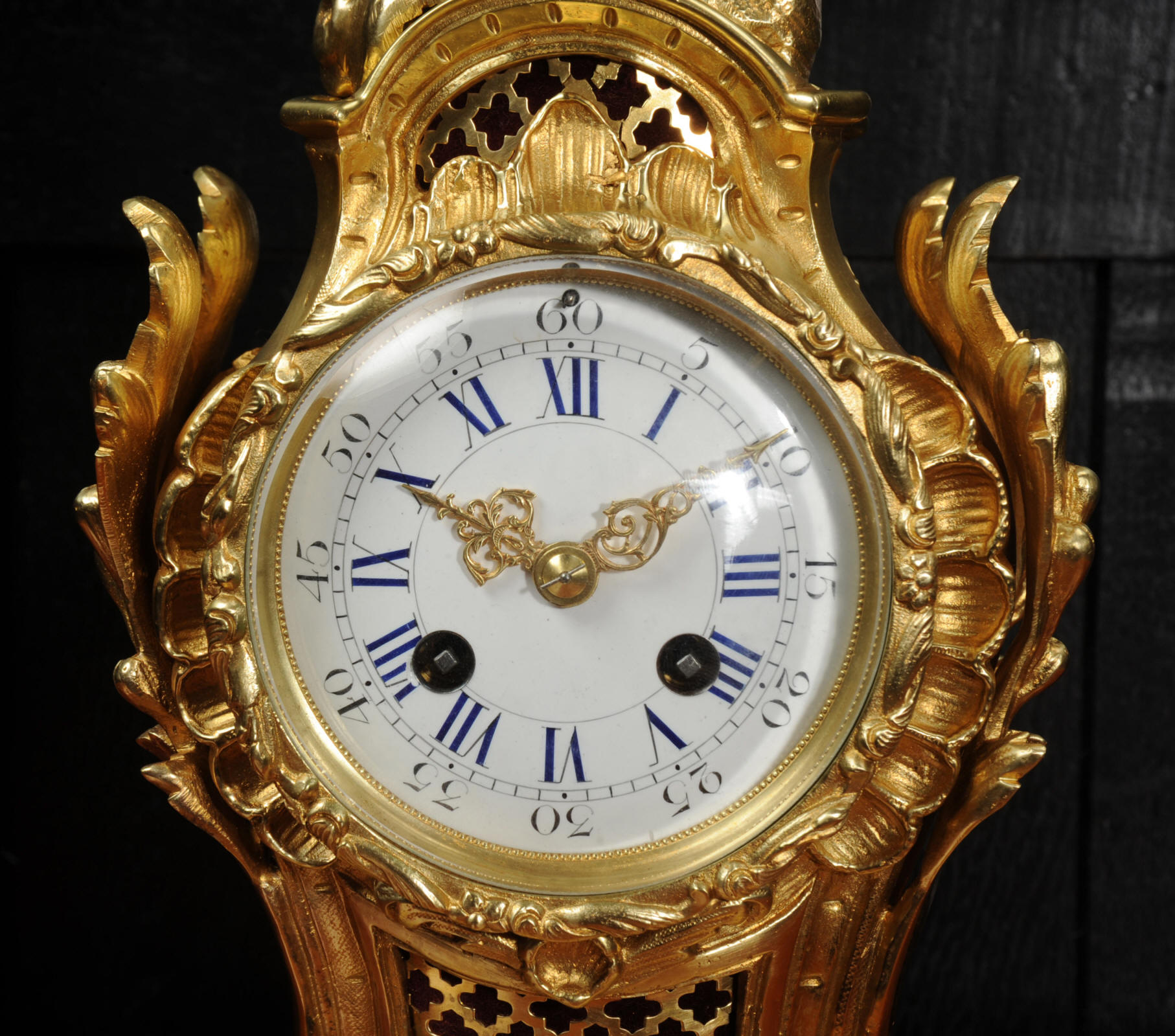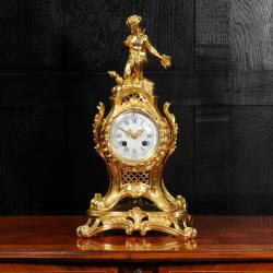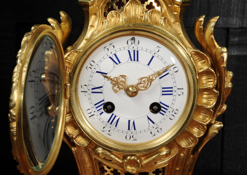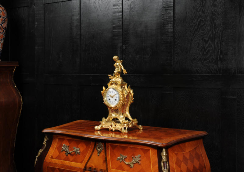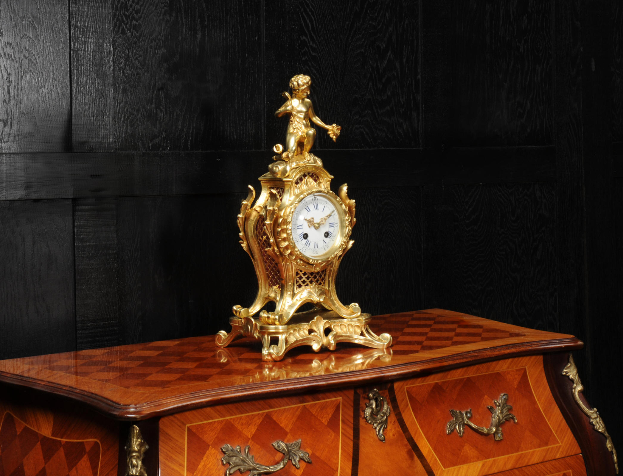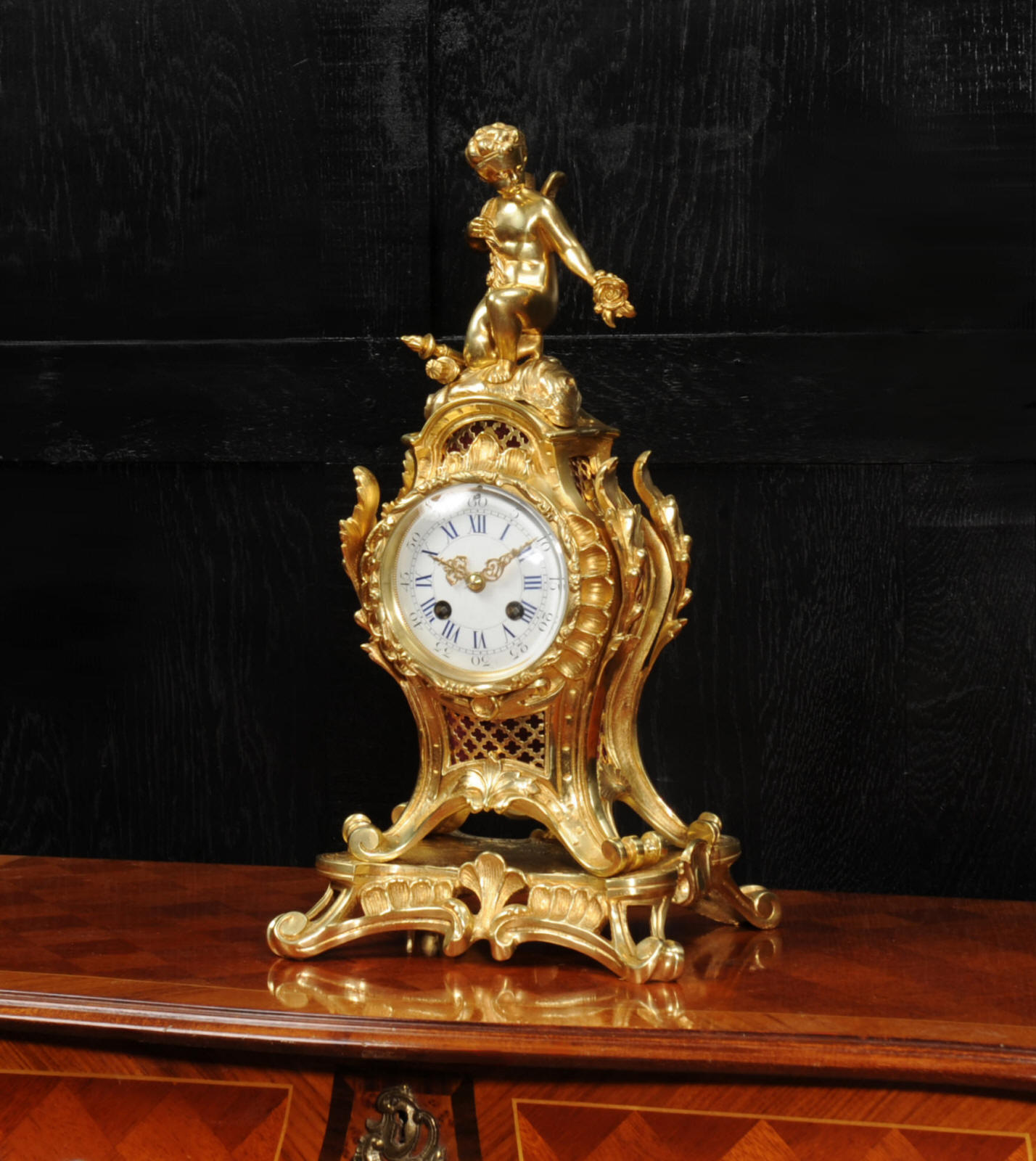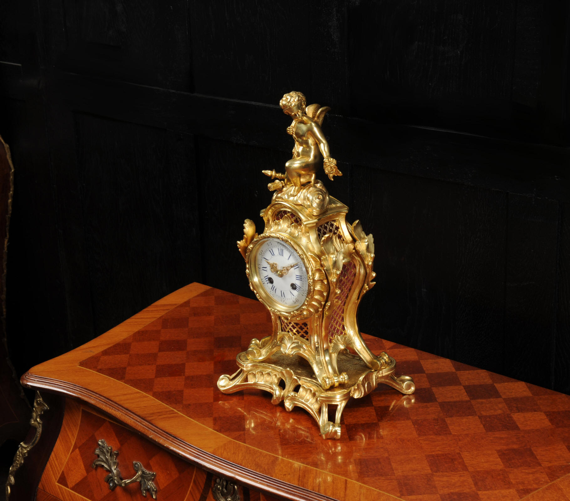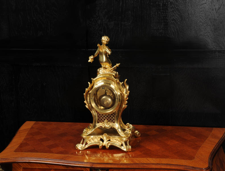 The dial porcelain enamel on copper with finely fretted gilt brass hands. The rear door is also glazed to allow the movement to be seen and the clock is decorated in the round allowing you to display on a table or in front of a mirror. The bottom of the pendulum can be glimpsed gently swinging within the case. The French movement is of high quality and is by A. D. Mougin. It is in excellent clean and running condition having been fully overhauled by our clockmaker. Pendulum is an old replacement. It runs for 8 days and strikes the hours and halves on a bell. Click the video below to hear the bell and watch the clock running. Condition of the case is excellent, the original gilding is beautifully clean and bright with hardly any wear or discolouration. The dial is also very good, a very small nibble to the left hand winding hole. We have replaced the fabric with fresh.