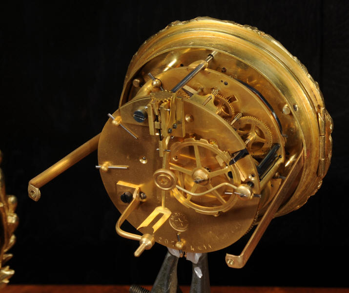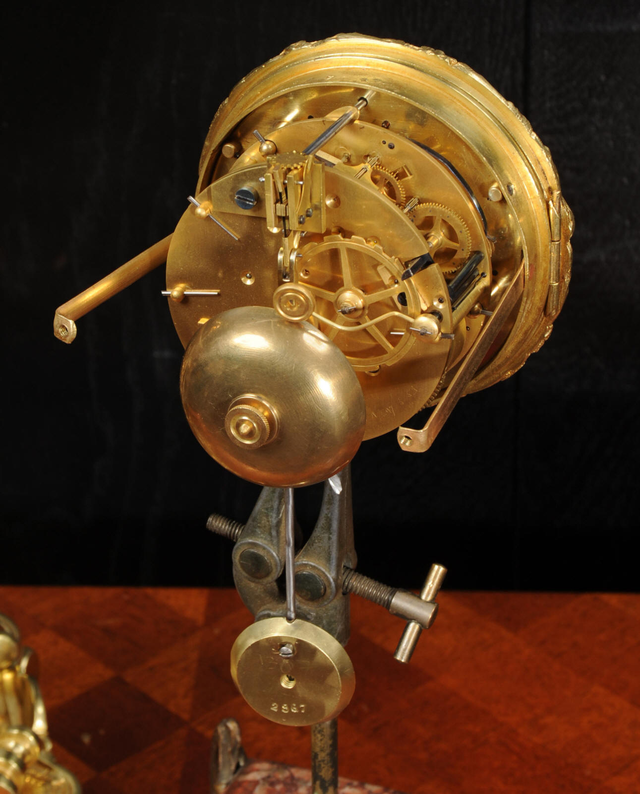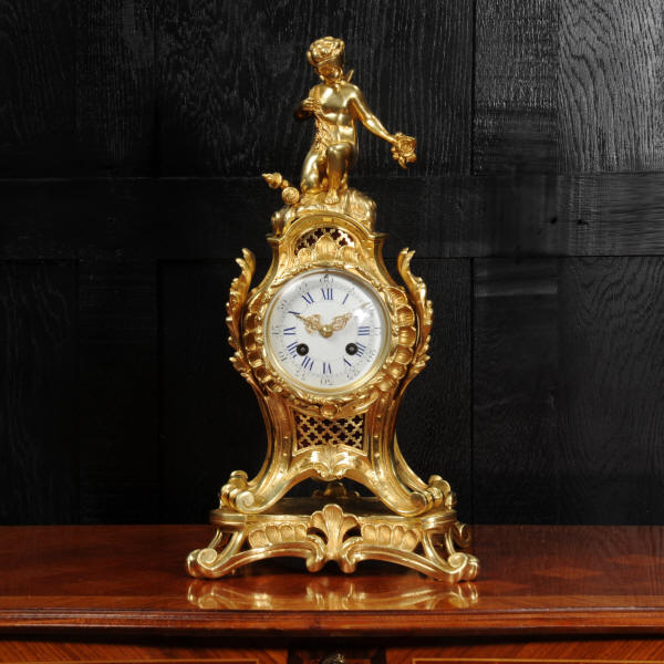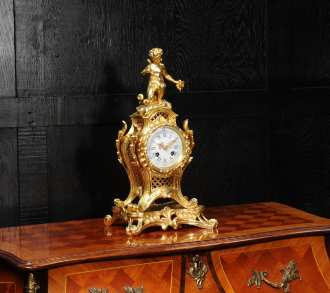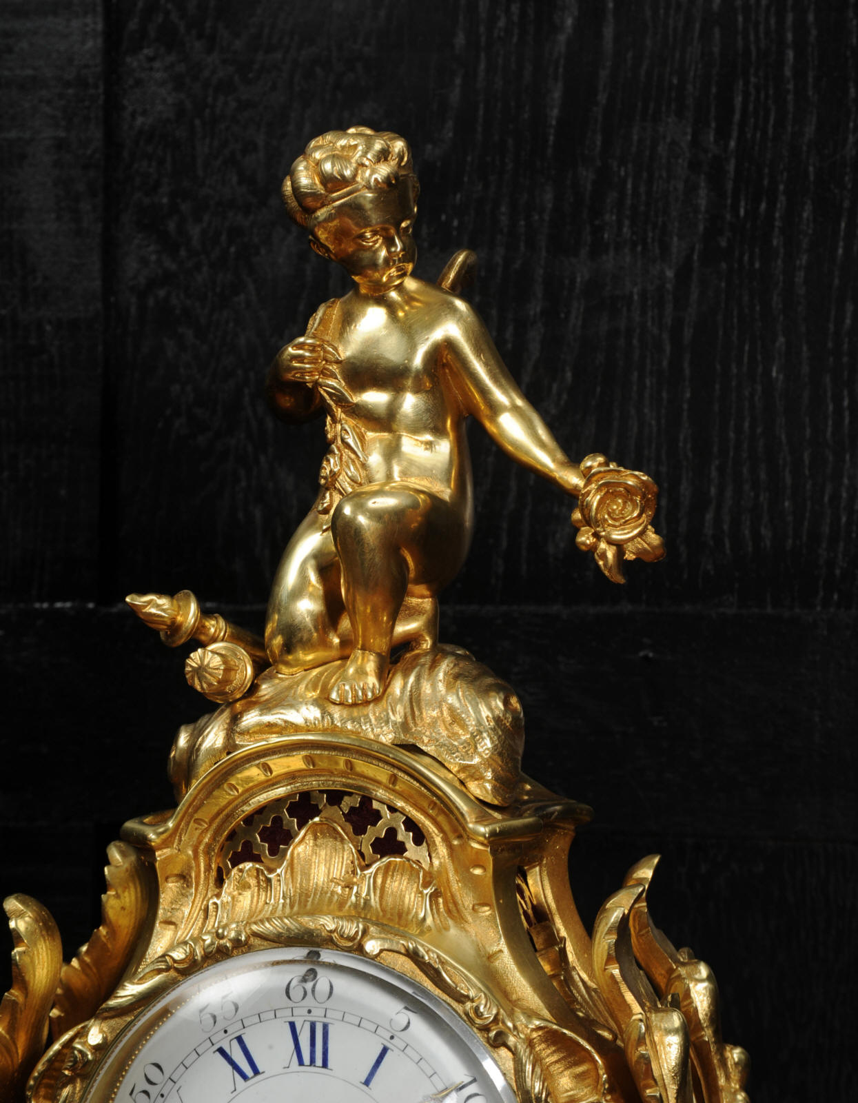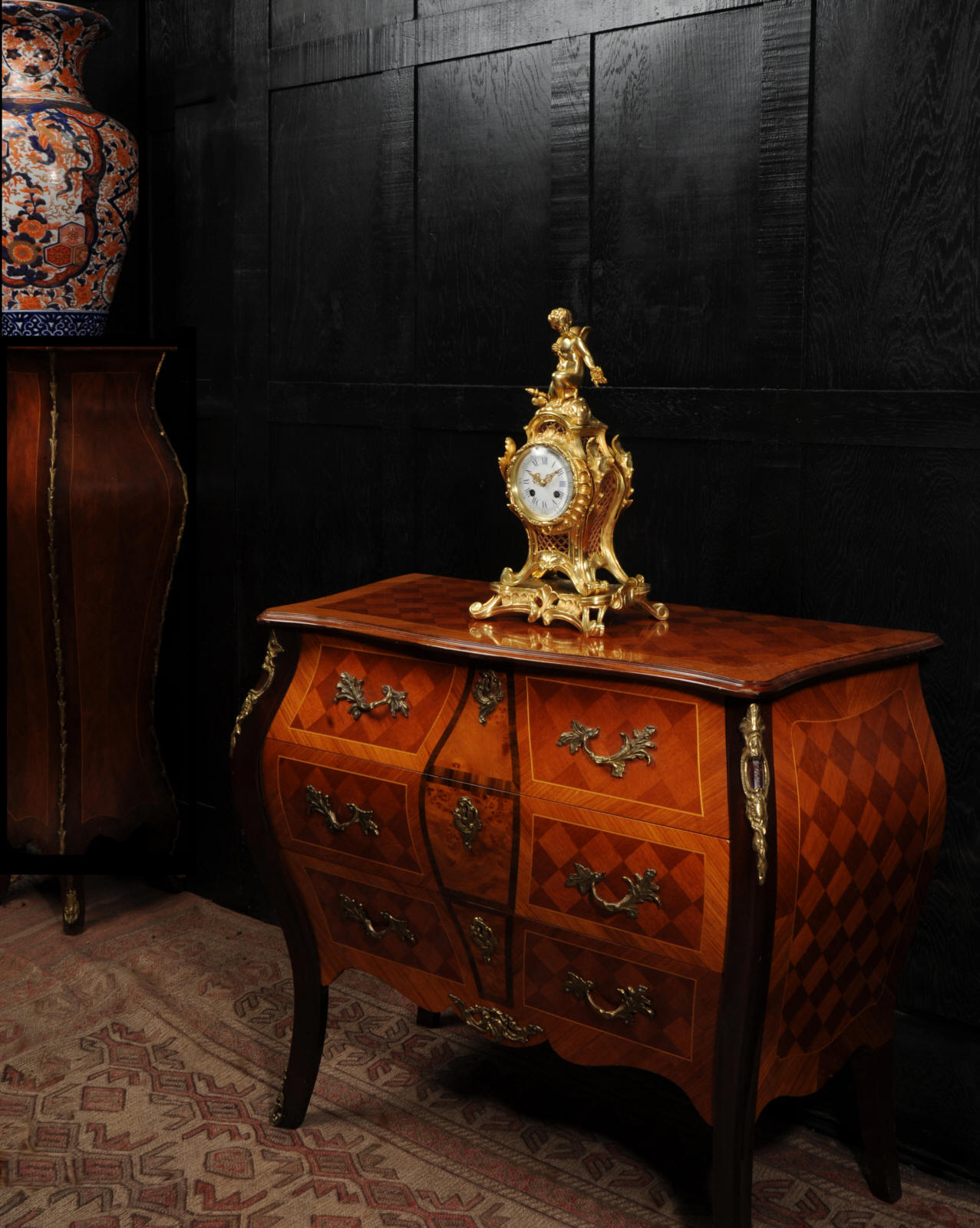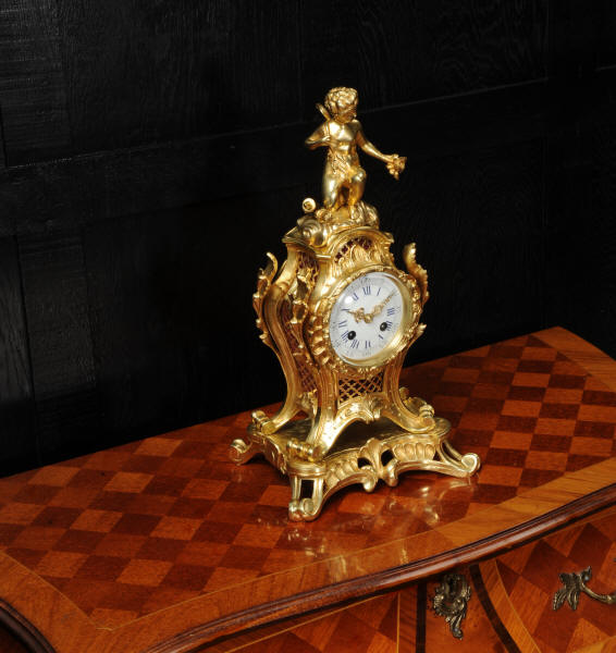 The dial porcelain enamel on copper with finely fretted gilt brass hands. The rear door is also glazed to allow the movement to be seen and the clock is decorated in the round allowing you to display on a table or in front of a mirror. The bottom of the pendulum can be glimpsed gently swinging within the case. The French movement is of high quality and is by A. D. Mougin. It is in excellent clean and running condition having been fully overhauled by our clockmaker. Pendulum is an old replacement. It runs for 8 days and strikes the hours and halves on a bell. Click the video below to hear the bell and watch the clock running. Condition of the case is excellent, the original gilding is beautifully clean and bright with hardly any wear or discolouration. The dial is also very good, a very small nibble to the left hand winding hole. We have replaced the fabric with fresh.