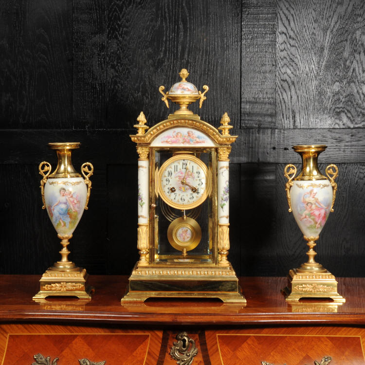 Sèvres Porcelain and Ormolu Four Glass Clock Set~ French - Circa 1890 ~ ~~ Excellent condition, fully overhauled ~~ A rare and beautiful antique French clock garniture, in excellent original condition. Ormolu (fine gilded bronze) is mounted with exquisitely painted Sèvres style porcelain. Porcelain is very finely painted with maidens and putti on a cream ground. The clock is glazed to all four sides with beveled glass to allow the movement to be seen and the porcelain mounted pendulum to be seen gently swinging. ......Click here for full details! |