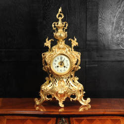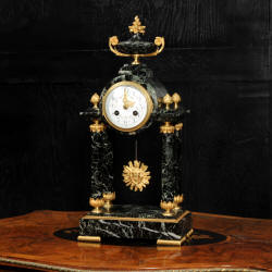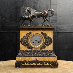 Fine and Early Bronze and Sienna Marble ~ Horses, Mare with Foal~ French - Circa 1820 ~ ~~ Excellent condition, fully overhauled ~~ A beautiful, original and early clock depicting a mare tending her foal. Beautifully and delicately modelled in bronze, full of life and movement with a lovely antique patina. The clock is mounted in a Sienna marble plinth mounted with crisp bronze with detail of cornucopia, acanthus and scrolls. ......Click here for full details! |