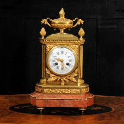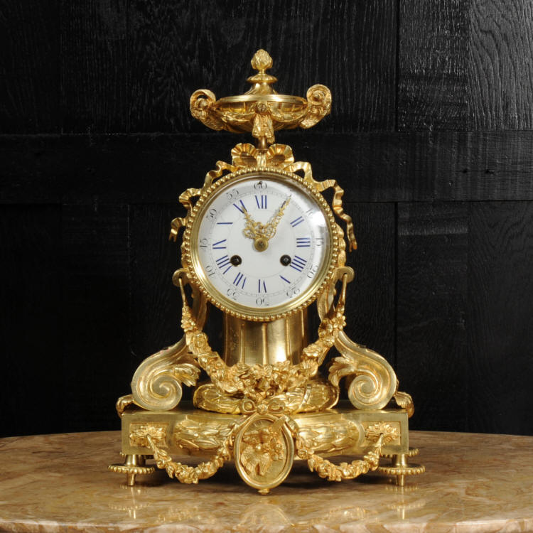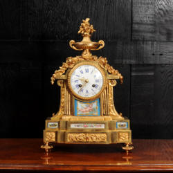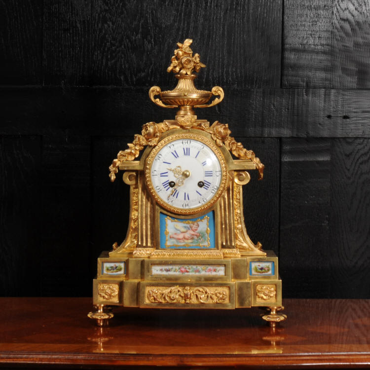 Antique French Ormolu and Sèvres Porcelain Clock~ French - Circa 1855 ~ ~~ Excellent condition, fully overhauled ~~ A lovely early antique French ormolu clock by Louis Japy, part of the great Japy clockmaking dynasty. It is of Louis XVI design and mounted with exquisite Sèvres style porcelain panels. The porcelain has a Bleu Celeste ground with delicately cherub, flowers and exotic birds. To the top is classical urn with a garland of roses trailing down both sides. ......Click here for full details! |