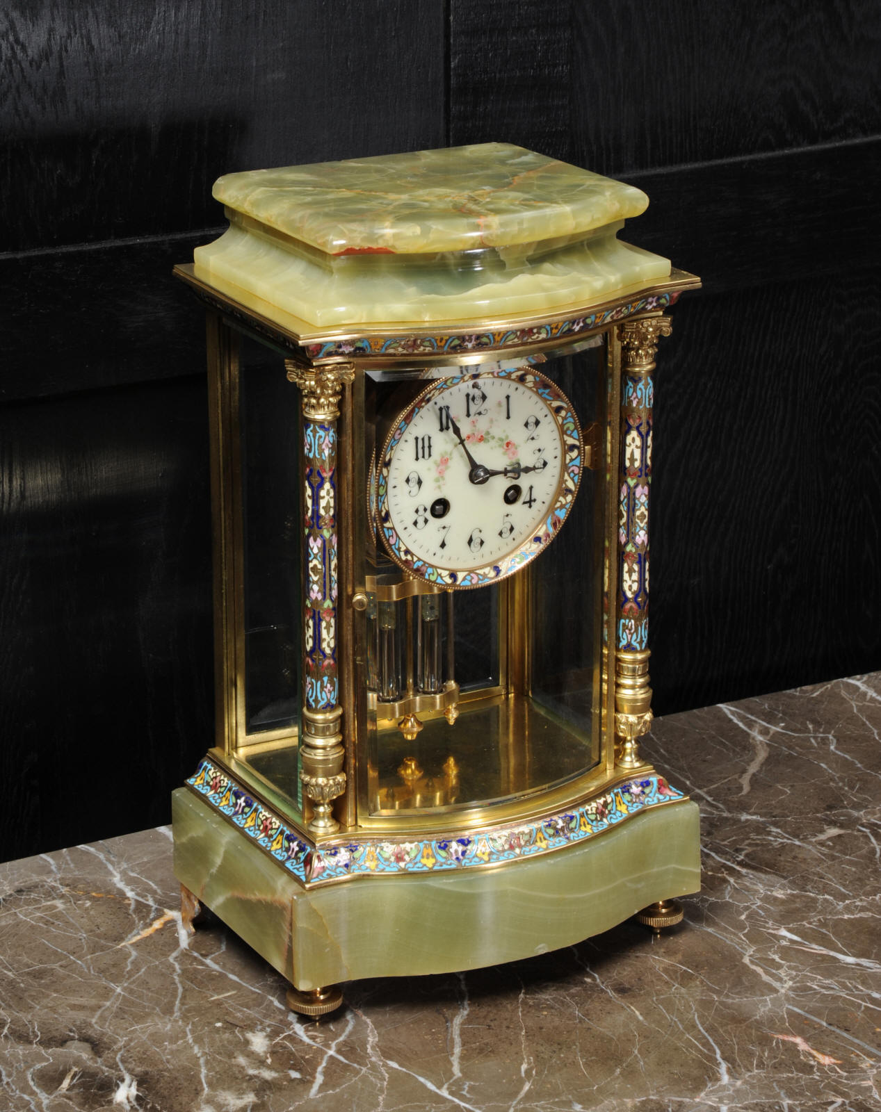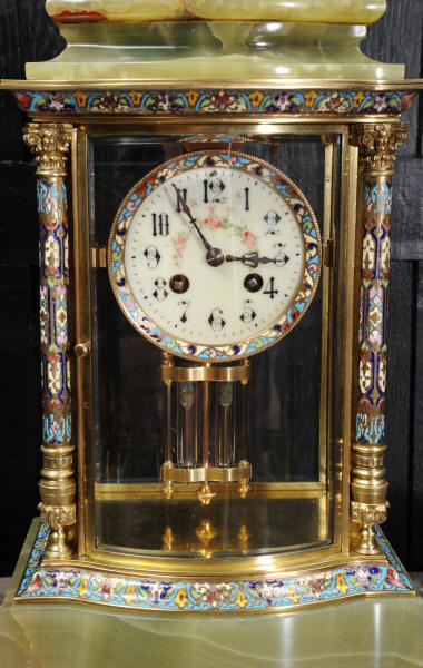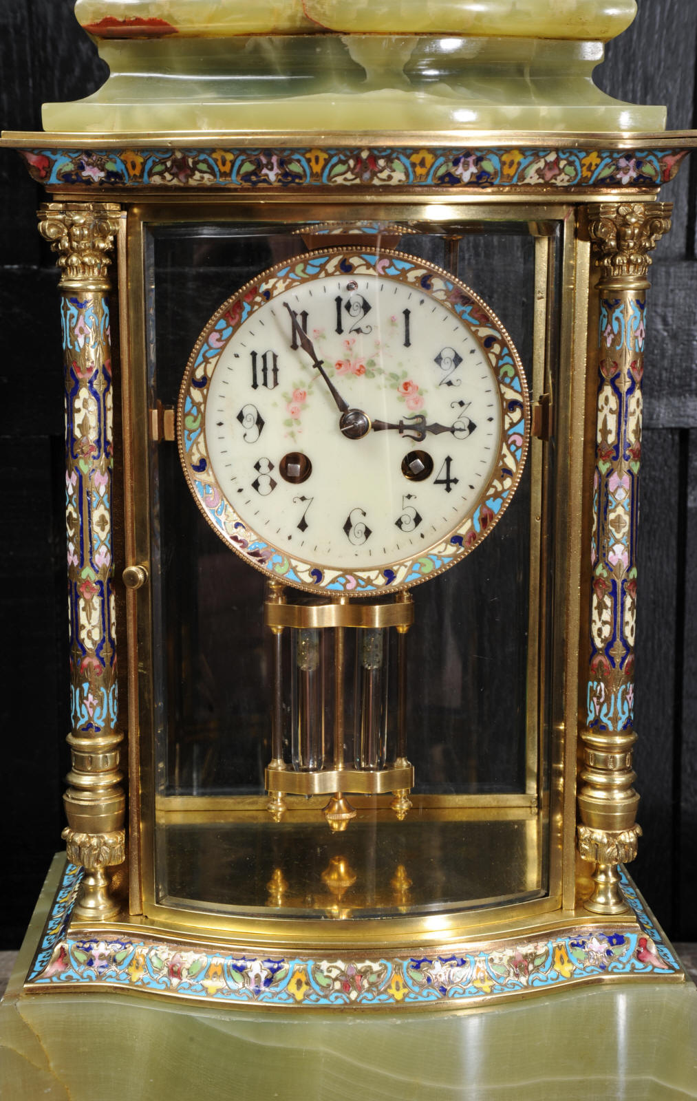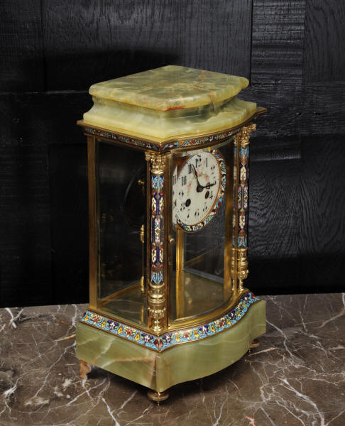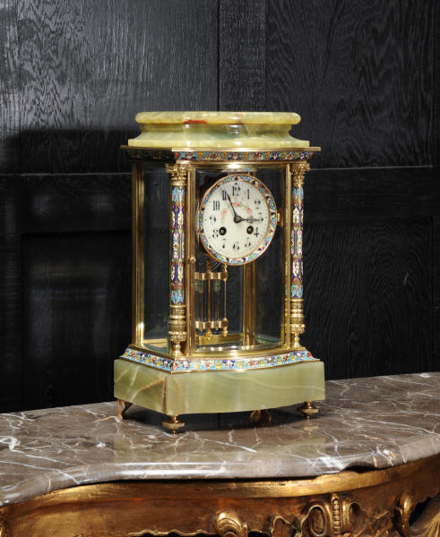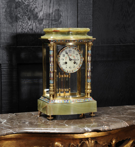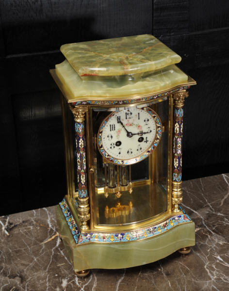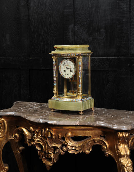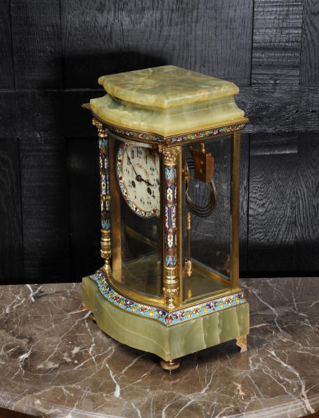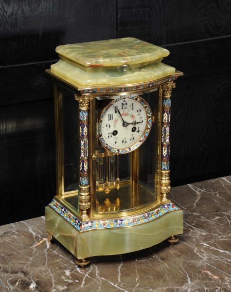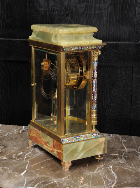 The dial is porcelain enamel on copper with pretty floral swags and blued steel hands. The French movement is by Samuel Marti and is in excellent clean and running condition having been fully overhauled by our clockmaker. The mercury compensated pendulum is original and is designed to compensate for temperature effects. The mercury is contained in sealed vials rather like a thermometer. It runs for 8 days and strikes the hours and halves on a coiled gong. Click the video clip below to hear the gong and watch the clock running! Condition of the case is excellent, the original gilding is beautifully clean with some minor wear and discolouration. The dial is also in excellent condition just some tiny nibbles to the winding holes. The glass is very good, just 2 very small chips to the rear door. The onyx is also very good, some nibbles to the edges and a light crack on the left hand side lower front.