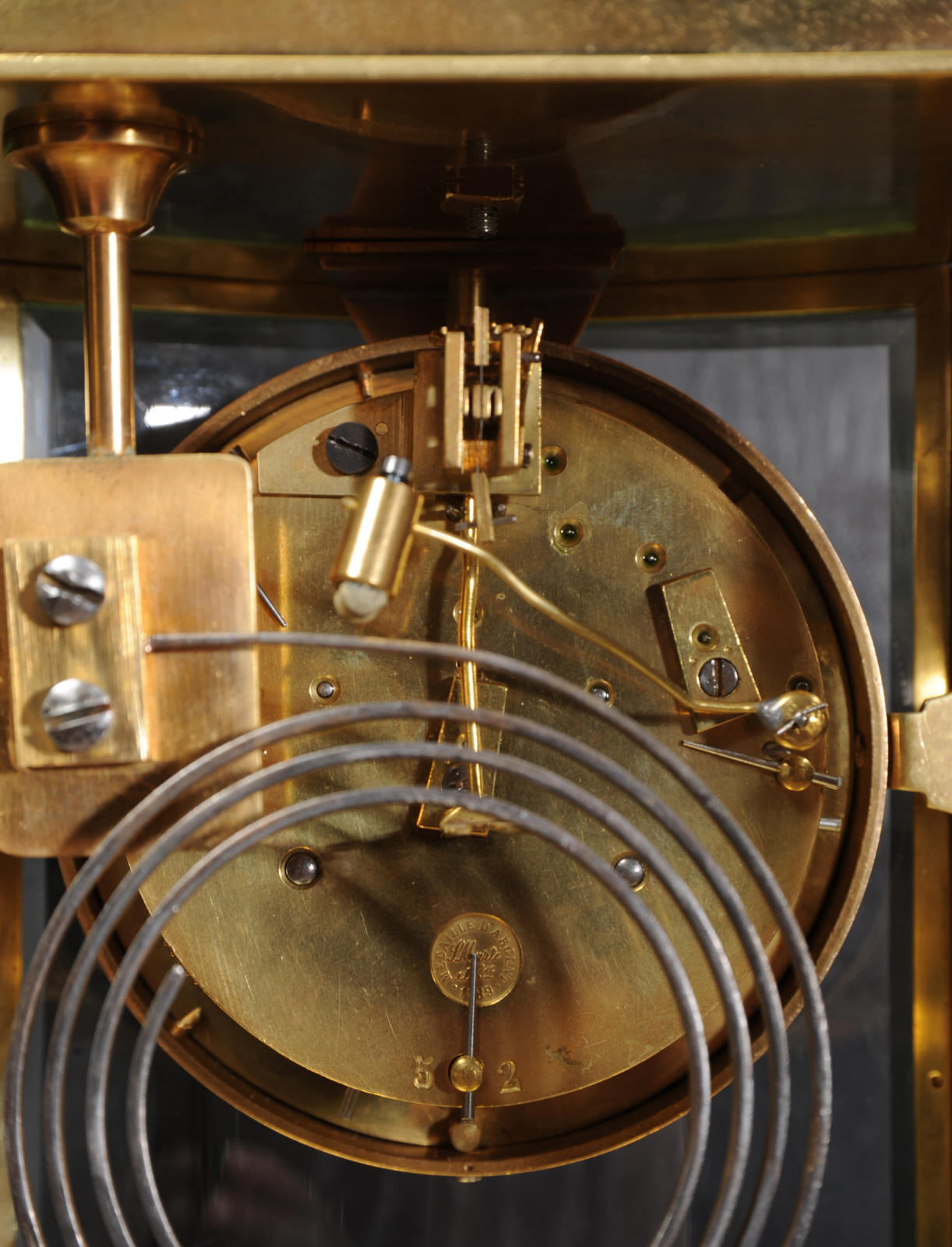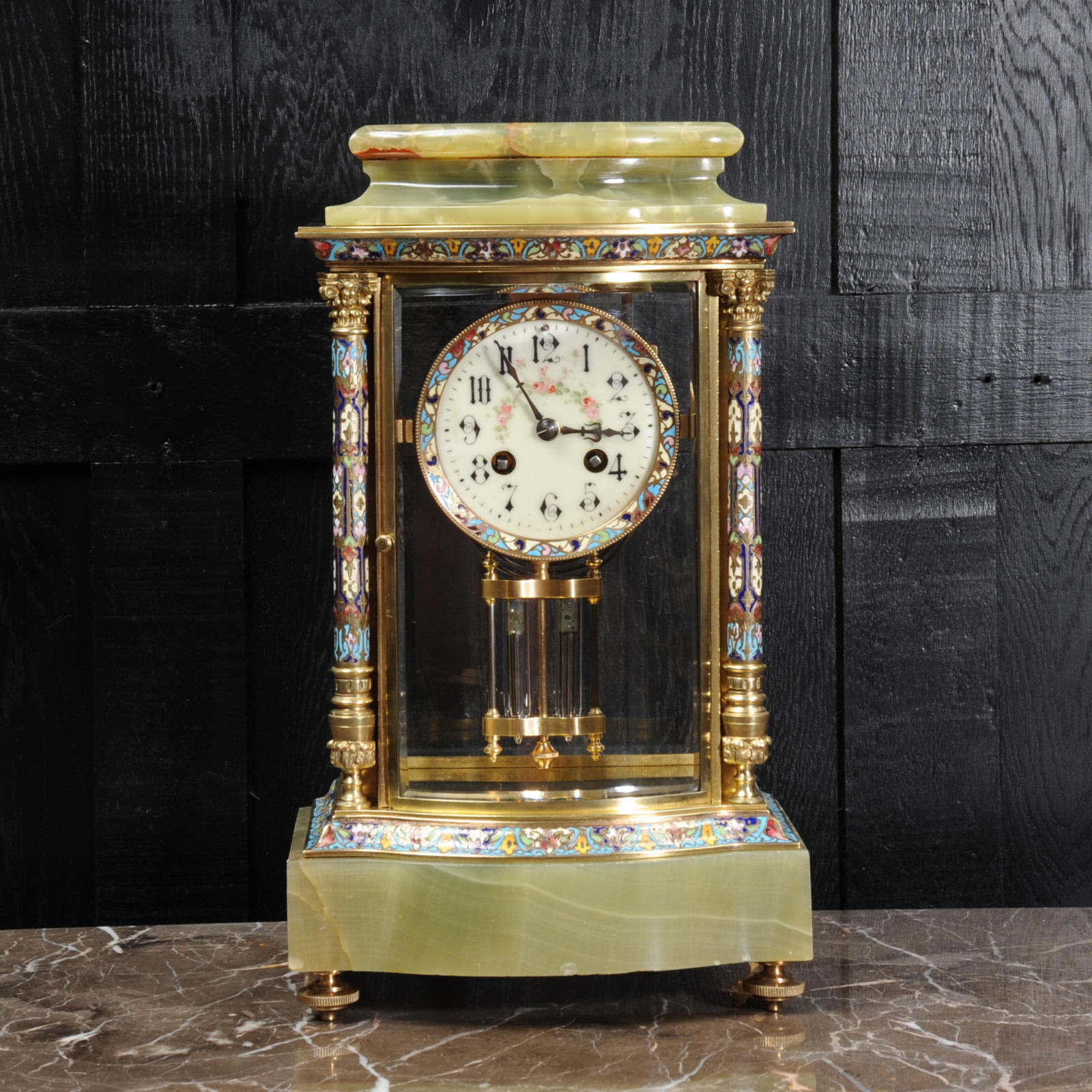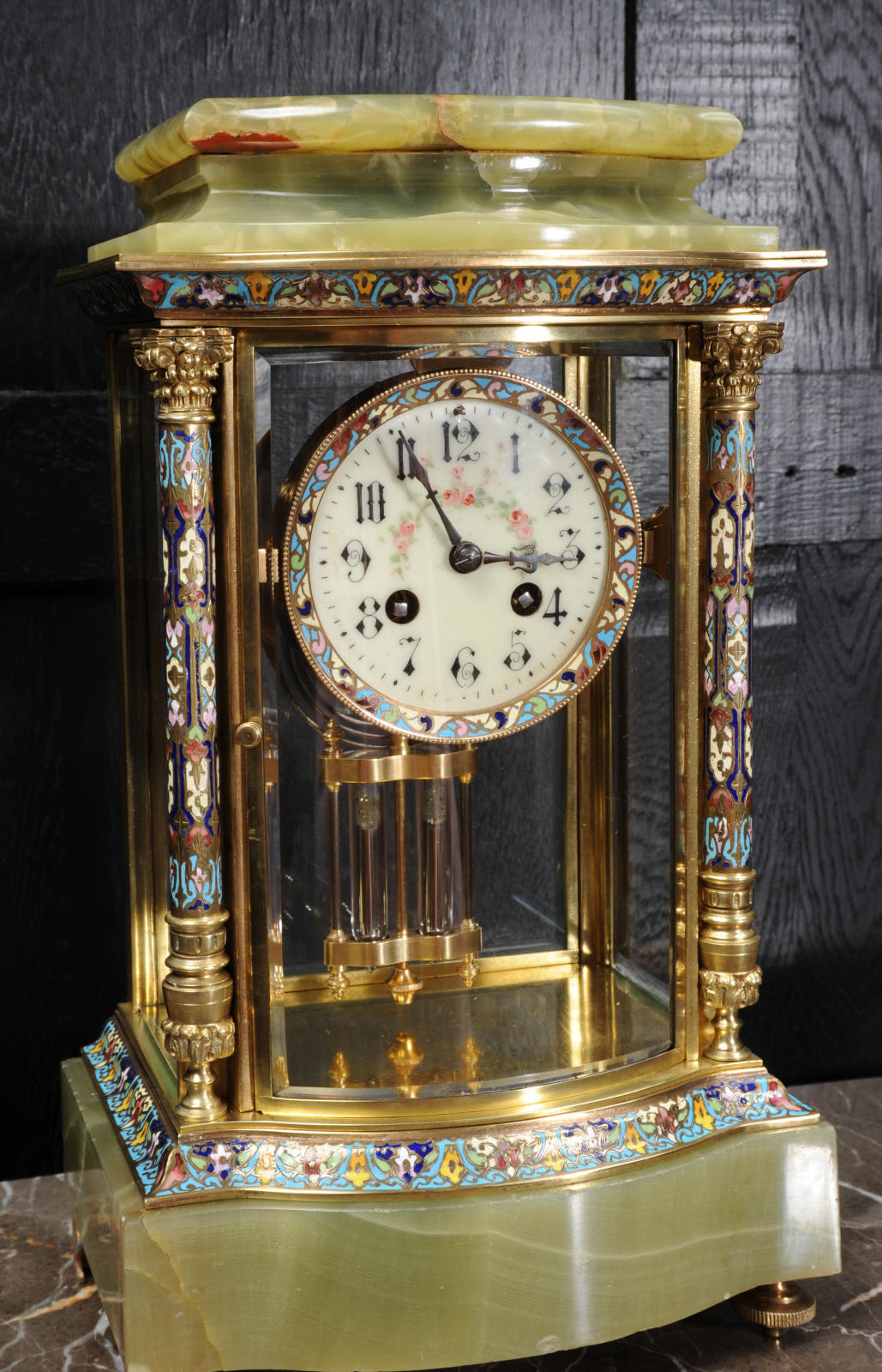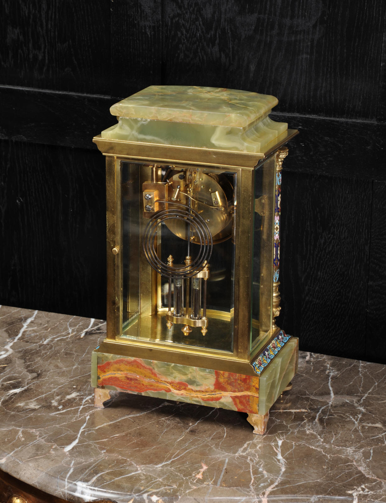 The dial is porcelain enamel on copper with pretty floral swags and blued steel hands. The French movement is by Samuel Marti and is in excellent clean and running condition having been fully overhauled by our clockmaker. The mercury compensated pendulum is original and is designed to compensate for temperature effects. The mercury is contained in sealed vials rather like a thermometer. It runs for 8 days and strikes the hours and halves on a coiled gong. Click the video clip below to hear the gong and watch the clock running! Condition of the case is excellent, the original gilding is beautifully clean with some minor wear and discolouration. The dial is also in excellent condition just some tiny nibbles to the winding holes. The glass is very good, just 2 very small chips to the rear door. The onyx is also very good, some nibbles to the edges and a light crack on the left hand side lower front.