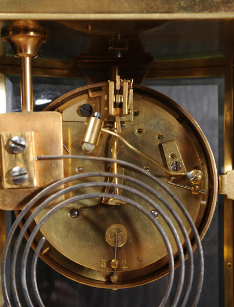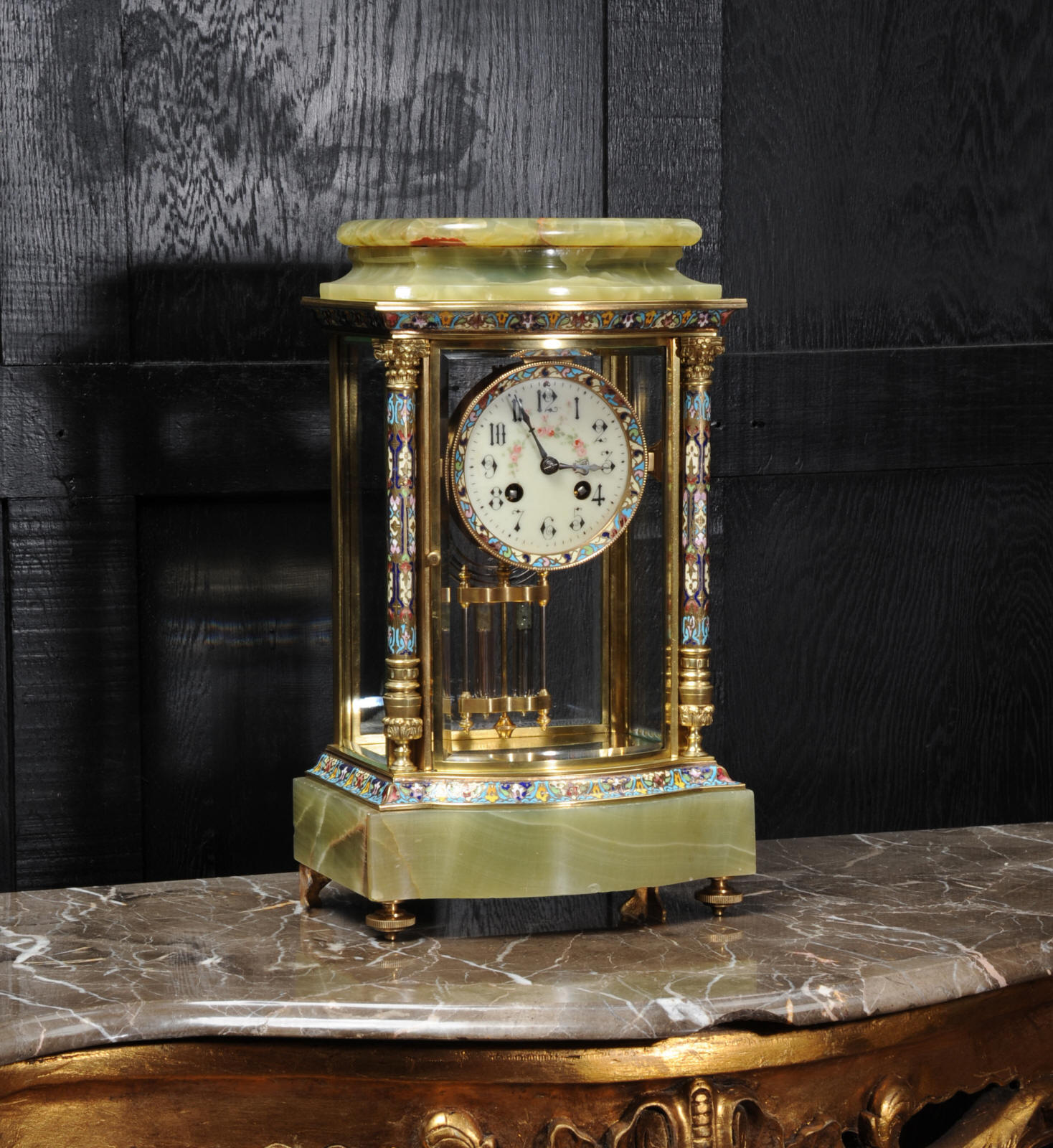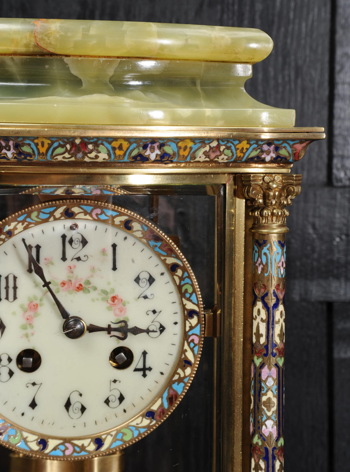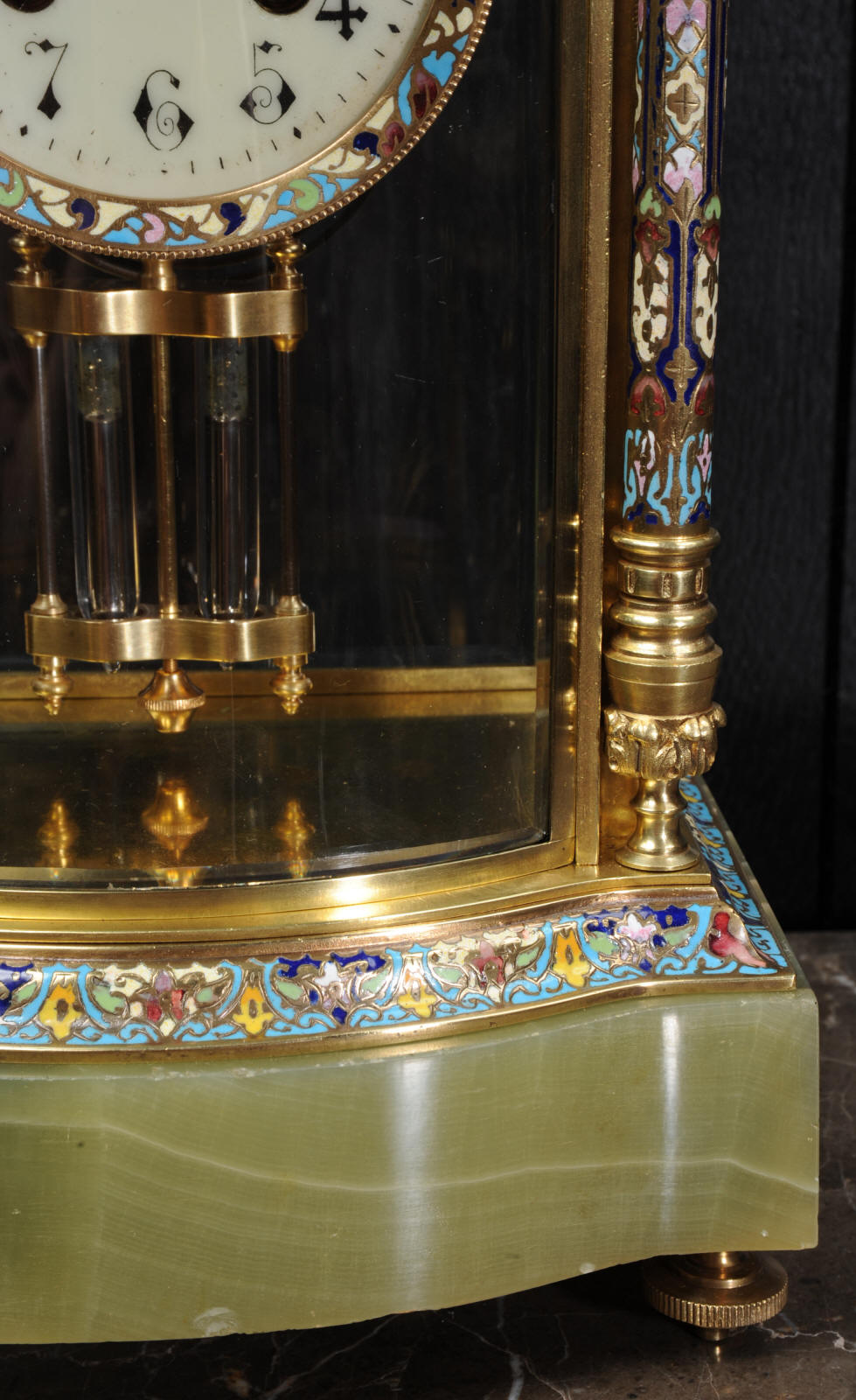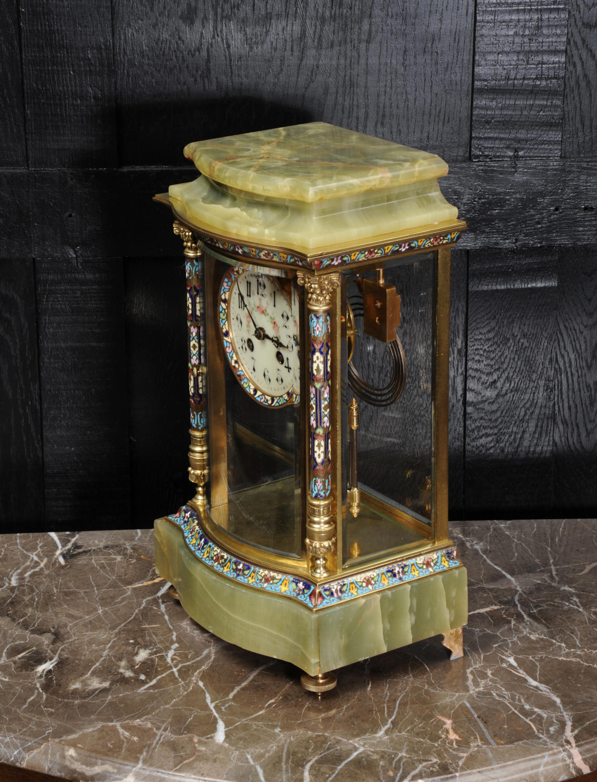 The dial is porcelain enamel on copper with pretty floral swags and blued steel hands. The French movement is by Samuel Marti and is in excellent clean and running condition having been fully overhauled by our clockmaker. The mercury compensated pendulum is original and is designed to compensate for temperature effects. The mercury is contained in sealed vials rather like a thermometer. It runs for 8 days and strikes the hours and halves on a coiled gong. Click the video clip below to hear the gong and watch the clock running! Condition of the case is excellent, the original gilding is beautifully clean with some minor wear and discolouration. The dial is also in excellent condition just some tiny nibbles to the winding holes. The glass is very good, just 2 very small chips to the rear door. The onyx is also very good, some nibbles to the edges and a light crack on the left hand side lower front.