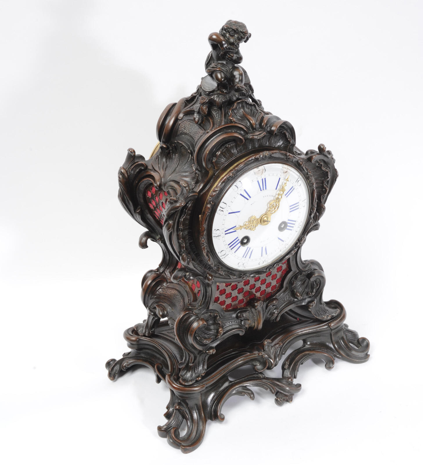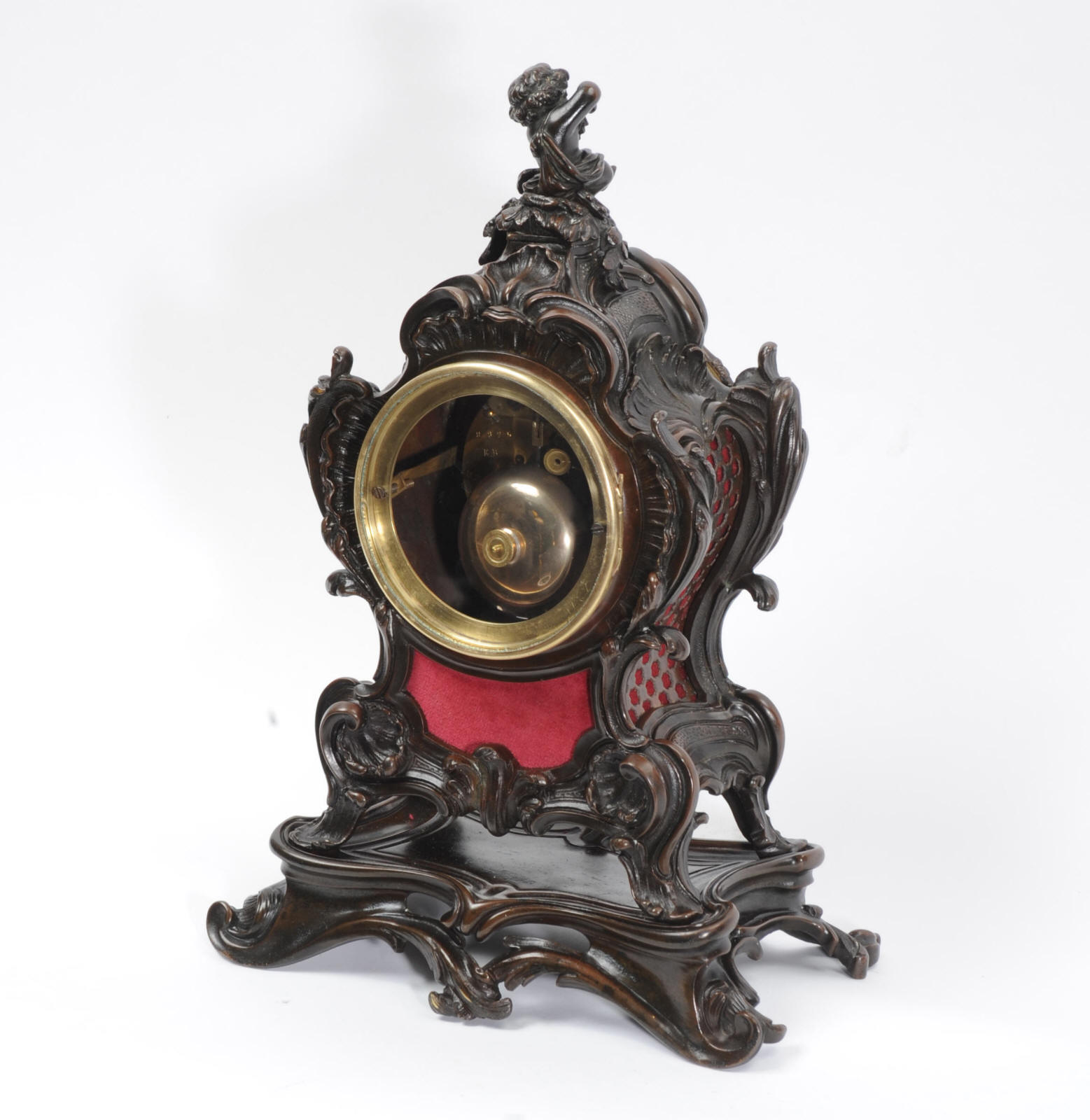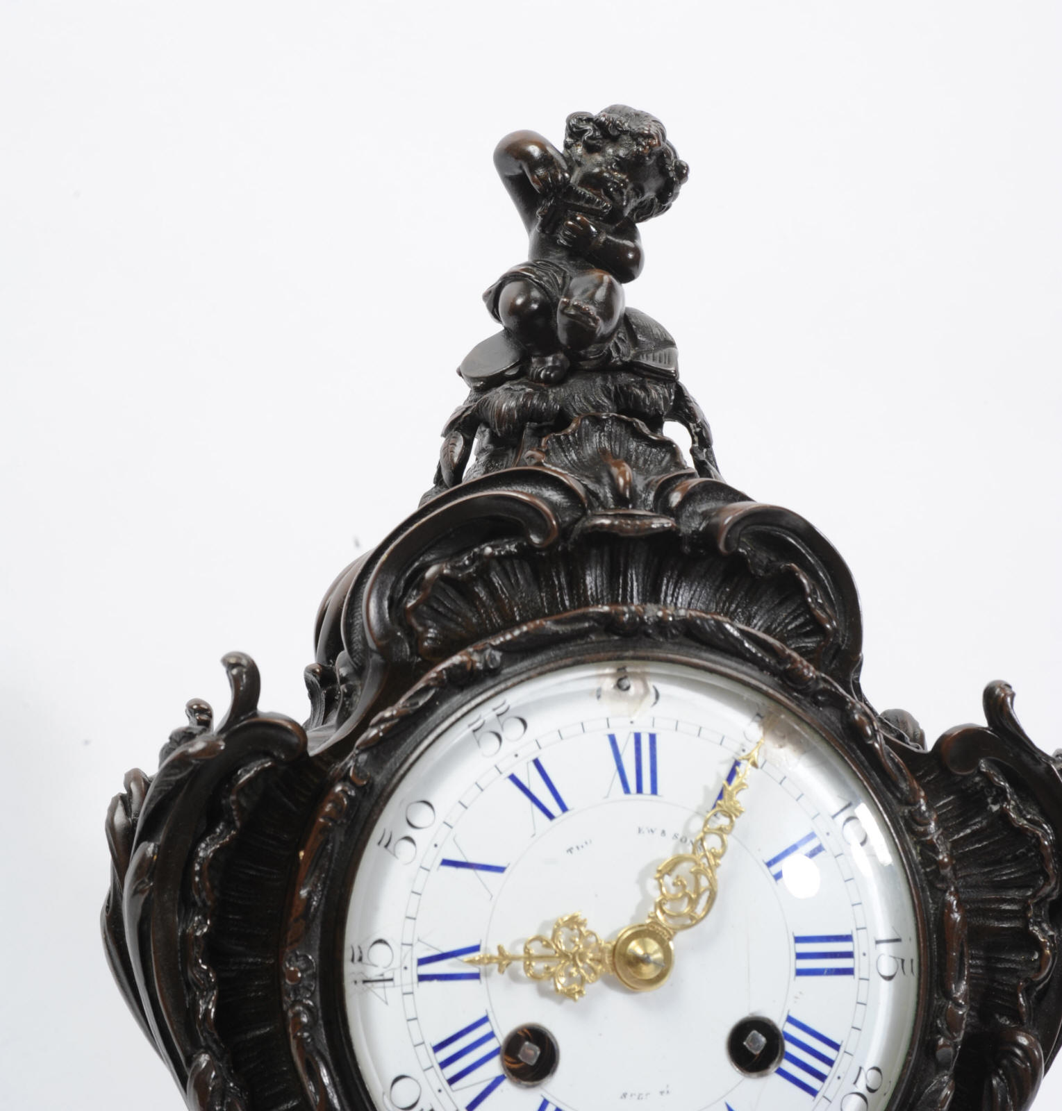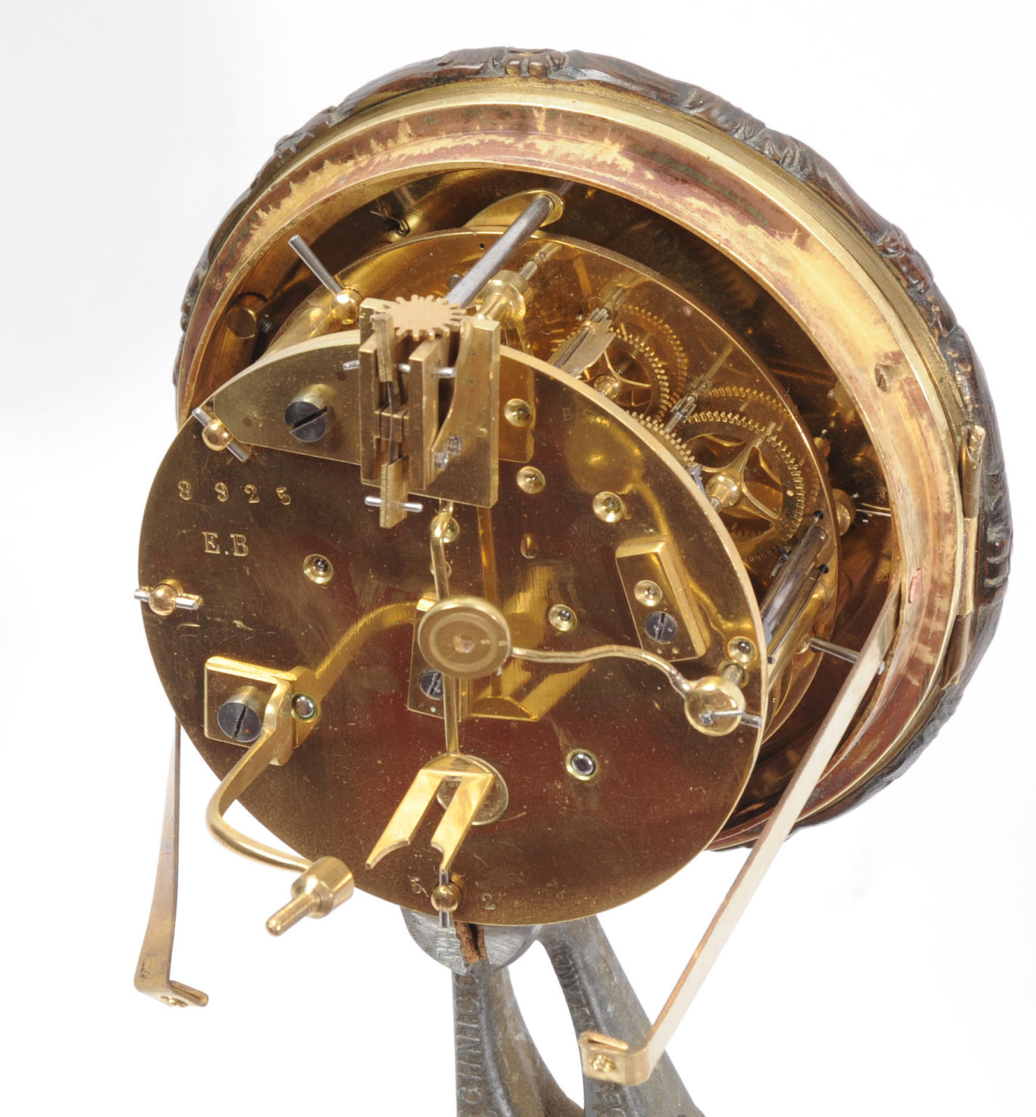 The dial is porcelain enamel on copper, cream with blue lettering and separate minute ring. It is complete with original finely fretted brass hands. There is a rubbed retailers signature to the dial. The rear door is glazed to allow the movement to be seen. The French movement is of high quality and is by Japy Freres. It is in excellent clean and running condition. Pendulum is an old replacement. It runs for 8 days and strikes the hours and halves on a bell. Click the video clip below to hear the bell and watch the clock running! Condition of the case is excellent, the bronze patination is in lovely condition with a mellow antique colour. We have replaced the fabric with fresh. The dial has some slight damage at the 12 and 1 o'clock positions and some hairlines and slight chipping next to the winding holes.