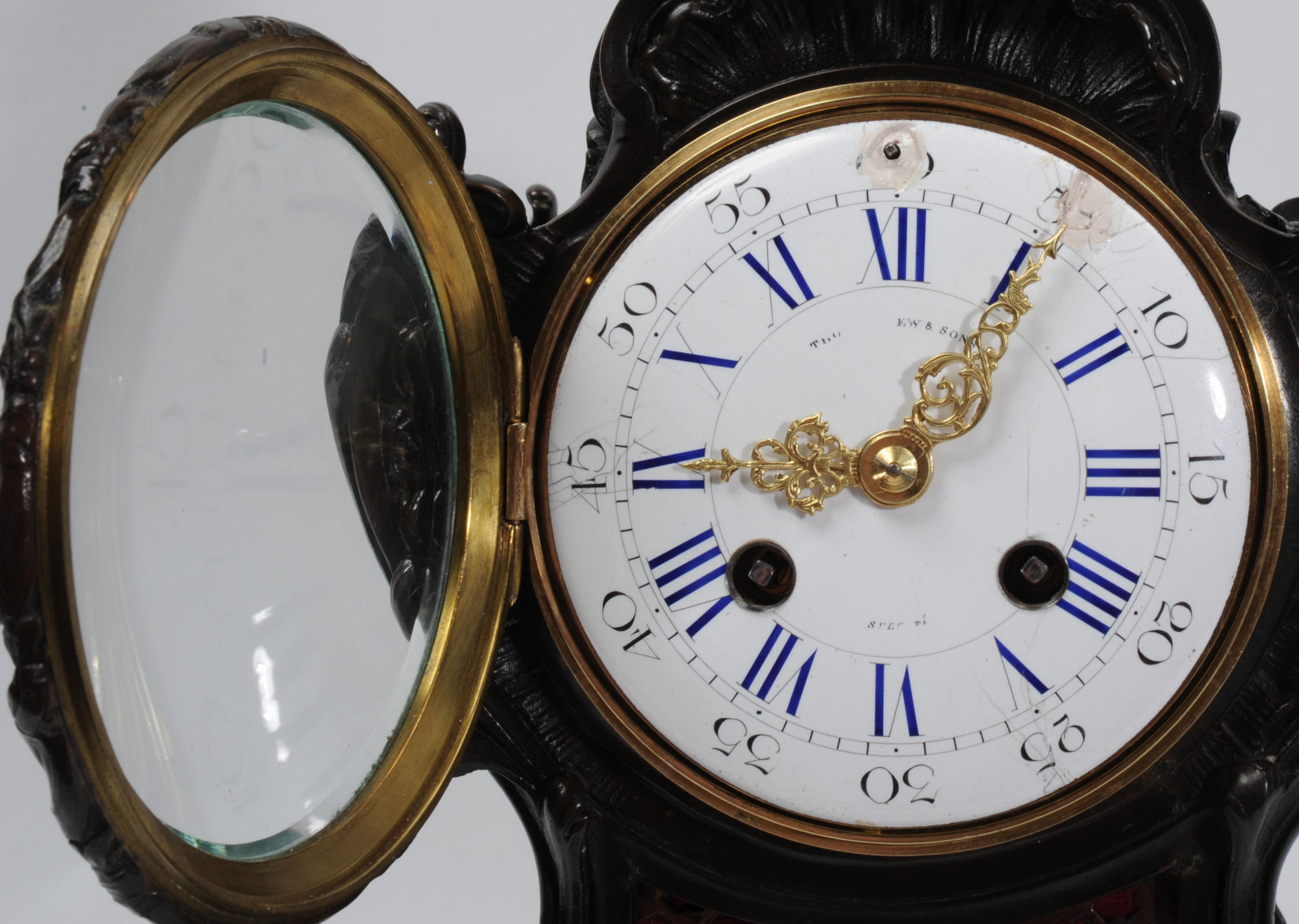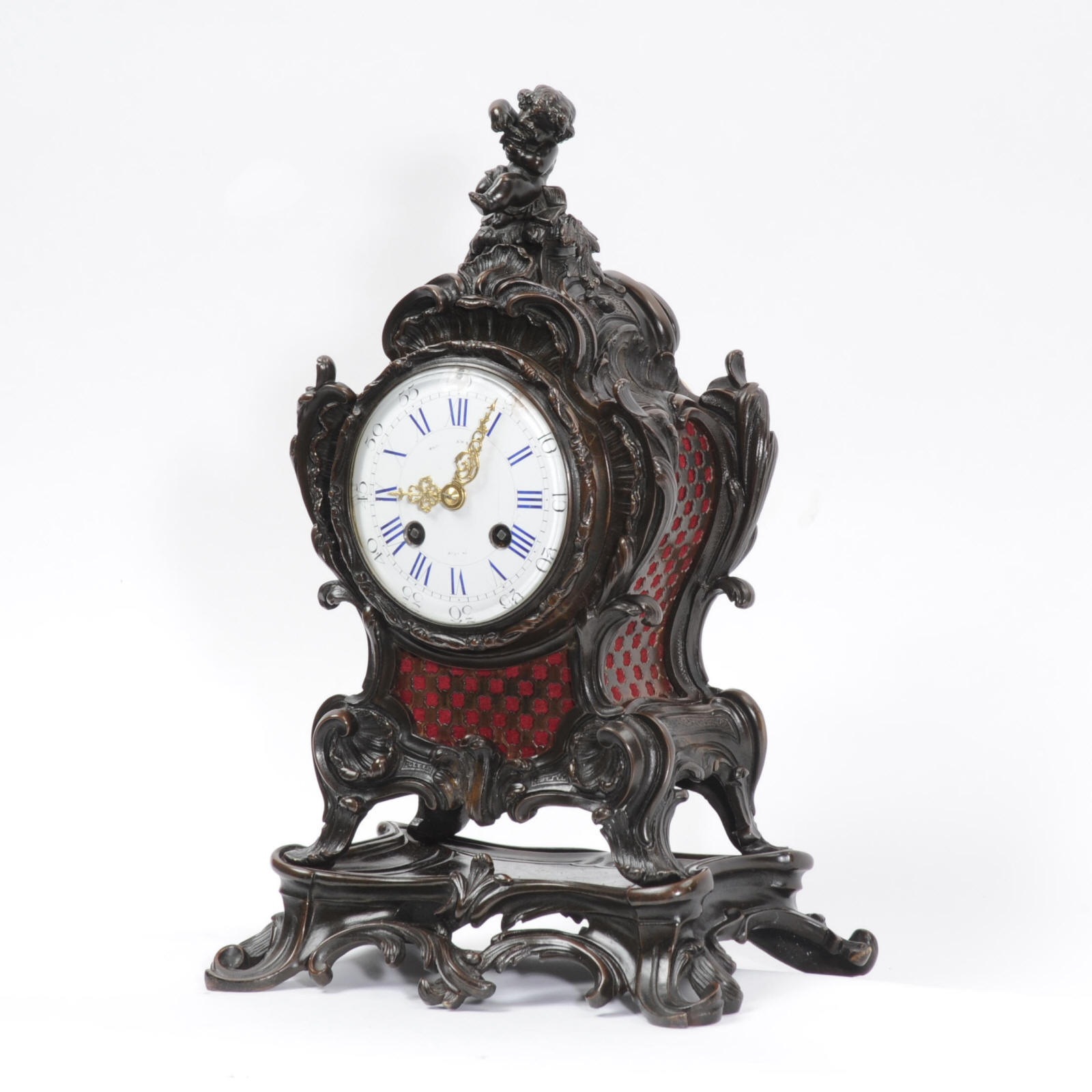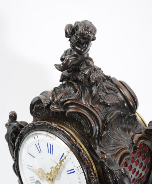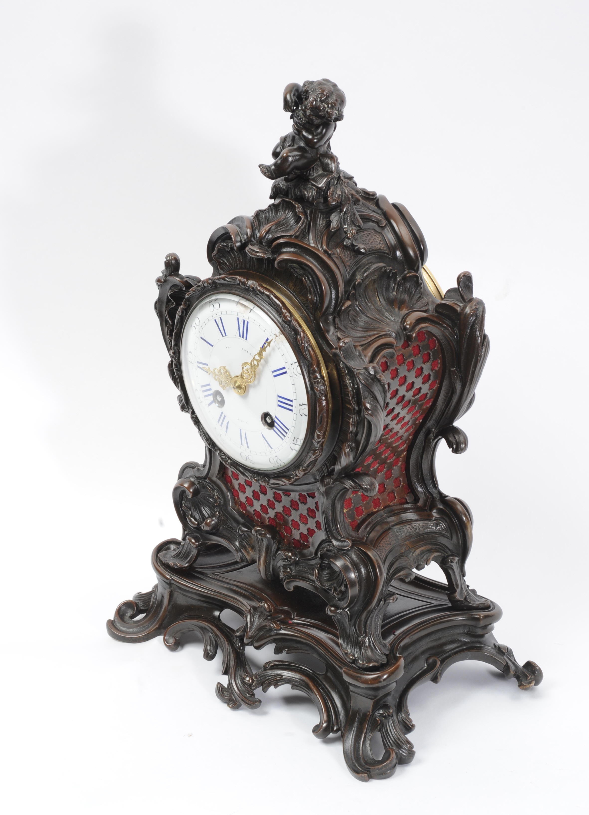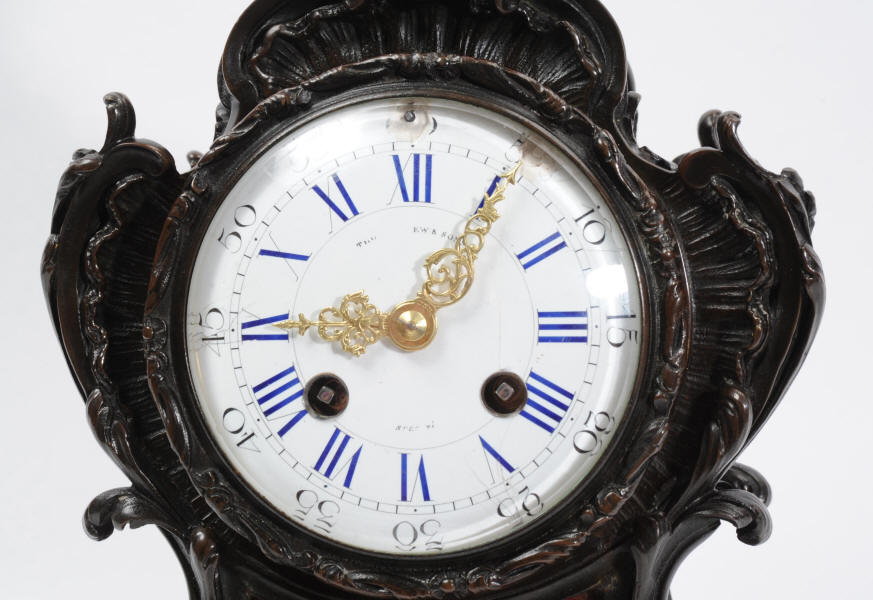 The dial is porcelain enamel on copper, cream with blue lettering and separate minute ring. It is complete with original finely fretted brass hands. There is a rubbed retailers signature to the dial. The rear door is glazed to allow the movement to be seen. The French movement is of high quality and is by Japy Freres. It is in excellent clean and running condition. Pendulum is an old replacement. It runs for 8 days and strikes the hours and halves on a bell. Click the video clip below to hear the bell and watch the clock running! Condition of the case is excellent, the bronze patination is in lovely condition with a mellow antique colour. We have replaced the fabric with fresh. The dial has some slight damage at the 12 and 1 o'clock positions and some hairlines and slight chipping next to the winding holes.