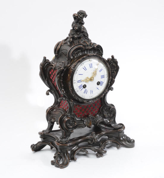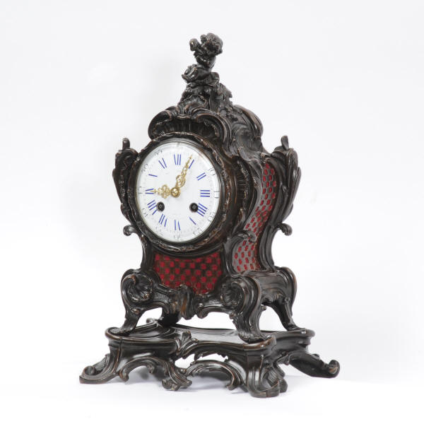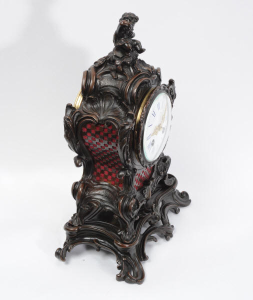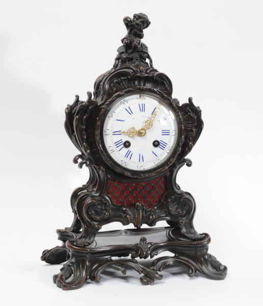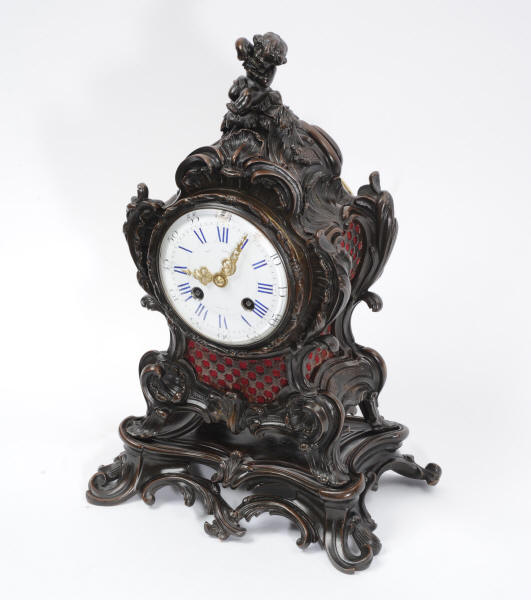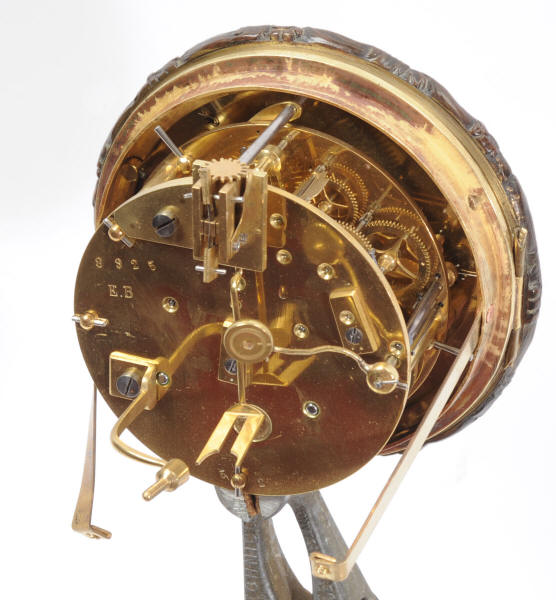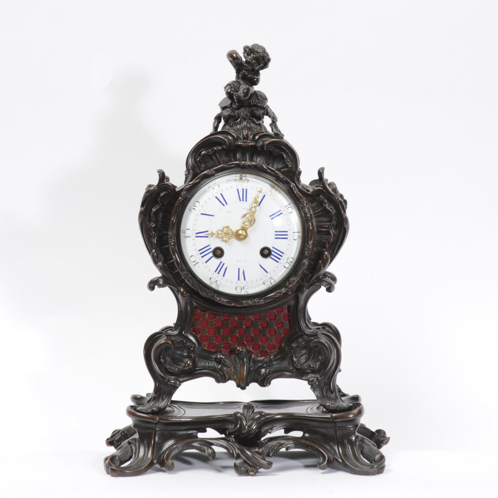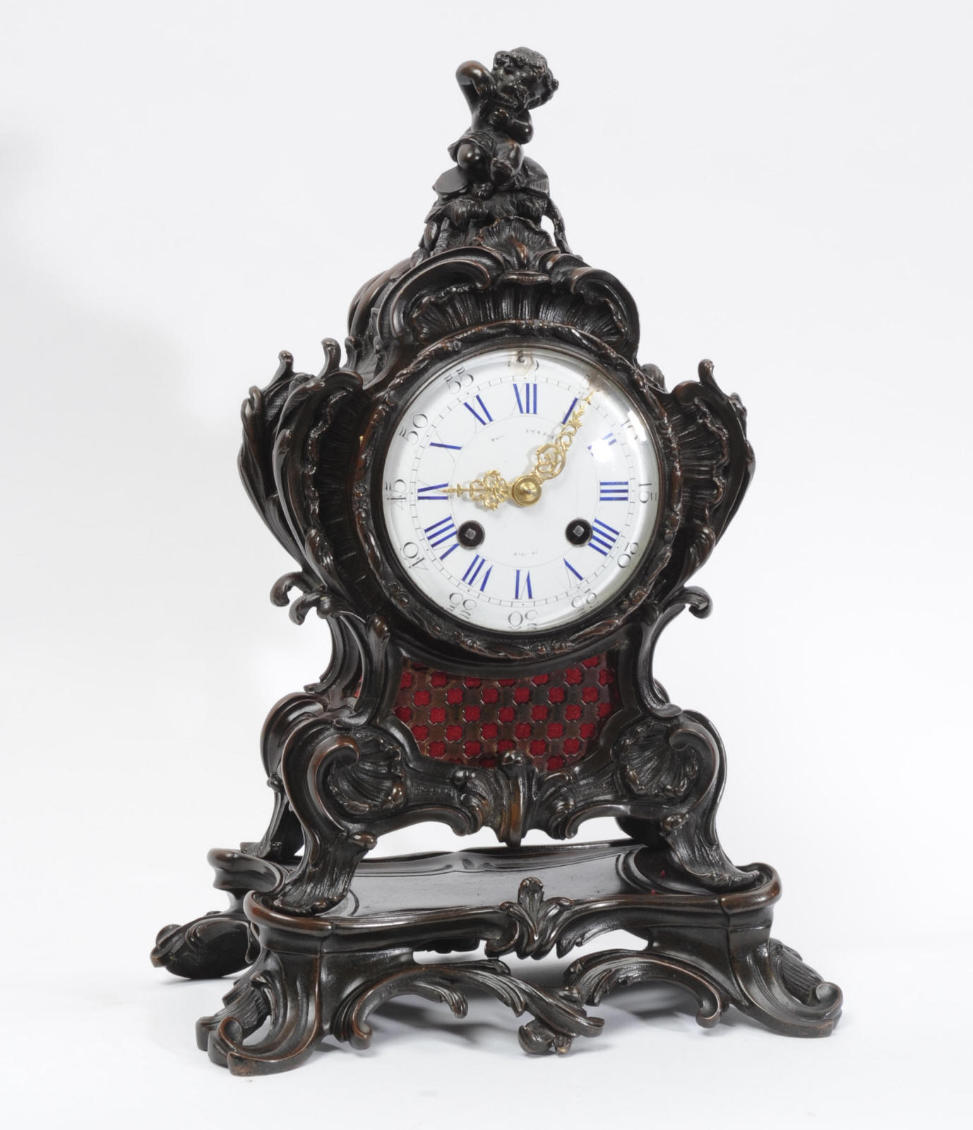 The dial is porcelain enamel on copper, cream with blue lettering and separate minute ring. It is complete with original finely fretted brass hands. There is a rubbed retailers signature to the dial. The rear door is glazed to allow the movement to be seen. The French movement is of high quality and is by Japy Freres. It is in excellent clean and running condition. Pendulum is an old replacement. It runs for 8 days and strikes the hours and halves on a bell. Click the video clip below to hear the bell and watch the clock running! Condition of the case is excellent, the bronze patination is in lovely condition with a mellow antique colour. We have replaced the fabric with fresh. The dial has some slight damage at the 12 and 1 o'clock positions and some hairlines and slight chipping next to the winding holes.
