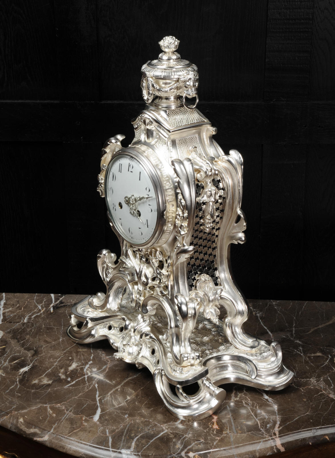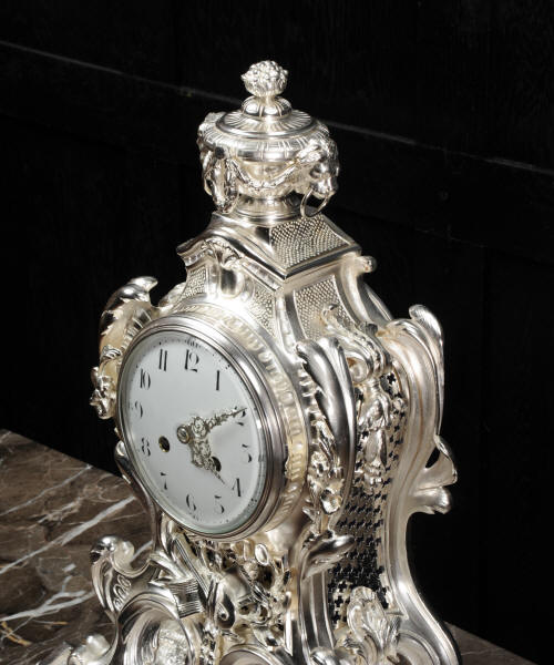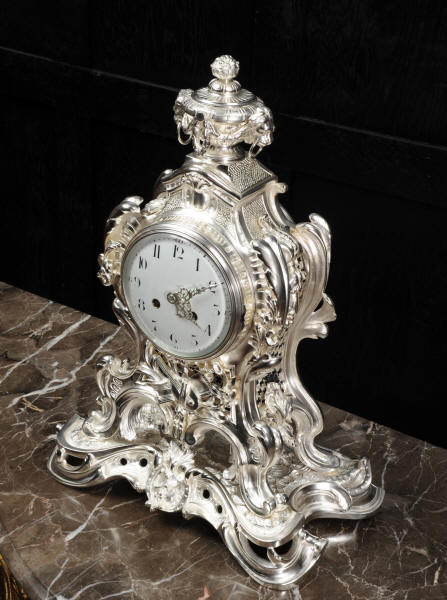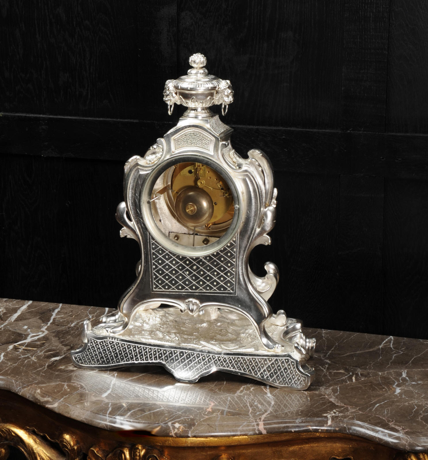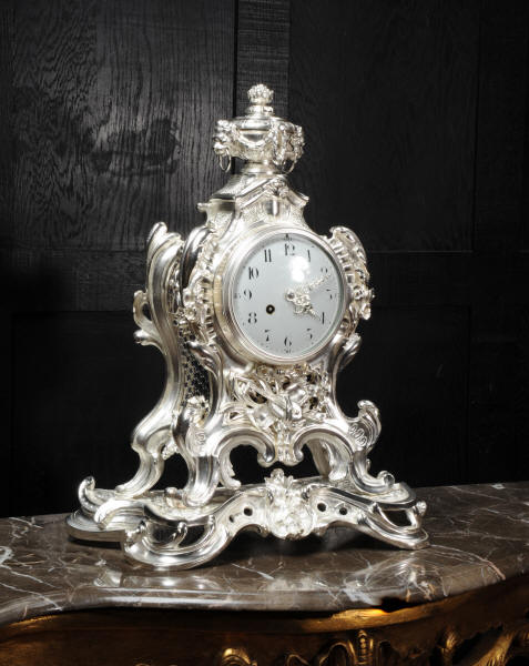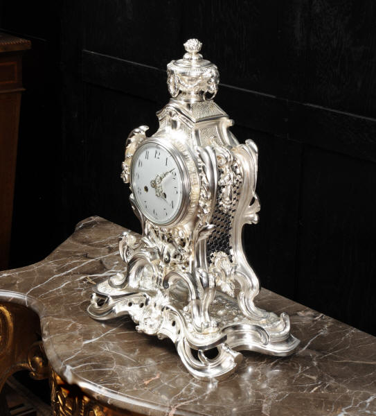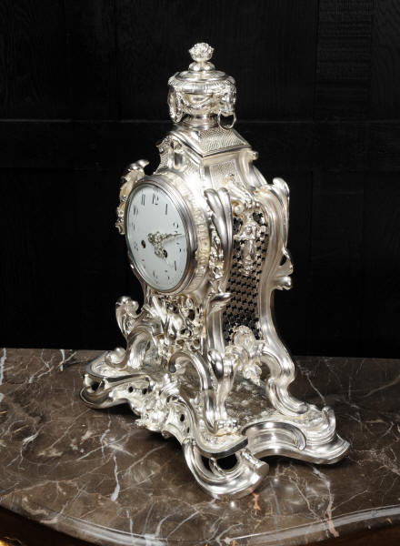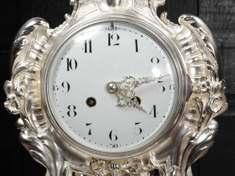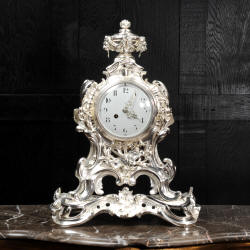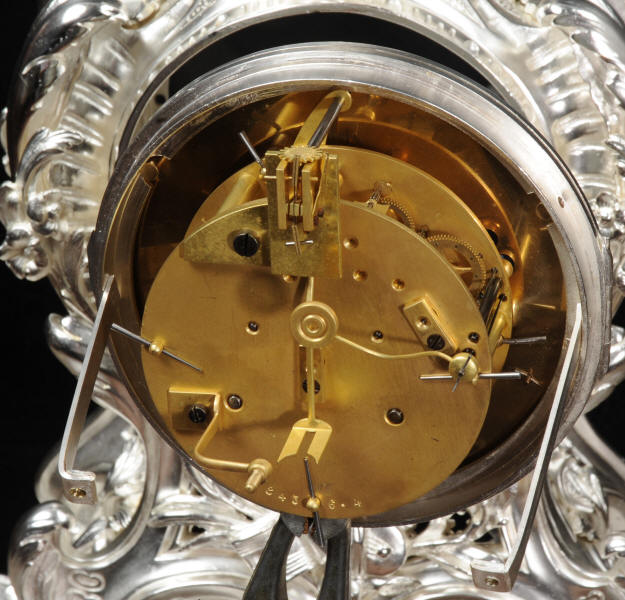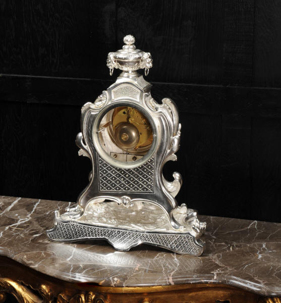 The front and the sides of the case have fretted sound panels backed with blue fabric. The rear door is glazed to allow the movement to be seen. The design is beautifully bold and heavily modelled, well chased and finished. It is modelled in the round and so would display very well on a table or in front of a mirror. The dial is porcelain enamel on copper with silver plated Rococo hands and convex glass. The French movement is of high quality and is in excellent clean and running condition having been fully overhauled by our clockmaker. Pendulum is a replacement. It runs for 8 days and strikes the hours and halves on a bell. Click the video clip below to hear the bell and watch the clock running!