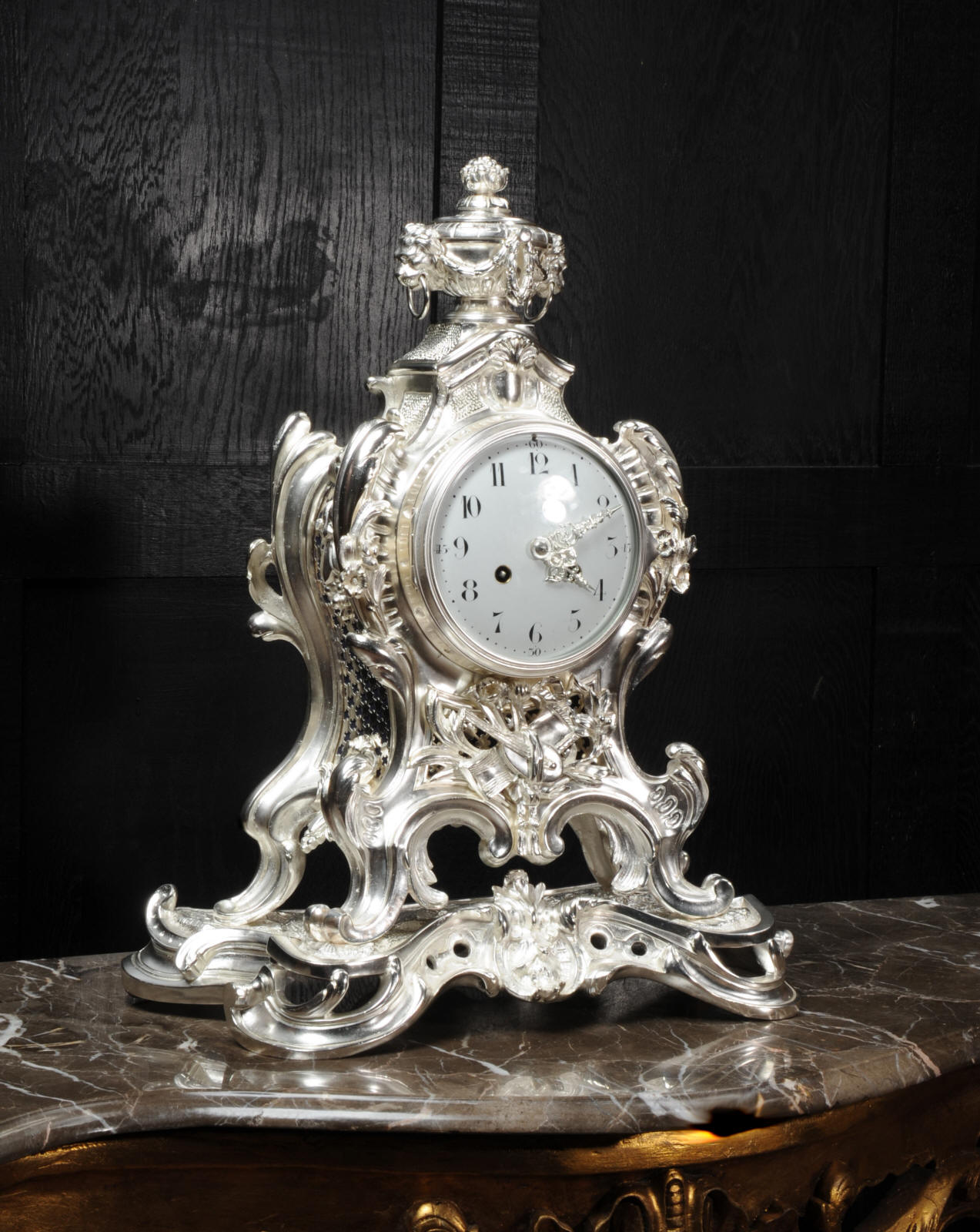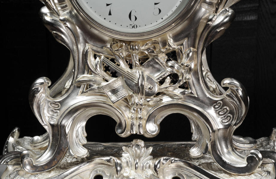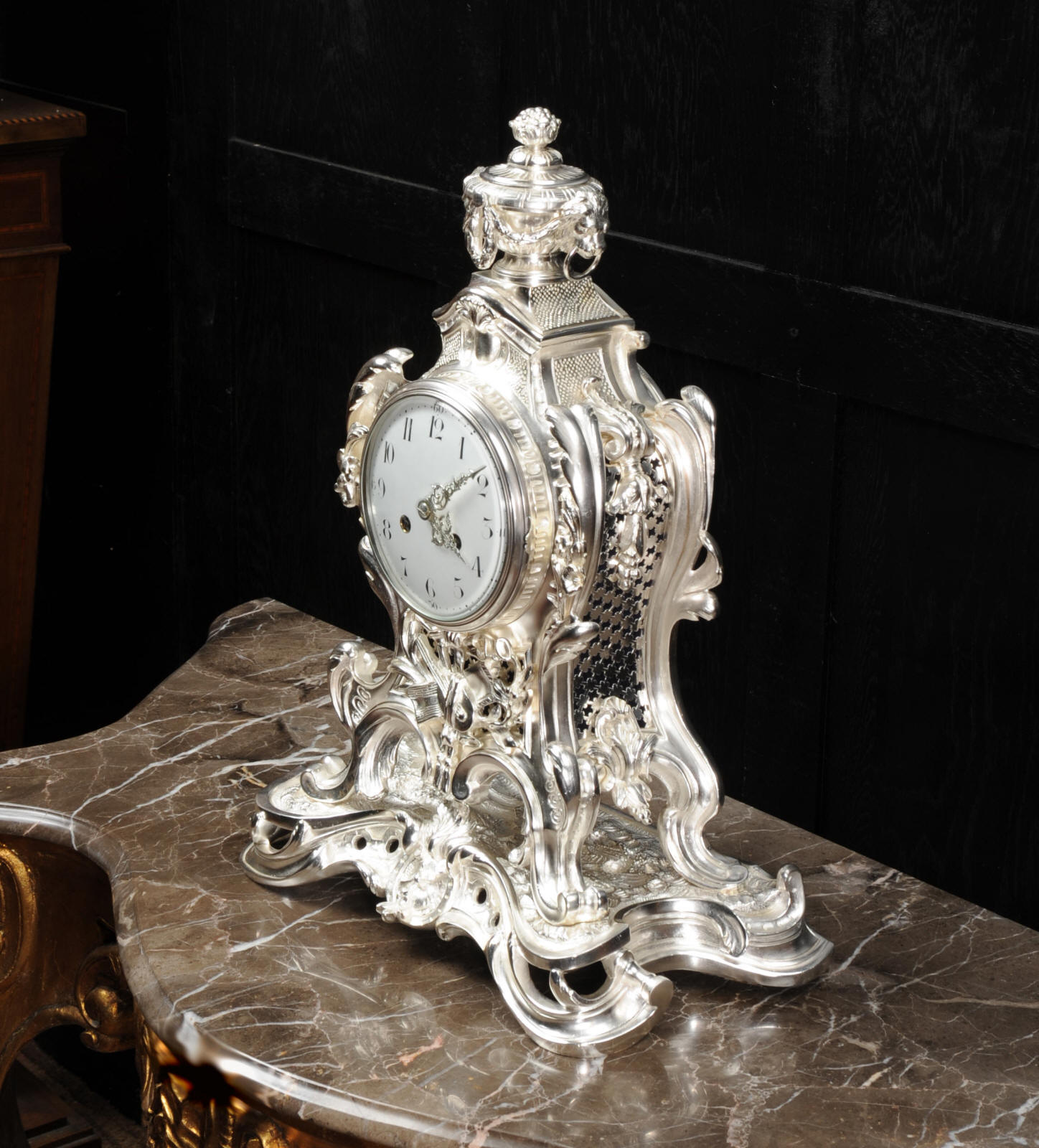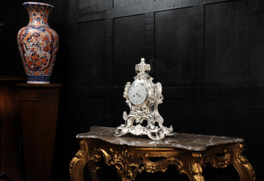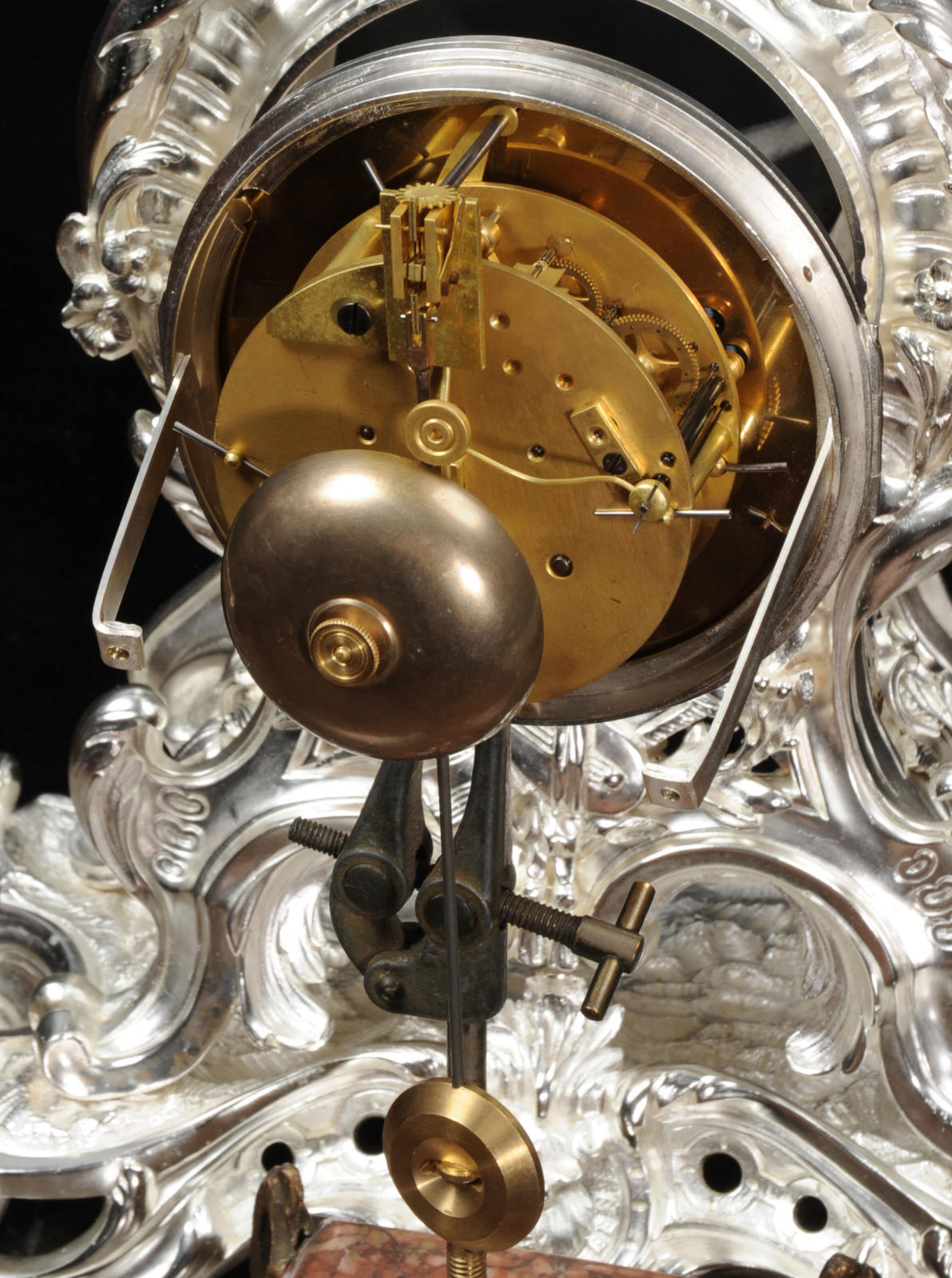The front and the sides of the case have fretted sound panels backed with blue fabric. The rear door is glazed to allow the movement to be seen. The design is beautifully bold and heavily modelled, well chased and finished. It is modelled in the round and so would display very well on a table or in front of a mirror. The dial is porcelain enamel on copper with silver plated Rococo hands and convex glass. The French movement is of high quality and is in excellent clean and running condition having been fully overhauled by our clockmaker. Pendulum is a replacement. It runs for 8 days and strikes the hours and halves on a bell. Click the video clip below to hear the bell and watch the clock running!