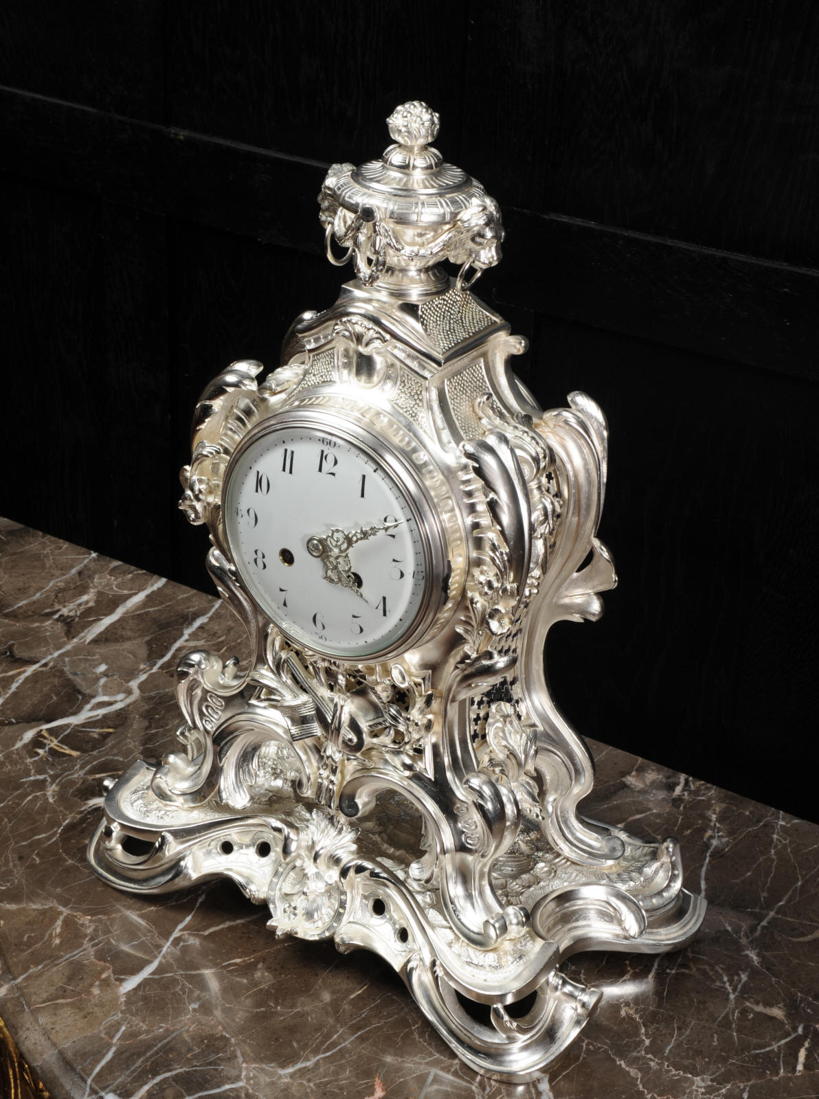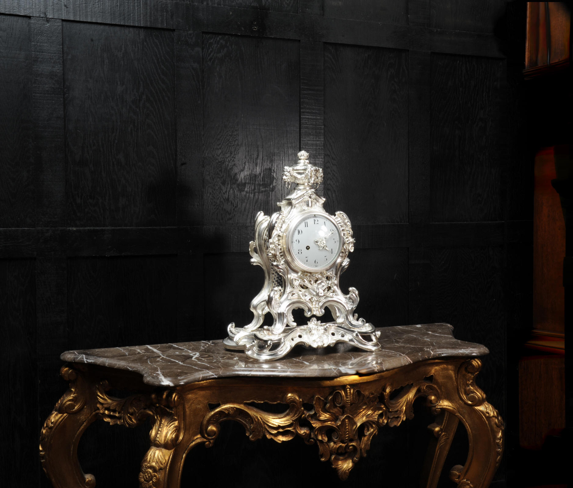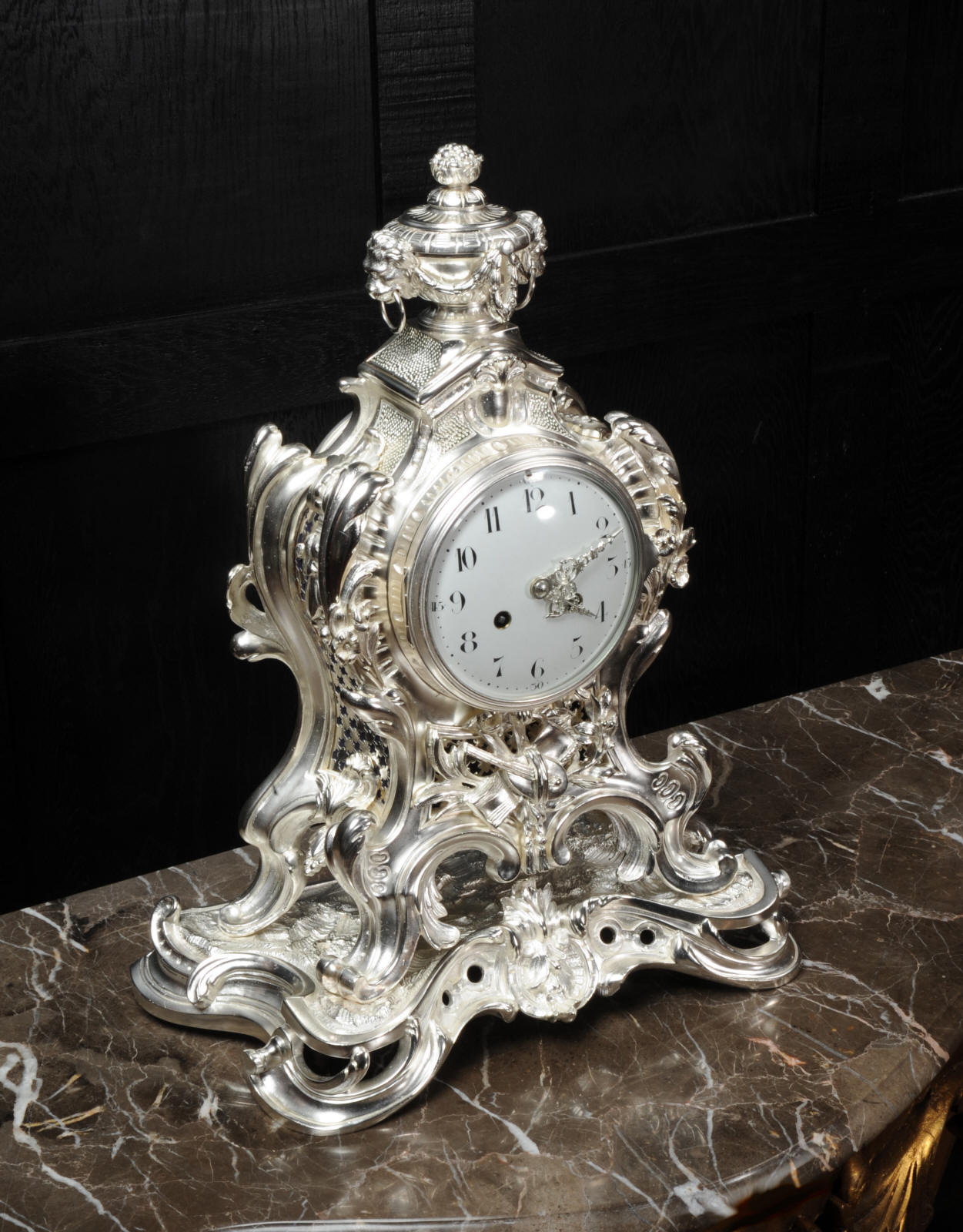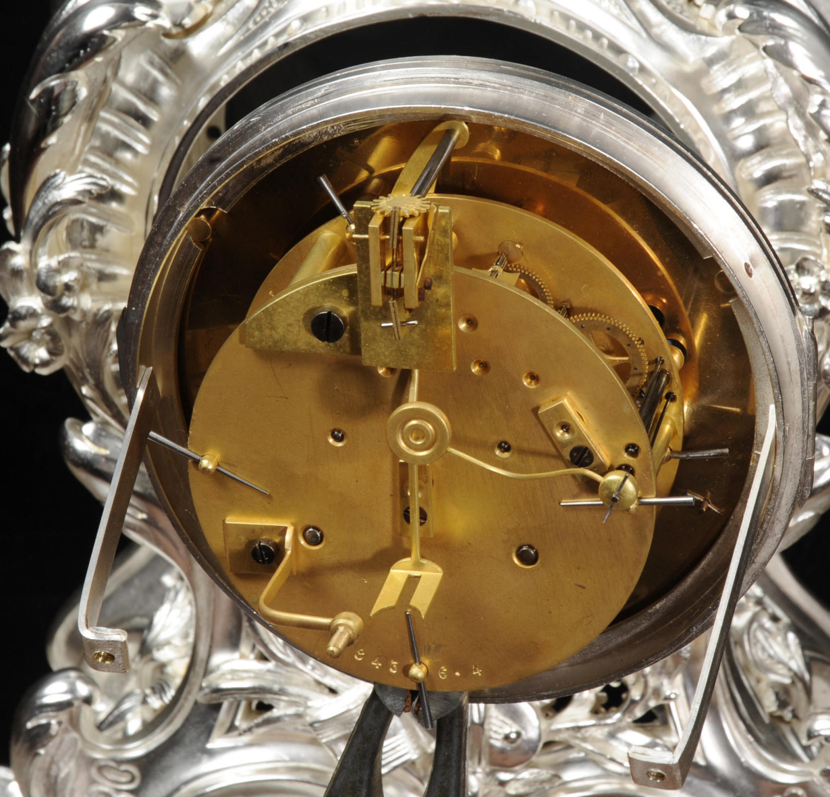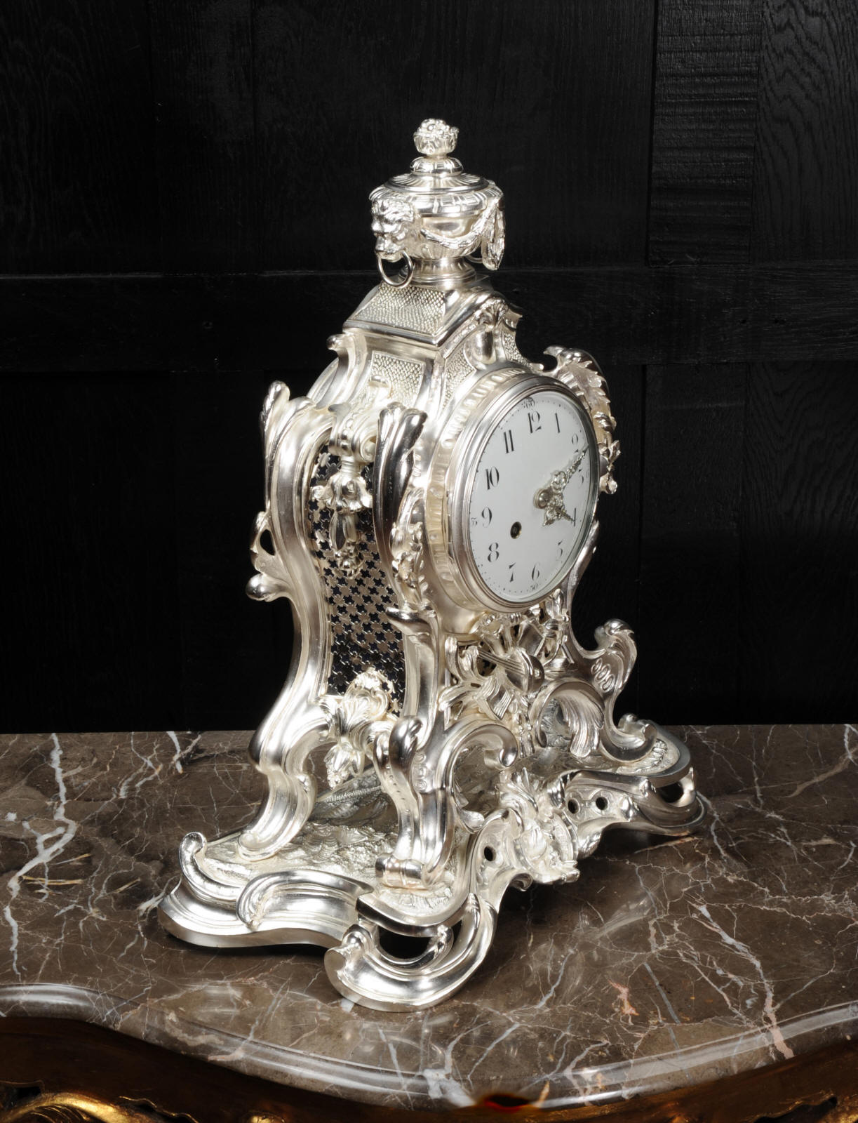 The front and the sides of the case have fretted sound panels backed with blue fabric. The rear door is glazed to allow the movement to be seen. The design is beautifully bold and heavily modelled, well chased and finished. It is modelled in the round and so would display very well on a table or in front of a mirror. The dial is porcelain enamel on copper with silver plated Rococo hands and convex glass. The French movement is of high quality and is in excellent clean and running condition having been fully overhauled by our clockmaker. Pendulum is a replacement. It runs for 8 days and strikes the hours and halves on a bell. Click the video clip below to hear the bell and watch the clock running!