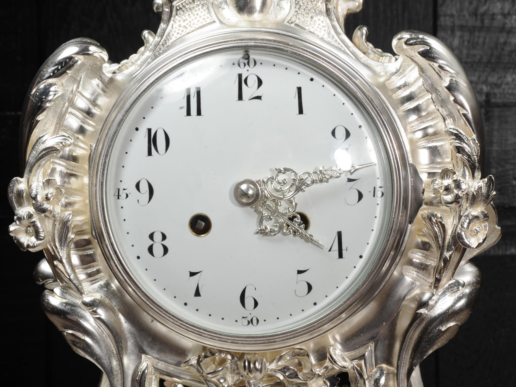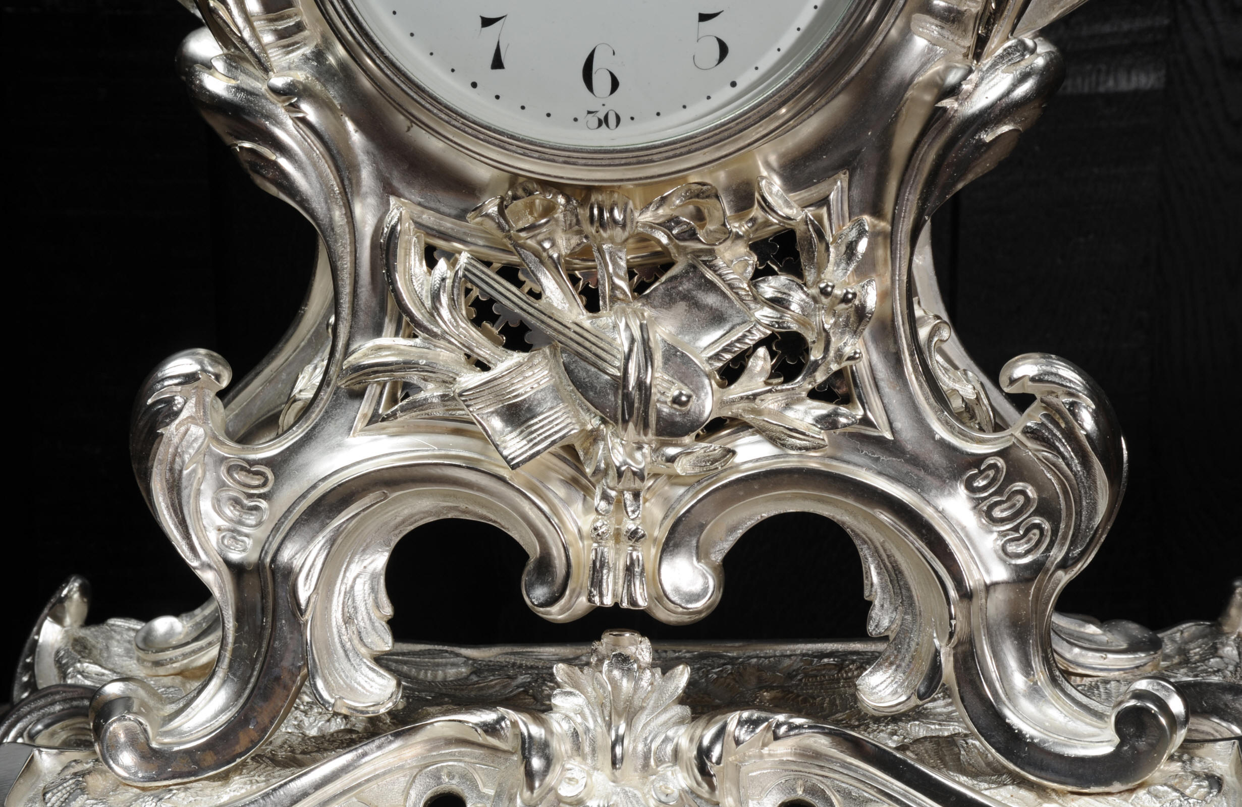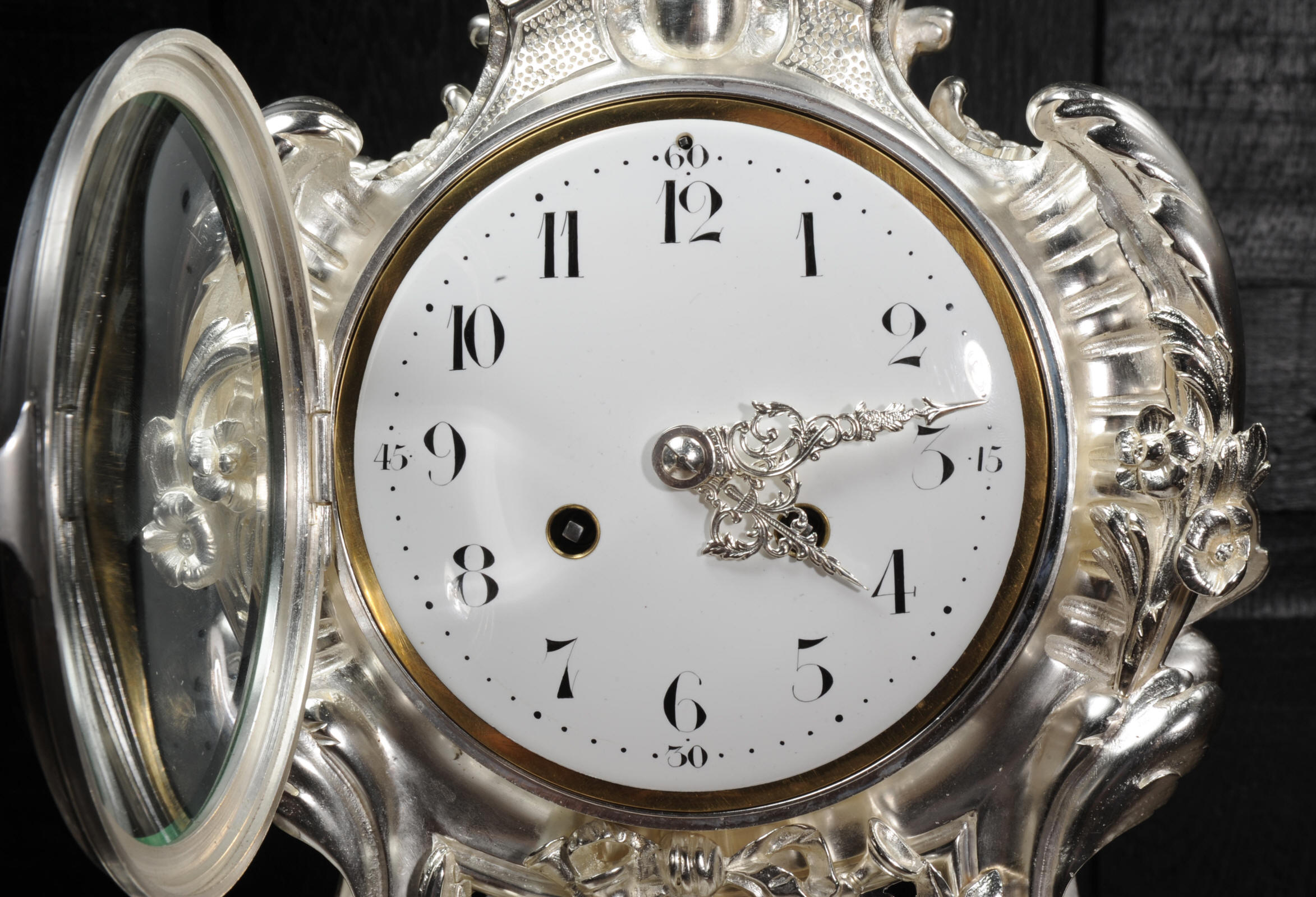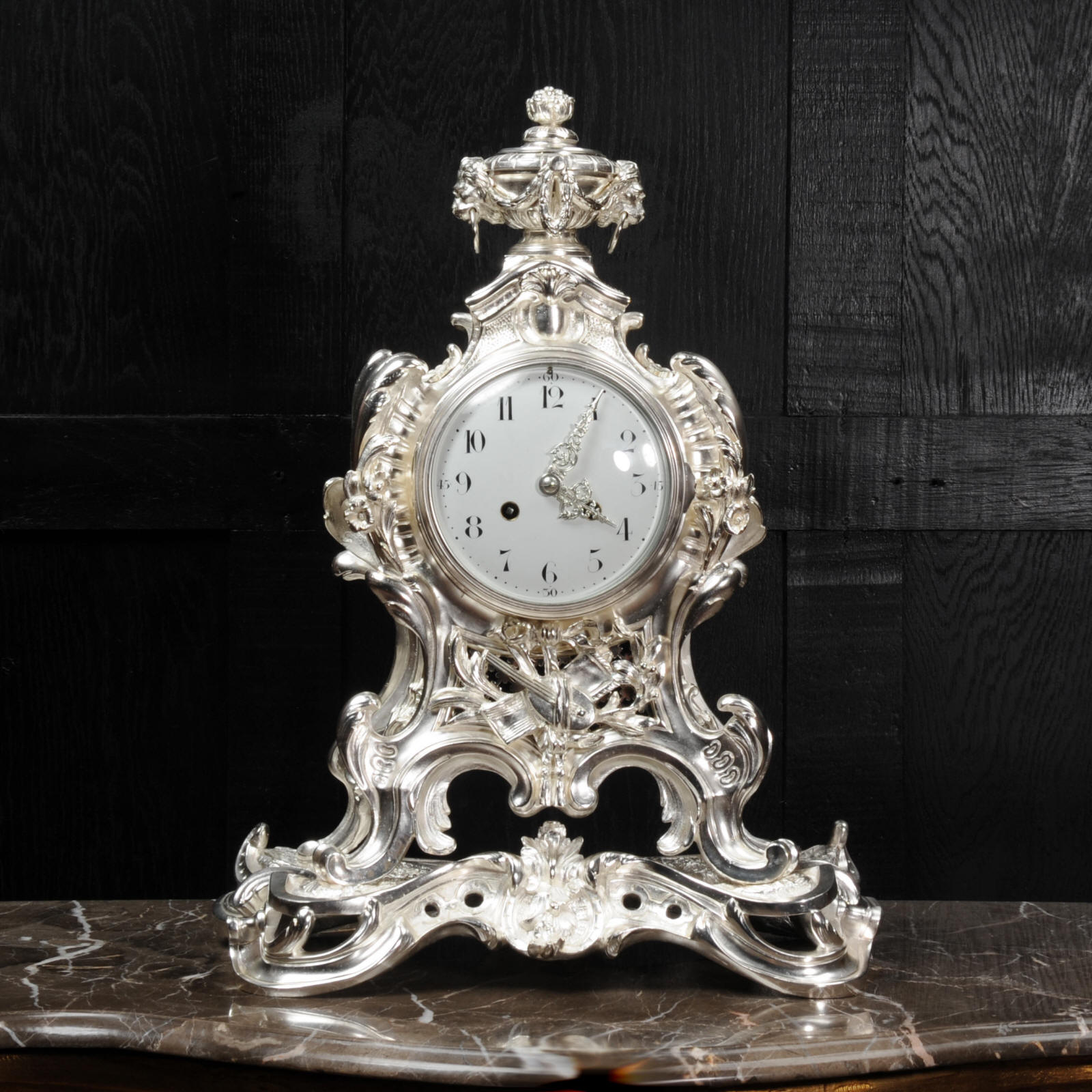 The front and the sides of the case have fretted sound panels backed with blue fabric. The rear door is glazed to allow the movement to be seen. The design is beautifully bold and heavily modelled, well chased and finished. It is modelled in the round and so would display very well on a table or in front of a mirror. The dial is porcelain enamel on copper with silver plated Rococo hands and convex glass. The French movement is of high quality and is in excellent clean and running condition having been fully overhauled by our clockmaker. Pendulum is a replacement. It runs for 8 days and strikes the hours and halves on a bell. Click the video clip below to hear the bell and watch the clock running!