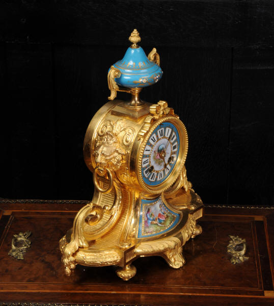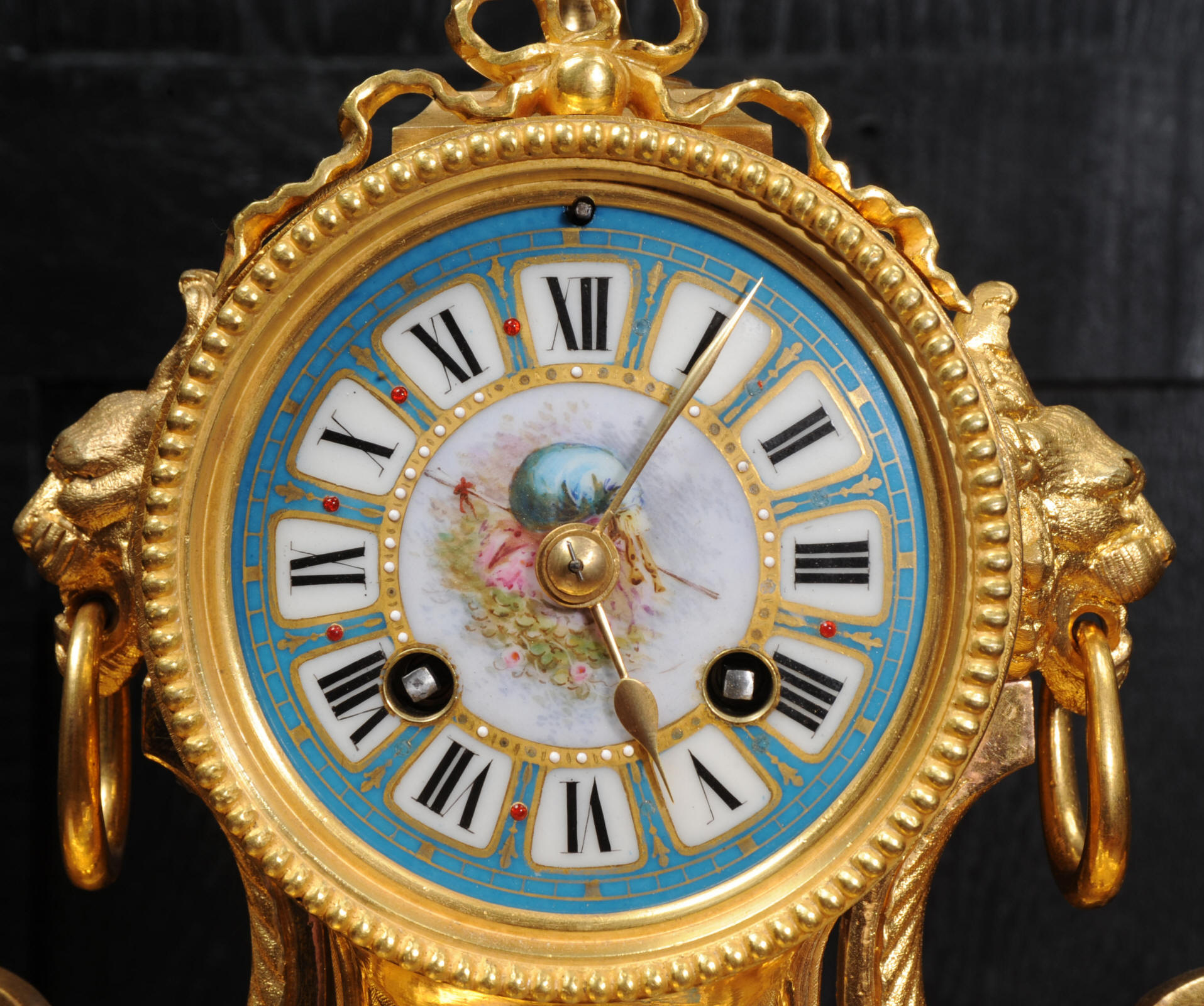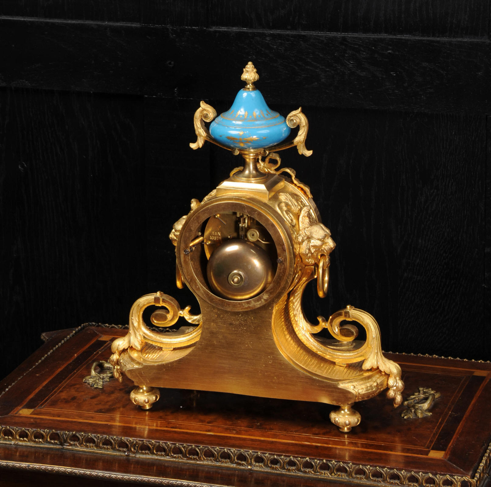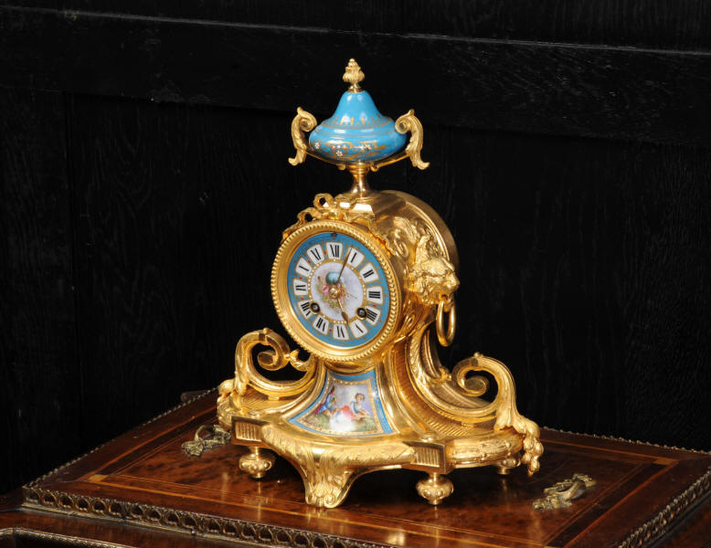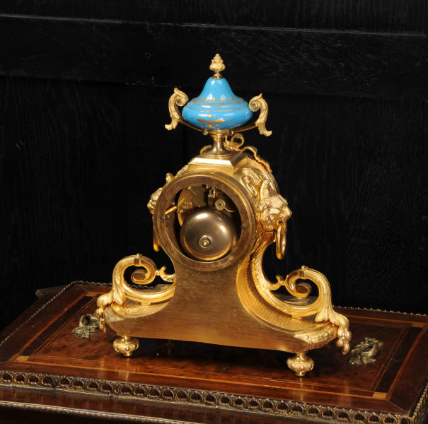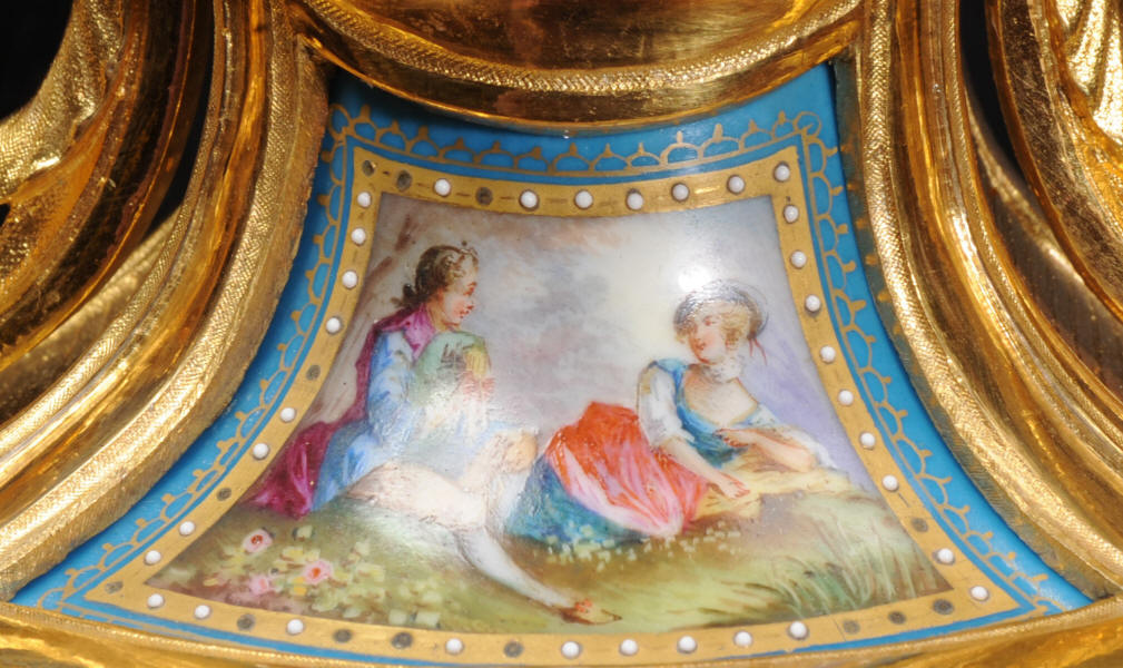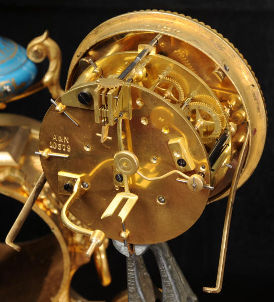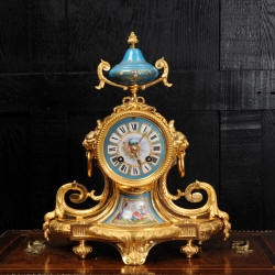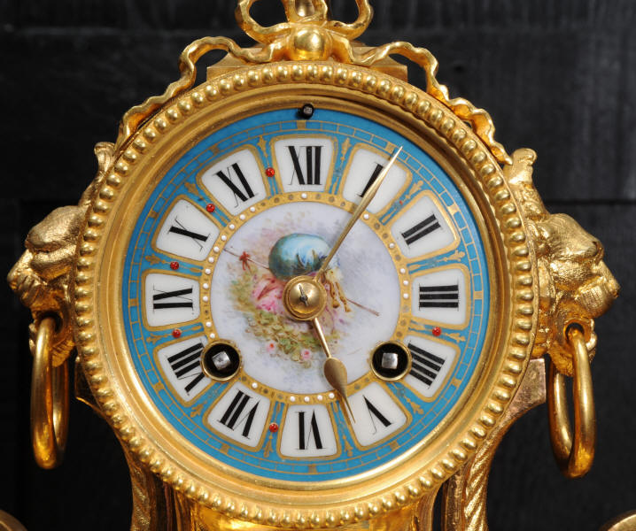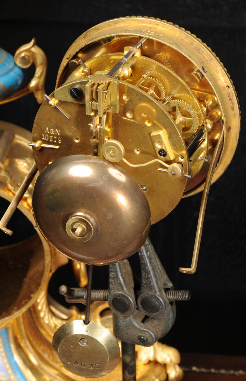The dial is also porcelain with original finely cut brass hands. To the rear of the porcelain is the artists signature (see the picture below). Please note that this type of clock does not have front or rear glazed bezels. The French movement is of high quality and is in excellent clean and running condition having been fully overhauled by our clockmaker. Pendulum is an old replacement. It runs for 8 days and strikes the hours and halves on a bell. Click the video clip below to hear the bell and watch the clock running! Condition of the case is excellent, the original gilding is beautifully clean and bright with some slight wear. The porcelain is also excellent, slight loss to the overglaze gilt decoration and some losses to some of the applied porcelain 'jewels'.