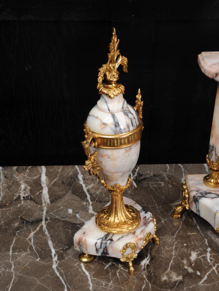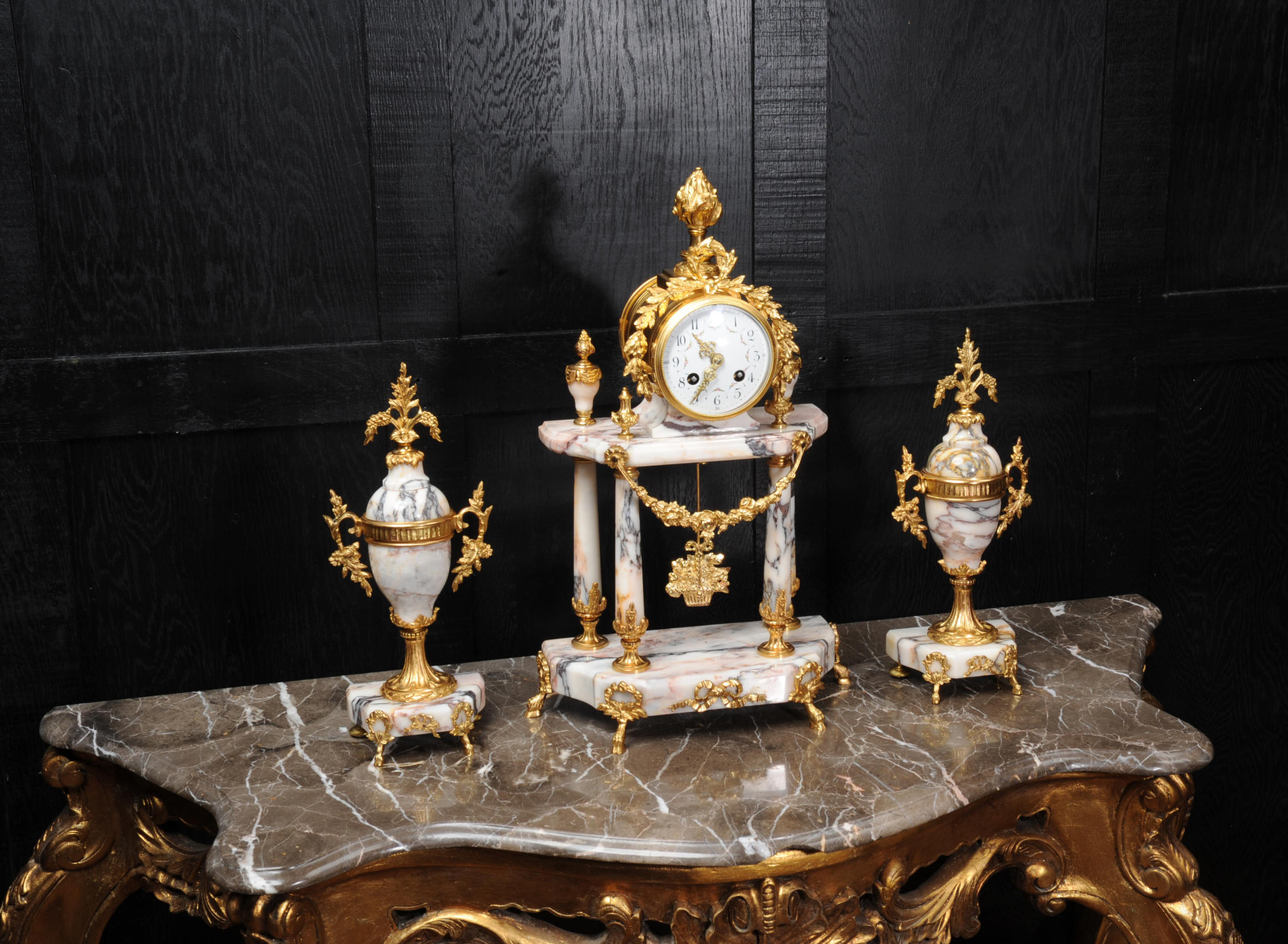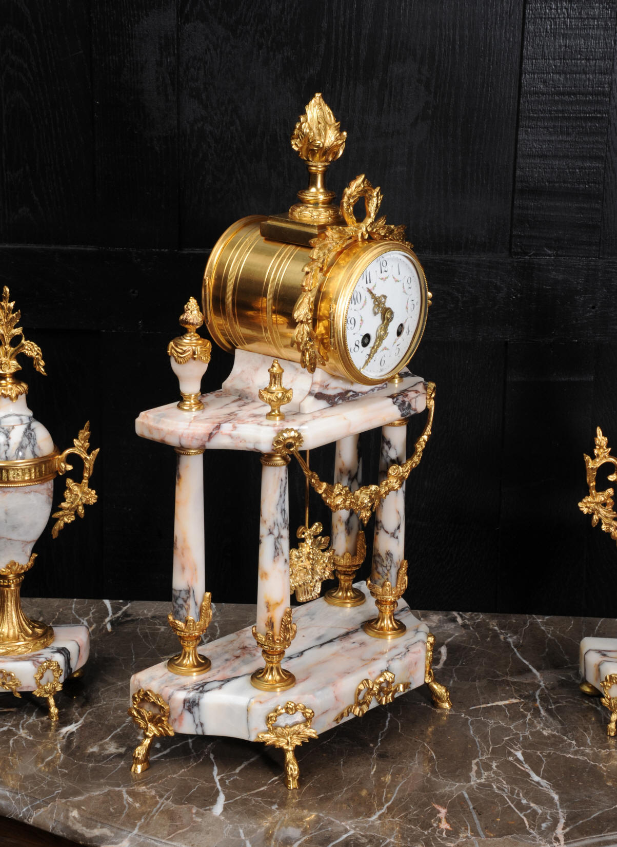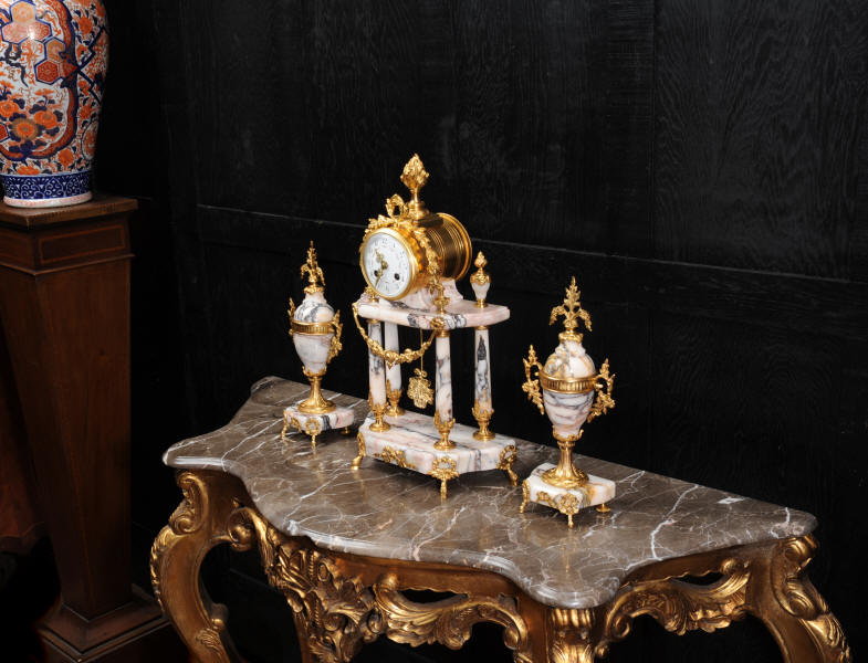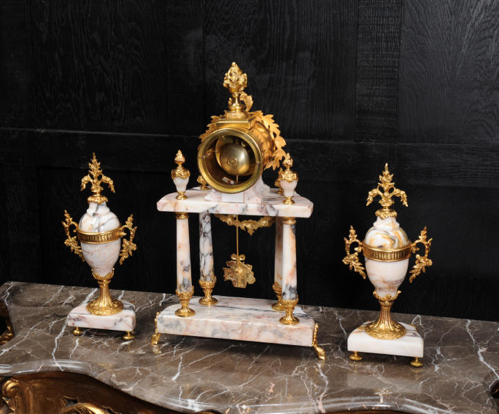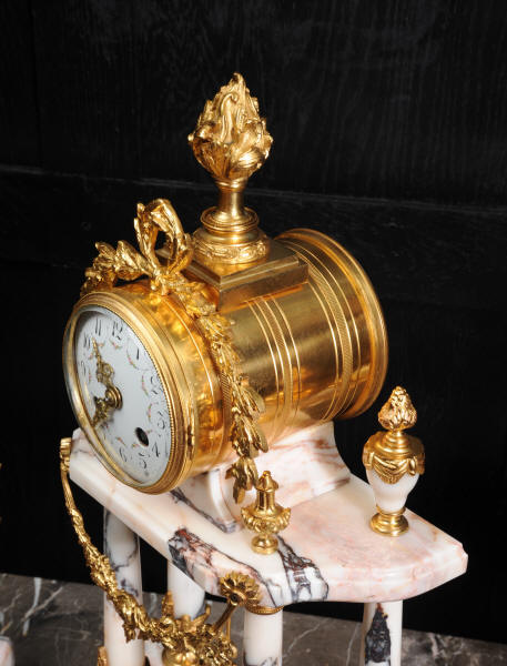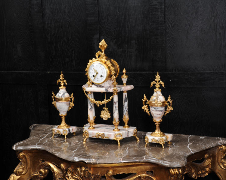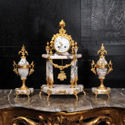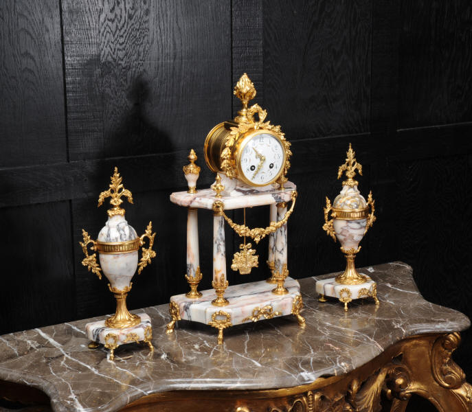 The side vases feature acanthus finials and handles mounted to the same stunning marble as the clock. The dial is enamel on copper, exquisitely decorated with floral swags delicately painted between the numbers of the dial. Hands are gilded, fretted brass. The French movement is by Samuel Marti and has the makers 'gold medal 1900' mark on the back plate. It is of high quality and is in excellent clean and running condition. It runs for 8 days and strikes the hours and halves on a bell. Click the video clip below to hear the bell and watch the clock running! Condition of the case is excellent, marble has a very good polish with no major chips or scratches, just the usual tiny nibbles to the edges. Ormolu is also in very good condition with a bright and clean finish. Dial is in very good condition with no chips or scratches, just some slight nibbles round the winding holes. One back foot of one vase has been replaced at some time.