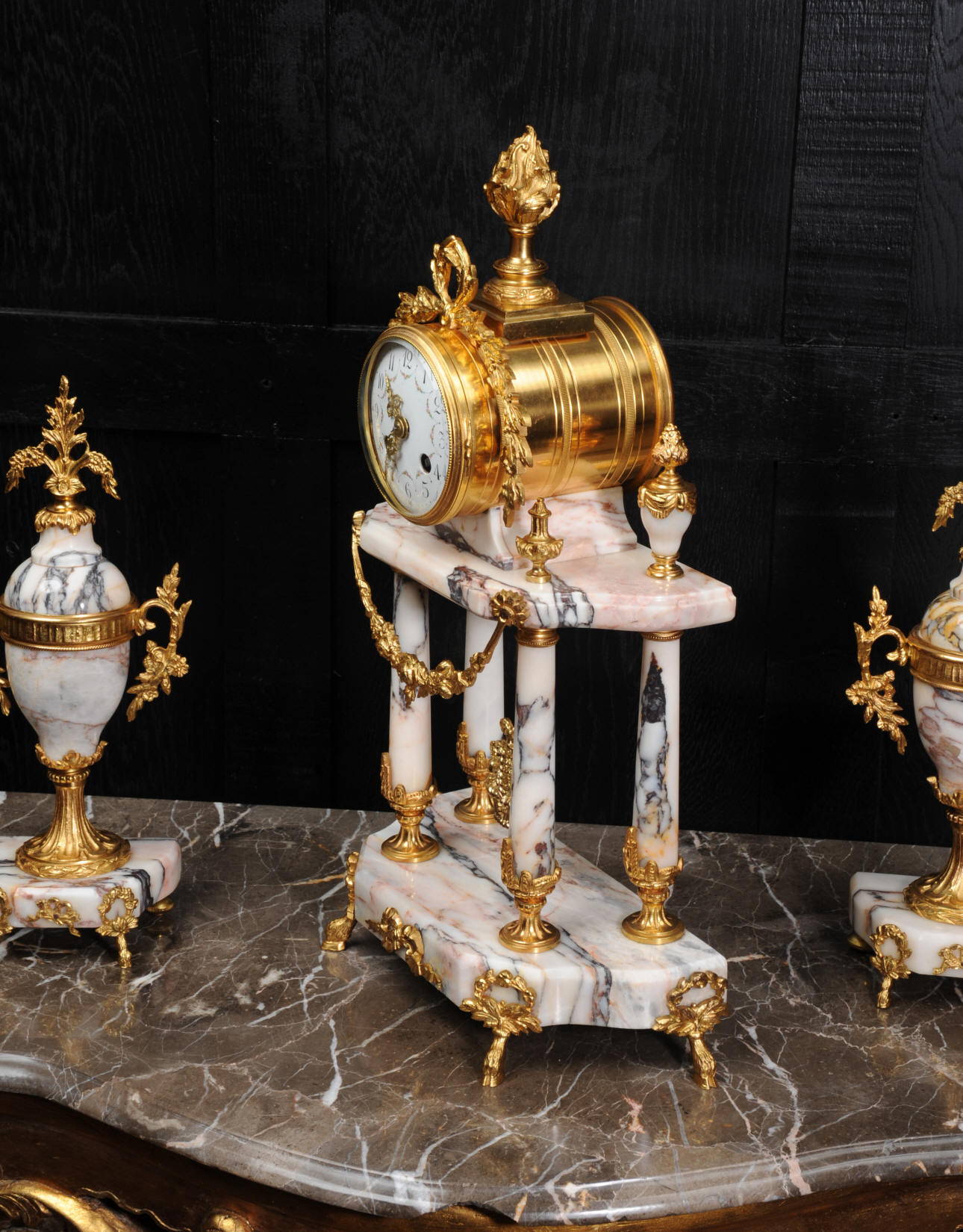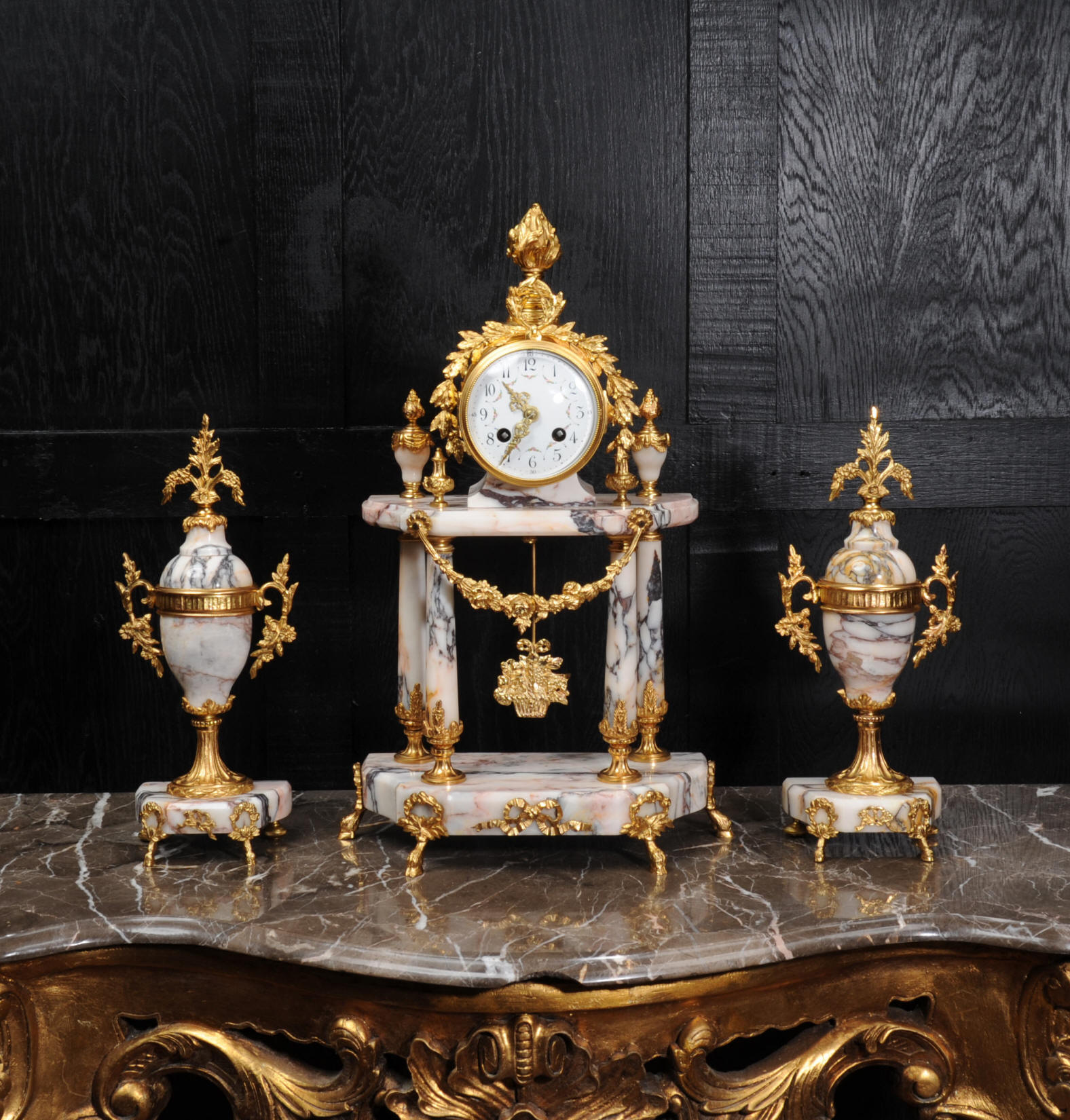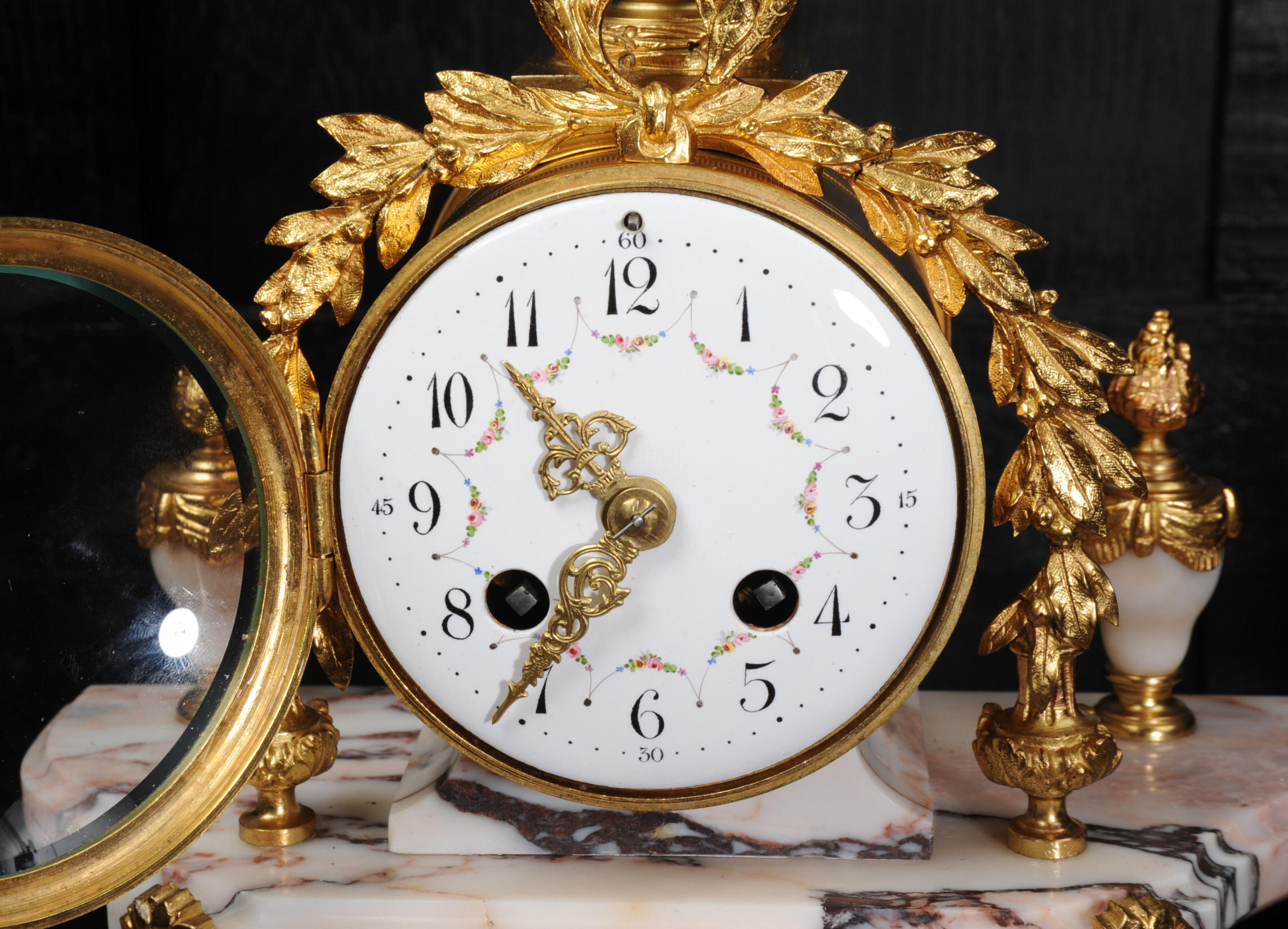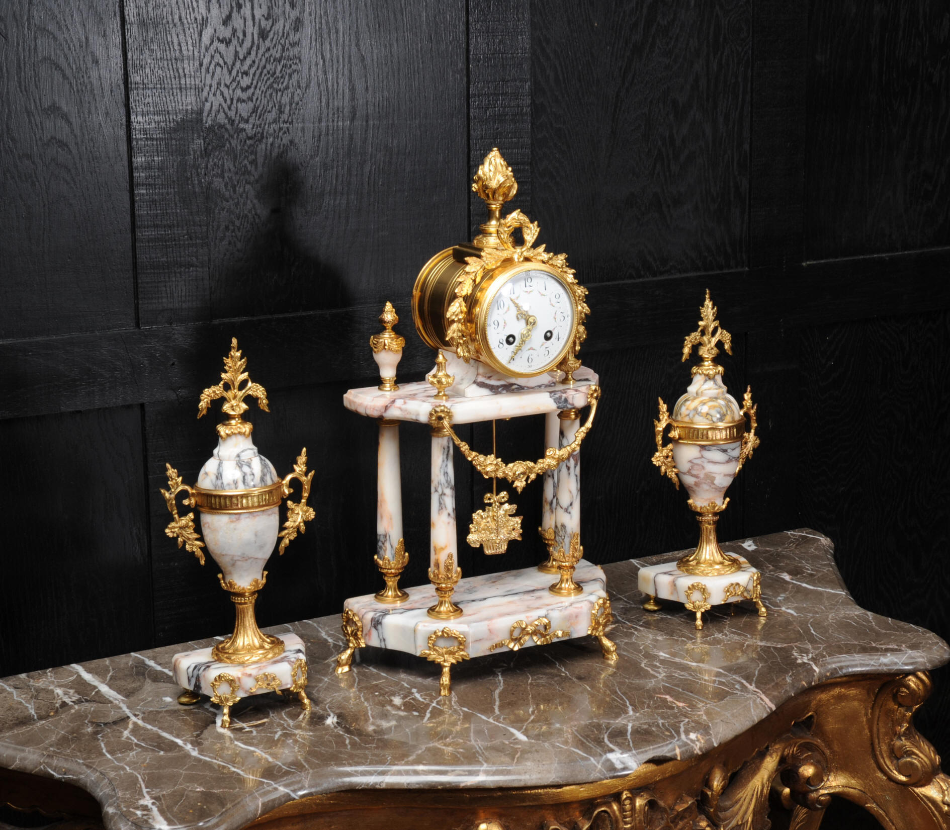 The side vases feature acanthus finials and handles mounted to the same stunning marble as the clock. The dial is enamel on copper, exquisitely decorated with floral swags delicately painted between the numbers of the dial. Hands are gilded, fretted brass. The French movement is by Samuel Marti and has the makers 'gold medal 1900' mark on the back plate. It is of high quality and is in excellent clean and running condition. It runs for 8 days and strikes the hours and halves on a bell. Click the video clip below to hear the bell and watch the clock running! Condition of the case is excellent, marble has a very good polish with no major chips or scratches, just the usual tiny nibbles to the edges. Ormolu is also in very good condition with a bright and clean finish. Dial is in very good condition with no chips or scratches, just some slight nibbles round the winding holes. One back foot of one vase has been replaced at some time.