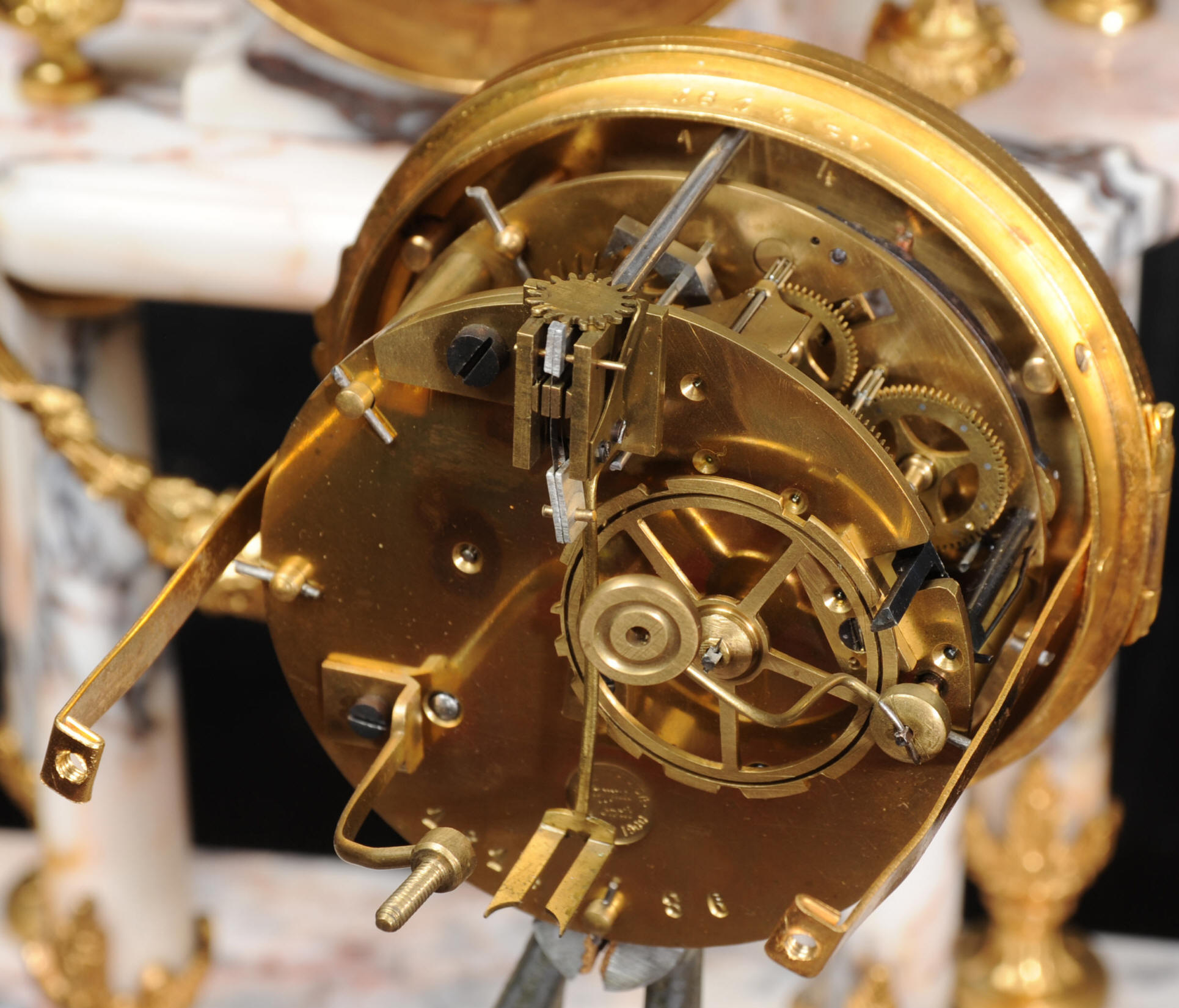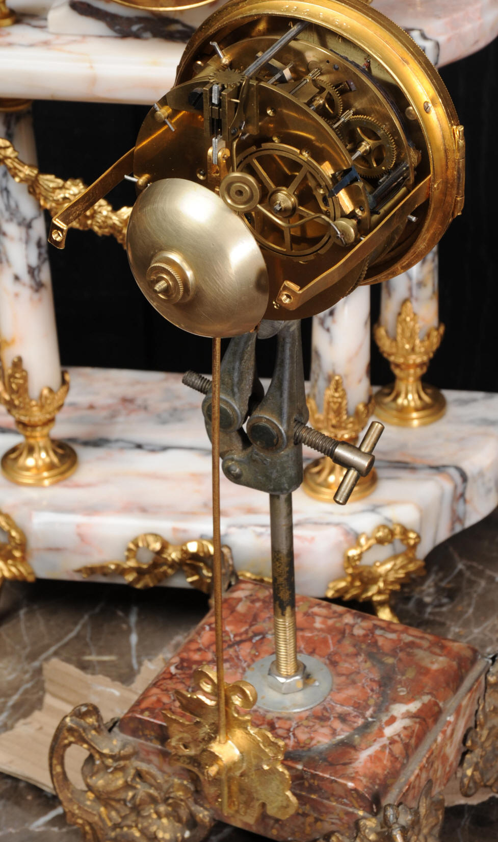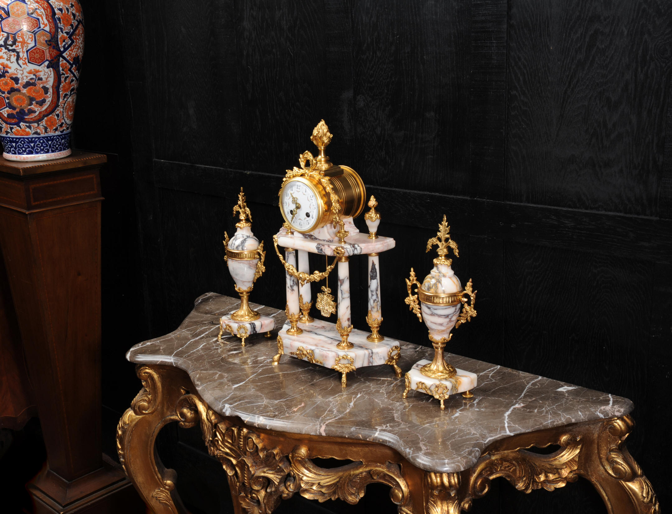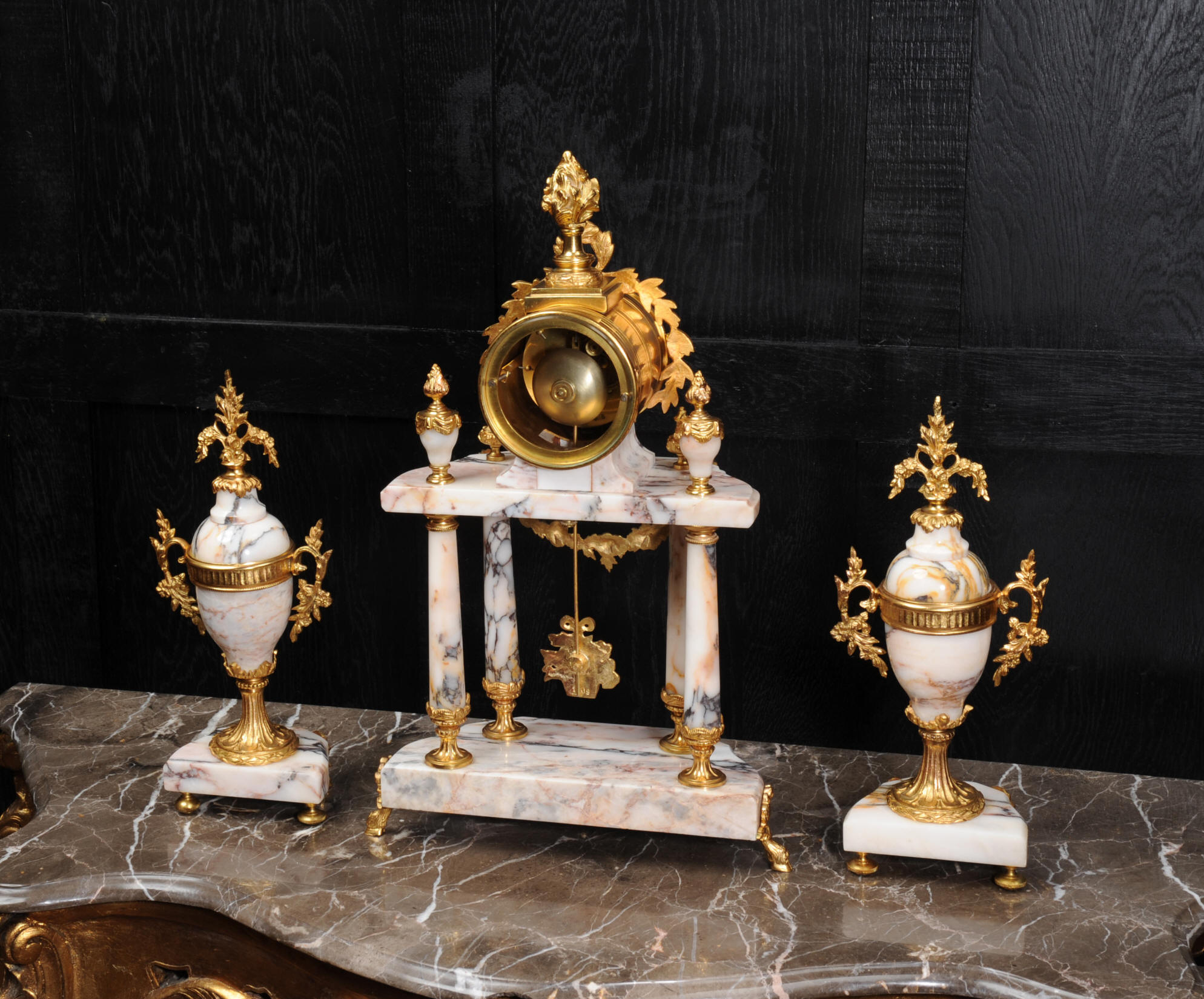 The side vases feature acanthus finials and handles mounted to the same stunning marble as the clock. The dial is enamel on copper, exquisitely decorated with floral swags delicately painted between the numbers of the dial. Hands are gilded, fretted brass. The French movement is by Samuel Marti and has the makers 'gold medal 1900' mark on the back plate. It is of high quality and is in excellent clean and running condition. It runs for 8 days and strikes the hours and halves on a bell. Click the video clip below to hear the bell and watch the clock running! Condition of the case is excellent, marble has a very good polish with no major chips or scratches, just the usual tiny nibbles to the edges. Ormolu is also in very good condition with a bright and clean finish. Dial is in very good condition with no chips or scratches, just some slight nibbles round the winding holes. One back foot of one vase has been replaced at some time.