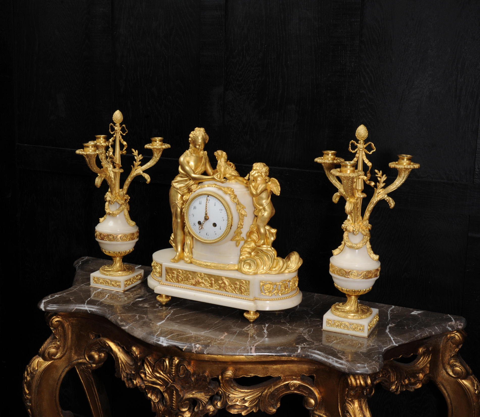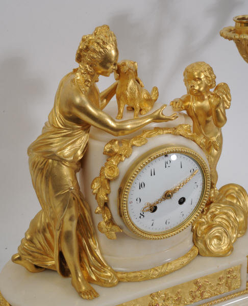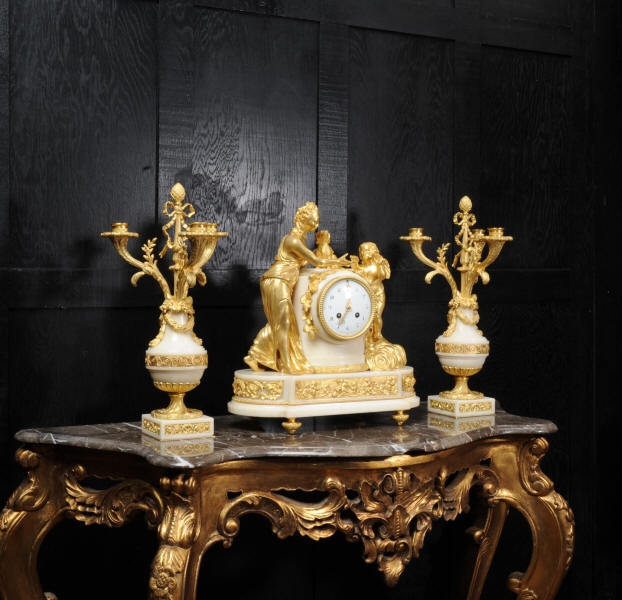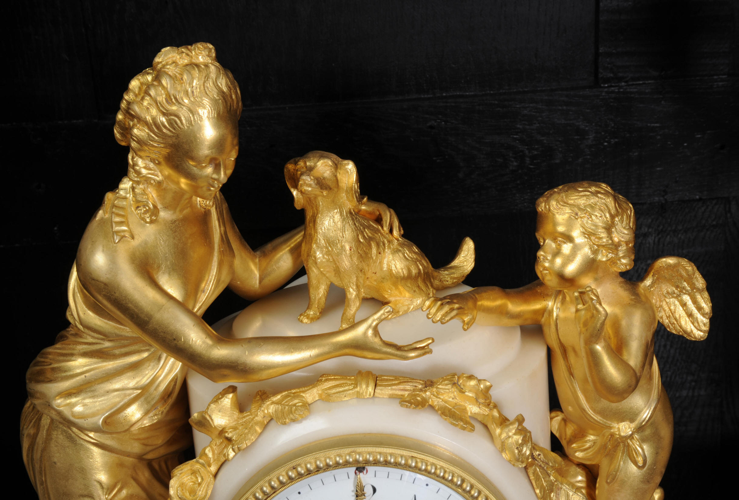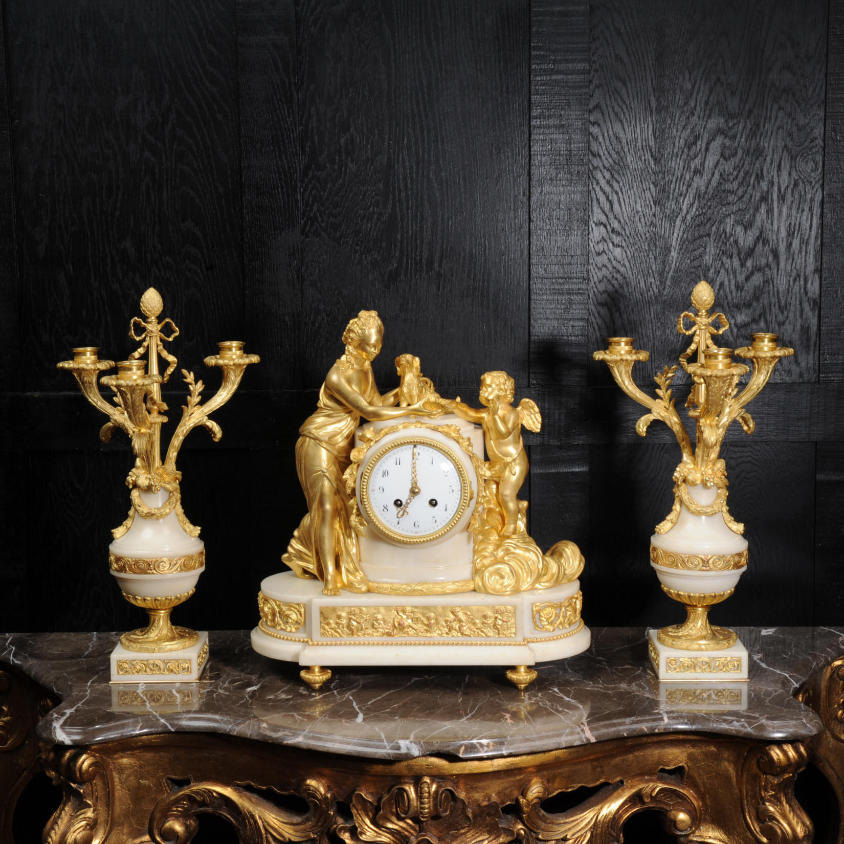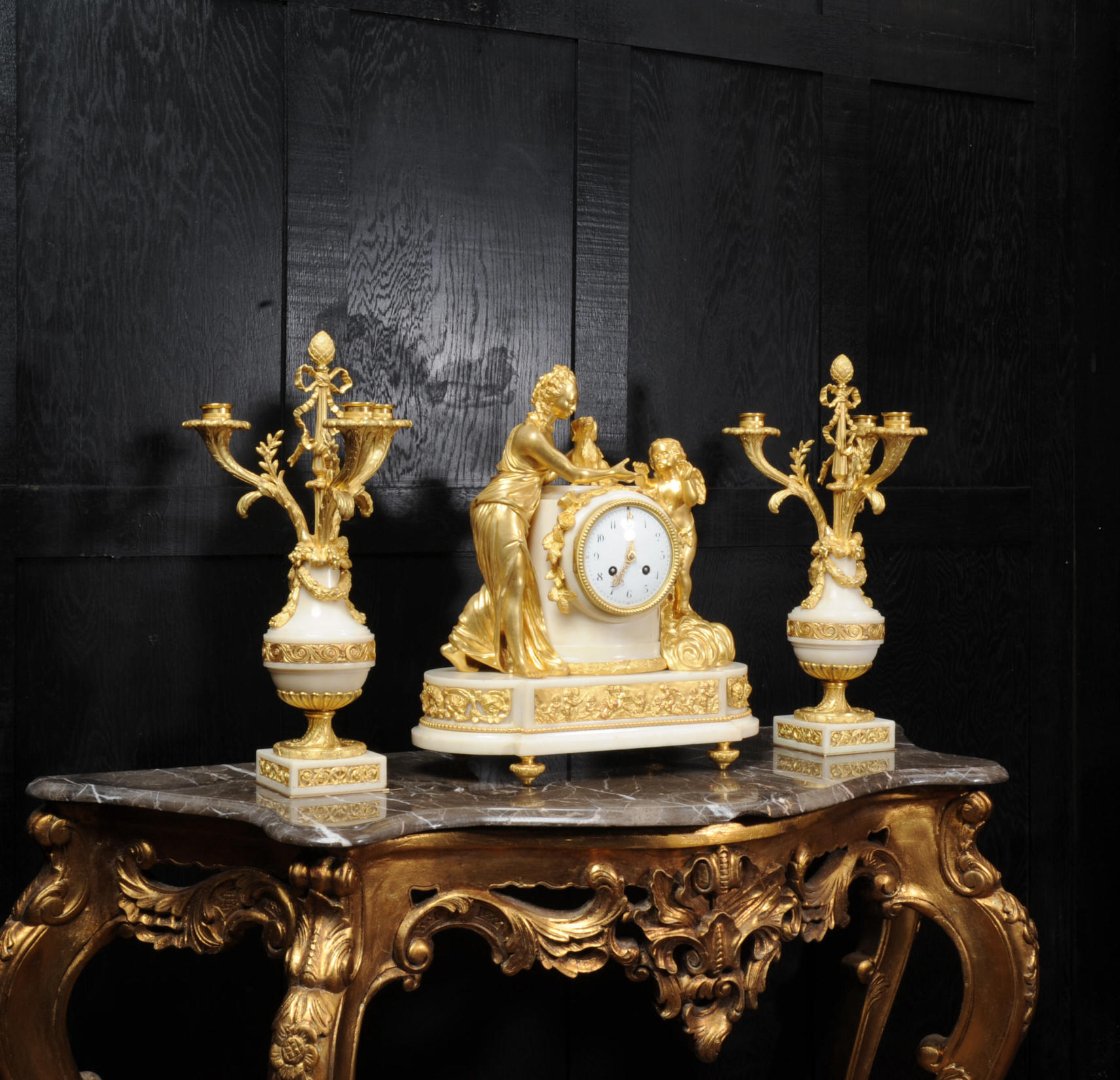 The dial is porcelain enamel on copper with beautifully cut gilt hands. The rear door is glazed to allow the movement to be seen. The French movement is by the famous maker Samuel Marti and is the company's usual high quality. It is in excellent clean and running condition having been fully overhauled by our clockmaker. Pendulum is original. It runs for 8 days and strikes the hours and halves on a bell. Click the video clip below to hear the bell and watch the clock running! A Louis XVI period clock of similar design can be seen in 'Les plus belles pendules francaises' by Giacomo and Aurelie Wannenes. Condition of the case is excellent, the original gilding is beautifully clean and some slight marks, discolouration and wear on the high spots. The dial is also in excellent condition just some small chips next to the right hand winding hole. Marble is in good condition colour has aged to a mellow cream, there are some slight nibbles to the edges and occasional marks.
