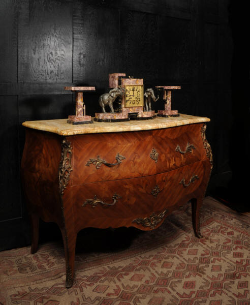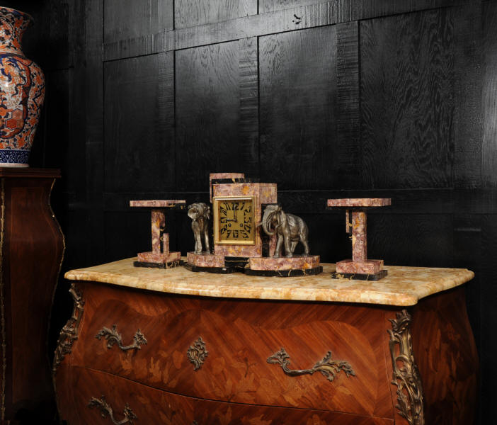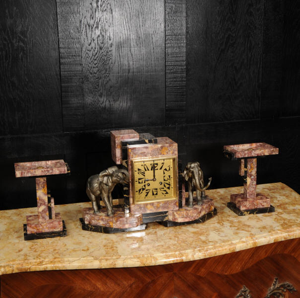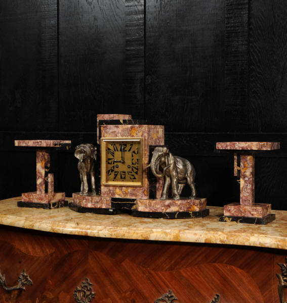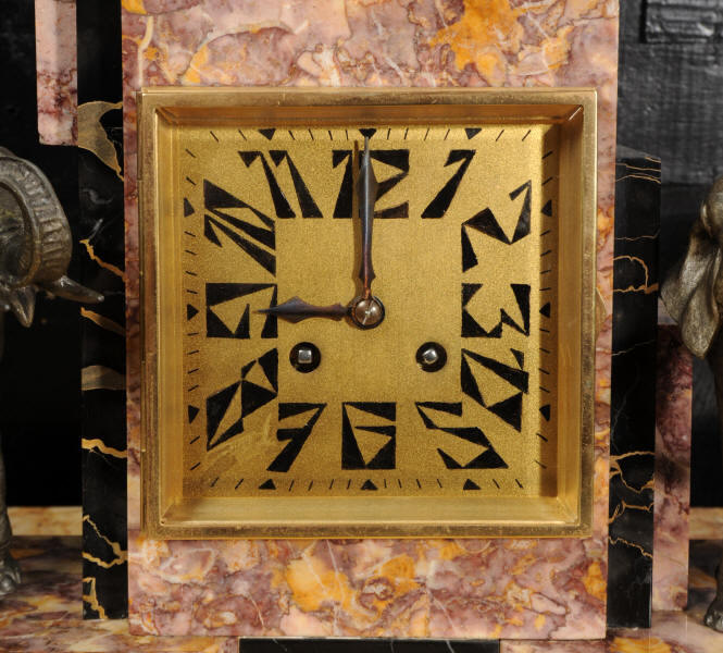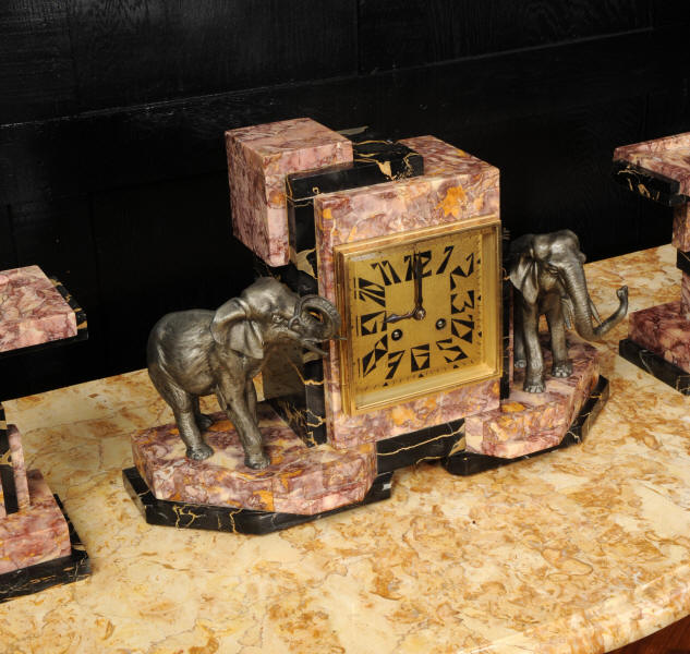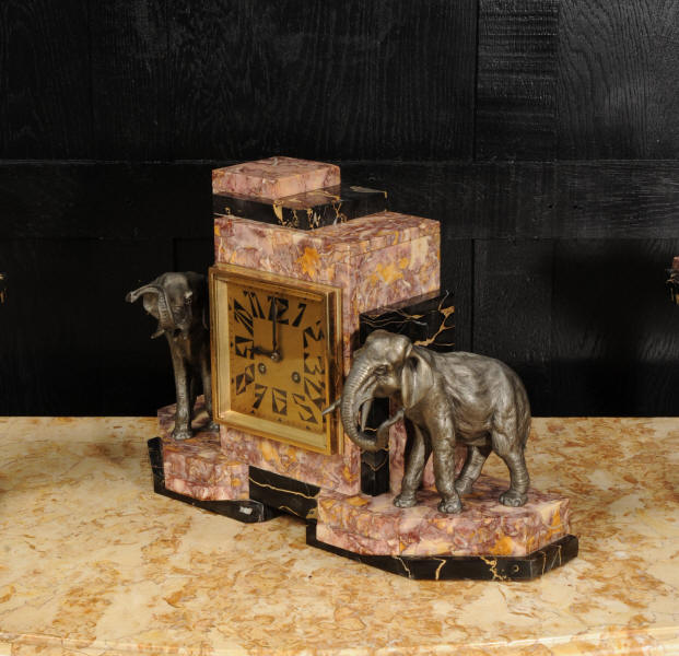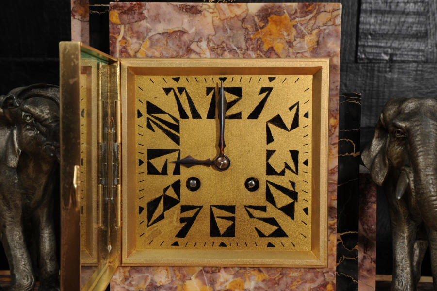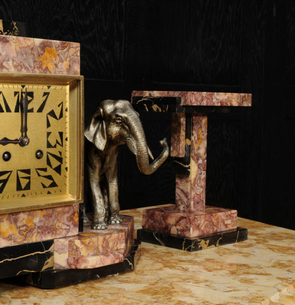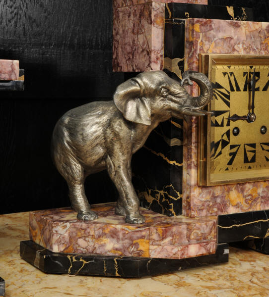 The dial is of high quality with a heavy gilded bezel with beveled glass enclosing a matted gold dial with Art Deco lettering and blued steel hands. The French movement is a traditional 'Pendule de Paris' movement with a pendulum and is of high quality. It is by the Parisian maker Silvin and is in excellent clean and running condition having been fully overhauled by our clockmaker. Pendulum is a replacement. It runs for 8 days and strikes the hours and halves on a bell. Click the video below to hear the bell and watch the clock running. Condition of the case is excellent, the marble has a lovely polish, there are some minor nibbles to the marble mostly along the bottom edges and corners. The is a small patch of lost polish to the top of one side piece. The dial is excellent with some re-touching to the lettering and some light marks, mostly between the '7' and '8'. Elephants are also very good with just some light wear to the original finish.