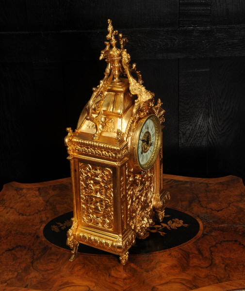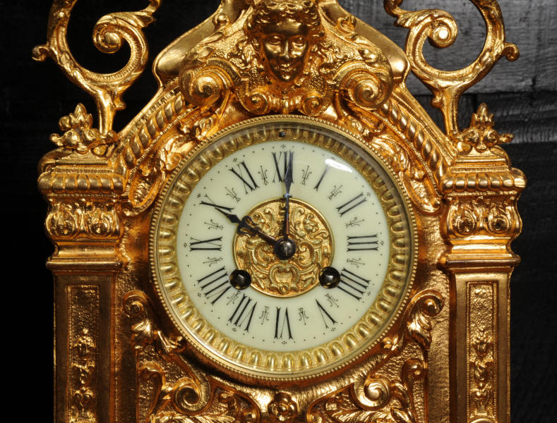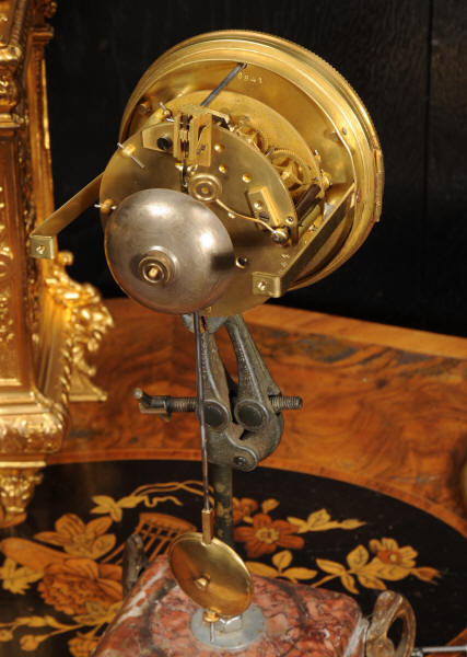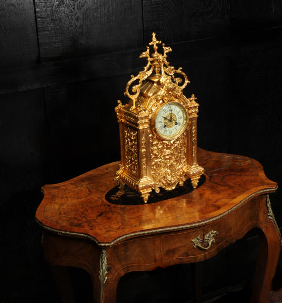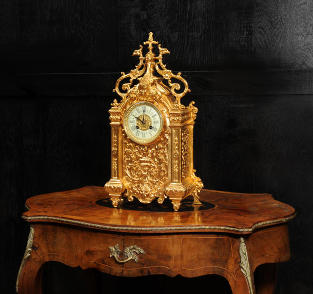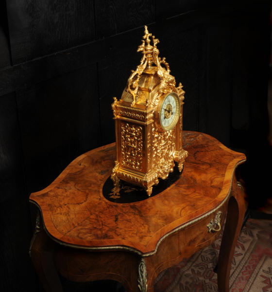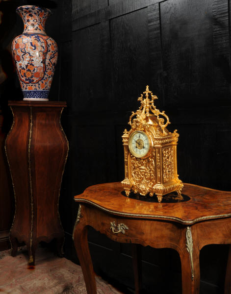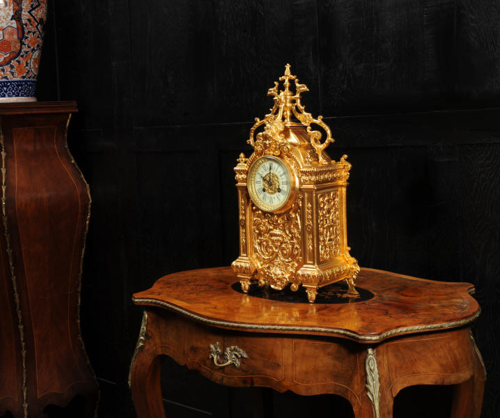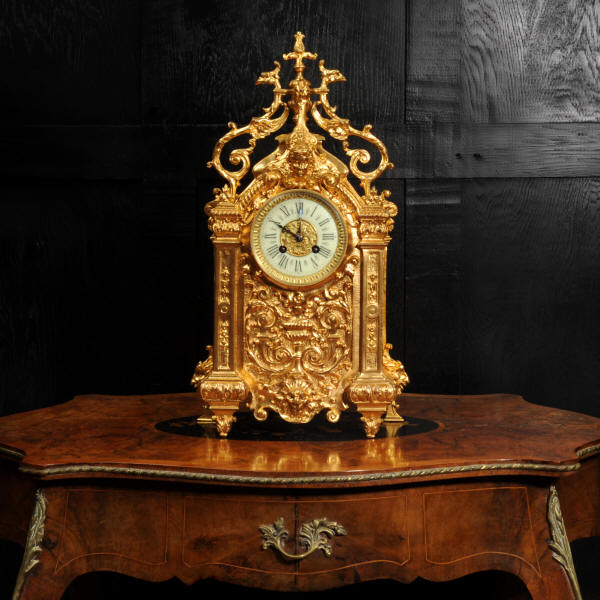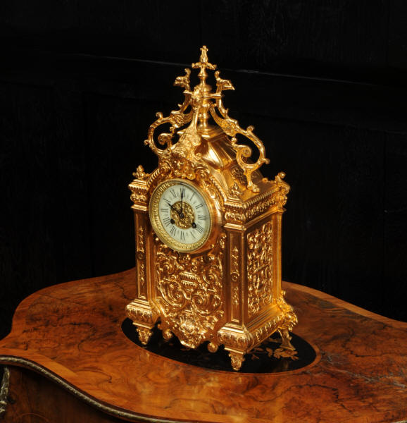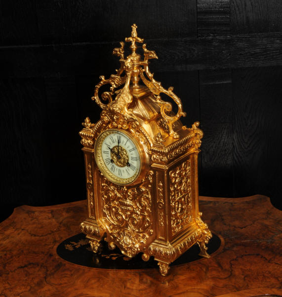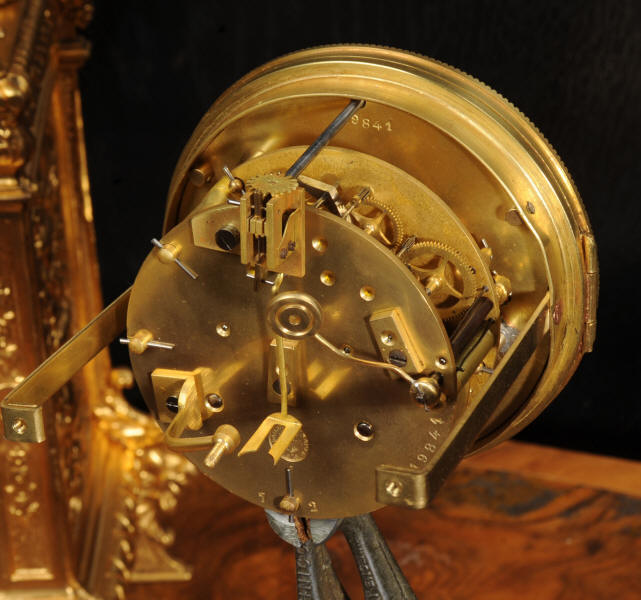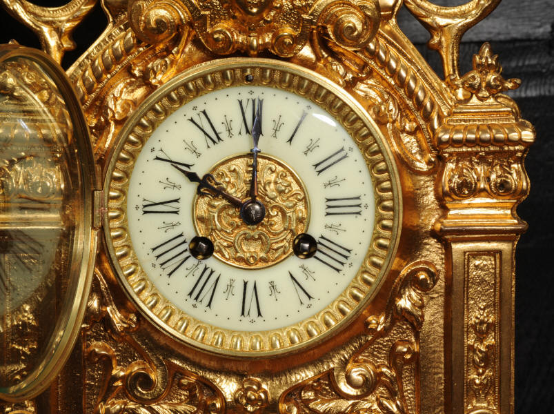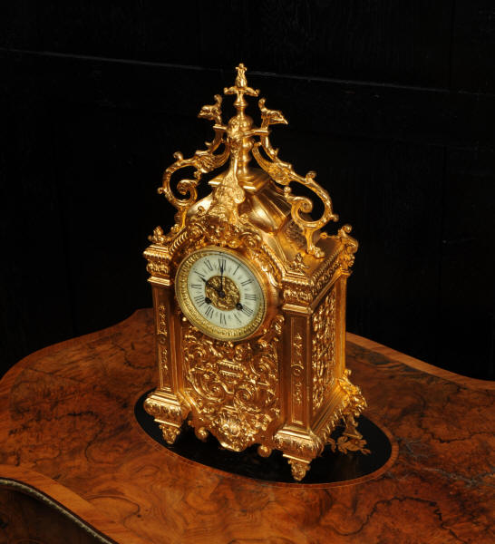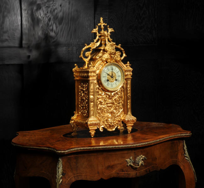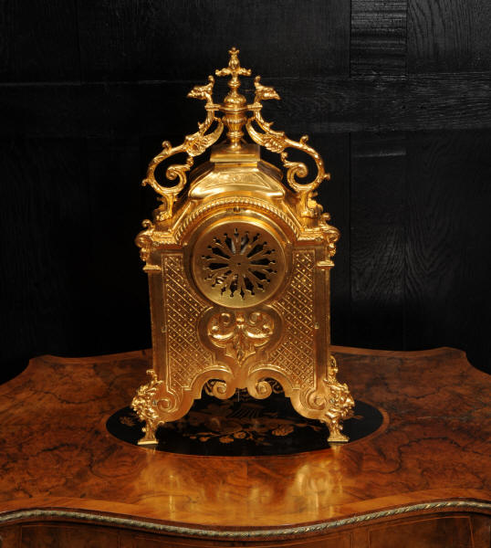 The dial porcelain enamel on copper with a bronze centre, egg and dart bezel and blued steel hands. The French movement is of high quality and is by Parrot Frères. It is in excellent clean and running condition having been fully overhauled by our clockmaker. Pendulum is an old replacement. It runs for 8 days and strikes the hours and halves on a bell. Click the video to hear the bell and watch the clock running. Condition of the case is excellent, the original gilding is beautifully clean and bright with some areas of wear, discolouration and tarnish. Dial is also excellent with just some nibbles to the winding holes. Parrot Frères is listed in Tardy, Dictionaire Des Horlogers Francais as working from 1862 to 1880.