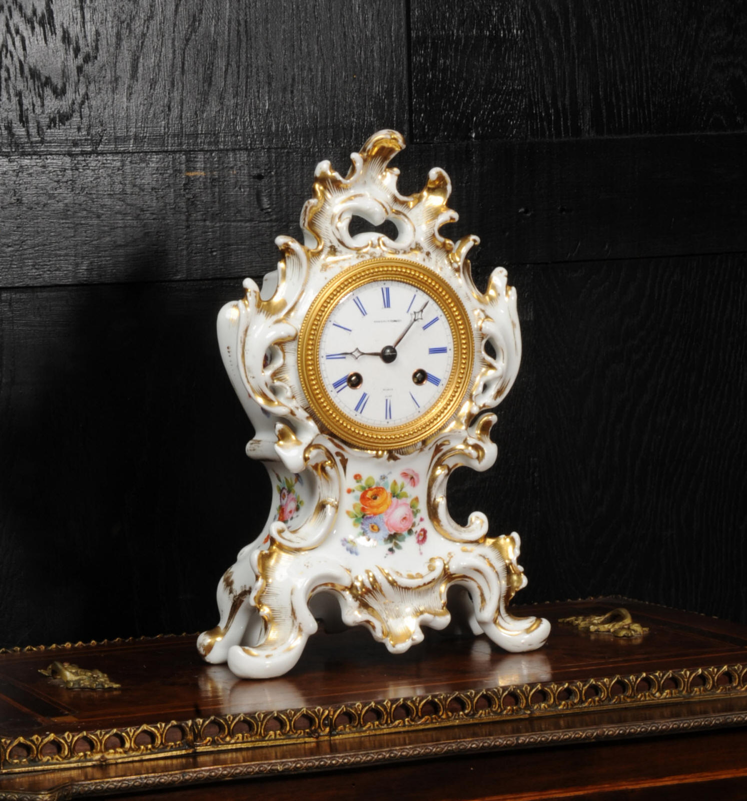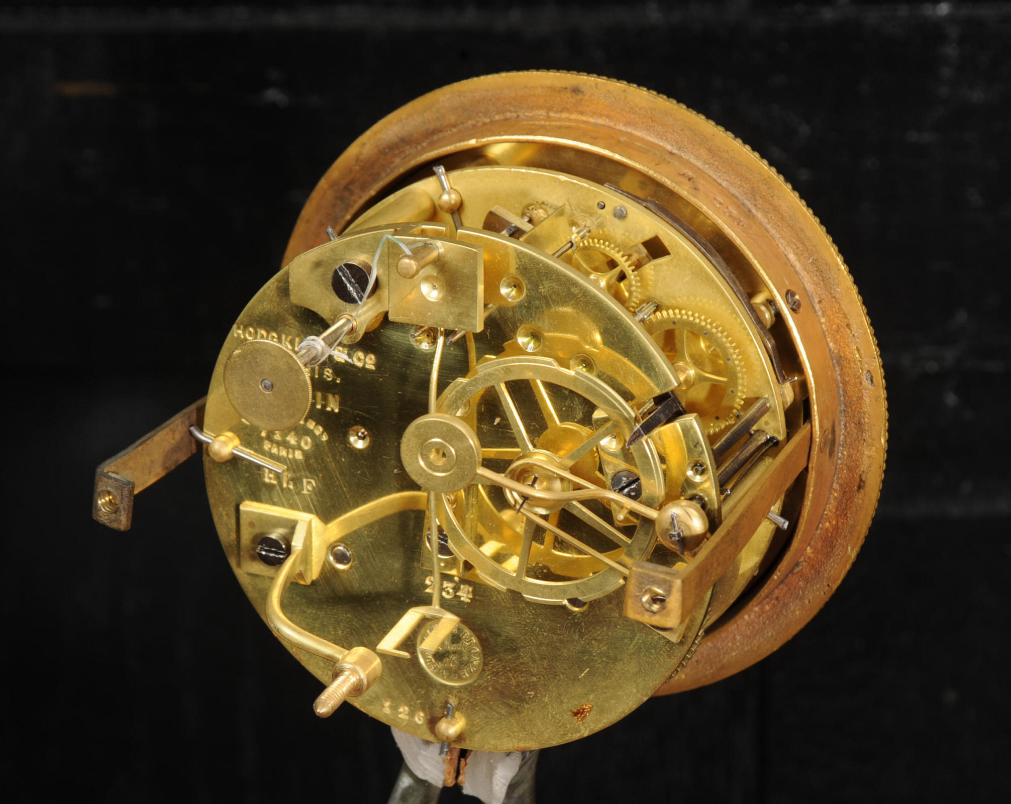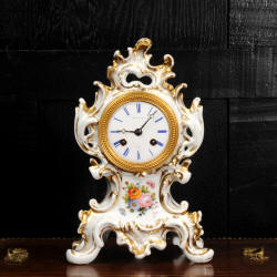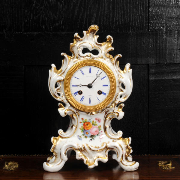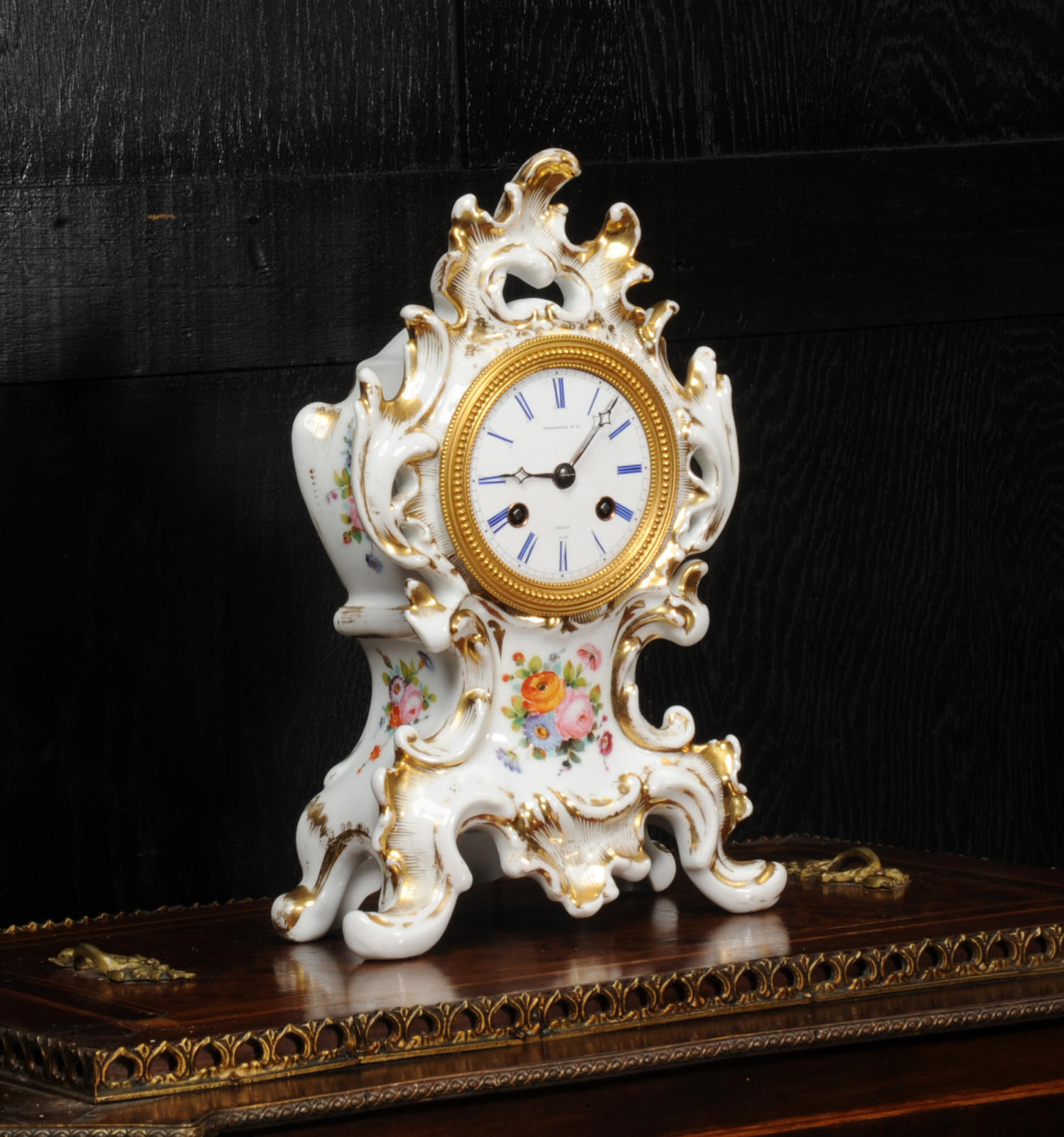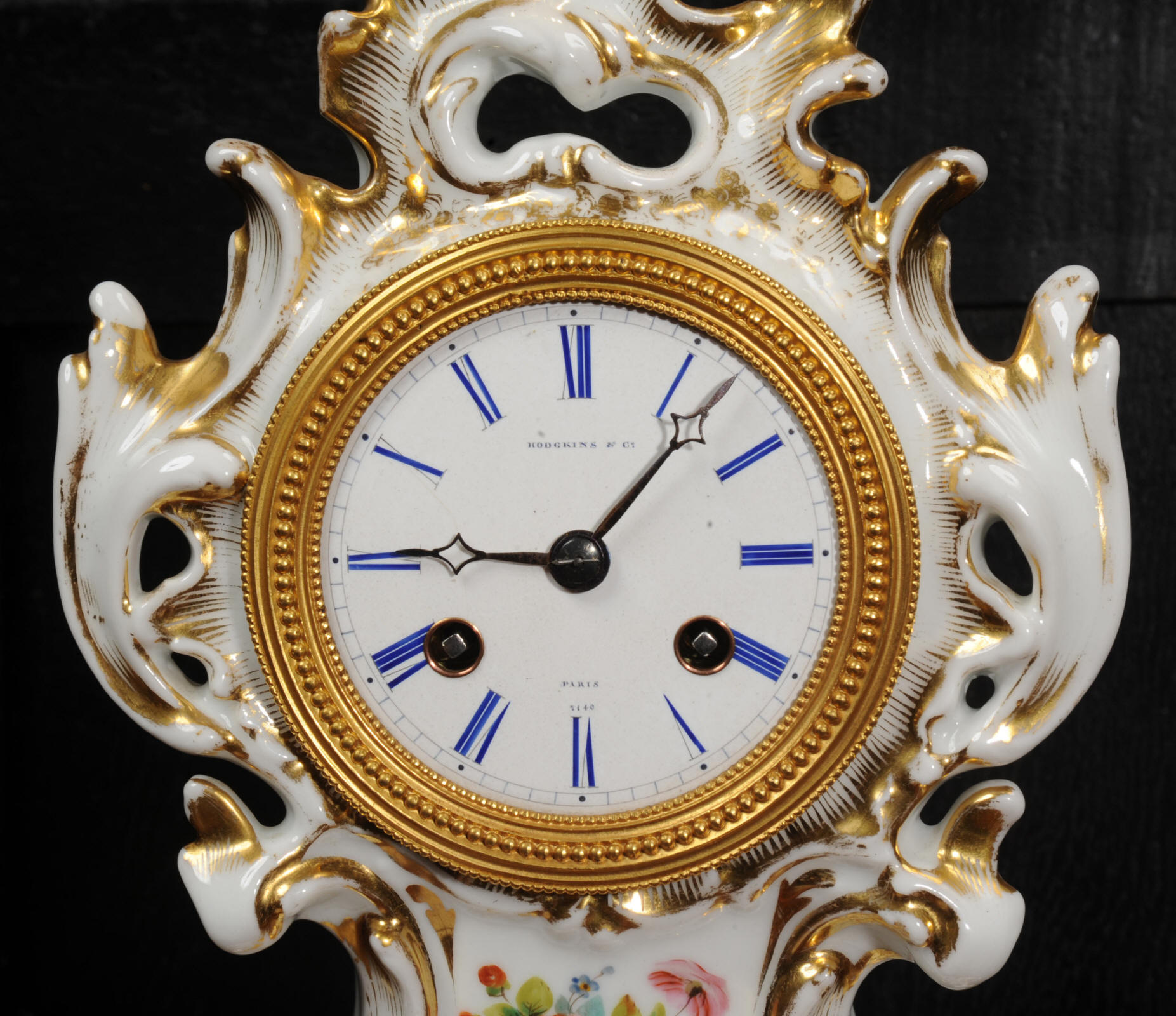 The dial is porcelain enamel on copper with blue lettering and finely cut blued steel hands. The dial is signed for the retailer Hodgkins and Co. Please note that this type of clock does not have a front or rear bezel or a rear cover. The French movement is of high quality and is by Samuel Marti. It is in excellent clean and running condition having been fully overhauled by our clockmaker. Pendulum is original. It runs for 8 days and strikes the hours and halves on a bell. Click the video to hear the bell and watch the clock running. Condition of the case is excellent with no significant damage. There is some wear to the over-glaze gilt decoration. Dial is excellent with just a faint hairline. The clock is marked on the backplate for the clockmaker Samuel Marti and the retailer Hodgkins and Co. Hodgkins and Co are listed as working in 1846 in Watch and Clockmakers of the world by Brian Loomes.