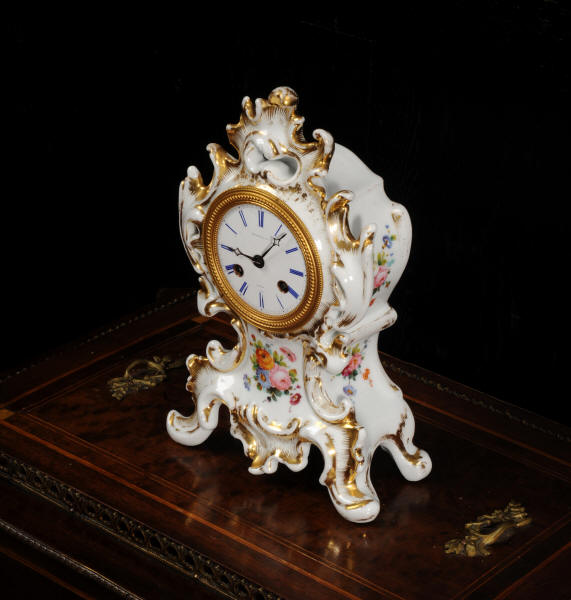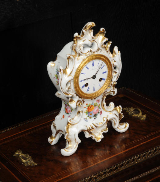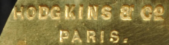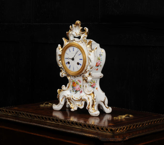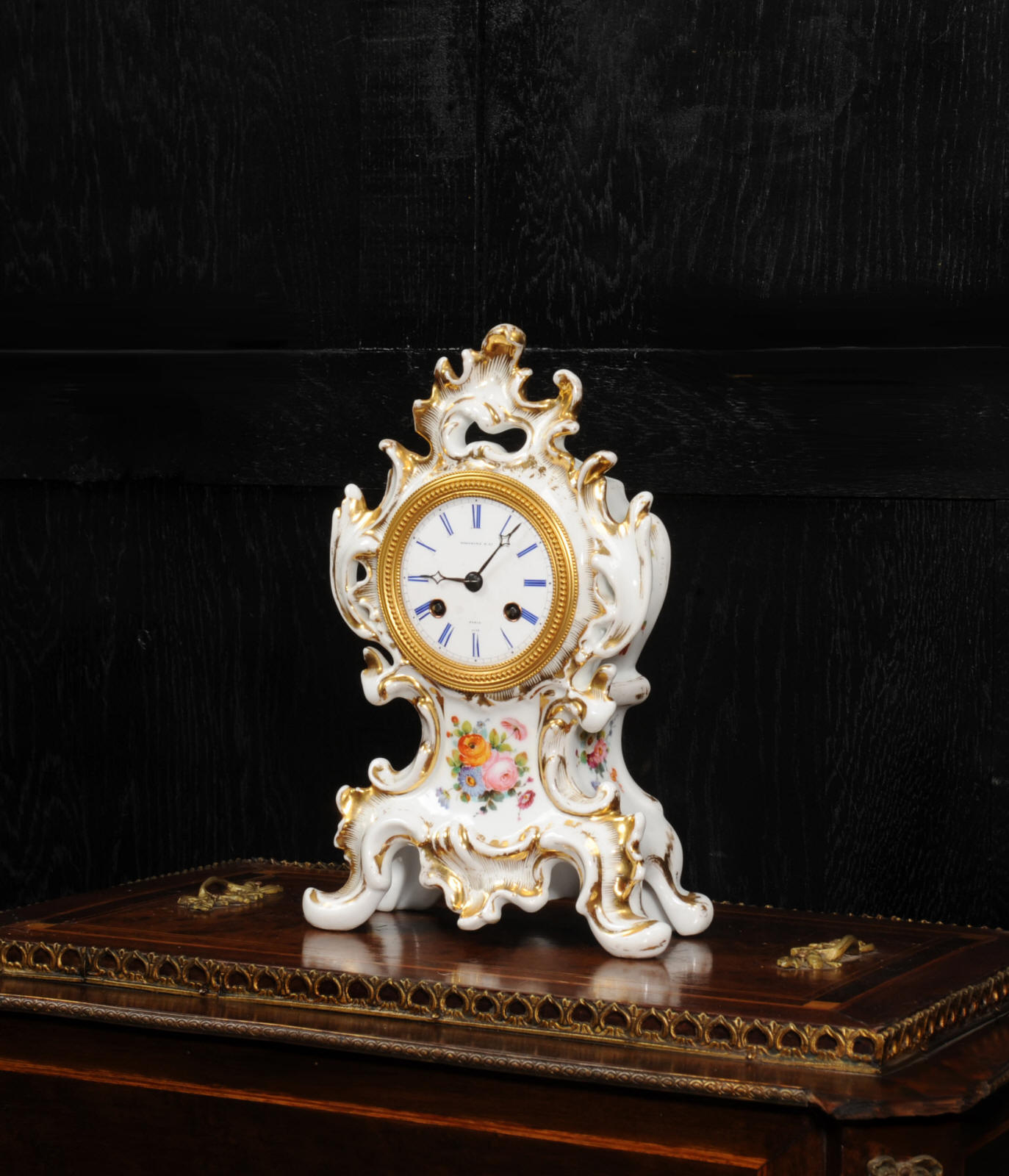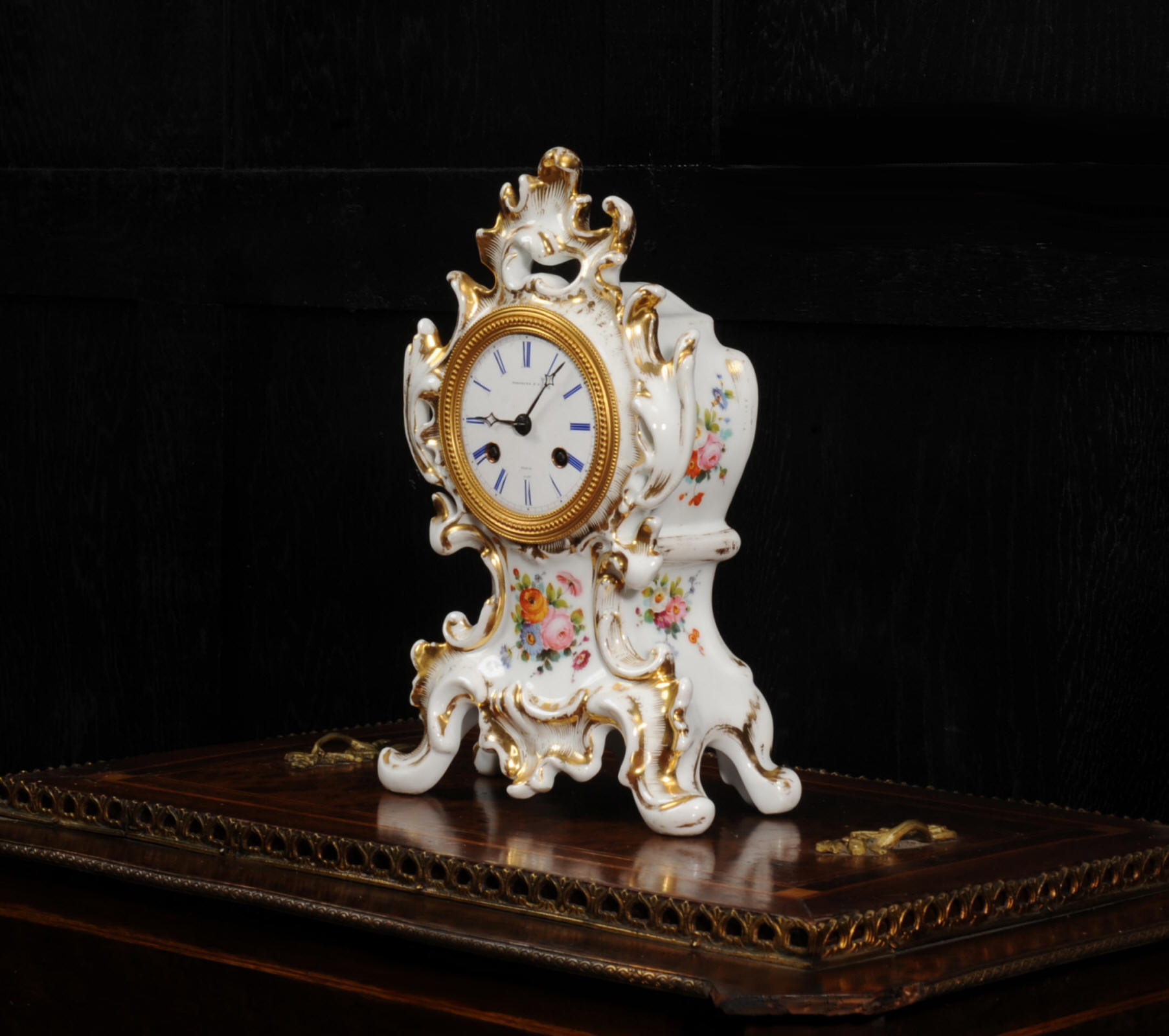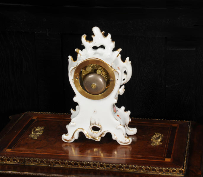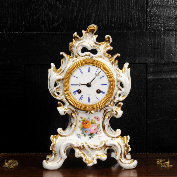 The dial is porcelain enamel on copper with blue lettering and finely cut blued steel hands. The dial is signed for the retailer Hodgkins and Co. Please note that this type of clock does not have a front or rear bezel or a rear cover. The French movement is of high quality and is by Samuel Marti. It is in excellent clean and running condition having been fully overhauled by our clockmaker. Pendulum is original. It runs for 8 days and strikes the hours and halves on a bell. Click the video to hear the bell and watch the clock running. Condition of the case is excellent with no significant damage. There is some wear to the over-glaze gilt decoration. Dial is excellent with just a faint hairline. The clock is marked on the backplate for the clockmaker Samuel Marti and the retailer Hodgkins and Co. Hodgkins and Co are listed as working in 1846 in Watch and Clockmakers of the world by Brian Loomes.