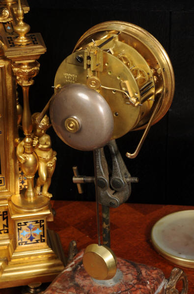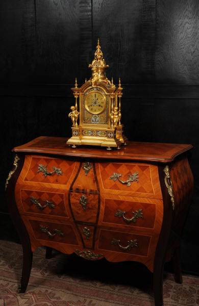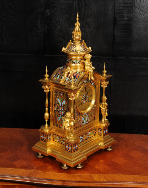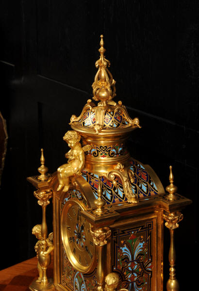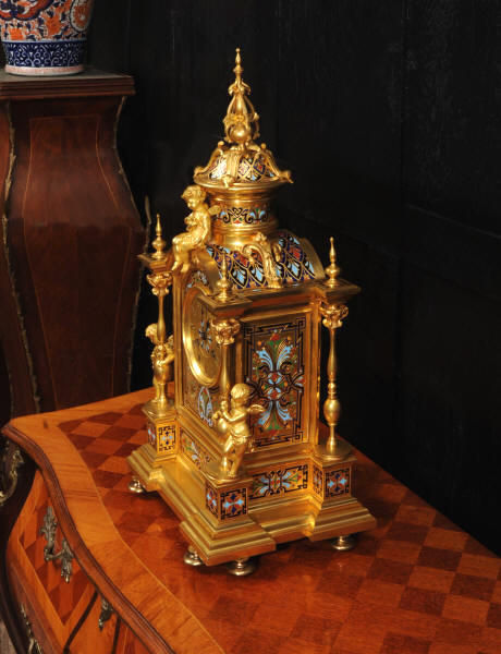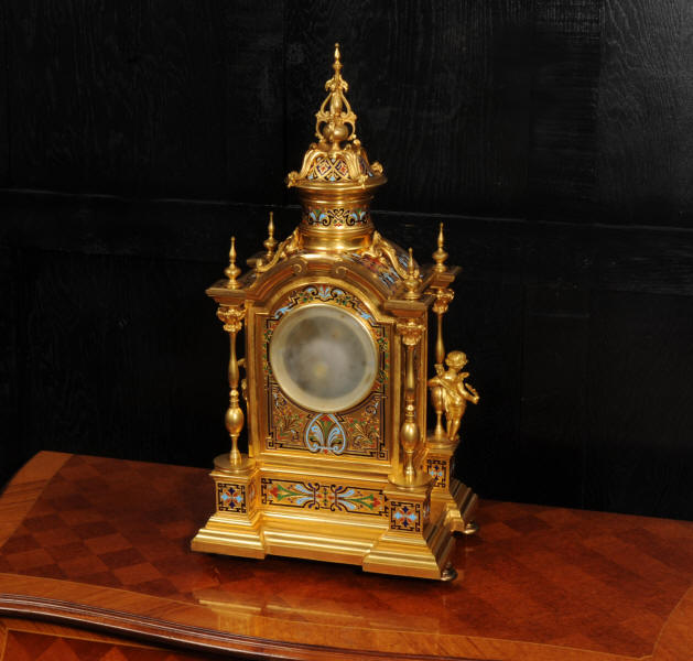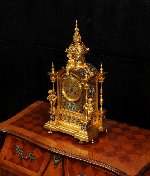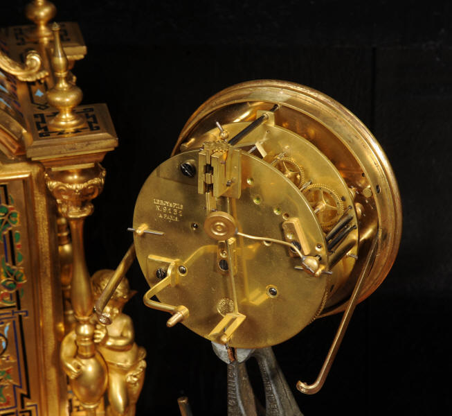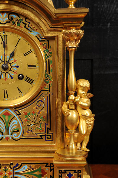 To the sides are charming figures of cherubs clutching the baluster turned pillars. A third cherub is seated above the dial. The dial is also gilded bronze with champlevé enamel and is complete with original finely blued steel hands. The clock is decorated in the round with a frosted glass rear door. Please note that this type of clock does not have a glazed bezel to cover the dial. The French movement is of high quality and is by Vincenti et Cie. It is in excellent clean and running condition having been fully overhauled by our clockmaker. Pendulum is original. It runs for 8 days and strikes the hours and halves on a bell. Click the video below to hear the bell and watch the clock running. Condition of the case is excellent, the original gilding is particularly good with only minor wear where the clock has been handled and some light marks and discolouration. The rear most bun feet are missing however the clock sits very well without them. Rear frosted glass has some marks. Enamel is very good. Established by Basile Charles Le Roy in 1785, the firm of Le Roy et Fils became a well-established and renowned clockmaker. Basile had been Napoleon's master clockmaker, and along with his son Charles-Louis, he worked for Princess Pauline and the Duke de Bourbon as well. Examples of the firm's work are included in all of the major world collections. The firm was located at the Palais Royale from 1785, the year of its founding, through the death of Charles-Louis at Versailles in 1865. A shop was opened in London, in 1854 at 296 Regent Street under the name of Le Roy and Son. The name was later changed to Le Roy and Fils. A second shop was opened in London in 1885 at 57 New Bond Street. Le Roy and Fils was a British Royal Warrant holder to Queen Victoria. Champlevé enamelling, is similar to cloisonné in that the enamel is applied to discrete cells separated by metal. However, in champlevé, cells or troughs are cast into or cut away from the metal base, leaving a raised metal line between the cells which forms the outline of a design. The cells are then filled with molten or powdered glass and fired.
