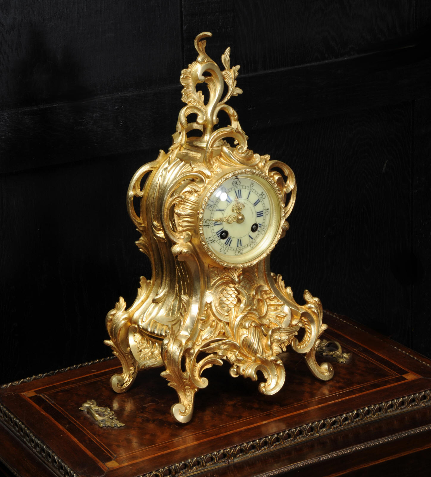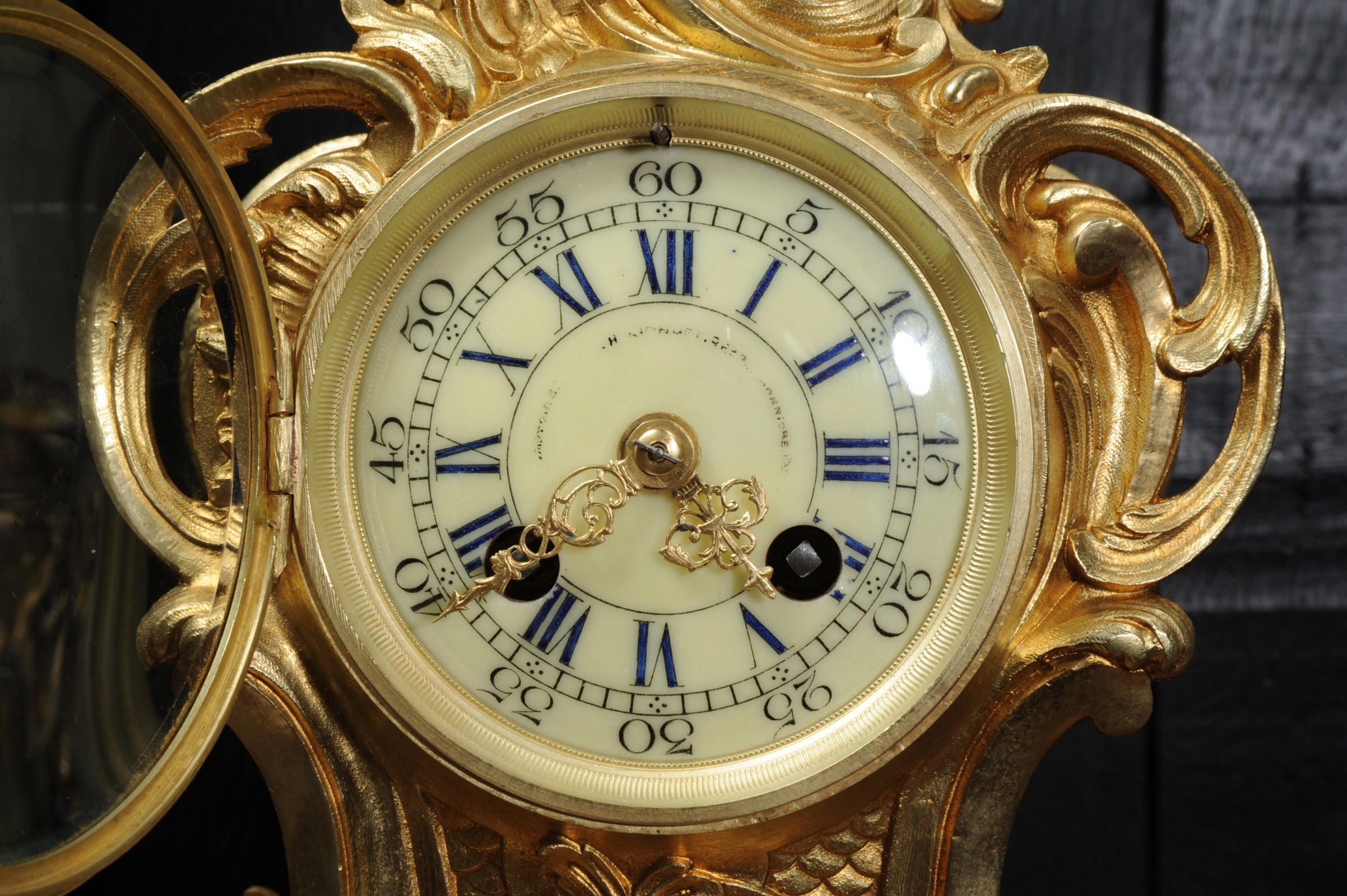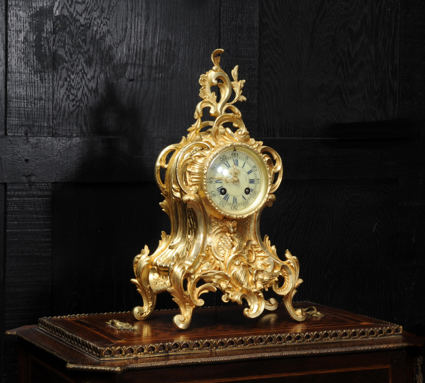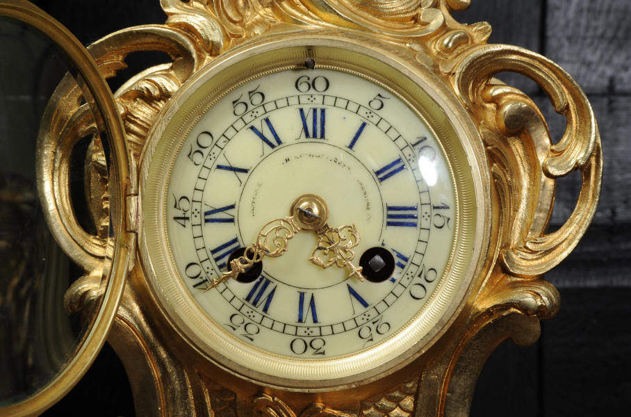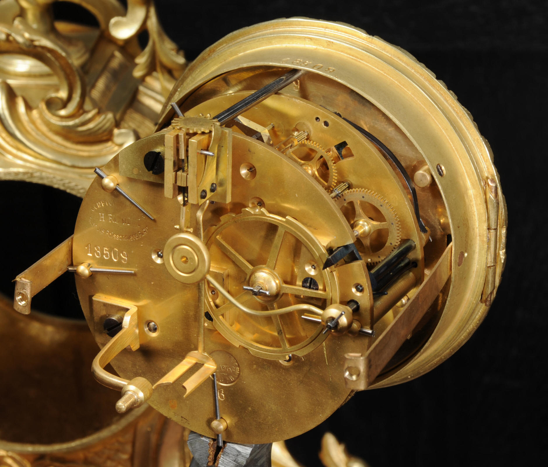 The dial is the sought after cream porcelain enamel with blue lettering and is complete with original finely fretted gilt hands and Rococo bezel. The French movement is by Louis Japy and is in excellent clean and running condition having been fully overhauled by our clockmaker. Pendulum is original. It runs for 8 days and strikes the hours and halves on a bell. Click the video clip below to hear the bell and watch the clock running. According to an advertisement in the 1896 issue of Didot-Bottin (directory and almanac for commerce, industry, judicial and civil services) the Maison H. Riondet, Comptoir General, a retailer, was one of ‘the most well-stocked shops for everything from: jewellery, bronze art objects, timepieces & furniture, precious stones, marble sculptures, silverware, ceiling lights & white metal, chandeliers, cutlery, lamps & diamond-facetted fireplaces, travel clocks, “fine-stone” pearls.’ It boasted ‘factory prices’ and ‘retail stores in Paris with no other branches, representatives, or offices in any other city, French or foreign.’ Maison H. Riondet was located at 9, boulevard Poissonnière and 45, rue du Sentier in Paris. The 1911 Annuaire de la Curiosité et des Beaux-Arts, a directory of curiosities and fine art, shows that the retailer was a member of the bronze manufacturing trade union. Intersecting the grand Parisian boulevards, the Comptoir Général was located on the royal route, which under the Second Empire already connected the Madeleine to the Gymnase Theatre. The retailer figured among the great Parisian stores of the late nineteenth-century, providing “free entry” to customers. Strolling from the Place de la Madeleine to the Café des Variétés on Boulevard Montmartre, elegant crowds stopped to admire the store’s display windows, stocked in an abundant and spectacular manner. The Comptoir Général was contemporary with other great department stores of the period, like the Grands Magasins du Louvre, Bon Marché, and La Samaritaine, and attested to the new forms of commerce developing during the second half of the nineteenth century. These stores became showcases; advertising in newspapers, they offered the consumer a diverse and varied product, displayed in a way that was elaborate and luxurious.