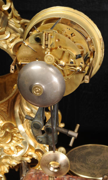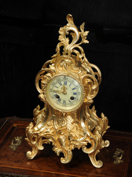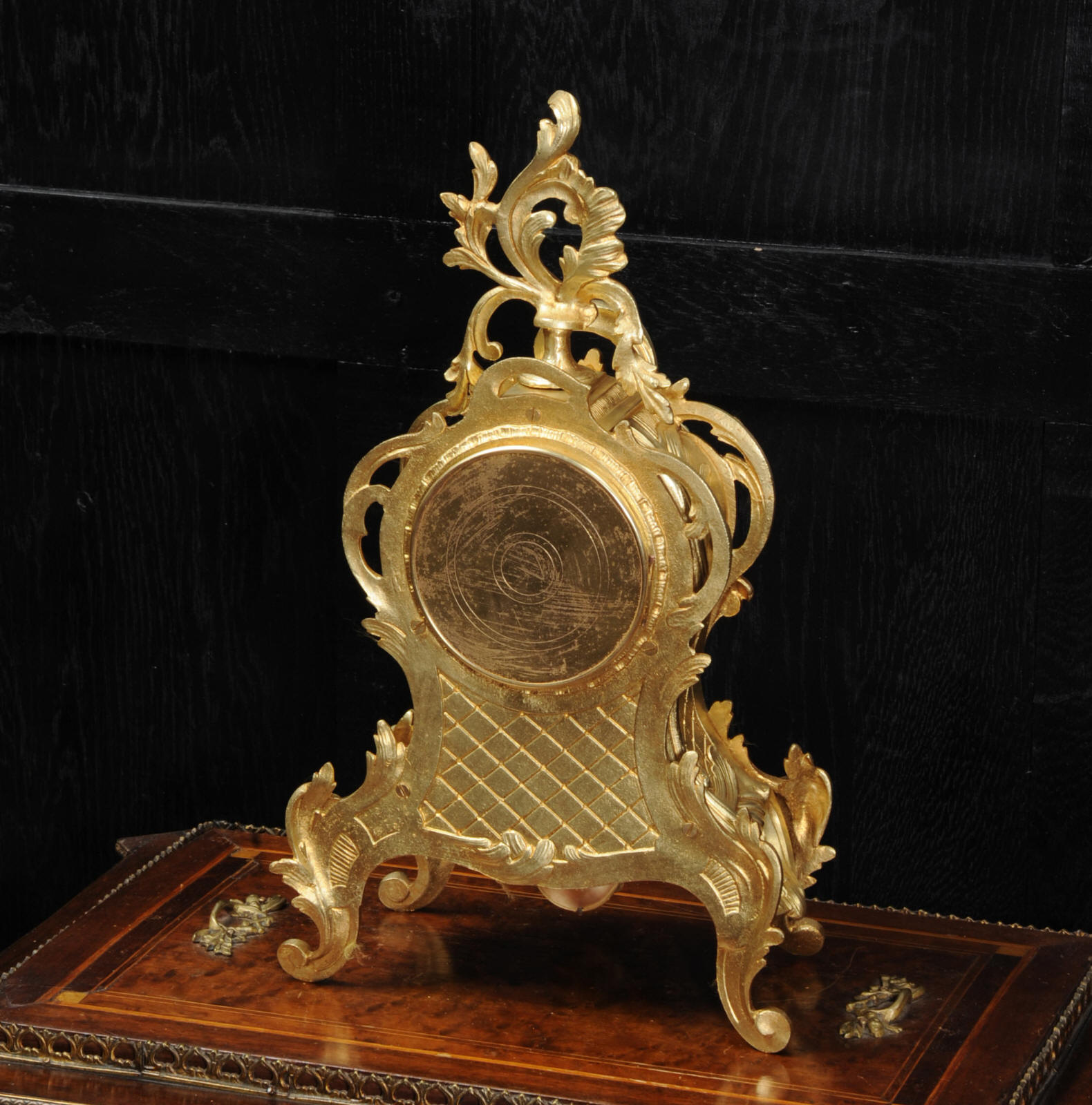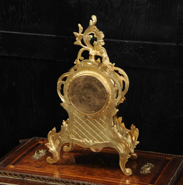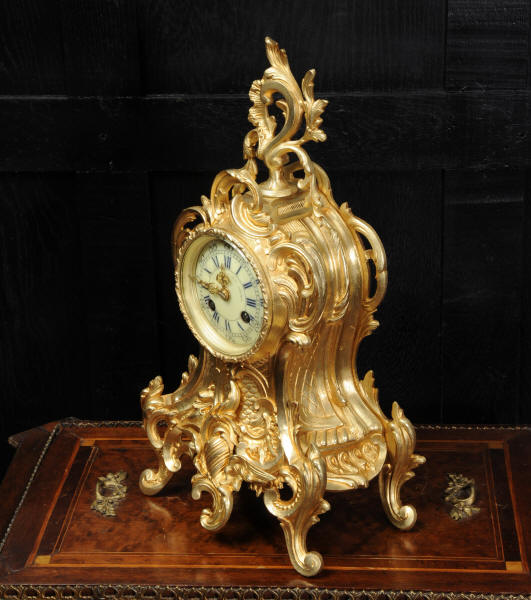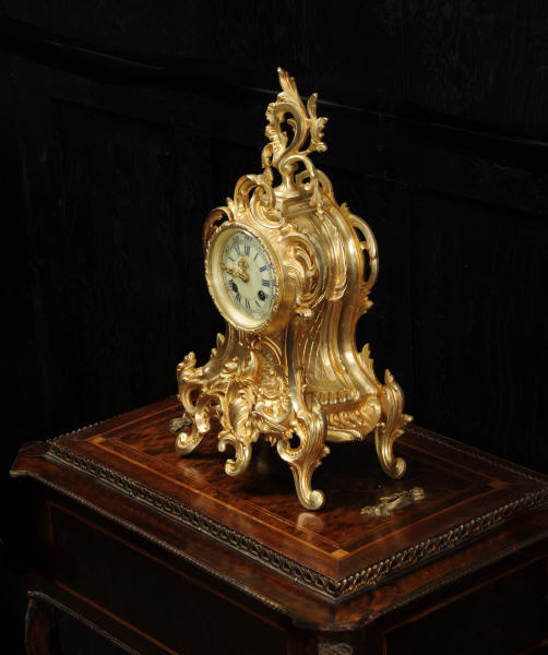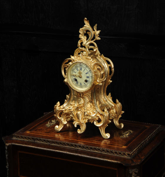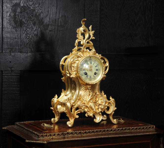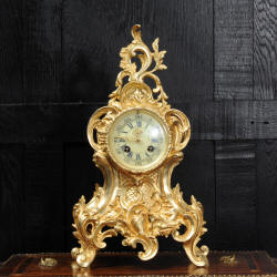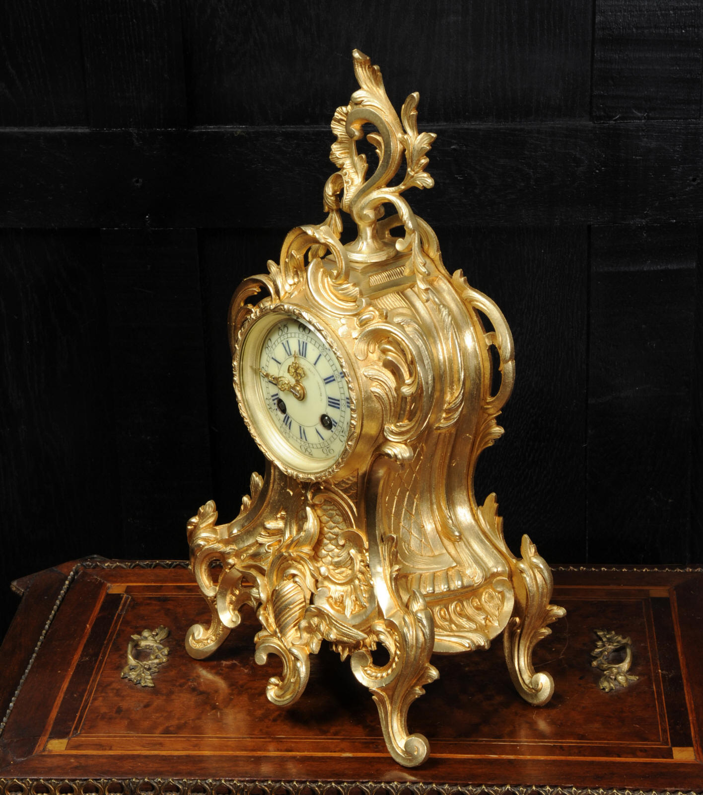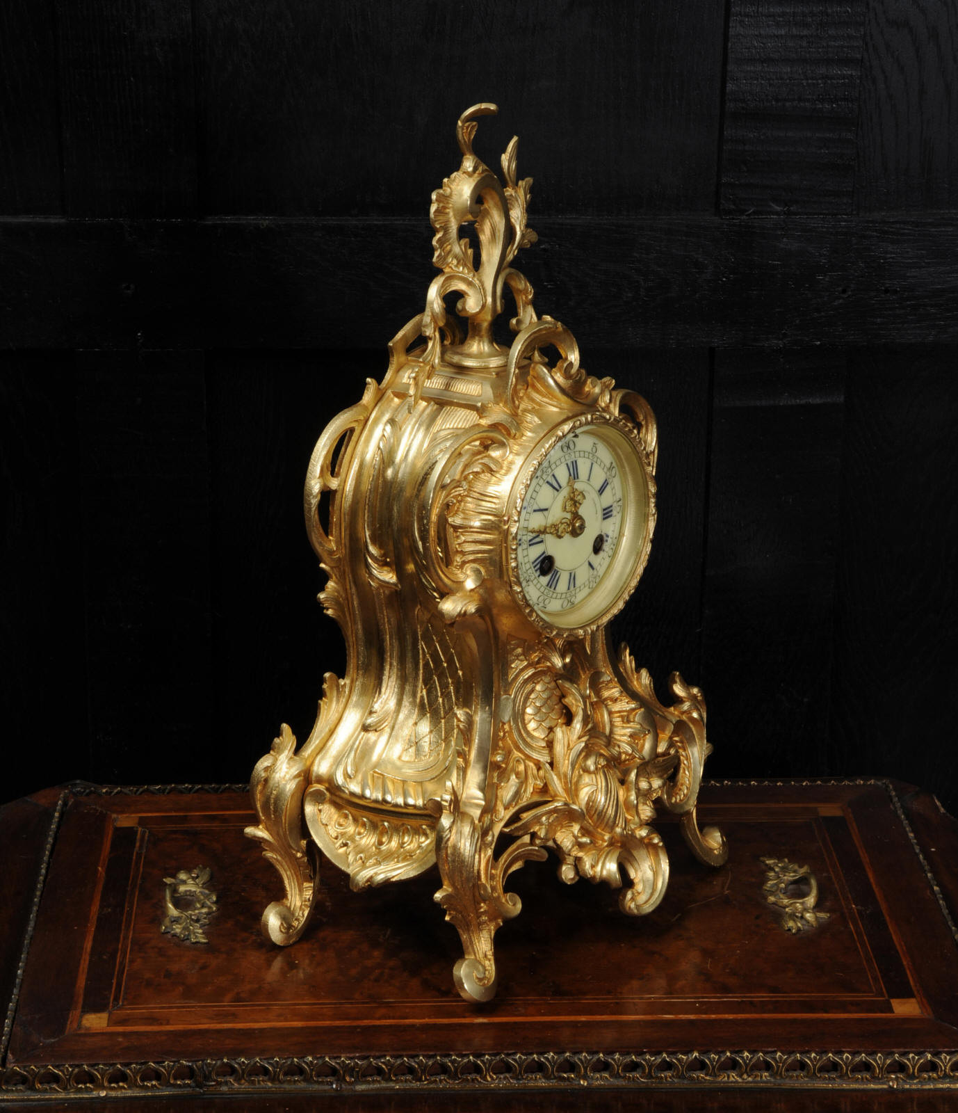 The dial is the sought after cream porcelain enamel with blue lettering and is complete with original finely fretted gilt hands and Rococo bezel. The French movement is by Louis Japy and is in excellent clean and running condition having been fully overhauled by our clockmaker. Pendulum is original. It runs for 8 days and strikes the hours and halves on a bell. Click the video clip below to hear the bell and watch the clock running. According to an advertisement in the 1896 issue of Didot-Bottin (directory and almanac for commerce, industry, judicial and civil services) the Maison H. Riondet, Comptoir General, a retailer, was one of ‘the most well-stocked shops for everything from: jewellery, bronze art objects, timepieces & furniture, precious stones, marble sculptures, silverware, ceiling lights & white metal, chandeliers, cutlery, lamps & diamond-facetted fireplaces, travel clocks, “fine-stone” pearls.’ It boasted ‘factory prices’ and ‘retail stores in Paris with no other branches, representatives, or offices in any other city, French or foreign.’ Maison H. Riondet was located at 9, boulevard Poissonnière and 45, rue du Sentier in Paris. The 1911 Annuaire de la Curiosité et des Beaux-Arts, a directory of curiosities and fine art, shows that the retailer was a member of the bronze manufacturing trade union. Intersecting the grand Parisian boulevards, the Comptoir Général was located on the royal route, which under the Second Empire already connected the Madeleine to the Gymnase Theatre. The retailer figured among the great Parisian stores of the late nineteenth-century, providing “free entry” to customers. Strolling from the Place de la Madeleine to the Café des Variétés on Boulevard Montmartre, elegant crowds stopped to admire the store’s display windows, stocked in an abundant and spectacular manner. The Comptoir Général was contemporary with other great department stores of the period, like the Grands Magasins du Louvre, Bon Marché, and La Samaritaine, and attested to the new forms of commerce developing during the second half of the nineteenth century. These stores became showcases; advertising in newspapers, they offered the consumer a diverse and varied product, displayed in a way that was elaborate and luxurious.