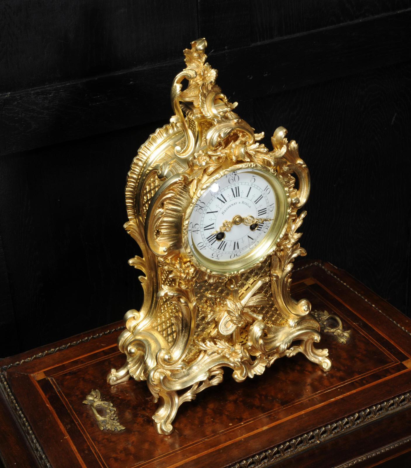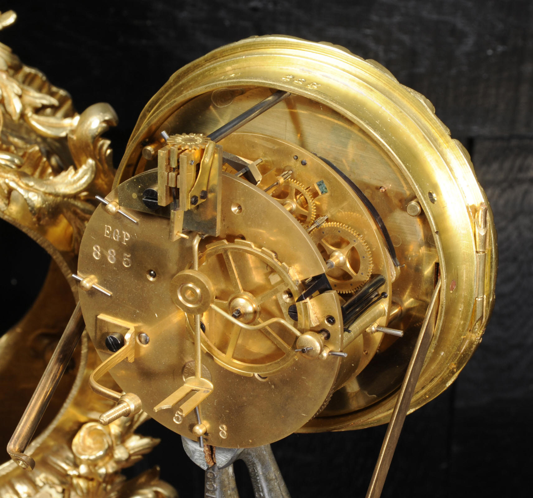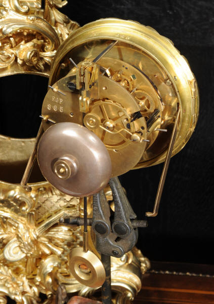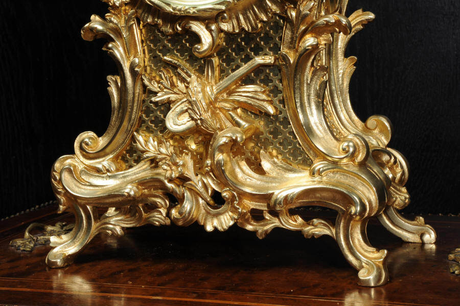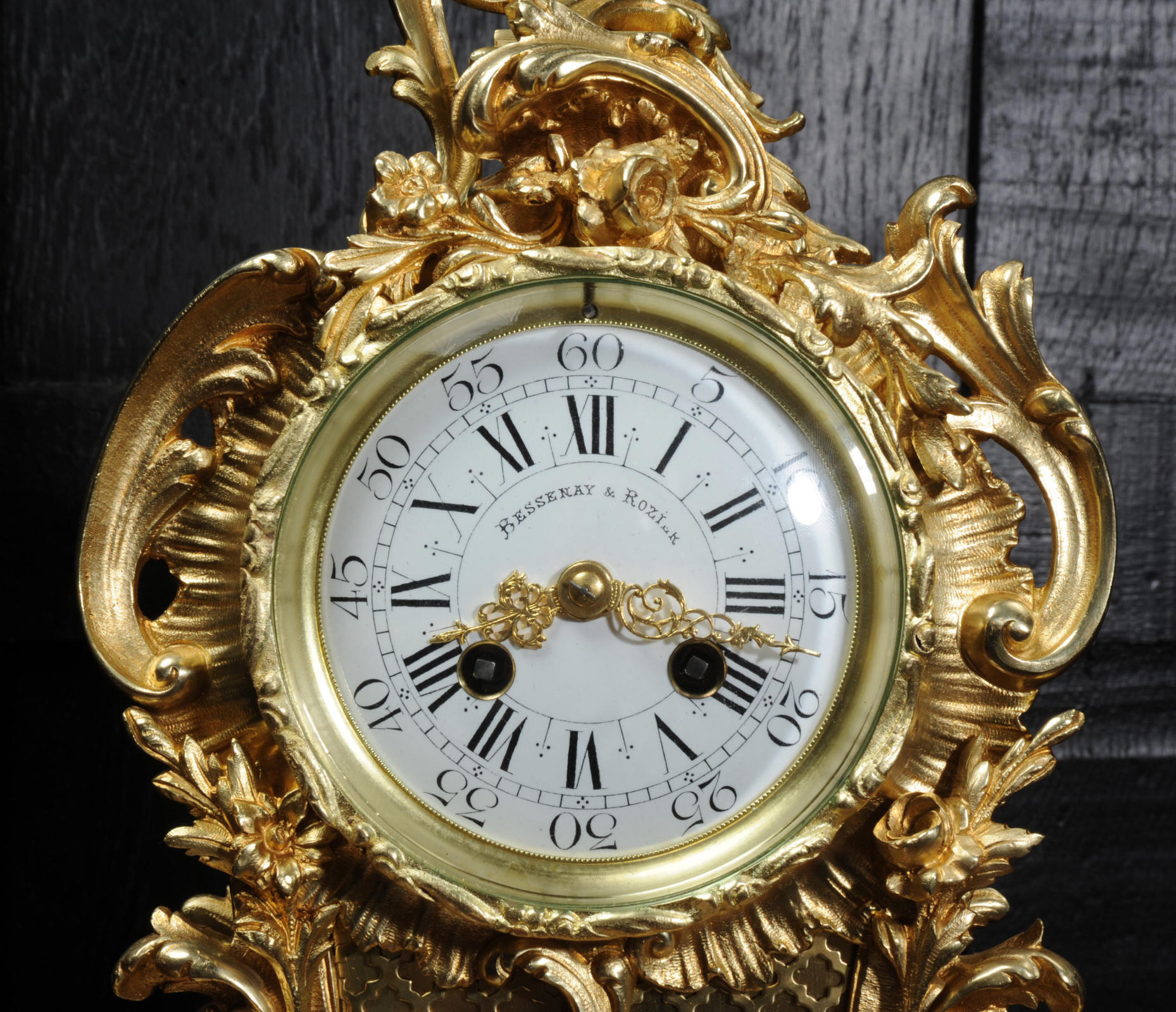The dial is porcelain enamel on copper with separate minute ring. It is signed for the retailer Bessenay & Rozier. It is complete with it's original finely fretted hands and Rococo bezel with convex glass. The French movement is by Vincenti and is of high quality. It is in excellent clean and running condition having been fully overhauled by our clockmaker. Pendulum is original. It runs for 8 days and strikes the hours and halves on a bell. Click the video clip below to hear the bell and watch the clock running. Condition of the case is excellent, the original gilding is beautifully clean and bright with hardly any wear or discolouration and there are no losses. The dial is also in excellent condition with no damage.