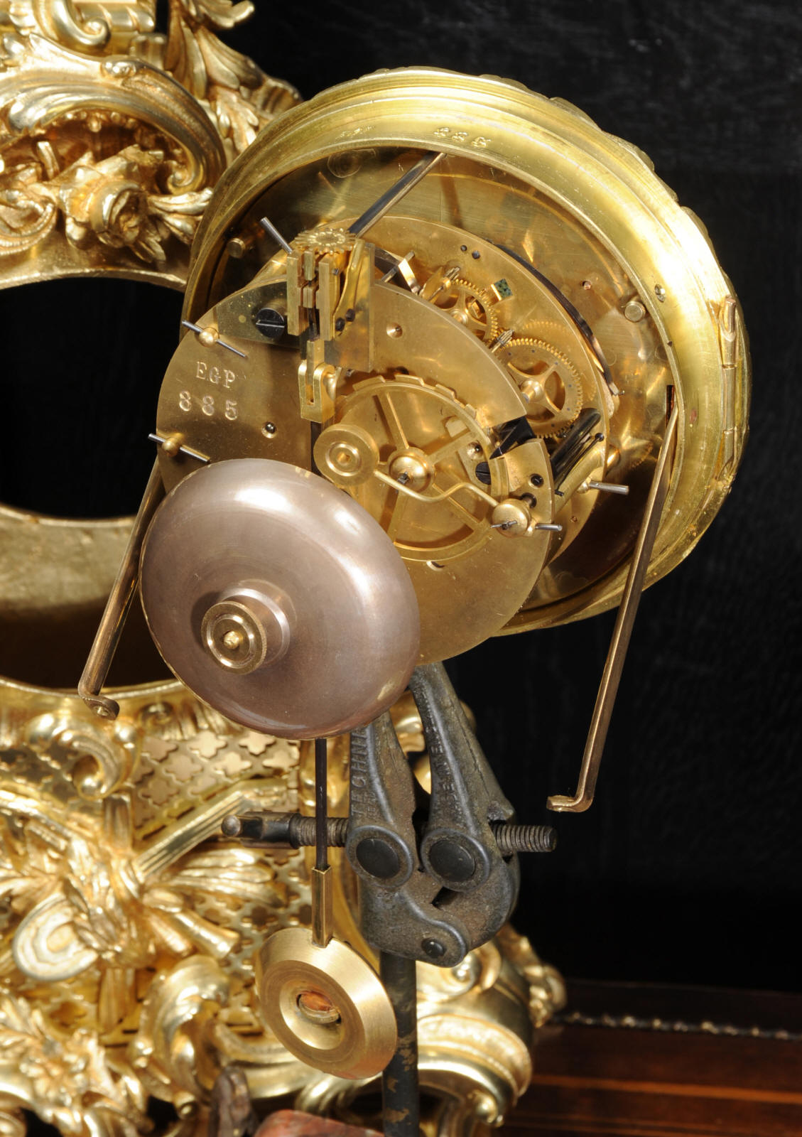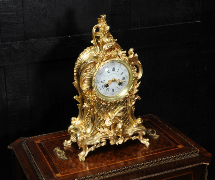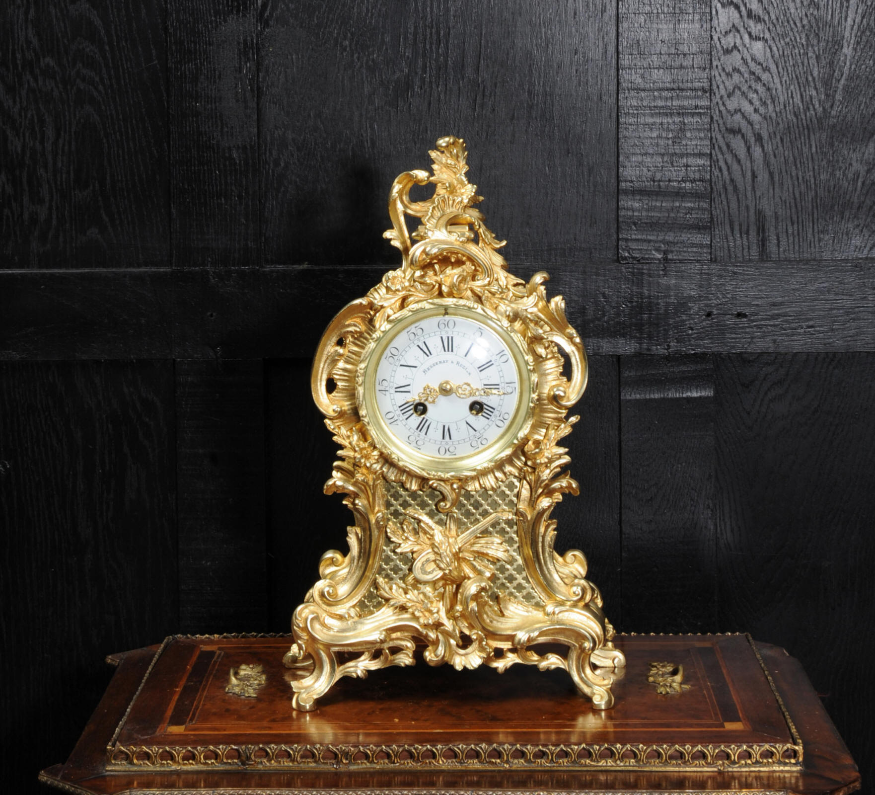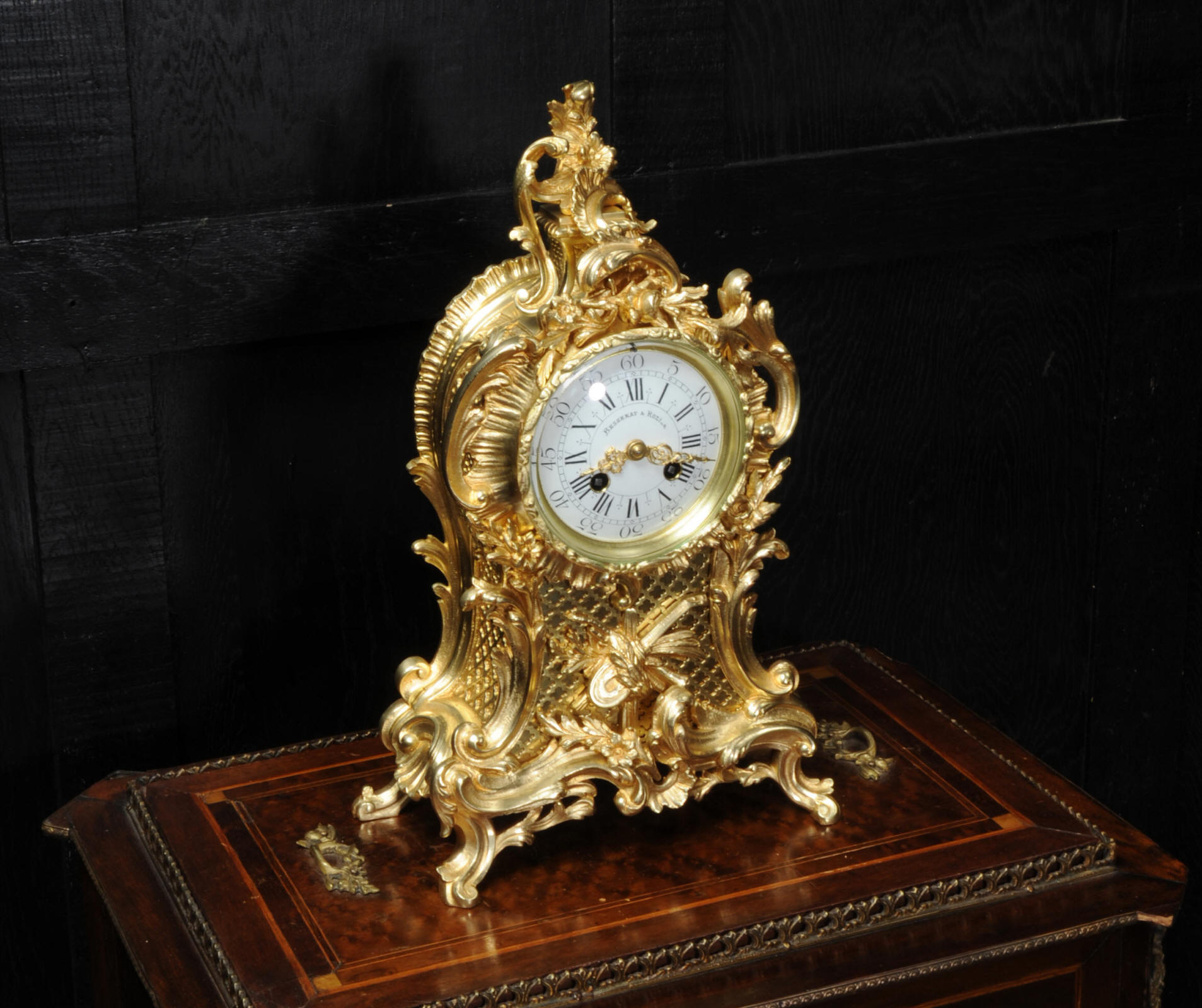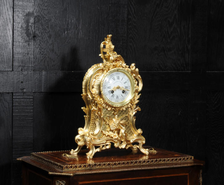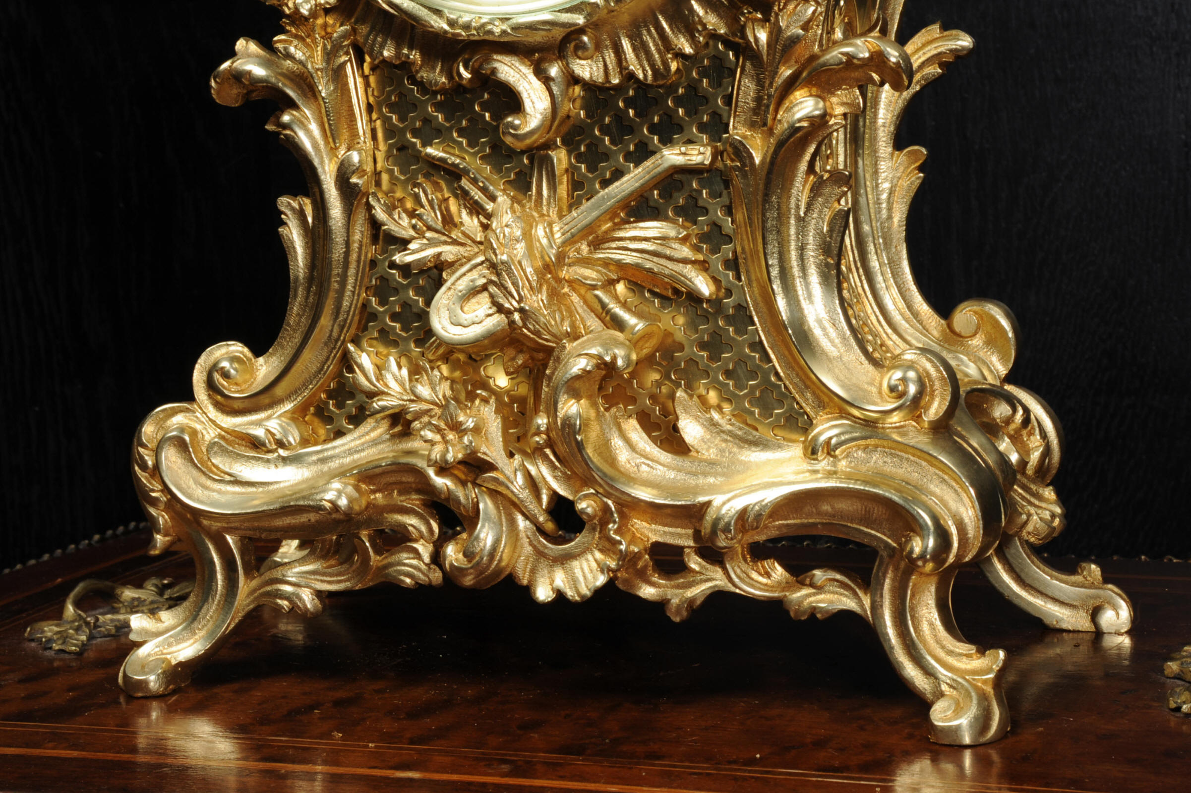 The dial is porcelain enamel on copper with separate minute ring. It is signed for the retailer Bessenay & Rozier. It is complete with it's original finely fretted hands and Rococo bezel with convex glass. The French movement is by Vincenti and is of high quality. It is in excellent clean and running condition having been fully overhauled by our clockmaker. Pendulum is original. It runs for 8 days and strikes the hours and halves on a bell. Click the video clip below to hear the bell and watch the clock running. Condition of the case is excellent, the original gilding is beautifully clean and bright with hardly any wear or discolouration and there are no losses. The dial is also in excellent condition with no damage.