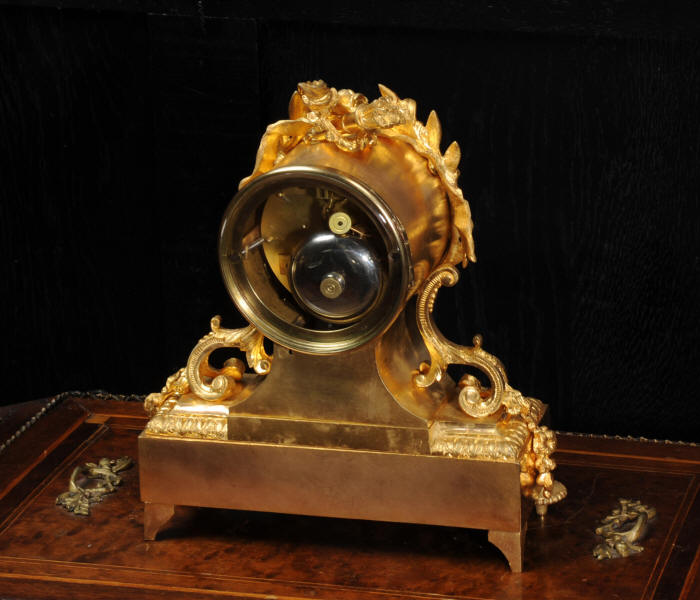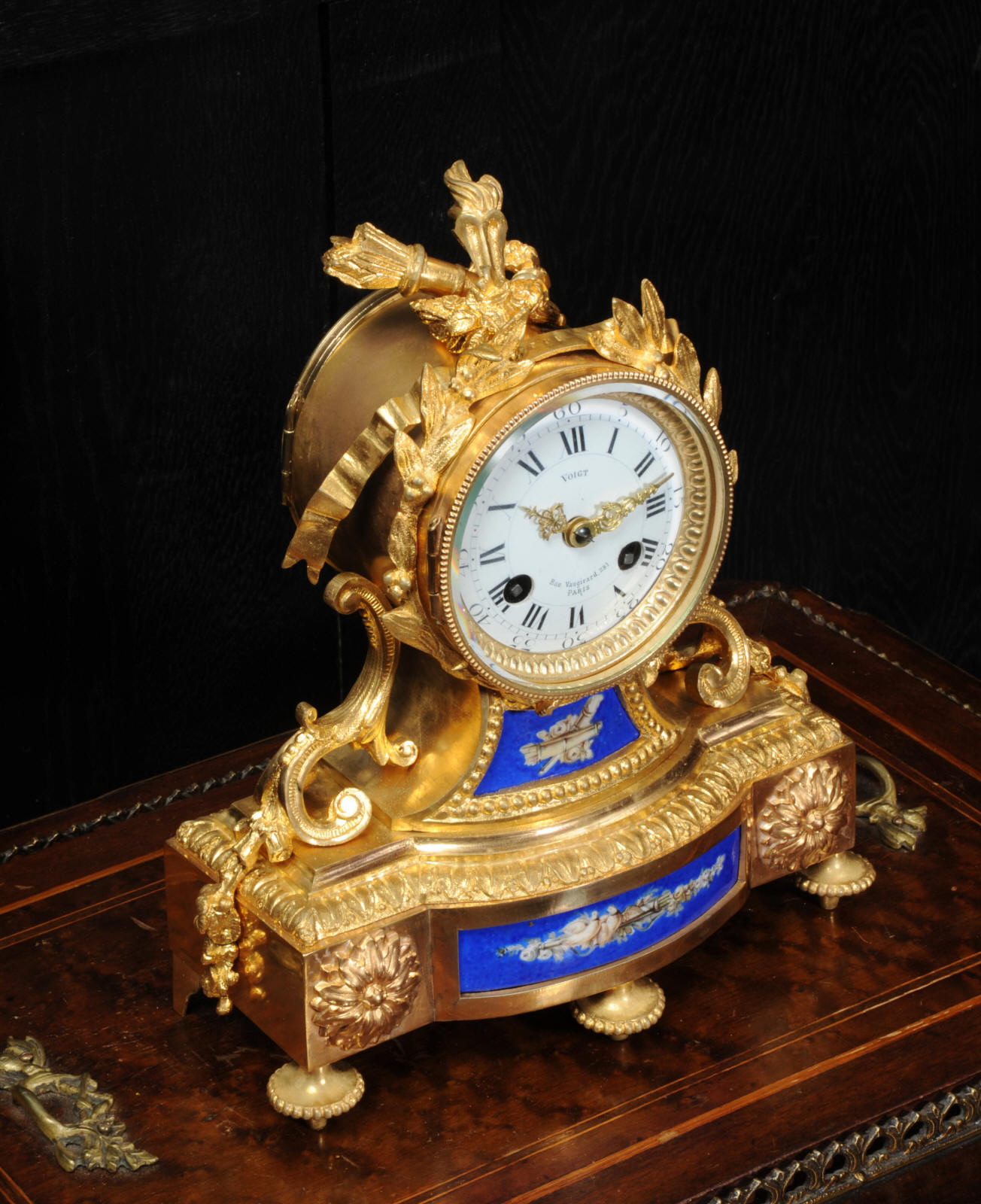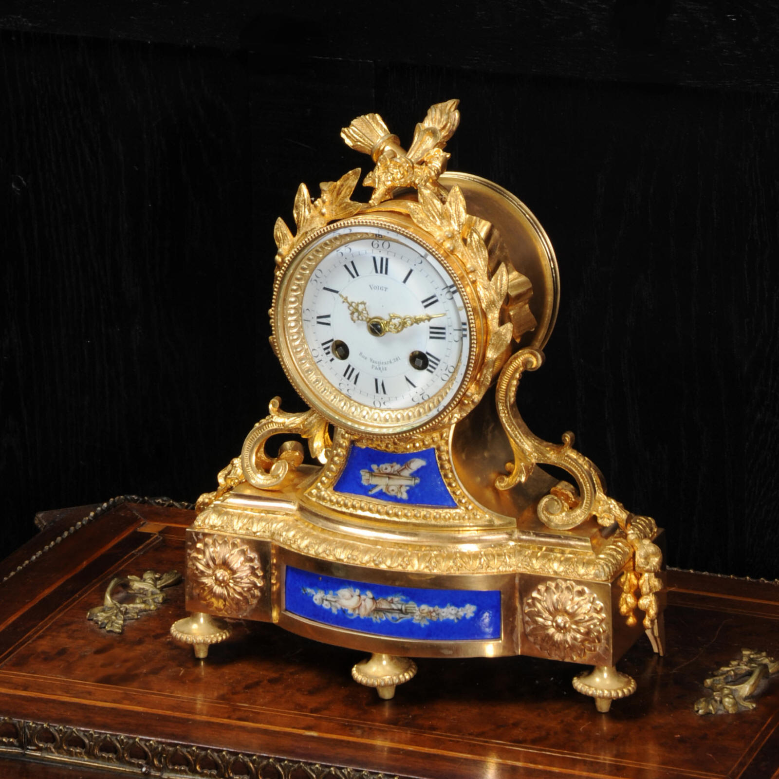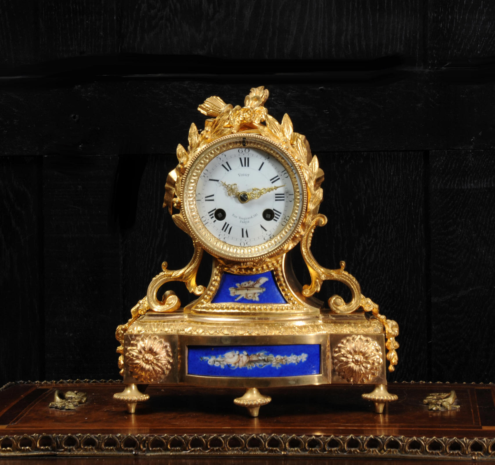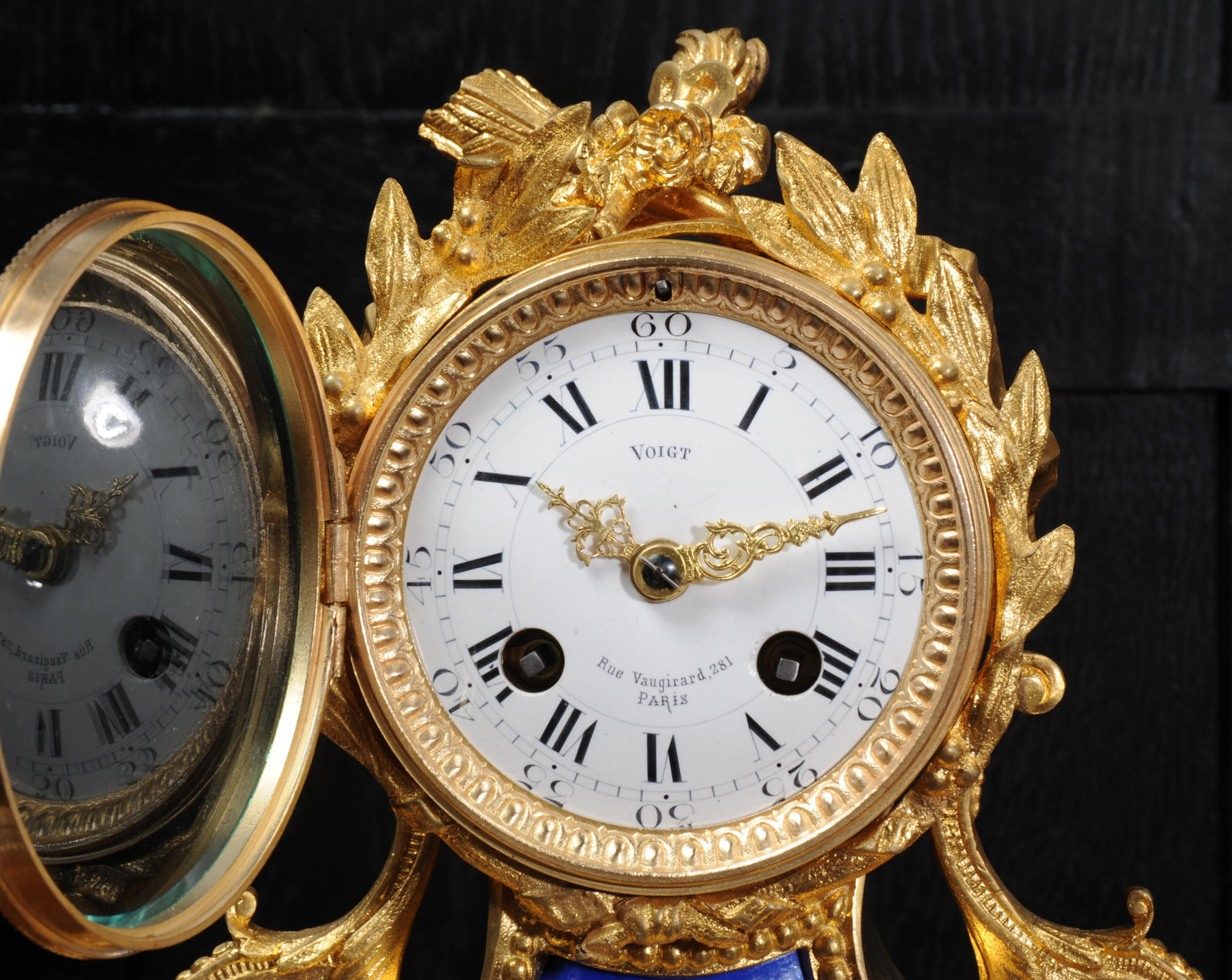 The dial porcelain enamel on copper with finely fretted gilt hands. It is signed for the Paris retailer Voigt. The rear door is also glazed to allow the movement to be seen. The French movement is of high quality and is by Japy Freres. It has the early Japy mark of 1855. It is in excellent clean and running condition having been fully overhauled by our clockmaker. Pendulum is a replacement. It runs for 8 days and strikes the hours and halves on a bell. Click the video clip below to hear the bell and watch the clock running! Condition of the case is excellent, beautifully clean and bright with slight wear and discolouration. The dial is also in excellent condition just small nibbles to the next to the winding holes.