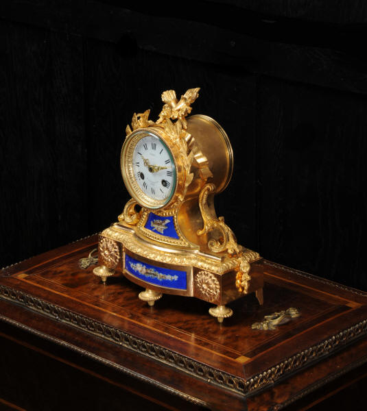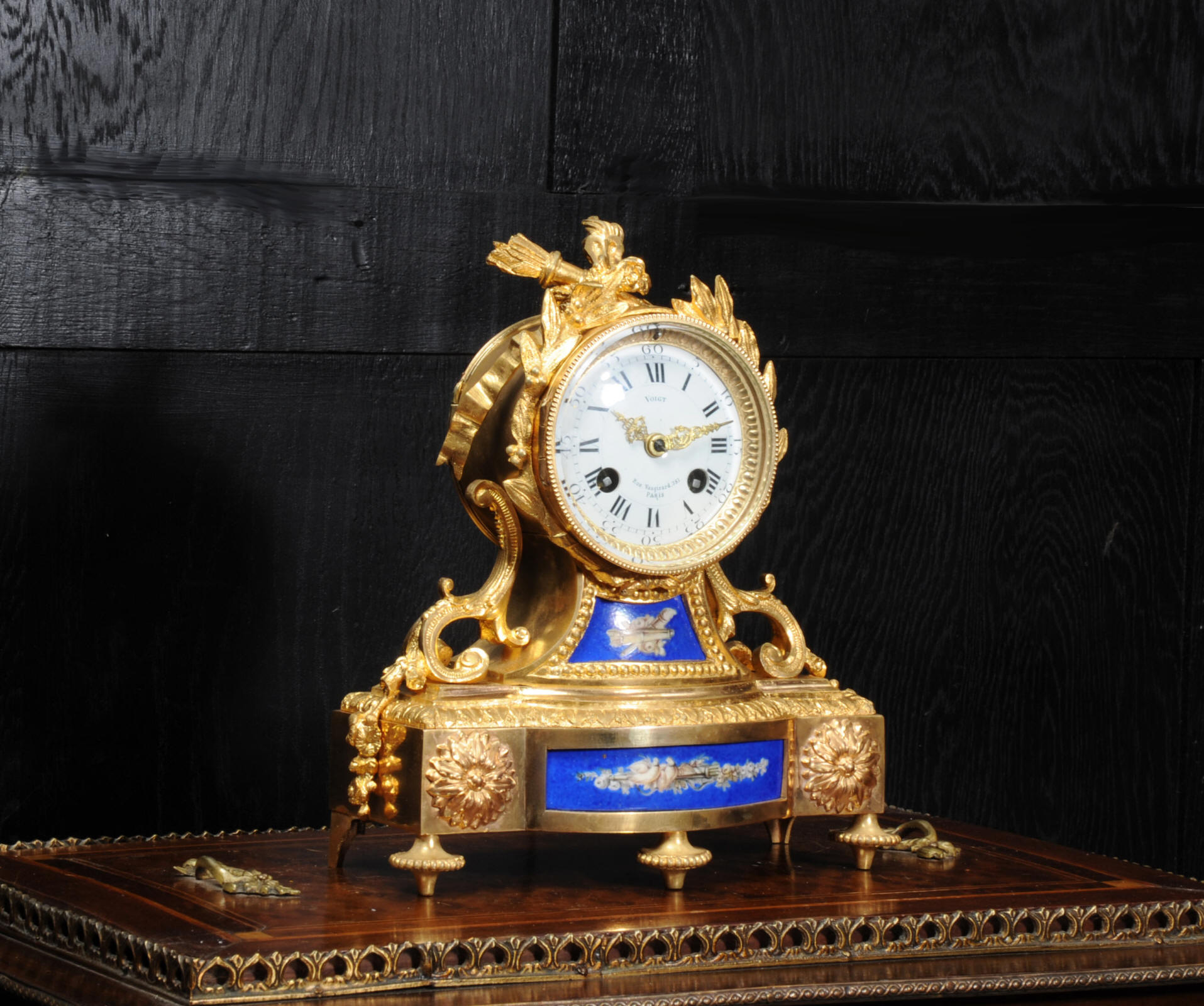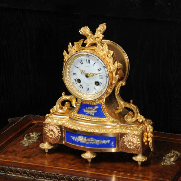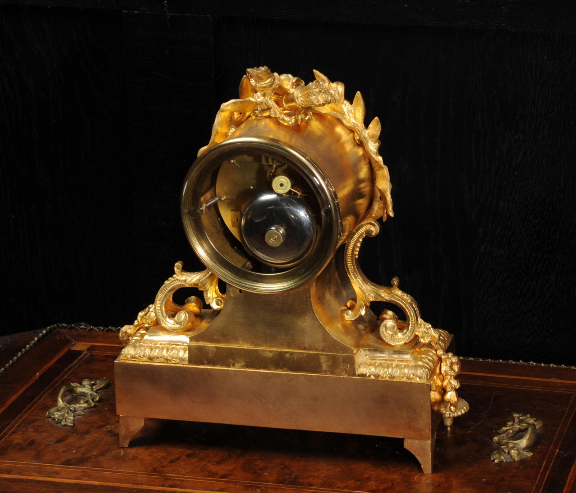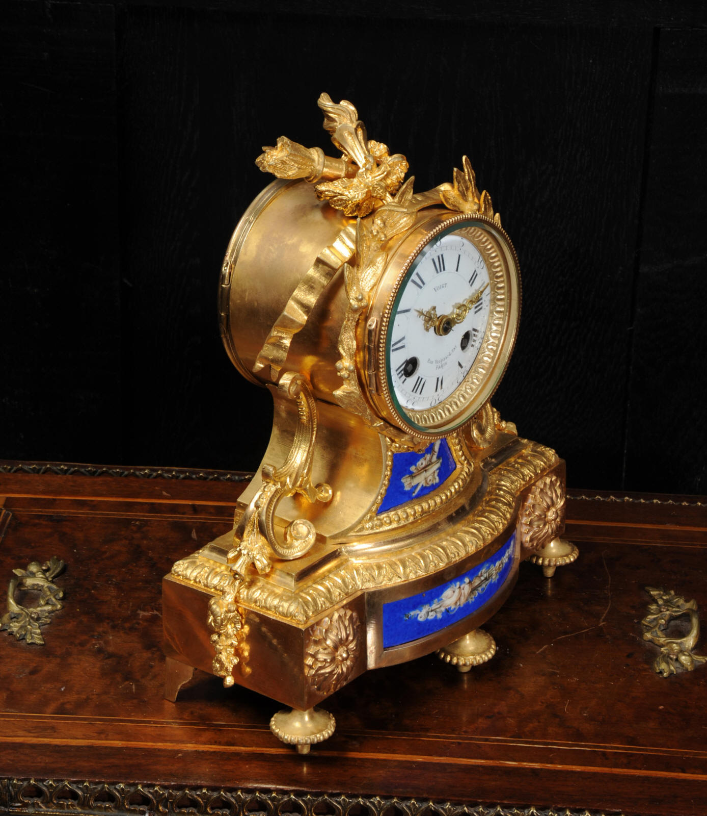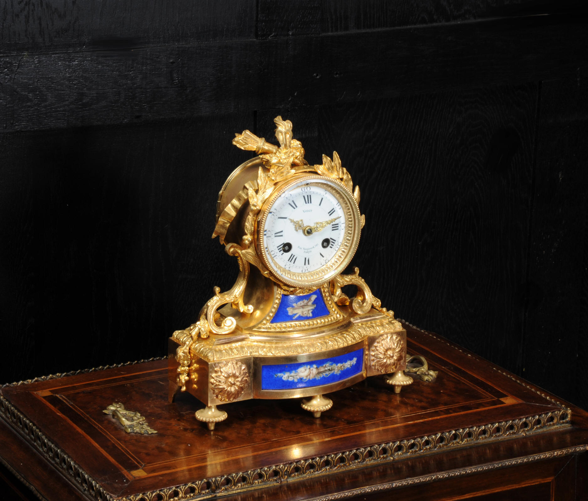 The dial porcelain enamel on copper with finely fretted gilt hands. It is signed for the Paris retailer Voigt. The rear door is also glazed to allow the movement to be seen. The French movement is of high quality and is by Japy Freres. It has the early Japy mark of 1855. It is in excellent clean and running condition having been fully overhauled by our clockmaker. Pendulum is a replacement. It runs for 8 days and strikes the hours and halves on a bell. Click the video clip below to hear the bell and watch the clock running! Condition of the case is excellent, beautifully clean and bright with slight wear and discolouration. The dial is also in excellent condition just small nibbles to the next to the winding holes.