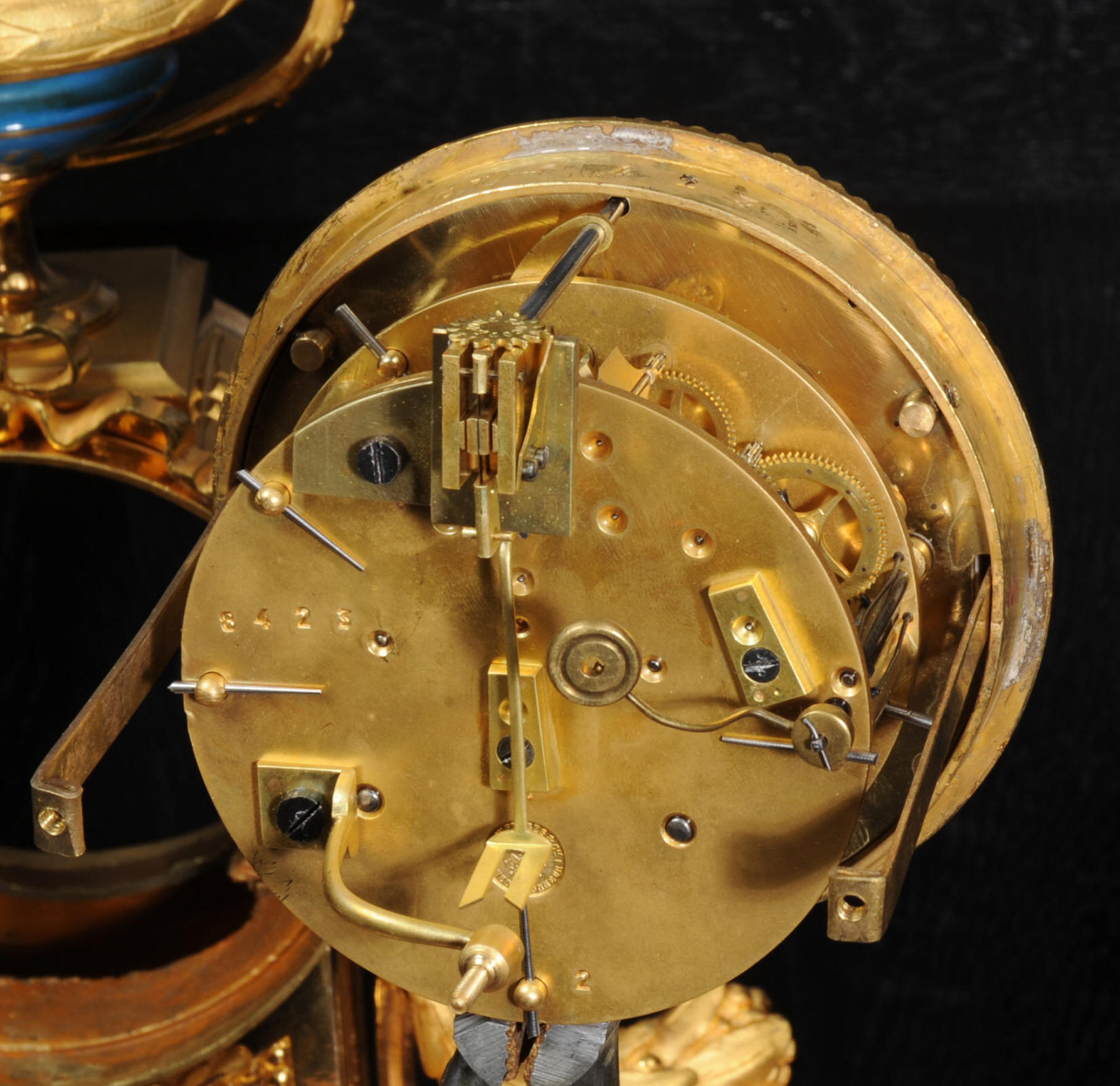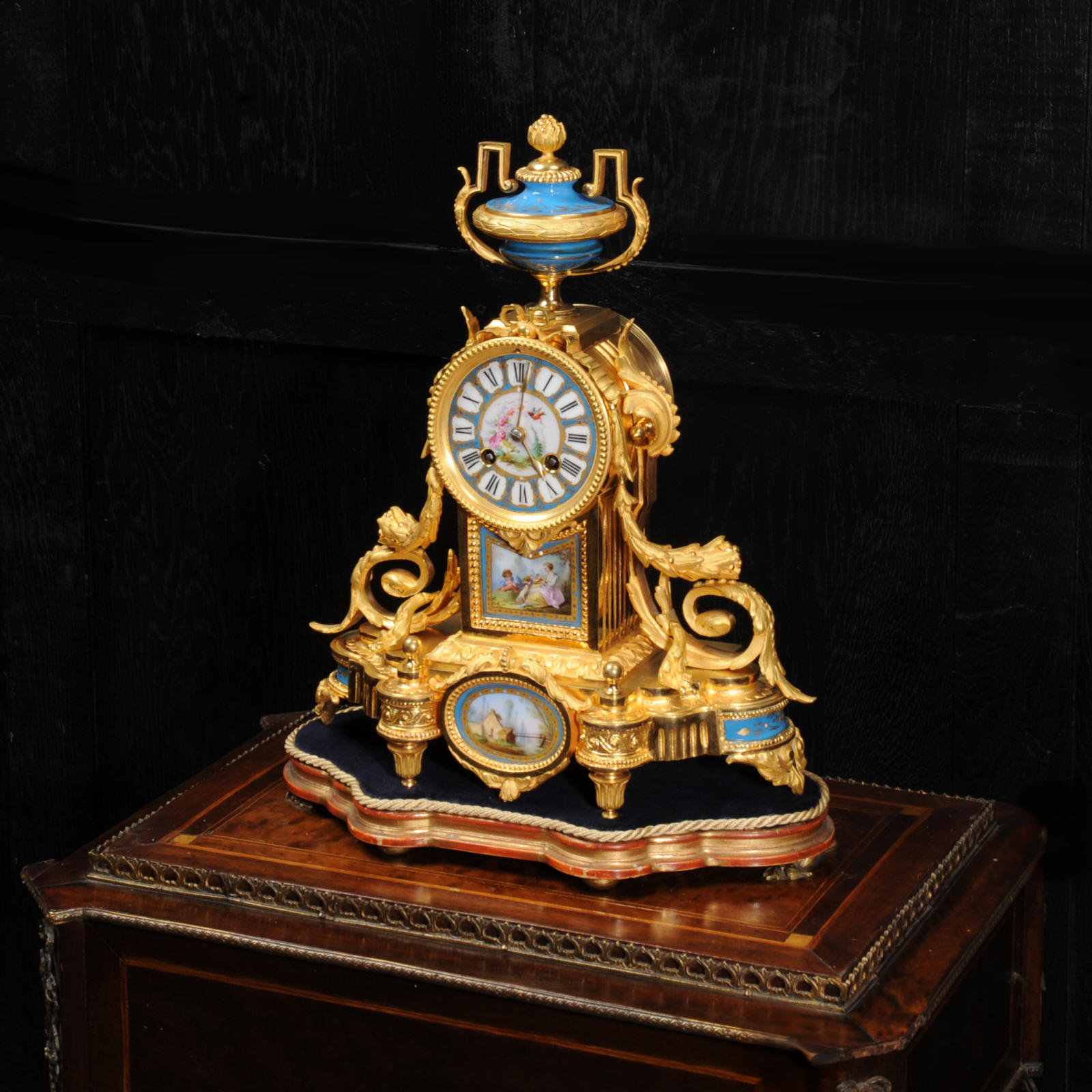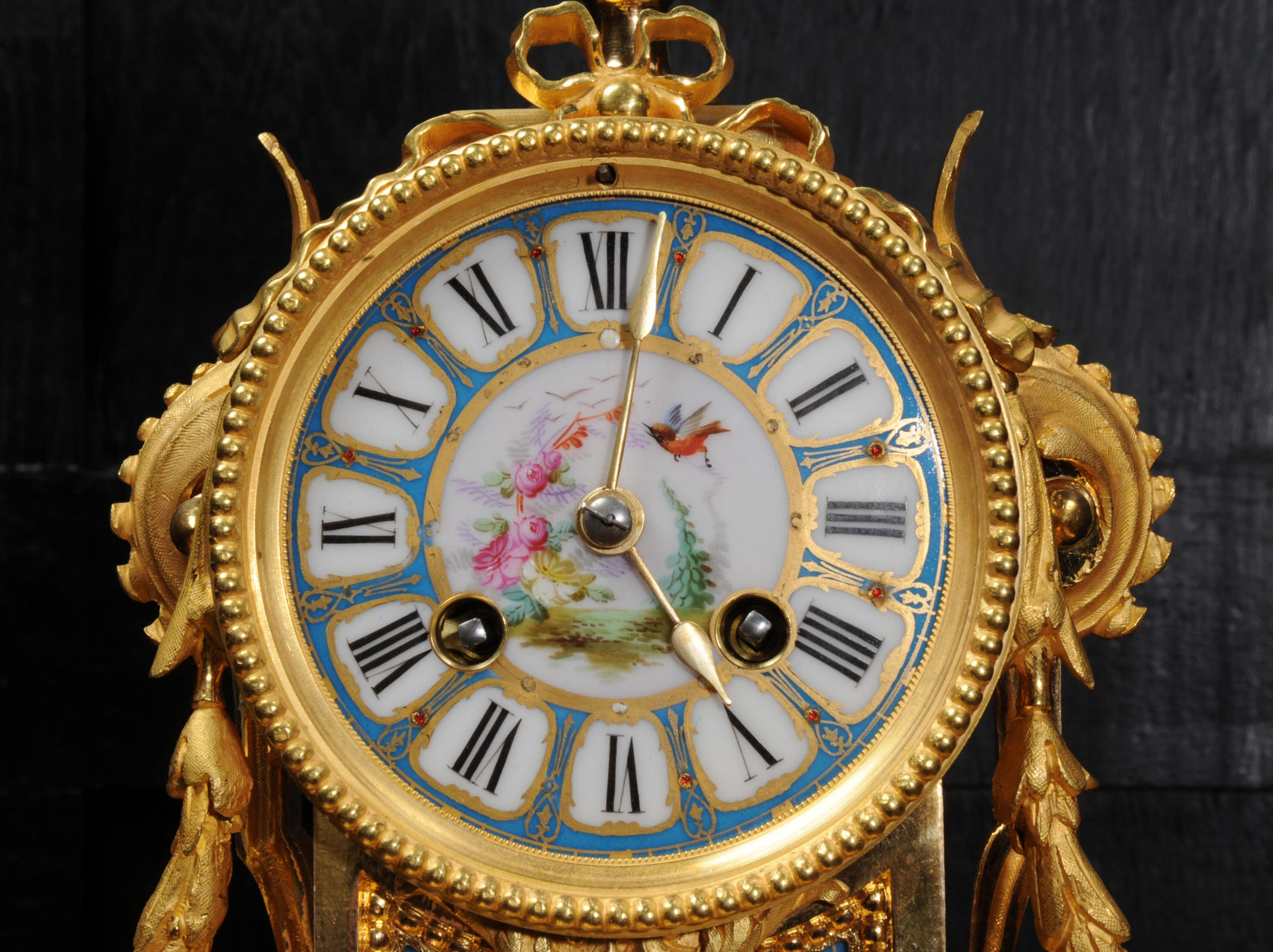 The lower porcelain panel is painted with a tranquil scene of a cottage by a river. and the dial is decorated with delicate flowers and a bird. The clock is complete with it's original gesso base. Unusually the case has the movement serial number impressed to the rear and the porcelain is signed by the artist to the rear along with the serial number. The rear door is glazed with frosted glass. The French movement is of very high quality as one would expect of Japy Freres. It has the Japy Freres 'Grande Medaille d'Honneur' mark on the movement backplate. It is in excellent clean and running condition having been fully serviced by our clockmaker. Pendulum is original. It runs for 8 days on one wind and strikes the hours and halves on a bell. Click the video clip below to hear the bell and watch the clock running! Condition of the case is excellent with a clean and bright finish, there is some very minor wear to the original gilding and some occasional discolouration. The porcelain is in excellent condition with no damage and the vast majority of the over-glaze gilt decoration present. There are losses to the red and white applied 'jewels'. Gesso base is in good condition with wear to the high spots. We have replaced the fabric. This is a fine and very decorative clock to add to your collection.